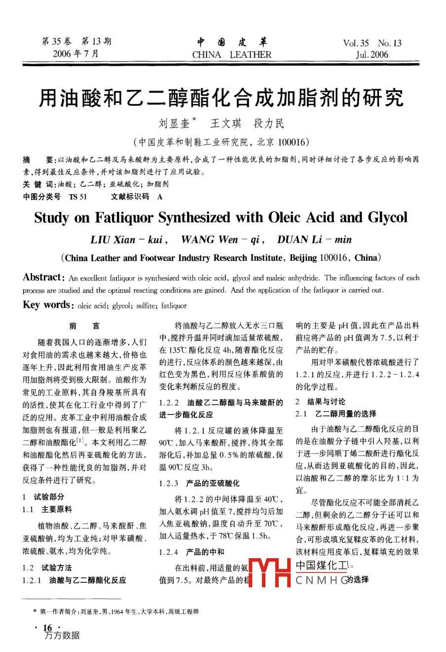 第35卷第13期中國(guó)皮革Vol 35 No 132006年7月CHINA LEATHERJul.2006用油酸和乙二醇酯化合成加脂劑的研究劉顯奎”王文琪段力民(中國(guó)皮革和制鞋工業(yè)研究院,北京100016)摘要:以油酸和乙二醇及馬來(lái)酸酐為主要原料,合成了一種性能優(yōu)良的加脂劑,同時(shí)詳細(xì)討論了各步反應(yīng)的影響因素,得到最佳反應(yīng)條件,并對(duì)該加脂劑進(jìn)行了應(yīng)用試驗(yàn)。關(guān)鍵詞:油酸;乙二醇;亞硫酸化;加脂劑中圖分類(lèi)號(hào)TS51文獻(xiàn)標(biāo)識(shí)碼AStudy on Fatliquor Synthesized with Oleic Acid and GlycolLIU Xian-kui, WANG Wen-qi, DUAN Li-minChina Leather and Footwear Industry Research Institute, Beijing 100016, China)Abstract: An excellent fatliquor is synthesized with oleic acid, glycol and maleic anhydride. The influencing factors of eachprocess are studied and the optimal reacting conditions are gained. And the application of the fatliquor is carried outKey words: oleic acid; glycol; sulfite; fatliquor將油酸與乙二醇放入無(wú)水三口瓶響的主要是pH值,因此在產(chǎn)品出料隨著我國(guó)人口的逐漸增多,人們中,攪拌升溫并同時(shí)滴加適量濃硫酸,前應(yīng)將產(chǎn)品的pH值調(diào)為75,以利于對(duì)食用油的需求也越來(lái)越大,價(jià)格也在135℃酯化反應(yīng)4h,隨著酯化反應(yīng)產(chǎn)品的貯存逐年上升,因此利用食用油生產(chǎn)皮革的進(jìn)行,反應(yīng)體系的顏色越來(lái)越深,由用對(duì)甲苯磺酸代替濃硫酸進(jìn)行了用加脂劑將受到極大限制。油酸作為紅色變?yōu)楹谏?利用反應(yīng)體系酸值的1.2.1的反應(yīng),并進(jìn)行1.22-1.2.4常見(jiàn)的工業(yè)原料,其自身羧基所具有變化來(lái)判斷反應(yīng)的程度。的化學(xué)過(guò)程。的活性,使其在化工行業(yè)中得到了廣1.2.2油酸乙二醇酯與馬來(lái)酸酐的2結(jié)果與討論泛的應(yīng)用。皮革工業(yè)中利用油酸合成進(jìn)一步酯化反應(yīng)2.1乙二醇用量的選擇加脂劑也有報(bào)道,但一般是利用聚乙將1.2.1反應(yīng)罐的液體降溫至由于油酸與乙二醇酯化反應(yīng)的目二醇和油酸酯化。本文利用乙二醇90℃,加入馬來(lái)酸酐,攪拌,待其全部的是在油酸分子鏈中引入羥基,以利和油酸酯化然后再亞硫酸化的方法,溶化后,補(bǔ)加總量0.5%的濃硫酸,保于進(jìn)一步同順丁烯二酸酐進(jìn)行酯化反獲得了一種性能優(yōu)良的加脂劑,并對(duì)溫9℃反應(yīng)3h應(yīng),從而達(dá)到亞硫酸化的目的,因此反應(yīng)條件進(jìn)行了研究。1.2.3產(chǎn)品的亞硫酸化以油酸和乙二醇的摩爾比為1:1為部分宜將1.2.2的中間體降溫至40℃1.1主要原料盡管酯化反應(yīng)不可能全部消耗乙加入氨水調(diào)p值至7,攪拌均勻后加二醇,但剩余的乙二醇分子還可以和植物油酸、乙二醇、馬來(lái)酸酐、焦入焦亞硫酸鈉,溫度自動(dòng)升至70℃,馬來(lái)酸酐形成酯化反應(yīng),再進(jìn)一步聚亞硫酸鈉,均為工業(yè)純;對(duì)甲苯磺酸、加入適量熱水,于78℃保溫1.5h合,可形成填充復(fù)鞣皮革的化工材料濃硫酸、氨水,均為化學(xué)純1.2.4產(chǎn)品的中和該材料應(yīng)用皮革后,復(fù)鞣填充的效果1.2試驗(yàn)方法在出料前,用適量的氨中國(guó)煤化工。1.2.1油酸與乙二醇酯化反應(yīng)值到7.5。對(duì)最終產(chǎn)品的CNMH的選擇*第一作者簡(jiǎn)介:劉顯奎、男,1964年生,大學(xué)本科,高級(jí)工程師方數(shù)據(jù)第13期劉顯奎等用油酸和乙二醇酯化合成加脂劑的研究試驗(yàn)研究馬來(lái)酸酐用量的多少,決定了該2.4反應(yīng)溫度和反應(yīng)時(shí)間的影響結(jié)果表明:加脂劑1:9的溶液對(duì)皮革加脂劑親水程度的強(qiáng)弱。從摩爾配比看,占乙二醇摩爾用量13時(shí)的理論上講,酯化反應(yīng)溫度一般控于1ml/氨水是十分穩(wěn)定的加入量制在參與酯化反應(yīng)的化合物的低沸點(diǎn)是原來(lái)的10倍也不會(huì)出現(xiàn)分層現(xiàn)象馬來(lái)酸酐,合成出來(lái)的產(chǎn)品穩(wěn)定性更的溫度附近根據(jù)本試驗(yàn)的具體要求,對(duì)于1mL鹽酸當(dāng)乳液p值小于好但復(fù)鞣填充性相對(duì)而言較弱;而綜合考慮后將第一步的反應(yīng)溫度控制2.5時(shí),才會(huì)出現(xiàn)沉淀現(xiàn)象。11用量的馬來(lái)酸酐合成的產(chǎn)品透明在135℃,反應(yīng)時(shí)間4h3加脂劑結(jié)構(gòu)的紅外光譜圖表征狀態(tài)要好,復(fù)鞣效果非常明顯,具體結(jié)第二步的酯化溫度控制在90℃,果見(jiàn)表1樣品的處理過(guò)程:該聚合物不溶時(shí)間3h。亞硫酸化的溫度控制在從表1結(jié)果可以看出:作為一般78℃,反應(yīng)時(shí)間1.5h于乙醇、甲醇、丙酮、乙酸乙酯、乙醚性加脂劑,占乙二醇13用量的馬來(lái)石油醚等一系列常用溶劑。與二氯甲酸酐已夠用,但如果想使其具有一定2.5不同催化劑的影響烷等有較好的相溶性。所以先將大約的復(fù)鞣填充作用,或者想使其乳化其選擇濃硫酸、對(duì)甲苯磺酸,對(duì)本試10mL樣品溶于10mL二氯甲烷(或三它油類(lèi),則馬來(lái)酸酐用量大些為好。驗(yàn)中酯化反應(yīng)進(jìn)行催化的結(jié)果是:用氯甲烷)中,然后向其中加入大約2.3焦亞硫酸鈉用量選擇濃硫酸作為催化劑,產(chǎn)品呈透明狀,水30mL甲醇,立即有米黃色固體析出溶性極好,可和水以任何比例互溶;而室溫?cái)嚢杓s1h,過(guò)濾,濾液為米黃色焦亞硫酸鈉用量是根據(jù)馬