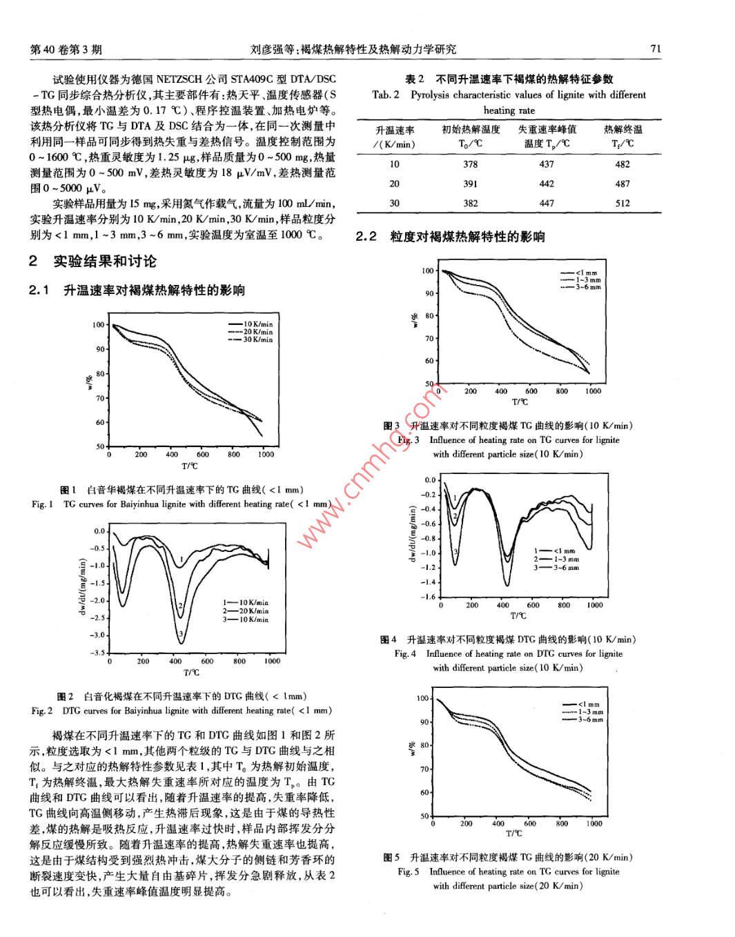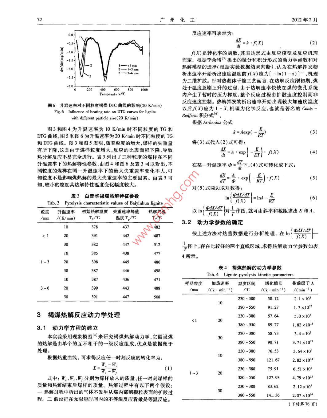 第40卷第3期廣州化工Vol. 40 No. 32012 年2月Guangzhou Chemical IndustryFebruary. 2012褐煤熱解特性及熱解動(dòng)力學(xué)研究劉彥強(qiáng)',解京選',狄紅旗',毛- -劍(1中國(guó)礦業(yè)大學(xué)化工學(xué)院,江蘇徐州221006;2 中國(guó)礦業(yè)大學(xué)(北京),北京100083)摘要:采用非等溫?zé)嶂胤▽?duì)白音華褐煤熱解特性進(jìn)行了實(shí)驗(yàn)研究,考察了升溫速率和粒度對(duì)白音華褐煤熱解特性的影響,同時(shí)對(duì)其熱解動(dòng)力學(xué)進(jìn)行了分析。結(jié)果表明:升溫速率是影響褐煤熱解的主要因素,粒度對(duì)褐煤的熱解也有- -定的影響。利用Coats -Redferm 積分法確定了褐煤熱解低溫段的動(dòng)力學(xué)參數(shù)。關(guān)鍵詞:褐煤;熱解;動(dòng)力學(xué)參數(shù)中圖分類號(hào):TQ536文獻(xiàn)標(biāo)識(shí)碼:A文章編號(hào):1001 - 9677(2012)03 -0070 -04Study on Pyrolysis Characteristics and Pyrolysis Kinetics of LigniteLIU Yan -qiang', XIE Jing - xuan',DI Hong -qi' , MAO Yi -jian2(1 School of Chemical Engineering & Technology, China University of Mining & Technology , Jiangsu Xuzhou 221006;2 China University of Mining & Technology( Beijing) , Beijing 100083, China)Abstract: Experimental studies on the pyrolysis characteristics of Baiyinhua lignite were carried out by non - isother-mal thermogravimetric analysis. The effects of the heating rate and particle size on pyrolysis characteristics of Baiyinhualignite and the pyrolysis kinetics were analyzed. The results showed that the heating rate was the main influence factor oflignite pyrolysis, and the particle size also had a certain impact on lignite pyrolysis. Coats - Redfern integral method wasused to determine the lignite pyrolysis kinetic parameters at low - temperature period.Key words: lignite; pyrolysis ; kinetic parameters我國(guó)褐煤資源十分豐富,據(jù)統(tǒng)計(jì),目前全國(guó)已有探明褐煤保為兩類 :非等溫(動(dòng)態(tài))熱重法和等溫(靜態(tài))熱重法。兩種方法有儲(chǔ)量為1303億t,約占全國(guó)煤炭總儲(chǔ)量的13%。褐煤是煤化的精度相近。 但非等溫是從幾乎不進(jìn)行反應(yīng)的溫度開始升溫,程度最低的煤類,與煙煤和無煙煤相比,它在組成、性質(zhì)及巖相樣品在各溫度下的重量連續(xù)地被記錄下來。等溫法則在試樣達(dá)特征等方面均有所不同”。褐煤的特點(diǎn)是水分高、孔隙度大、揮到等溫條件之前的升溫過程中往往已發(fā)生了不可忽視的反應(yīng),發(fā)分高、熱值低,化學(xué)反應(yīng)性強(qiáng),熱穩(wěn)定性差,在空氣中極易風(fēng)化它必將影響測(cè)量結(jié)果。況且等溫法要作不同溫度下等溫重量變變質(zhì),使熱值更加降低,不易運(yùn)輸。煤的干餾也稱煤的熱解,是化線,每次都花費(fèi)很多時(shí)間。相對(duì)來說,非等溫法則要迅速的指煤在隔絕空氣或惰性氣氛的條件下加熱,在不同溫度下發(fā)生多。所以一般采用非等溫?zé)嶂胤?。本文采用非等溫?zé)嶂胤?通一系列的物理變化和化學(xué)反應(yīng)的復(fù)雜過程,其結(jié)果生成氣體(煤過對(duì) 白音華褐煤不同粒度的熱解特性試驗(yàn),分析了粒度和升溫氣)、液體(焦油)、固體(半焦或焦炭)等產(chǎn)物[21。煤的熱解在煤速率對(duì)褐煤熱解行為的影響,并得到不同粒度褐煤在不同升溫科學(xué)和煤的利用技術(shù)中是至關(guān)重要的研究和開發(fā)對(duì)象。煤熱解速率下的一級(jí)反應(yīng)動(dòng)力學(xué)參數(shù)。本身也是煤轉(zhuǎn)化的一種途徑和得到煤液化產(chǎn)物的一-種輔助的方1實(shí)驗(yàn)樣品和儀器去。熱重法( TG)是在程序控制溫度下,測(cè)量物質(zhì)質(zhì)量與溫度關(guān)本實(shí)驗(yàn)煤樣為內(nèi)蒙古白音華褐煤,其工業(yè)分析和元素分析系的一種技術(shù)”。許多物質(zhì)在加熱過程中常伴隨質(zhì)量的變化,如表1所示。這種變化過程有助于研究晶體性質(zhì)的變化,也有助于研究物質(zhì)的脫水解離氧化、還原等物質(zhì)的化學(xué)現(xiàn)象。熱重分析通常分表1內(nèi)蒙古白音華 褐煤的工業(yè)分析和元素分析工業(yè)分析w/%元素分析w/%原料MasAFC.aS.a原煤19.5533. 6413.5533. 2645. 143.6116.271.320. 56作者簡(jiǎn)介:劉彥強(qiáng),(1985 -),男,碩士研究生.煤炭加工與潔凈利用。通訊作者:解京選,(1954-).男,教授,煤炭加工與潔凈利用。第40卷第3期.劉彥強(qiáng)等:褐煤熱解特性及熱解動(dòng)力學(xué)研究7試驗(yàn)使用儀器為德國(guó)NEIZSCH公司STA409C型DTA/DSC表2不同升溫速率下褐煤的熱解特征參數(shù)- TG同步綜合熱分析儀,其主要部件有:熱天平、溫度傳感器(STab.2 Pyrolysis characteristic values of lignite with diferent型熱電偶,最小溫差為0.17 C)、程序控溫裝置、加熱電爐等。heating rate該熱分析儀將TG與DTA及DSC結(jié)合為-體,在同一次測(cè)量中升溫速率初始熱解溫度失 重速率峰值熱解終溫利用同一樣品可同步得到熱失重與差熱信號(hào)。溫度控制范圍為/ K/min)To/C溫度T。/CT/C0~ 1600 C ,熱重靈敏度為1.25 ug,樣品質(zhì)量為0 ~ 500 mg,熱量1078437482測(cè)量范圍為0~ 500 mV,差熱靈敏度為18 μV/mV,差熱測(cè)量范圍0~ 5000 μV。2091442487實(shí)驗(yàn)樣品用量為I5 mg,采用氮?dú)庾鬏d氣,流量為100 mL/min,382447實(shí)驗(yàn)升溫速率分別為10 K/min,20 K/min ,30 K/min ,樣品粒度分別為<1 mm,1 ~3 mm,3 ~6 mm,實(shí)驗(yàn)溫度為室溫至1000 C。2.2粒度對(duì)褐煤熱解 特性的影響2實(shí)驗(yàn)結(jié) 果和討論三I2.1