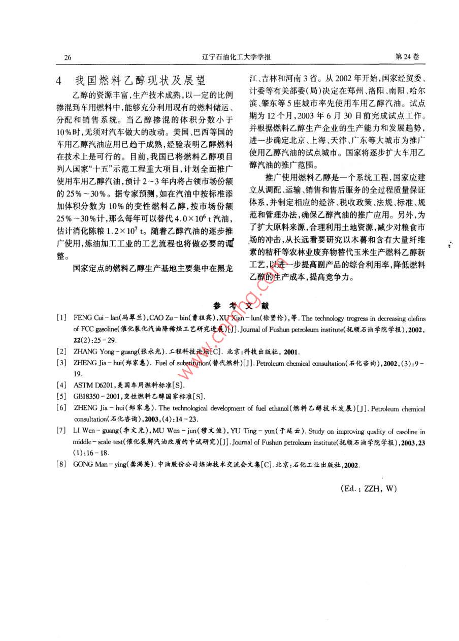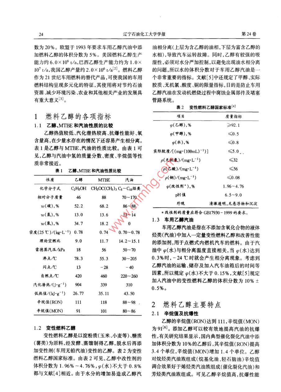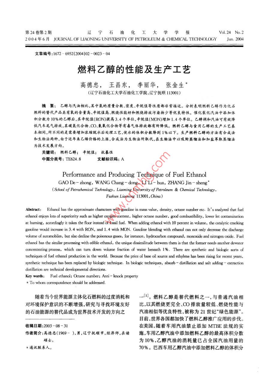 第24卷第2期學(xué)報(bào)2004F6 H JOURNAL, OF LIAONING UNIVERSITY OF PETROLEUM CHEMICAL TECHNOLOGY Jun 2004文章編號(hào):1672-695(0010203-04燃料乙醇的性能及生產(chǎn)工藝高德忠,王昌東,李麗華,張金生(遼寧石油化工大學(xué)石油化工學(xué)院遼寧撫順113001)摘要:乙醇與汽油相比,其中氬的質(zhì)量分?jǐn)?shù)、密度、辛坑值等性質(zhì)都非常接近。分析表明然料乙醇作為化石燃料的替代產(chǎn)品具有氧的含量高、辛烷值高、燃燒性能和燃燒排放污染物少等優(yōu)良特性。催化裂化汽油中添加體積分?jǐn)?shù)為10%的乙醇后,其辛烷值(RON)提高3.4個(gè)單位,辛烷值(MON)增加1.4個(gè)單位。乙酵調(diào)和汽油可有效降低汽車尾氣排放,其碳?xì)浠衔?、CO、氮氧化合物等有毒氣體排放都有所降低。燃料乙醇與食用乙醇的生產(chǎn)工藝基本相同,所不同的是需要增加濃編脫水后處理工藝,使水的體積分?jǐn)?shù)降到1%以下。生產(chǎn)燃料乙醇的方法有合成法和生物法兩種,由于近年來(lái)乙烯價(jià)格的上漲,合成法為生物法所取代,在生物法中以吸附蒸餾法和加鹽萃取蒸餾法為技術(shù)發(fā)展方向。關(guān)鍵詞:燃料乙醇;辛烷值;抗暴性中圖分類號(hào):TE6248文獻(xiàn)標(biāo)識(shí)碼:APerformance and Producing Technique of Fuel EthanolGAO De-zhong, WANG Chang-dong, LI Li-hua, ZHANG Jin-sher( School of Petrochemical Technology, Liaoning University of Petroleum Chemical TechnologyFushun Liaoning 113001, ChinaAbstract: Ethanol has the approximate characters with gasoline in mass value, density, octane number etc. It's analyzed that fuelethanol enjoys lots of superiority such as higher oxygen content, higher octane number, good combustibility, lower let contaminationat burning, accordingly it takes the floor instead of fossil fuel. When adding ethanol with 10 percent in volume, the catalytic crackinggasoline would increase in 3. 4 with RON, and 1. 4 with MON. Gasoline blending with ethanol can not only decrease the dischargevolume of automobiles, but also decline the poisonous gases, for instance, hydrocarbon compound, monoxide and nitrogen oxide. Fuelethanol has the similar processing with edible ethanol, the unique dissimilitude between them is that the former needs another dewaterconcentrating process, which can turn down volume fraction of water beneath 1%. There are synthetic and biologic sorts oftechniques of fuel ethanol production in the world. Because the price of base oil source and ethylene has been rising for recent yearssynthetic technique has been replaced by biologic technique. In biologic techniques, absorb- distillation and salt adding-extractionKey words: Fuel ethanol; Octane number: Anti-knock propertyw To wham correspondence should be addressed隨著當(dāng)今世界能源主體化石燃料的過(guò)度消耗和。燃料乙醇是替代燃料之一,與普通汽油相對(duì)環(huán)境保護(hù)意識(shí)的不斷增強(qiáng),研究與尋找環(huán)境友好比,以其燃燒更完全、CO排放量較低、燃燒性能與的石油能源的替代品成為世界技術(shù)開發(fā)的方向之汽油相似等優(yōu)良特性被稱為21世紀(jì)“綠色能源”。目前,世界各國(guó)都加快了燃料乙醇推廣應(yīng)用的步伐收稿日期:2003-08-31在美國(guó),隨著車用汽油禁止添加MTBE法規(guī)的實(shí)作者簡(jiǎn)介:高德忠(1969-),男,遼寧撫順市,經(jīng)濟(jì)師,在讀施,車用乙醇汽油中添加燃料乙醇的最高體積分?jǐn)?shù)碩士為10%,乙醇汽油的消耗量已占全國(guó)汽油用量的通訊聯(lián)系人70%。巴西車用乙醇汽油中添加燃料乙醇的體積分遼寧石油化工大學(xué)學(xué)報(bào)第24卷數(shù)為20%。歐盟于1993年要求車用乙醇汽油中添油相分離(上層為含乙醇的油相,下層為富含乙醇的加燃料乙醇的體積分?jǐn)?shù)為5%。美國(guó)燃料乙醇生產(chǎn)水相),導(dǎo)致汽車運(yùn)轉(zhuǎn)故障。同時(shí),乙醇有較強(qiáng)的吸能力約6.0×10°t/a,巴西乙醇生產(chǎn)能力約為1.0×濕性,必須對(duì)水分嚴(yán)加控制,以避免出現(xiàn)油水相分離107t/a,我國(guó)乙醇產(chǎn)量約2.0×10ta2)。燃料乙醇的問(wèn)題,所以水的體積分?jǐn)?shù)對(duì)于車用乙醇汽油是一作為21世紀(jì)車用燃料的替代產(chǎn)品,可使我國(guó)的車用個(gè)非常重要的指標(biāo)。文獻(xiàn)[5]中還規(guī)定了甲醇、實(shí)際燃料結(jié)構(gòu)呈現(xiàn)多元化的特征,其使用將對(duì)節(jié)約石油膠質(zhì)、無(wú)機(jī)氯、酸度、銅的限量指標(biāo),目的是防止車用資源、減少環(huán)境污染、農(nóng)業(yè)和其他相關(guān)產(chǎn)業(yè)的發(fā)展具乙醇汽油在發(fā)動(dòng)機(jī)燃燒過(guò)程中腐蝕金屬部件及堵塞有重大意義3。管路系統(tǒng)。表2變性燃料乙醇國(guó)家標(biāo)準(zhǔn)41燃料乙醇的各項(xiàng)指標(biāo)質(zhì)量指標(biāo)1.1乙醇MTBE和汽油性質(zhì)的比較g(乙醇),%乙醇熱值較低、汽化潛熱較高、抗爆性能好、氧g(甲醇),%≤0.5含量高,在少量水存在的情況下還容易產(chǎn)生相分離g(水),%≤0.8表1是乙醇與MTBE、汽油的性質(zhì)比較。由表1可見乙醇與汽油中氫的質(zhì)量分?jǐn)?shù)、密度、辛烷值等性實(shí)際膠質(zhì)/(ng:(100))≤5.0質(zhì)非常接近。p(無(wú)機(jī)氯)/(mgL-1)表1乙醇、MIBE和汽油性質(zhì)比較p(乙酸)/(mgL性質(zhì)MTBE汽油p(鋼)/(mgL1)≤0.08化學(xué)分子式C2H5OHCH2OC(CH)3C5-C0烴類p(改性劑),%1.96-4.76相對(duì)分子質(zhì)量46pH值6.5-9.0(碳),%86~88外觀清激透明,無(wú)懸浮物和沉淀13.613~14改性劑的質(zhì)量應(y
