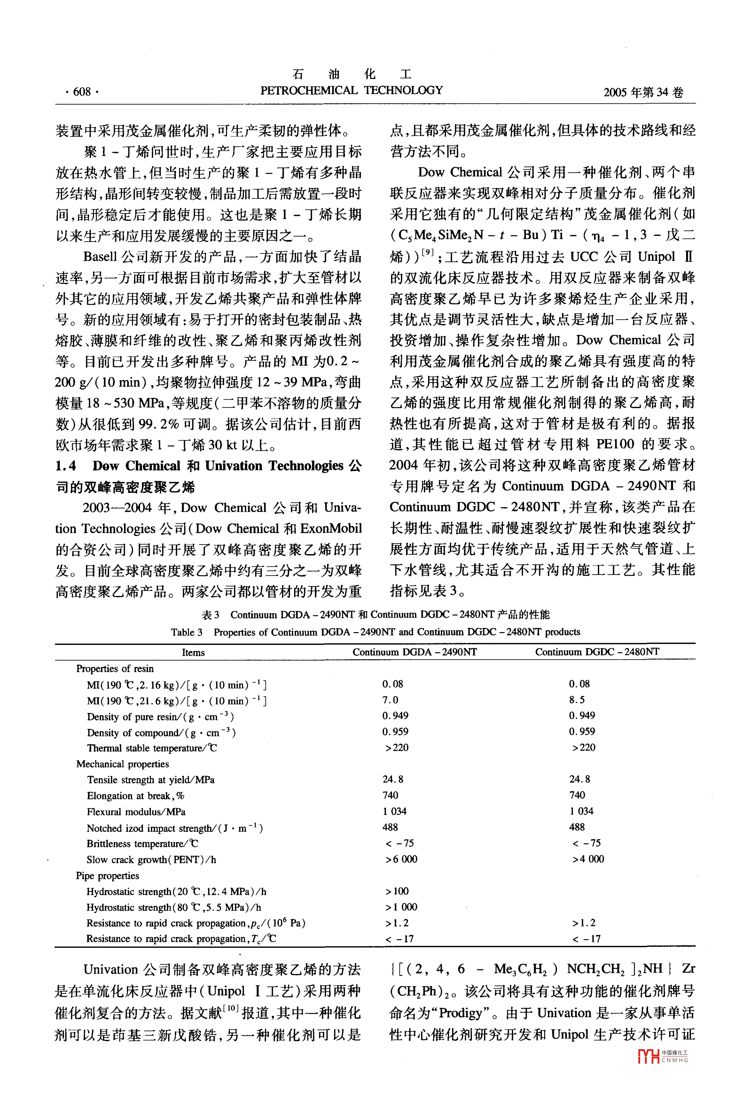 石油化工2005年第34卷第7期PETROCHEMICAL TECHNOLOGY605特約述評2003—2004年聚烯烴新品種的進(jìn)展呂立新(中國石油化工股份有限公司北京化工研究院,北京100013)[摘要]介紹了2003-2004午國外一些大型石化企業(yè)陸續(xù)推出的聚烯烴新品種,包括含有等規(guī)丙烯鏈鏈段結(jié)晶的聚烯烴熱塑性彈性體、新型柔韌丙烯共聚物、第二代聚1-丁烯用茂金屬催化劑制得的性能更優(yōu)異的管材用雙峰相對分子質(zhì)量分布聚乙烯及新一代無規(guī)共聚聚丙烯(PPR)管材專用料等,并從這些公司研究開發(fā)新品種的過程所得到的啟示,聯(lián)系實際,提出自已的看法。關(guān)鍵詞]聚烯烴;熱塑性彈性體;丙烯共聚物;雙峰相對分子質(zhì)量分布聚乙烯;無規(guī)共聚聚丙烯管材專用料;聚1-丁烯文章編號]100-8144(2005)07-0605-07[中圖分類號]TQ325.1[文獻(xiàn)標(biāo)識碼]A經(jīng)過20世紀(jì)90年代后期全球范圍內(nèi)大型石易加工。2004年2月 ExxonMobil chemical公司又化企業(yè)的兼并和重組,雖然聚烯烴生產(chǎn)企業(yè)數(shù)目大宣布,生產(chǎn)能力為90kt/a的聚烯烴熱塑性彈性體裝為減少,企業(yè)的研究工作也在調(diào)整,但新品種的研置在 Louisiana州 Baton Rouge建成并開車成功,產(chǎn)究開發(fā)仍在進(jìn)行。本文所指的新品種主要指那些品原定于2004年二季度上市必須通過聚合方法制備、生產(chǎn)規(guī)模較大、產(chǎn)品性能長期以來聚烯烴熱塑性彈性體受催化體系的限與傳統(tǒng)產(chǎn)品有較大不同的品種,對那些只需在原生制,無法采用聚合手段大規(guī)模生產(chǎn),只能用聚丙烯樹產(chǎn)裝置中采用改變操作條件或用已有樹脂經(jīng)二次脂與彈性體(主要是乙丙橡膠(EPR))共混或用動加工改性所制得的產(chǎn)品,只選取個別重要品種進(jìn)行態(tài)交聯(lián)的方法來實現(xiàn)。但能否用連續(xù)聚合裝置來生介紹。產(chǎn)聚烯烴熱塑性彈性體,一直是大家追求的目標(biāo)。本文對2003-2004年國外一些大型聚烯烴生 Exxon mobil chemical公司的這一成就,開創(chuàng)了制備產(chǎn)企業(yè)所涌現(xiàn)出來的聚烯烴新品種做簡單的回顧和聚烯烴熱塑性彈性體的新局面。介紹,同時研究國外企業(yè)研發(fā)這些新品種的過程。Vistamaxx產(chǎn)品到撰稿時尚未正式上市,目前尚無生產(chǎn)方法、產(chǎn)品牌號和性能方面的詳細(xì)報道。12003-2004年聚烯烴新品種據(jù)文獻(xiàn)報道,一般的EPR中,乙烯的摩爾分?jǐn)?shù)至2003-2004年,在已投入或即將投入工業(yè)生產(chǎn)少為50%以上才有良好的彈性,而在 Vistamaxx產(chǎn)的聚烯烴新品種中,值得一提的有:Eκ xon mobil品中卻至少含有摩爾分?jǐn)?shù)70%的丙烯。此外VisChemical公司牌號為 Vistamaxx的產(chǎn)品,一類新型 tamaxx產(chǎn)品和EPR的主要差別還在于EPR為非的以丙烯為基礎(chǔ)的熱塑性彈性體; Dow Chemical公晶型或其中含少量結(jié)晶的乙烯鏈段,而 Vistamaxx司的牌號為 Versify的產(chǎn)品,一類新型的柔韌的丙烯產(chǎn)品中卻含一定量的結(jié)晶的等規(guī)聚丙烯鏈段。因共聚物; Basell公司的第二代聚1-丁烯;Dow此要合成此類聚合物,必須控制好丙烯單元插入Chemical公司用茂金屬催化劑開發(fā)的管材用雙峰相時的立構(gòu)規(guī)整度(分子間)以及分子內(nèi)的組成,這對分子質(zhì)量分布(簡稱為雙峰)高密度聚乙烯和只能通過釆用茂金屬催化劑來達(dá)到。所以從結(jié)構(gòu)Uniⅳ vation公司研制的可用于制備管材用雙峰高密上看, Vistamaxx產(chǎn)品由富含聚丙烯鏈段序列的細(xì)度聚乙烯的催化劑; Borealis公司的 Beta PPR微結(jié)晶相分散于非晶相的共聚物基體中、不同大RA7050管材專用料。分子鏈間通過某些鏈段形成結(jié)晶,從而構(gòu)成實質(zhì)1.1 ExxonMobil chemic洲l公司的Ⅴ istamaxx產(chǎn)品的連接點(diǎn),使其在常溫下具有高的粘度和一定2003年6月 ExxonMobil Chemical公司宣布推出一種新型聚烯烴熱塑性彈性體,商品名為Ⅴis收稿日期]2005-02-0l:[修改稿日期]2005-02-11。tamaxx,采用茂金屬催化劑和溶液聚合技術(shù)生產(chǎn)。[作者簡介]呂立新(1929-),男,江蘇省蘇州市人,大學(xué),教授級高該產(chǎn)品柔軟,具有優(yōu)良的彈性和粘著性,為顆粒狀,級工程師,電話00-6421998石油化工606PETROCHEMICAL TECHNOLOGY2005年第34卷的強(qiáng)度,不易發(fā)生形變或蠕變。而當(dāng)溫度超過結(jié)同的催化劑和工藝條件來調(diào)節(jié)聚合物鏈中丙烯插入晶熔點(diǎn)后,該連接點(diǎn)被破壞,材料就極易加工。由時發(fā)生插錯(包括區(qū)位錯誤和立構(gòu)規(guī)整性錯誤)的此可見, Vistamaxx產(chǎn)品是利用大分子鏈和大分子數(shù)量以調(diào)節(jié)該聚合物的結(jié)晶度和晶片厚度(表現(xiàn)為鏈間的鏈段結(jié)晶形成連接點(diǎn),而不是利用化學(xué)交DSC測定時熔融熱的大小)。SPC2是組成和立構(gòu)聯(lián)的方法。規(guī)整度介于FPC和SPC之間的丙烯和乙烯共聚物,有關(guān) Exxon mobil Chemical公司彈性體的報在可調(diào)性的要求上和SPC一樣。還可在共混物中道12-6基本是描述多相體系共混物的制備方法,由加入各種礦物油類進(jìn)行充油或加人烴類樹脂以進(jìn)兩種或兩種以上結(jié)構(gòu)相似的烯烴共聚物共混而成。步改進(jìn)性能;由于共混物組成的可變性極大,因此可專利中分別命名為FPC,SPC,SPC2等。例如FPC制備出一系列產(chǎn)品。VⅤ ristamaxX