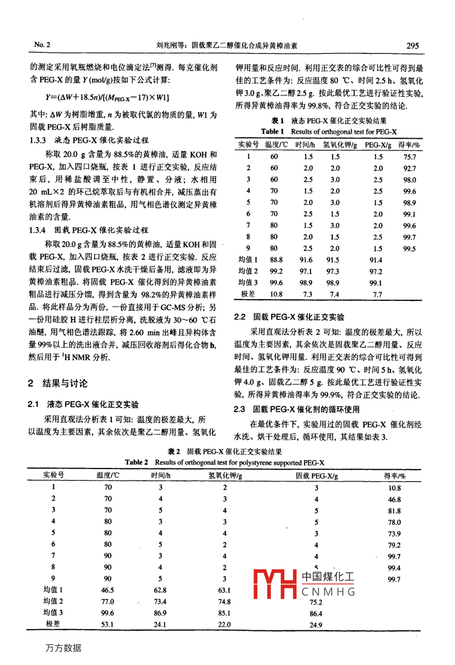 2008年第28卷有機(jī)化學(xué)Vol. 28, 2008第2期, 293~296Chinese Journal of Organic ChemistryNo. 2.293~296●研究簡(jiǎn)報(bào)●固載聚乙二醇催化合成異黃樟油素劉兆剛.朱凱*(南京林業(yè)大學(xué)化工學(xué)院南京210037)捎要以聚乙二醇 和固載聚乙二醇作為相轉(zhuǎn)移催化劑,在無(wú)溶劑條件下,黃樟油素經(jīng)催化異構(gòu)合成異黃樟油素.通過(guò)正交實(shí)驗(yàn),得到固載PEG-X (polyethylene glycol-X)催化最優(yōu)工藝條件為: m88.5%黃樟油) : m(KOH) : m(PEG-X)=1:0.2:0.25,反應(yīng)溫度90 C, 反應(yīng)時(shí)間5 h,在此工藝條件下,異黃樟油素得率為99.9%.固載PEG-X催化劑循環(huán)使用10次后其催化活性未見(jiàn)下降.結(jié)果顯示,固載聚乙二醇催化工藝具有操作簡(jiǎn)便、反應(yīng)溫度低、時(shí)間短、產(chǎn)率高以及對(duì)環(huán)境友好等優(yōu)點(diǎn).用'H NMR, GC-MS對(duì)異構(gòu)黃樟油素結(jié)構(gòu)進(jìn)行了表征,研究了固載聚乙二醇作為相轉(zhuǎn)移催化劑合成異黃樟油素的反應(yīng)機(jī)理.關(guān)鍵詞異黃樟油素; 異構(gòu)化;固載聚乙二醇;相轉(zhuǎn)移催化劑Synthesis of lsosafrole Catalyzed by Polyethylene GlycolSupported on PolystyreneLIU, Zhao-GangZHU, Kai*(College of Chemical Engineering, Nanjing Forestry Universit, Nanjing 210037)Abstract Isosafrole was synthesized from safrole by PEG-X (polyethylene glycol-X) or PEG-X supportedon polystyrene as a phase-transfer catalyst in solvent-free conditions. According to orthogonal experiments,the optimum technological conditions were obtained as follows: m(8.5% safrole) : m(KOH) :m(PEG-X)=1 : 0.2 : 0.25, temperature 90 C and time 5 h. The yield of isosafrole was 99% under suchconditions. The PEG-X supported on polystyrene can be used repeatedly for ten times without remarkableloss of catalytic activity. The results showed that this method provides several advantages such as a simplework-up procedure, a shorter reaction time, a lower reaction temperature, a higher yield and environmentalfriendliness. The structures of isosafrole were determined by 'H NMR and GC-MS spectra. A possiblemechanism for this reaction was proposed by PEG-X supported on polystyrene.Keywords isosafrole; isomerization; PEG supported on polystyrene; phase transfer catalyst洋茉莉醛是一種具有清甜豆香、茴香香氣的花香香包括黃樟油素的異構(gòu)化和異黃樟油素的氧化兩步反應(yīng).料,主要用于各種香精的調(diào)配,如高級(jí)化妝品香精、芳其中黃樟油素的異構(gòu)化主要有固體堿法2、季銨鹽法凹、香劑、皂用香精、食品香精、煙草香精等.此外,洋茉羰基鐵法及氫氧化鉀法(.前3種方法都能獲得較高的莉醛也是制藥工業(yè)中制備黃連素、多巴胺等藥物的重要得率,但存在催化劑制備工藝復(fù)雜、使用條件要求較高中間體,還可作為食品的殺蟲(chóng)劑、農(nóng)藥增效劑、電鍍工及回收困難等諸多問(wèn)題,致使這些先進(jìn)工藝無(wú)法應(yīng)用于業(yè)中的拋光劑凹。中國(guó)煤化工以黃樟油素為原料的半合成法合成洋茉莉醛,主要*THCNMHG主要采用氫氧化鉀異●E-mail: gyqlzg@yabho.com.cnReceived March 21, 2007; revised June 6, 2007; accepted August 16, 2007.294有機(jī)化學(xué)Vol. 28, 2008構(gòu)化法.其工藝為黃樟油素在減壓條件下,溫度控制在傳遞進(jìn)來(lái)起催化作用的,這個(gè)過(guò)程即是固體鹽的內(nèi)擴(kuò)散160~170 C,由氫氧化鉀醇溶液催化異構(gòu)6~7 h,得過(guò)程.率為90%1241.此異構(gòu)化工藝存在得率較低、能耗高、污第二步堿催化異構(gòu)機(jī)理:黃樟油素1在堿的催化下,染嚴(yán)重等問(wèn)題.針對(duì)這些問(wèn)題,本文采用了聚乙二醇相活性亞甲基上的氫被0H~奪取后形成烯丙基碳負(fù)離子,轉(zhuǎn)移催化劑(polyethylene glycol, PEG)進(jìn)行異構(gòu)化的研究,然后雙鍵發(fā)生轉(zhuǎn)移并結(jié)合質(zhì)子,最終生成穩(wěn)定的丙烯基以期降低反應(yīng)溫度、降低能耗、減少污染、提高得率.異構(gòu)體161.反應(yīng)式如Eq.1.CHs1實(shí)驗(yàn)CHgKOH/PTC(11.1 試劑與儀器試劑:黃樟油(88.5%,四川宜賓林化公司)、PEG-X(AR,進(jìn)口分裝)、鹵素甲基化苯乙烯樹(shù)脂(西安電力樹(shù)脂1.3 實(shí)驗(yàn)方法..廠)、儀器: AVATAR360FT-IR儀(KBr壓片), Trace DSQ1.3.1固載 PEG-X催化劑的制備GC-MS儀(FINNIGAN), Inova500MHz 核磁共振儀先用自來(lái)水沖洗鹵素甲基化苯乙烯樹(shù)脂至無(wú)鹵甲(CDCl3為溶劑, TMS為內(nèi)標(biāo)).醚氣味,再用去離子水洗去鹵離子,然后用乙醇淋洗,70 C以下烘干備用..2 實(shí)驗(yàn)原理第一步相轉(zhuǎn)移機(jī)理:固體KOH在一-定 的溫度下,取適量預(yù)處理過(guò)的鹵素甲基化苯乙烯樹(shù)脂(交聯(lián)度能溶于液態(tài)PEG-X形成絡(luò)合物.該絡(luò)合物在黃樟油中2%,鹵素含量22.2%,大孔樹(shù)脂球100~200目)放入三有-定的溶解度,從而一方面提供了均相催化的環(huán)境,頸瓶中,先用100mL甲苯溶脹12h,再加入50mL甲提高了催化效率;另一-方面由于絡(luò)合物進(jìn)入有機(jī)相后使苯,適量PEG-X, 50%氫氧化鈉溶液,然后于80 C下回得0H~裸露,增強(qiáng)了KOH的堿性;因此,反應(yīng)條件變得流攪拌9h,冷卻后抽濾,依次用乙醇、自來(lái)水和去離子溫和同時(shí)獲得很高的得率.固載PEG-X 相轉(zhuǎn)移催化劑水洗至無(wú)鹵離子,再用乙醇淋洗, 70 C以下烘干后得到催化機(jī)理屬于三相催化5(三相指固載PEG-X、固體固載PEG-X催化劑,用燃燒法測(cè)定鹵素含量為0.8%.KOH和液體黃樟油素).該機(jī)理