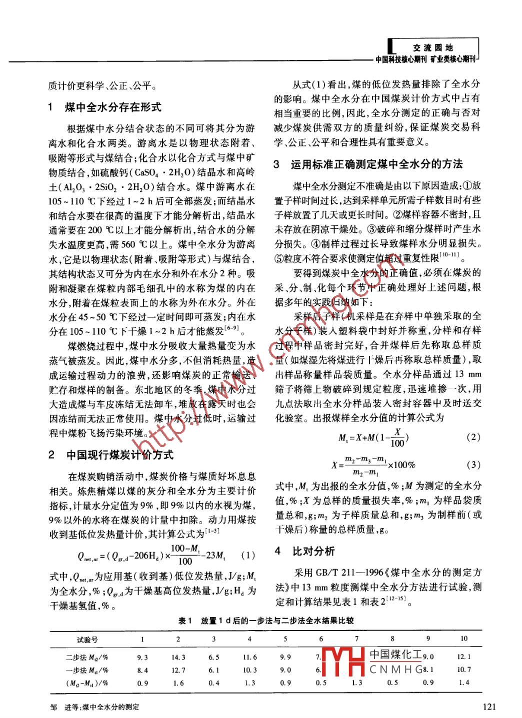 交流園地煤中全水分的測定鄒進(jìn),吳杰,朱彤(貴州省煤炭產(chǎn)品質(zhì)量監(jiān)督檢驗(yàn)院,貴州六盤水553001)摘要:煤中全水分是煉焦精煤中一項(xiàng)重要的計價指標(biāo),中國動力用煤采用收到基低位發(fā)熱量計價,每增加1%的全水分將會使發(fā)熱量降低260 J/g左右。準(zhǔn)確測定煤中全水分,可減少煤炭供需雙方的質(zhì)量糾紛,使煤炭按質(zhì)計價更科學(xué)、公正、公平,在煤炭按質(zhì)計價中起到舉足輕重的作用。根據(jù)多年的實(shí)踐經(jīng)驗(yàn),提出準(zhǔn)確測定煤中全水分可行的操作方法,以避免煤炭供需雙方產(chǎn)生不必要的質(zhì)量爭議。關(guān)鍵詞:煤中全水分;煉焦精煤;動力用煤;計價中圖分類號:TQ536.文獻(xiàn)標(biāo)識碼:B文章編號:1006-6772(2013)05-0120-03Determination of total moisture in coalZ0u Jin, WU Jie ,ZHU Tong( Guizhou Agency of Quality Superision and Inspection of Coal Product , Liupanshui 553001 ,China)Abstract :The total moisture in coal is one of the most important valuation indicators for coking coal. The steam coalis evaluated by the low heating value of received basis. A 1 percent increase in total moisture would decrease aboutcalorific value 260 J/g. The accurate determination of total moisture can reduce the quality dispute between supplyand requistioning parties and make the coal valuation more scientifie and fair. Through many years ’practice,provide feasible operating methods for the evaluation of steam coal.Key words :total moisture in coal ;coking coal ;steam coal ; valuationM.依次有所增加;從年輕無煙煤到年老無煙煤M0引言明顯增高,福建天湖山和北京礦區(qū)等無煙煤Ma達(dá)煤中水分是評價煤炭經(jīng)濟(jì)價值最基本的指標(biāo),5%~ 10% [1-5]。在煤的理論研究和煤炭加工利用中具有重要作用。煤中全水分指煤中的游離水,它與煤炭開采、廣義上看煤的空氣干燥基水分與煤化程度有關(guān),運(yùn)輸和環(huán)境氣候等外在因素有關(guān)。煤質(zhì)分析中因從褐煤到肥煤水分逐漸減少,從焦煤到年老無煙煤水分測定項(xiàng)目比較簡單往往被人們忽視致使測值水分又逐漸增加。云南等地的晚第三紀(jì)年輕褐煤不準(zhǔn)確,采樣、存樣、分樣、制樣等環(huán)節(jié)的操作失誤M。高達(dá)30%以上;長焰煤不黏煤、弱黏煤、1/2中使水分損失無法獲得真實(shí)結(jié)果。煤中水分測值的黏煤、氣肥煤、氣煤、1/3焦煤M.依次降低,肥煤正確與否直接關(guān)系煤炭計價指標(biāo),因此準(zhǔn)確測定煤和焦煤M最低,為0.5%以下;瘦煤、貧瘦煤、貧煤中水 分可減少煤炭供需雙方的質(zhì)量爭議,使煤炭按中國煤化工收稿日期:2013-08-10責(zé)任編輯:孫淑君MCHCNMHG作者簡介:鄒進(jìn)(1958- -) ,男,重慶人,煤質(zhì)檢驗(yàn)高級工程師,貴州省煤檢院副總工,長期從爭保及質(zhì)里征物、盆省寺怕犬工作。引用格式:鄒進(jìn),吳杰,朱彤. 煤中全水分的測定[J]潔凈煤技術(shù),2013 ,19(5) :120-122120《潔凈煤技術(shù)》2013年第19卷第5期.交流園地-中國科技核心期刊礦業(yè)類核心期刊J質(zhì)計價更科學(xué)、公正、公平。從式(1)看出,煤的低位發(fā)熱量排除了全水分的影響。煤中全水分在中國煤炭計價方式中占有1煤中全水分存在形式相當(dāng)重要的比例,因此,全水分測定的正確與否對根據(jù)煤中水分結(jié)合狀態(tài)的不同可將其分為游減少煤炭供需雙方的質(zhì)量糾紛,保證煤炭交易科離水和化合水兩類。游離水是以物理狀態(tài)附著、學(xué) 、公正、公平和合理性具有重要意義。吸附等形式與煤結(jié)合;化合水以化合方式與煤中礦3運(yùn)用標(biāo)準(zhǔn) 正確測定煤中全水分的方法物質(zhì)結(jié)合,如硫酸鈣(CaSO,●2H20)結(jié)晶水和高嶺土(Al203.2SiO2● 2H20)結(jié)合水。煤中游離水在煤中全水分測定不準(zhǔn)確是由以下原因造成:①放105~110C下經(jīng)過1~2h后可全部蒸發(fā);而結(jié)晶水置子樣時間過長,達(dá)到采樣單元所需子樣數(shù)目時有些和結(jié)合水要在很高的溫度下才能分解析出,結(jié)晶水子樣放置了幾天或更長時間。②煤樣容器不密封,且通常要在200 C以上才能分解析出,結(jié)合水的分解未存放在陰涼干燥處。③破碎和縮分煤樣時產(chǎn)生水失水溫度更高,需560C以上。煤中全水分為游離分損失。④制樣過程過長導(dǎo)致煤樣水分明顯損失。水,它是以物理狀態(tài)(附著、吸附等形式)與煤結(jié)合,⑤粒度不符合要求使測定值超過重復(fù)性限10-11。其結(jié)構(gòu)狀態(tài)又可分為內(nèi)在水分和外在水分2種。吸要得到煤炭中全水分的正確值,必須在煤炭的附和凝聚在煤粒內(nèi)部毛細(xì)孔中的水稱為煤的內(nèi)在采分、制、化每個環(huán)節(jié)中正確處理好上述問題,根水分,附著在煤粒表面上的水稱為外在水分。外在據(jù)多年的實(shí)踐歸納如下:水分在45~50 C下經(jīng)過一定時間即可蒸發(fā);內(nèi)在水采樣后子樣(機(jī)采樣是在棄樣中單獨(dú)采取的全分在105~110 C下干燥1~2 h后才能蒸發(fā)[6-9]。水分子樣)裝人塑料袋中封好并稱重,分樣和存樣煤燃燒過程中,煤中水分吸收大量熱量變?yōu)樗^程中樣品密封完好,合并煤樣后先稱取總樣質(zhì)蒸氣被蒸發(fā)。因此,煤中水分多,不但消耗熱量,造量(如煤濕先將煤進(jìn)行干燥后再稱取總樣質(zhì)量) ,取成運(yùn)輸過程動力的浪費(fèi),還影響煤炭的正常輸送、出樣品稱量樣品袋質