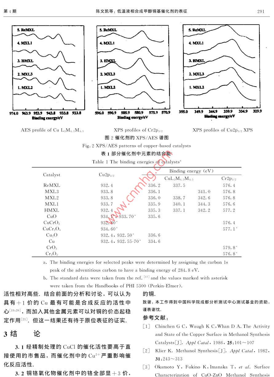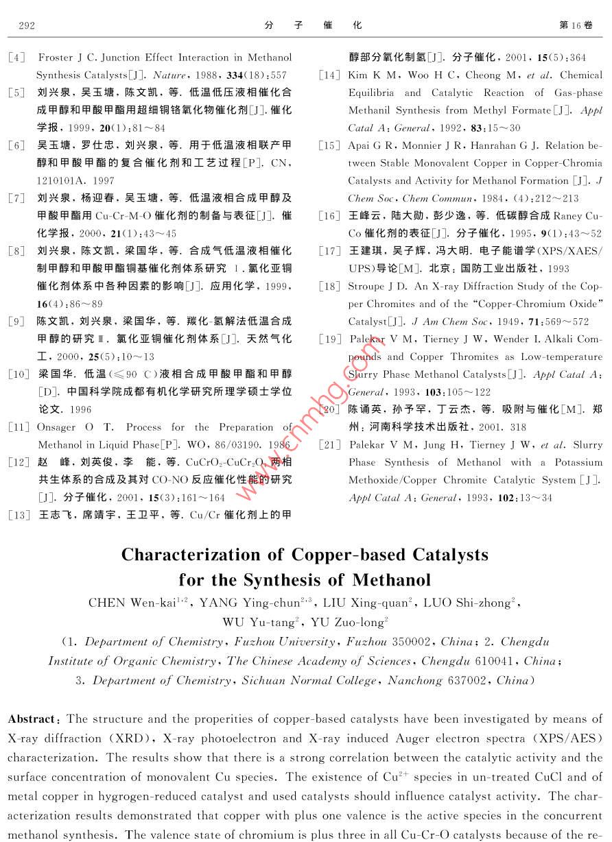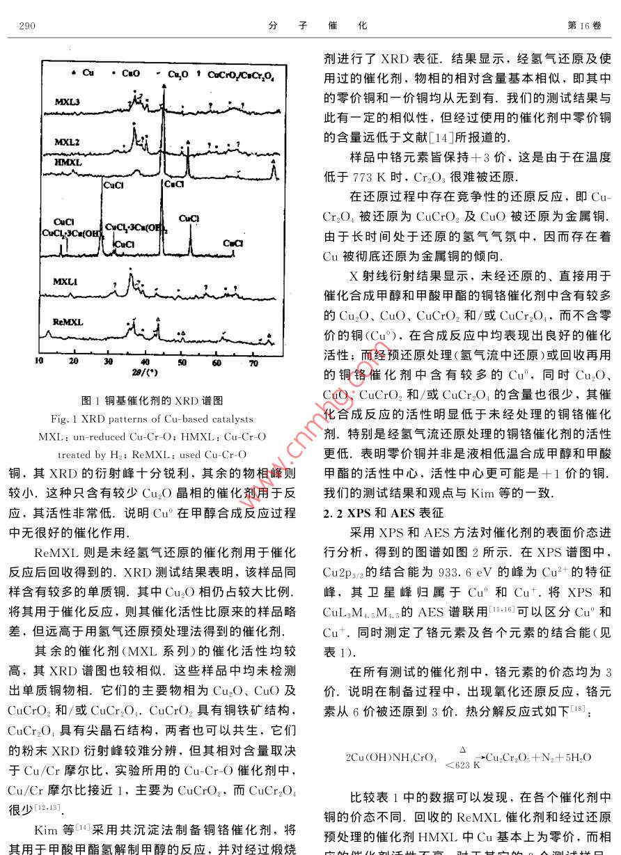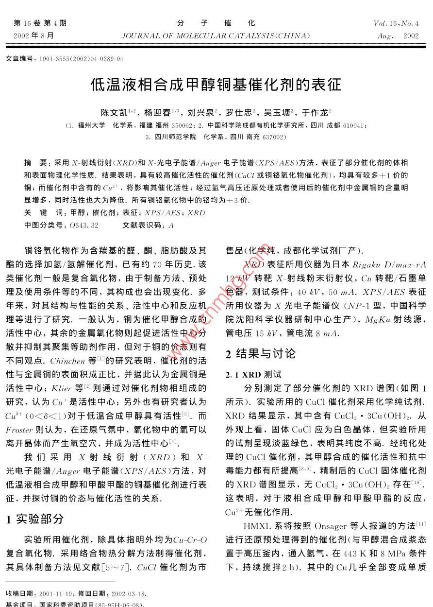 第16卷第4期分子催化Vol. 16. No42002年8月JOURNAL OF MOLECU LAR CATALYSIS(CHINA)2002文章編號:1001-3555(2002)04-0289-0低溫液相合成甲醇銅基催化劑的表征陳文凱2,楊迎春3,劉興泉,羅仕忠2,吳玉塘2,于作龍1.福州大學(xué)化學(xué)系,福建福州350002;2.中國科學(xué)院成都有機(jī)化學(xué)研究所,四川成都610041;3.四川師范學(xué)院化學(xué)系,四川南充637002)摘要:采用X-射線衍射(XRD)和X-光電子能譜/4ger電子能譜(XPS/AES)方法,表征了部分催化劑的體相和表面物理化學(xué)性質(zhì).結(jié)果表明,具有較高催化活性的催化劑(CCl或銅鉻氧化物催化劑),均具有較多+1價(jià)的銅;而催化劑中含有的C2+,將影響其催化活性;經(jīng)過氫氣高壓還原處理或者使用后的催化劑中金屬銅的含量明顯增多,同時(shí)活性也大為降低.所有銅鉻氧化物中的鉻均為+3價(jià)關(guān)鍵詞:甲醇;催化劑;表征;XPS/AES;XRD中圖分類號:O643.32文獻(xiàn)表識碼:A銅鉻氧化物作為含羰基的醛、酮、脂肪酸及其售品(化學(xué)純,成都化學(xué)試劑廠產(chǎn)).酯的選擇加氫/氬解催化劑,已有約70年歷史.該XRD表征所用儀器為日本 Rigaku l/類催化劑一般是復(fù)合氧化物,由于制備方法、預(yù)處12kW轉(zhuǎn)靶X-射線粉末衍射儀,Cu轉(zhuǎn)靶/石墨單理及使用條件等的不同,其構(gòu)成也會(huì)出現(xiàn)變化.多色器,測試條件:40kV,50mA.XPS/AES表征年來,對其結(jié)構(gòu)與性能的關(guān)系、活性中心和反應(yīng)機(jī)所用儀器為ⅹ光電子能譜儀(NP-1型,中國科學(xué)理等進(jìn)行了研究.一般認(rèn)為,銅為催化甲醇合成的院沈陽科學(xué)儀器研制中心生產(chǎn)),MgKα射線源,活性中心,其余的金屬氧化物則起促進(jìn)活性中心分管電壓15kV,管電流8mA.散并抑制其聚集等助劑作用,但對于銅的價(jià)態(tài)則有不同觀點(diǎn). Chinchen等的研究表明,催化劑的活結(jié)果與討論性與金屬銅的表面積成正比,并據(jù)此認(rèn)為金屬銅是2.1XRD測試活性中心; Klier等則通過對催化劑物相組成的分別測定了部分催化劑的XRD譜圖(如圖1研究,認(rèn)為C-是活性中心;另外也有研究者認(rèn)為所示).實(shí)驗(yàn)所用的CuCl催化劑采用化學(xué)純試劑Ca+(0<δ<1)對于低溫合成甲醇具有活性.而XRD結(jié)果顯示,其中含有CuCl2·3Cu(OH)2.從Froster則認(rèn)為,在還原氣氛中,氧化物中的氧可以外觀上看,固體CuCl應(yīng)為白色晶體,但實(shí)驗(yàn)所用離開晶體而產(chǎn)生氧空穴,并成為活性中心的試劑呈現(xiàn)淡藍(lán)綠色,表明其純度不高.經(jīng)純化處我們采用Ⅹ-射線衍射(XRD)和Ⅹ-理的CuCl催化劑,其甲醇合成的催化活性和抗中光電子能譜/ Auger電子能譜(XPS/AES)方法,對毒能力都有所提高8,精制后的CuCl固體催化劑低溫液相合成甲醇和甲酸甲酯的銅基催化劑進(jìn)行表的XRD譜圖顯示,無CuCl2:3Cu(OH)2存在征,并探討銅的價(jià)態(tài)與催化活性的關(guān)系這表明,對于液相合成甲醇和甲酸甲酯的反應(yīng),1實(shí)驗(yàn)部分Cu2+無催化作用HMXL系將按照 Onsager等人報(bào)道的方法1實(shí)驗(yàn)所用催化劑,除具體指明外均為(aCrO進(jìn)行還原預(yù)處理得到的催化劑(與甲醇混合成漿態(tài)復(fù)合氧化物.采用絡(luò)合物熱分解方法制得催化劑,置于高壓釜內(nèi),通入氫氣,在443K和8MPa條件其具體制備方法見文獻(xiàn)[5~7].ClCl催化劑為市下,持續(xù)攪拌2h).其中的Cu幾乎全部變成單質(zhì)收稿日期:2001-11-19;修回日期:2002-03-18第16卷劑進(jìn)行了XRD表征.結(jié)果顯示,經(jīng)氫氣還原及使▲c·Cu0·c20 CuCro!CCr,o4用過的催化劑,物相的相對含量基本相似,即其中MXL3的零價(jià)銅和一價(jià)銅均從無到有.我們的測試結(jié)果與此有一定的相似性,但經(jīng)過使用的催化劑中零價(jià)銅的含量遠(yuǎn)低于文獻(xiàn)[14所報(bào)道的樣品中鉻元素皆保持+3價(jià),這是由于在溫度低于773K時(shí),Cr2O3很難被還原在還原過程中存在競爭性的還原反應(yīng),即被還原為 CuCao,及CuO被還原為金屬銅CuCL: C(OH由于長時(shí)間處于還原的氫氣氣氛中,因而存在著Cu被徹底還原為金屬銅的傾向MXLIⅩ射線衍射結(jié)果顯示,未經(jīng)還原的、直接用于催化合成甲醇和甲酸甲酯的銅鉻催化劑中含有較多的Cu3O、CuO、 CuRe2和/或CuCr2O1,而不含零價(jià)的銅(Cu°),在合成反應(yīng)中均表現(xiàn)出良好的催化20活性;而經(jīng)預(yù)還原處理(氫氣流中還原)或回收再用的銅鉻催化劑中含有較多的Cu°,同時(shí)CuO圖1銅基催化劑的XRD譜圖CuO、 Cure2和/或CuCr2O4的含量也很少,其催1 XRD patterns of Cu-based catalys化合成反應(yīng)的活性明顯低于未經(jīng)處理的銅鉻催化MXL un-reduced Cu-Cr-O: HMXL: Cu-Cr-O劑.特別是經(jīng)氫氣流還原處理的銅鉻催化劑的活性reated by H=: ReMXL used Cu-Cr-O更低.表明零價(jià)銅并非是液相低溫合成甲醇和甲酸銅,其XRD的衍射峰十分銳利,其余的物相峰則甲酯的活性中心,活性中心更可能是+1價(jià)的銅較小.這種只含有較少Cu2O晶相的催化劑用于反我們的測試結(jié)果和觀點(diǎn)與Kim等的一致應(yīng),其活性非常低.說明Cu°在甲醇合成反應(yīng)過程2.2XPS和AES表征中無很好的催化作用采用XPS和AES方法對催化劑的表面價(jià)態(tài)進(jìn)ReMI則是未經(jīng)氫氣還原的催化劑用于催化行分析,得到的圖譜如圖2所示.在XPS譜圖中,反應(yīng)后回收得到的.XRD測試結(jié)果表明,該樣品同Cu2p2的結(jié)合能為933.6eV的峰為Cu