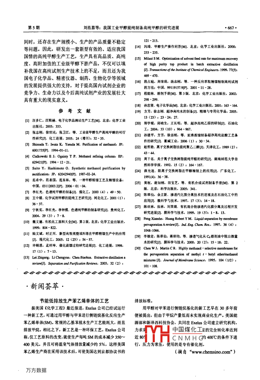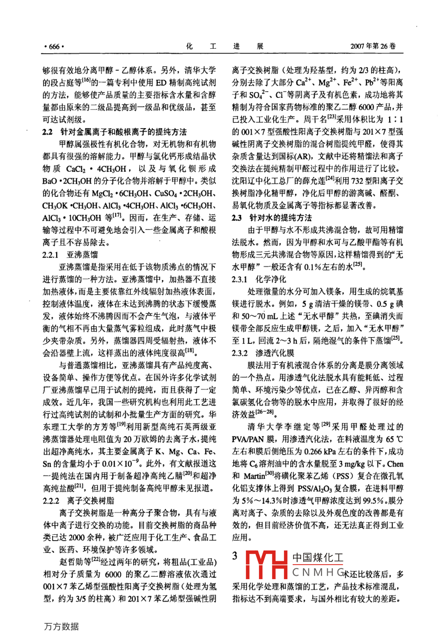化工進(jìn)展CHEMICAL INDUSTRY AND ENGINEERING PROGRESS2007年第26卷第5期我國工業(yè)甲醇提純制備高純甲醇的研究進(jìn)展劉范嘉1,張衛(wèi)江1,謝英芹1,張志剛2,楊光輝3(天津大學(xué)化工學(xué)院,天津30072;2沈陽化工學(xué)院化學(xué)工程學(xué)院,遼寧沈陽110003中國石油化工股份有限公司天津分公司研究院,天津300271)摘要:對照工業(yè)甲醇和高純甲醇的指標(biāo)要求,分別介紹了工業(yè)甲醇中的有機(jī)物、離于和水3大類雜質(zhì)去除方法的研究動態(tài),對我國工業(yè)甲醇提純制備高純甲醇的研究進(jìn)展進(jìn)行了評迷,最后指岀了我國現(xiàn)有的髙純甲醇制備技術(shù)存在的問題和研發(fā)意義關(guān)鍵詞:工業(yè)甲醇;高純甲醇;提純;制備中圖分類號:TQ4206文獻(xiàn)標(biāo)識碼:A文章編號:1000-6613(200705-0664-04Progress of producing high purity methanol from industrialgrade methanol by purification in ChinaLIU Fanjia, ZHANG Wejiang XIE Yingqin', ZHANG Zhigang, YANG GuanghuiSchool of Chemical Engineering and Technology, Tianjin University, Tianjin 300072, China2 School of Chemical Engineering, Shenyang Institute of Chemical Technology, Shenyang 110000,Liaoning,China;Research Institute of Tianjin Petrochemical Company, SINOPEC, Tianjin 300271, China)Abstract: Referring to the specifications of industrial grade methanol and high purity methanol, thedevelopments in eliminating organic matter, ions and water from industrial grade methanol wereintroduced. The latest progress of producing high purity methanol from industrial grade methanol bypurification in China was reviewed, The problems of high purity methanol production technology inChina were discussed and the significance of research on methanol purification was emphasizedKey words high purity methanol; industrial grade methanol; purification; preparation工業(yè)甲醇是化工產(chǎn)業(yè)的重要下游產(chǎn)品之一,價(jià)甲醇蒸氣中的雜質(zhì),需要以高純的錳氧化物為主要格低廉、原料充足。近年,甲醇工業(yè)發(fā)展迅速,而成分的催化劑,還需要有高純的氣體如氮?dú)?、氫氣國?nèi)市場容量有限。如何消化過剩的甲醇,大力開或氬氣等作為防氧化保護(hù)氣國,該種方法對生產(chǎn)工發(fā)生產(chǎn)甲醇深加工的精細(xì)化工產(chǎn)品,對于企業(yè)在市藝條件的要求十分嚴(yán)格。另一類方法是用粗甲醇提場經(jīng)濟(jì)條件下提高經(jīng)濟(jì)效益具有重要意義。另一純精制,該種方法比較適合我國現(xiàn)階段的國情2。方面,高純甲醇國內(nèi)市場需求增長較快、缺口較大,甲醇精制技術(shù)在國內(nèi)外已經(jīng)研究很長時(shí)間,公尤其是高純度高規(guī)格的產(chǎn)品,國內(nèi)生產(chǎn)尚屬空白,開的技術(shù)文件也比較多6。國外知名企業(yè)多采用市場需求只能長期依賴進(jìn)口解決2多級精餾、吸附、亞沸蒸餾等先進(jìn)工藝,并實(shí)現(xiàn)連利用工業(yè)甲醇制備高規(guī)格高純度的試劑甲醇,續(xù)生產(chǎn)、檢測和灌裝的一體化操作,產(chǎn)品質(zhì)量穩(wěn)定附加值高,極富市場開發(fā)價(jià)值。生產(chǎn)和檢驗(yàn)工藝嚴(yán)格,操作彈性大,指標(biāo)可按照用高純甲醇的技術(shù)開發(fā)背景戶不同行調(diào)芏。太坦皎低,其生產(chǎn)規(guī)模中國煤化工高純甲醇的制備方法基本上可歸納為兩大類CNMHGI-25類是用高純原料氣直接合成,合成過程中需要潔Mms6m.聯(lián)人張衛(wèi)江,教授,主要從事化工分離及化凈的反應(yīng)環(huán)境、設(shè)備及嚴(yán)格的反應(yīng)條件,為了去除工清潔生產(chǎn)工藝技術(shù)方面的研究,電話02-27409476第5期劉范嘉等:我國工業(yè)甲醇提純制備高純甲醇的研究進(jìn)展665·大,可達(dá)到萬噸級。國內(nèi)也有很多廠家和研究單位的大部分組分也可以通過化學(xué)處理后再精餾而得到正在研發(fā)該種技術(shù),并取得了一定的進(jìn)展9分離。2高純甲醇的提純制備方法有的化學(xué)試劑廠家利用鹽酸羥胺與甲醇中的醛酮雜質(zhì)反應(yīng)生成固體肟;有的通過2,4二硝基苯目前,國內(nèi)外常用的適于有機(jī)液體提純的技術(shù)肼除去醛酮9;更為經(jīng)濟(jì)有效的是高錳酸鉀氧化有各種形式的蒸餾、精餾、萃取、化學(xué)處理、離子法,將還原性物質(zhì)氧化成二氧化碳逸出,或生成酸交換、吸附過濾、超凈過濾、制備色譜等十幾種。并結(jié)合成鉀鹽與高錳酸鉀泥渣一同濾去圖。這些提純技術(shù)各有特點(diǎn),各有所長213反應(yīng)精餾受催化劑選擇性的限制,合成甲醇的反應(yīng)過程反應(yīng)精餾( reactive distillation,簡稱RD)是精餾中不可避免的伴隨著一系列副反應(yīng)生成少量的烴、技術(shù)中的一個(gè)特殊領(lǐng)域。它使化學(xué)反應(yīng)過程和精餾醇、醛、醚、酸和酯等化合物。由于采用不同的分離的物理過程結(jié)合在一起,是伴有化學(xué)反應(yīng)的新原料、催化劑及合成條件(如壓力、溫度、合成氣型特殊精餾過程。RD具有很多優(yōu)點(diǎn):選擇性高;組成等),工業(yè)甲醇產(chǎn)品的組成十分復(fù)雜,各廠之間使可逆反應(yīng)收率提高;縮短反應(yīng)時(shí)間,強(qiáng)化設(shè)備生也有較大差異。此外,甲醇具有很強(qiáng)的溶解能力,產(chǎn)能力;能耗低,操作費(fèi)用低;投資少等。但RD生產(chǎn)、存儲、運(yùn)輸?shù)冗^程中還會引入一些雜質(zhì)。對僅適用于反應(yīng)過程和反應(yīng)組分的精餾分離可以
