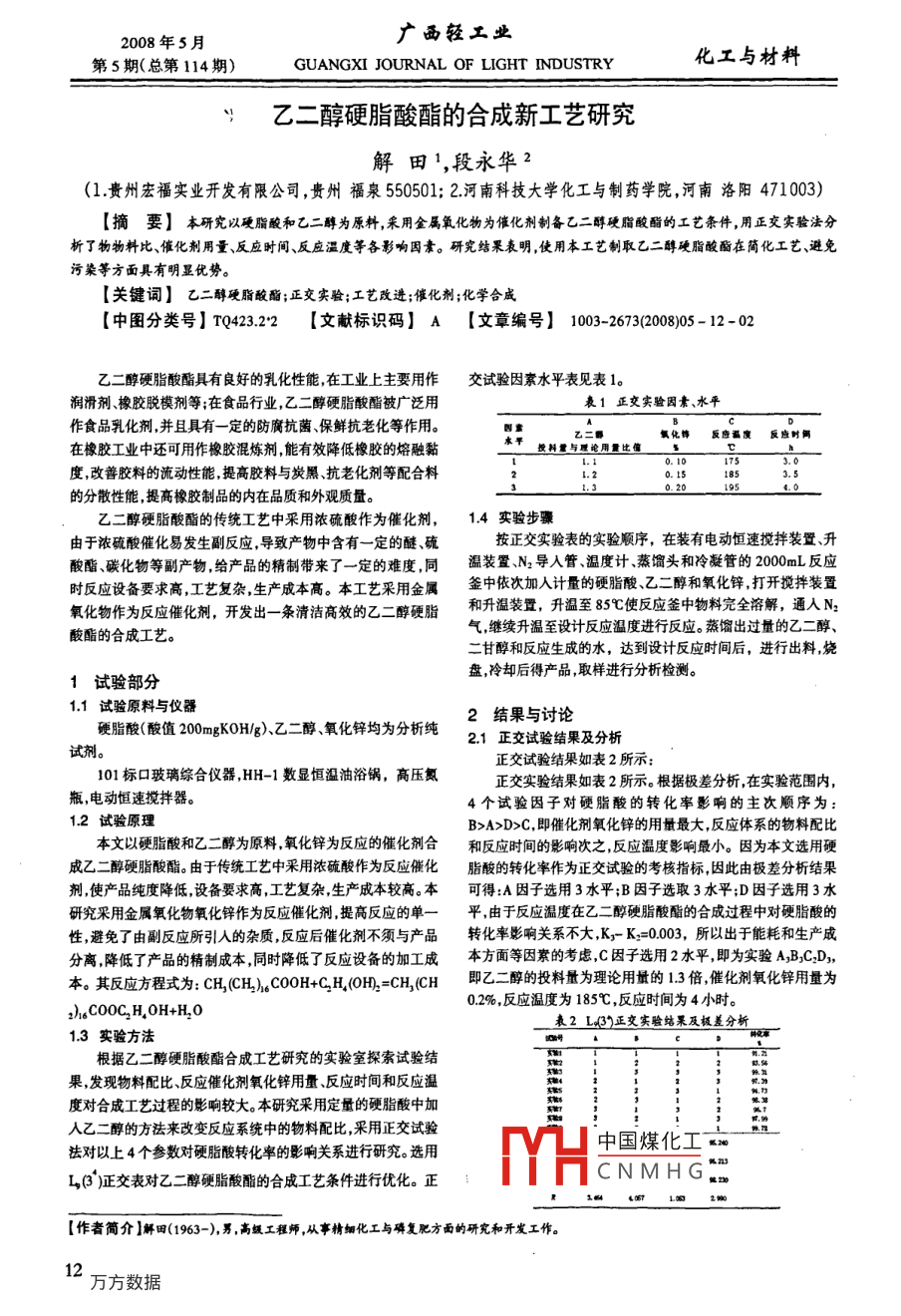 2008年5月廣西輕工業(yè)第5期(總第114期)GUANGXI JOURNAL OF LIGHT INDUSTRY化工與材料乙二醇硬脂酸酯的合成新工藝研究解田1,段永華(1貴州宏福實業(yè)開發(fā)有限公司,貴州福泉550501:2河南科技大學化工與制藥學院,河南洛陽471003)【摘要】本研究以硬脂酸和乙二醇為原料,采用金屬氧化物為催化劑制備乙二醇硬脂酸酯的工藝條件用正交實驗法分析了物物料比、催化劑用量、反應時間、反應溫度等各影響因素。研究結果表明,使用本工藝制取乙二醇硬脂酸酯在簡化工藝、避免污染等方面具有明顯優(yōu)勢?!娟P鍵詞】乙二醇硬脂酸酯;正交實驗;工藝改進;催化劑;化學合威【中圖分類號】TQ423.22【文獻標識碼】A【文章編號】1003-2673(2008)05-12-02乙二醇硬脂酸酯具有良好的乳化性能,在工業(yè)上主要用作交試驗因素水平表見表1。潤滑劑橡膠脫模劑等;在食品行業(yè),乙二醇硬脂酸酯被廣泛用表1正交實驗因素、水平作食品乳化劑,并且具有一定的防腐抗菌、保鮮抗老化等作用氧化飾反應福度反應時倆在橡膠工業(yè)中還可用作橡膠混煉劑能有效降低橡膠的熔融黏度,改善膠料的流動性能提高膠料與炭黑、抗老化劑等配合料的分散性能提高橡膠制品的內在品質和外觀質量。乙二醇硬脂酸酯的傳統(tǒng)工藝中采用濃硫酸作為催化劑,14實驗步驟由于濃硫酸催化易發(fā)生副反應,導致產(chǎn)物中含有一定的醚、硫按正交實驗表的實驗順序,在裝有電動恒速攪拌裝置、升酸酯、碳化物等副產(chǎn)物給產(chǎn)品的精制帶來了一定的難度,同溫裝置N2導人管、溫度計蒸餾頭和冷凝管的2000nL反應時反應設備要求高,工藝復雜,生產(chǎn)成本高。本工藝采用金屬釜中依次加入計量的硬脂酸、乙二醇和氧化鋅打開攪拌裝置氧化物作為反應催化劑,開發(fā)出一條清潔高效的乙二醇硬脂和升溫裝置,升溫至85℃使反應釜中物料完全溶解,通入N23酸酯的合成工藝氣,繼續(xù)升溫至設計反應溫度進行反應。蒸餾出過量的乙二醇、二甘醇和反應生成的水,達到設計反應時間后,進行出料燒盤冷卻后得產(chǎn)品取樣進行分析檢測。1試驗部分11試驗原料與儀器2結果與討論硬脂酸(酸值200 mgKOH/g)、乙二醇、氧化鋅均為分析純21正交試驗結果及分析試劑。正交試驗結果如表2所示:101標口玻璃綜合儀器,HH-1數(shù)顯恒溫油浴鍋,高壓氮正交實驗結果如表2所示。根據(jù)極差分析,在實驗范圍內瓶,電動恒速攪拌器。4個試驗因子對硬脂酸的轉化率影響的主次順序為12試驗原理B>A>D>C,即催化劑氧化鋅的用量最大,反應體系的物料配比本文以硬脂酸和乙二醇為原料氧化鋅為反應的催化劑合和反應時間的影響次之反應溫度影響最小。因為本文選用硬成乙二醇硬脂酸酯。由于傳統(tǒng)工藝中采用濃硫酸作為反應催化脂酸的轉化率作為正交試驗的考核指標因此由極差分析結果劑使產(chǎn)品純度降低,設備要求高,工藝復雜生產(chǎn)成本較高。本可得:A因子選用3水平;B因子選取3水平D因子選用3水f究采用金屬氧化物氧化鋅作為反應催化劑,提高反應的單一平,由于反應溫度在乙二醇硬脂酸酯的合成過程中對硬脂酸的性,避免了由副反應所引入的雜質反應后催化劑不須與產(chǎn)品轉化率影響關系不大KyK2=0003,所以出于能耗和生產(chǎn)成分離降低了產(chǎn)品的精制成本同時降低了反應設備的加工成本方面等因素的考慮C因子選用2水平即為實驗A3BC2D1,本。其反應方程式為:CH1CH)4COOH+CEH(OH2=CH1CH即乙二醇的投料量為理論用量的13倍催化劑氧化鋅用量為02%,反應溫度為185℃,反應時間為4小時。2)h1 COOC, H,OH+H, o表2L3正交實驗結果及極差分析13實驗方法根據(jù)乙二醇硬脂酸酯合成工藝研究的實驗室探索試驗結果,發(fā)現(xiàn)物料配比、反應催化劑氧化鋅用量反應時間和反應溫度對合成工藝過程的影響較大。本研究采用定量的硬脂酸中加事421人乙二醇的方法來改變反應系統(tǒng)中的物料配比,采用正交試驗法對以上4個參數(shù)對硬脂酸轉化率的影響關系進行研究。選用中國煤化工L③3)交表對乙二醇硬脂酸酯的合成工藝條件進行優(yōu)化。正CNMHG【作者簡介】解田(1963-),男高媛工程師,從事精細化工與碎復肥方面的研究和開發(fā)工作。22平行驗證實驗為185℃,反應時間為4個小時。在此工藝條件下硬脂酸的轉在乙二醇硬脂酸酯合成工藝研究的基礎上,對優(yōu)化出的最化率達到9998%,所得產(chǎn)品性能優(yōu)越。佳工藝條件進行平行驗證試驗。實驗控制指標為乙二醇的投料由于乙二醇硬脂酸酯合成過程中選用氧化鋅作為合成反量為理論用量的13倍催化劑氧化鋅用量為02%,反應溫度應的催化劑,提高了生產(chǎn)原料的轉化率和原料的利用率降低為185℃,反應時間為4小時。實驗結果如表3所示。了乙二醇硬脂酸酯的生產(chǎn)成本。表3平行實驗表金屬氧化物作為酯化催化劑,催化活性高,反應結束后以脂肪酸鹽形式進入產(chǎn)品,實際應用表明:金屬氧化物不影響產(chǎn)品綜合性能,避免了傳統(tǒng)工藝中濃硫酸催化劑帶來的工業(yè)污染,解決了催化劑回收困難的問題,簡化了乙二醉硬脂酸酯的合成工藝路線,降低了對生產(chǎn)設備的要求,具有很高的應用和由表3可以看出在乙二醇硬脂酸酯的合成工藝研究優(yōu)化推廣價值。的最佳工藝條件下,硬脂酸的轉化率達到9998%,平行實驗平均相對誤差僅為001%,且最大絕對誤差為002