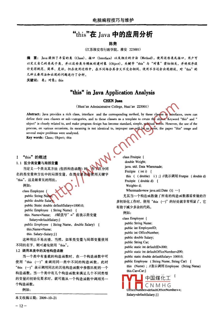 電腦編程技巧與維護“this"”在Java中的應用分析陳雋.(江蘇淮安市行政學院,淮安223001)摘要: Java提供了豐富的類(Class)、 接口(Interface) 以及相應的方法(Method)。 使用這些類或接口,用戶可以定義自己的類或子類,并以這些類為模板創(chuàng)建對象(0bject)。 關(guān)鍵宇“this”" 與“對象”密切相關(guān),并使程序設(shè)計變得規(guī)范、簡單、靈話。但在使用過程中,在不同場合其含義不完全相同,使用不當還會出現(xiàn)錯誤,對“this" 的幾種主要用法和出現(xiàn)的問題進行了分析。關(guān)鍵詞:類;對象; this ."this" in Java Application AnalysisCHEN Juan(Huai an Administrative College, Huai'an 223001)Abstract: Java provides a rich class, interface and the corresponding method, by these classes or interfaces, users candefine their own clases or sub-calegories, and to these classes as a template to create the object. Keyword "this" and”object" is closely related to, and make program design has become slandard, simple, spiritual words. However, the use of theprocess, on various occasions, its meaning is not identical to, improper use will be an eror, the paper "this" usage andseveral major problems were analyzed.Key words: Class; Object; this1“"this" 的概述class Fruitpie {1.1區(qū)分類變與局部變量double Weight;java. util. Data Whenmade;當定義一個類及其方法(包括構(gòu)造函數(shù))時,為了區(qū)分同F(xiàn)ruitpie (inti) {名的類變量和方法中的局部變量,在類變址名前使用關(guān)鍵字this ( ( double) i) ;} 11表示調(diào)用Frutpie ( double d)“this" .這是最常見的用法。Fruitpie ( double d)例如:Weight= d;class Employee {Whenmade=new java.util.Date 0} .public String Name;尤其當一個構(gòu)造兩數(shù)做了所有的構(gòu)造附數(shù)都需要做的許public double Salary;多初始化工作時,使用“this (.)” 的好處就非常明顯了,它public Static double defaultSalary: 1000.0;有助于減少多余的代碼。public Employee ( String Name) {this. Name=Name; /賦值號” =”前表示類變量Salay=defaulSalary;}public Employee ( String Name, double Salary) {public int EmployeeID;this.Name=Name;this. Salary= Salary;} }public int OfficeNumber;這種用法不易出錯,當然,如果類變量與局部變量使用public String Car;不同的名字,則叮避免使用"this"。public static int defaultID=300;1.2調(diào)用本類中的其他構(gòu)造函數(shù)public static int defaltofficeNumher-200;當一個類中有重載的構(gòu)造函數(shù)時,在一-個構(gòu)造函數(shù)中可public static double defaulSalary= 100.0;使用“this (-)" 來調(diào)用同一類中不同的構(gòu)造兩數(shù)。此時public Employee ( String Name, String Car)“this (.)”" 表示調(diào)用同名的其他構(gòu)造函數(shù)中參數(shù)匹配的一-個this (Name) ; /表示調(diào)用Employee (String Name)this.Car=Car;}構(gòu)造函數(shù)。當一個類中有幾個構(gòu)造咽數(shù)來滿足幾個不同類型的變量的初始化要求時,就可能從一個構(gòu)造函數(shù)中調(diào)用另一中國煤化工個構(gòu)造函數(shù)。HCNMHGOfticeNumber- adefautfficeNumber++;Salary=defaulSalary;}}本文收稿日期: 2009-10-21- 12-SOFTWARE DEVELOPMENT AND DESIGN軟件開發(fā)與設(shè)計要注意的是:當使用“this (-)”(或使用 "super (-.)import java.applet. *;調(diào)用本類(或超類)的構(gòu)造函數(shù)時,必須把該調(diào)用語句作為構(gòu)public class Showlmage extends Applet造麗數(shù)的第一條語句,并且保證“this (-.)”"或“super (-.)”{lmagc picture;Public void init 0 {括號中的參數(shù)個數(shù)和類型與本類(或超類)其他某個構(gòu)造函數(shù)picture= getlmage ( getCodeBase 0," wl.gi") ;}完全匹配,否則編譯時將提示出錯。public void paint ( Graphics g) {1.3創(chuàng)建-個線程對象new Thread ( this)g.drawlmage ( picture,0,0,this) ;}}當聲明一個實現(xiàn)Runnable接口而且是擴展Applet類的-要注意的是:如果在drawlmage (.) 方法中缺少圖像觀察個子類(apple) 后,在它的start 0方法中創(chuàng)建一個線程對象器對象這一項參數(shù)而方法不匹配,編譯時將出現(xiàn)錯誤提示時,要求用一個可實現(xiàn)Runnable接口的對象(正是它實現(xiàn)了“找不到匹配的drawlmage (..方法"。如果把在本例中的觀察Runnable接口中的抽象方法run () )作為參數(shù)傳遞給構(gòu)造器對象這- -項寫成“ull" ,即使編譯不出錯,運行時也不會函數(shù)Thread ( Runnable targe),此時用“this" 表示實現(xiàn)run 0顯示圖像。把最后一個參數(shù)寫成"this” 即可顯示圖像。方法的當前對象(即Applet對象),利用“this" 關(guān)鍵字,ap-例外: .plet創(chuàng)建了-個對應于本applet的執(zhí)行線程,該線程啟動后執(zhí)(1)在雙緩沖圖像處理時,若先把圖像畫到內(nèi)存中脫屏圖行的就是作為參數(shù)傳遞給其構(gòu)造麗數(shù)的對象里的代碼,即通形環(huán)境上,再用drawlmage (..把圖像顯示在屏幕上時,過調(diào)用線程對象的start 0方法來自動調(diào)用run 0函數(shù)。.this" 可改為“nul";例如: .(2)若drawlmage (.是由線程對象(new Thread (his)其他語句的run 0方法中的repaint 0調(diào)用時,“this" 也可改為"ull”。public class Mar extends Applet implements Runnahle1.5 其他{Thread MarThread=oull;除上述情況外,"this" 還可用在其他場合。例如在多線.. /其他類變量public void int () ..程程序中,要保證-一個線程在接觸- 些特殊數(shù)據(jù)時另- -個線public void start 0 {程不能接觸,即線程的互斥?;コ馐墙⒃跀?shù)據(jù)對象基礎(chǔ)上if (MarThread= =nul)的。程序員只需使用“synchronized" 關(guān)鍵字說明