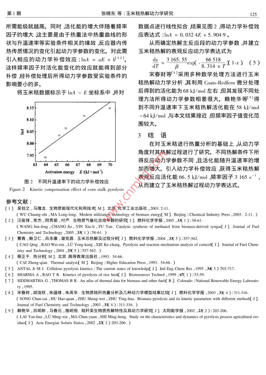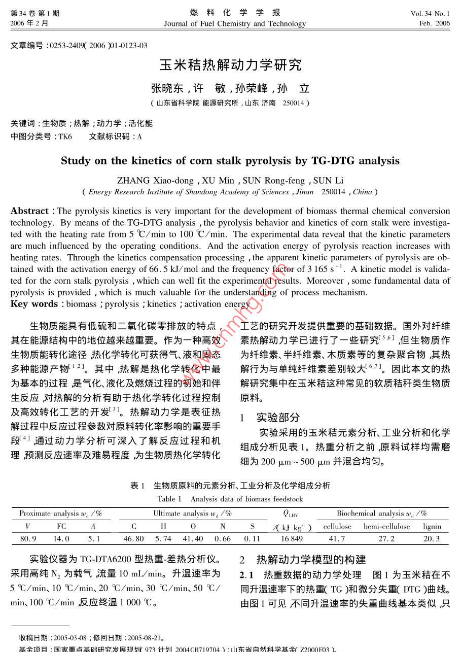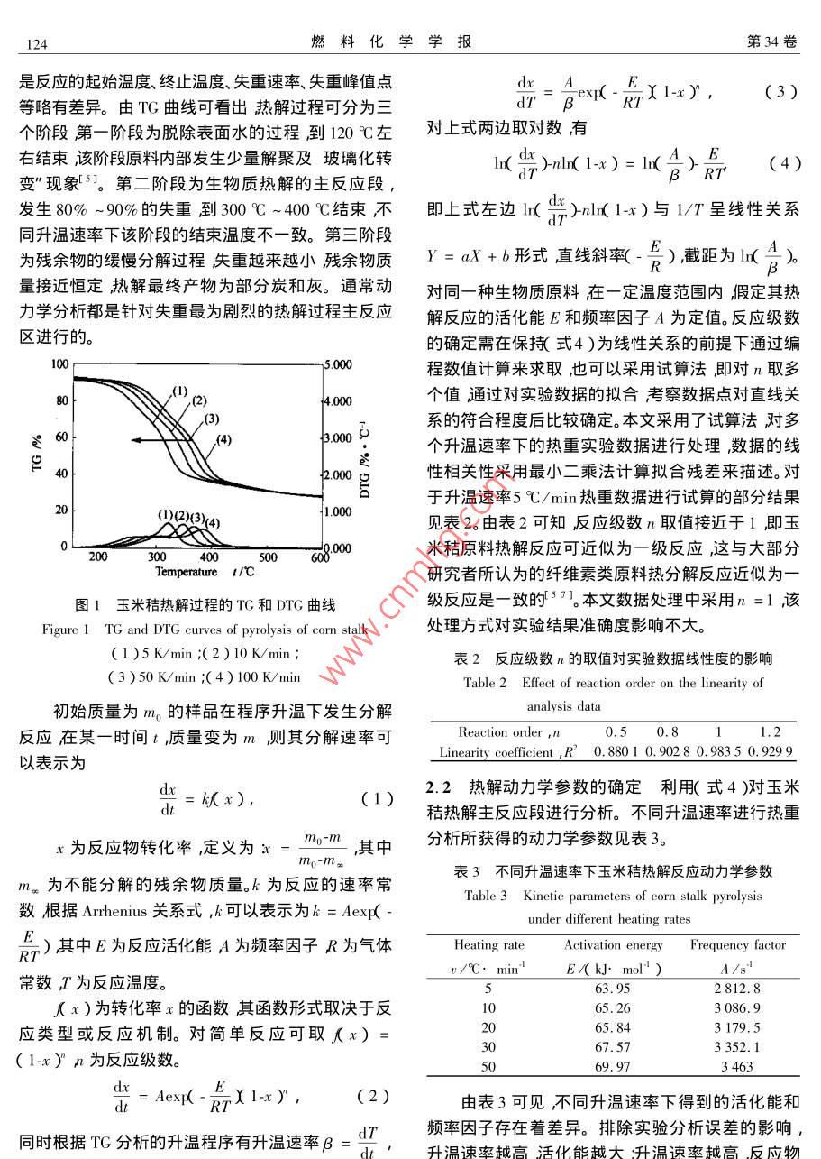 第34卷第1期燃料化學(xué)學(xué)報(bào)Vol 34 No. I2006年2月Journal of Fuel Chemistry and TechnolFeb.2006文章編號(hào):0253-24092006)01-0123403玉米秸熱解動(dòng)力學(xué)研究張曉東,許敏,孫榮峰,孫立山東省科學(xué)院能源研究所,山東濟(jì)南250014)關(guān)鍵詞:生物質(zhì);熱解;動(dòng)力學(xué);活化能中圖分類(lèi)號(hào):TK6文獻(xiàn)標(biāo)識(shí)碼:AStudy on the kinetics of corn stalk pyrolysis by TG-DTG analysisZHANG Xiao-dong, XUSUn Rong-feng sun liEnergy Research Institute of Shandong Academy of Sciences Jinan 250014, ChinaAbstract: The pyrolysis kinetics is very important for the development of biomass thermal chemical conversiontechnology, By means of the TG-DTG analysis the pyrolysis behavior and kinetics of corn stalk were investigated with the heating rate from 5 C/min to 100 C/min. The experimental data reveal that the kinetic parametersare much influenced by the operating conditions. And the activation energy of pyrolysis reaction increases withheating rates. Through the kinetics compensation processing the apparent kinetic parameters of pyrolysis are ob-tained with the activation energy of 66. 5 kJ/ mol and the frequency factor of 3 165s. A kinetic model is validated for the corn stalk pyrolysis, which can well fit the experimental results. Moreover, some fundamental data ofpyrolysis is provided which is much valuable for the understanding of process mechanismKey words: biomass pyrolysis i kinetics activation energy生物質(zhì)能具有低硫和二氧化碳零排放的特點(diǎn),工藝的研究開(kāi)發(fā)提供重要的基礎(chǔ)數(shù)據(jù)。國(guó)外對(duì)纖維其在能源結(jié)構(gòu)中的地位越來(lái)越重要。作為一種高效素?zé)峤鈩?dòng)力學(xué)已進(jìn)行了一些研究56但生物質(zhì)作生物質(zhì)能轉(zhuǎn)化途徑熱化學(xué)轉(zhuǎn)化可獲得氣、液和固態(tài)為纖維素、半纖維素、木質(zhì)素等的復(fù)雜聚合物其熱多種能源產(chǎn)物2。其中熱解是熱化學(xué)轉(zhuǎn)化中最解行為與單純纖維素差別較大67。因此本文的熱為基本的過(guò)程是氣化、液化及燃燒過(guò)程的初始和伴解研究集中在玉米秸這種常見(jiàn)的軟質(zhì)秸稈類(lèi)生物質(zhì)生反應(yīng)對(duì)熱解的分析有助于熱化學(xué)轉(zhuǎn)化過(guò)程控制原料。及高效轉(zhuǎn)化工藝的開(kāi)發(fā)3熱解動(dòng)力學(xué)是表征熱1實(shí)驗(yàn)部分解過(guò)程中反應(yīng)過(guò)程參數(shù)對(duì)原料轉(zhuǎn)化率影響的重要手段41通過(guò)動(dòng)力學(xué)分析可深入了解反應(yīng)過(guò)程和機(jī)實(shí)驗(yàn)采用的玉米秸元素分析、工業(yè)分析和化學(xué)理預(yù)測(cè)反應(yīng)速率及難易程度為生物質(zhì)熱化學(xué)轉(zhuǎn)化學(xué)轉(zhuǎn)化組成分析見(jiàn)表1。熱重分析之前原料試樣均需磨細(xì)為200μm并混合均勻表1生物質(zhì)原料的元素分析、工業(yè)分析及化學(xué)組成分析Table 1 Analysis data of biomass feedstockProximate analysis 1 /%Ultimate analysis w, /Biochemical analysis we, /As/kf kg) cellulose hemi-cellulose lignin80.946.805.7441,400.660.1116849實(shí)驗(yàn)儀器為T(mén)GυTA6200型熱重差熱分析儀。2熱解動(dòng)力學(xué)模型的構(gòu)建采用高純N2為載氣流量10m/min。升溫速率為2.1熱重?cái)?shù)據(jù)的動(dòng)力學(xué)處理圖1為玉米秸在不5℃/min、10℃/min、20℃/min、30℃/min、50℃/同升溫速率下的熱重(TG)和微分失重DrG)曲線(xiàn)。min、100℃/min反應(yīng)終溫1000℃。由圖1可見(jiàn)不同升溫速率的失重曲線(xiàn)基本類(lèi)似只收稿日期:2005403408;修回日期:200508-21。燃料化學(xué)學(xué)報(bào)第34卷是反應(yīng)的起始溫度、終止溫度、失重速率、失重峰值點(diǎn)E等略有差異。由TG曲線(xiàn)可看出熱解過(guò)程可分為三dns AexdRtxi-xy(3)個(gè)階段第一階段為脫除表面水的過(guò)程到120℃左對(duì)上式兩邊取對(duì)數(shù)有右結(jié)束該階段原料內(nèi)部發(fā)生少量解聚及玻璃化轉(zhuǎn)E變”現(xiàn)象3。第二階段為生物質(zhì)熱解的主反應(yīng)段,aT)h(1x)=1(B)Rr(4)發(fā)生80%-90%的失重到300℃400℃結(jié)束不即上式左邊ln()nl(1-x)與1/7呈線(xiàn)性關(guān)系同升溫速率下該階段的結(jié)束溫度不一致。第三階段為殘余物的緩慢分解過(guò)程失重越來(lái)越小殘余物質(zhì)Y=aX+b形式直線(xiàn)斜率(-B),截距為H()量接近恒定熱解最終產(chǎn)物為部分炭和灰。通常動(dòng)對(duì)同一種生物質(zhì)原料在一定溫度范圍內(nèi)假定其熱力學(xué)分析都是針對(duì)失重最為劇烈的熱解過(guò)程主反應(yīng)解反應(yīng)的活化能E和頻率因子A為定值。反應(yīng)級(jí)數(shù)區(qū)進(jìn)行的。的確定需在保持(式4)為線(xiàn)性關(guān)系的前提下通過(guò)編程數(shù)值計(jì)算來(lái)求取也可以采用試算法即對(duì)n取多4.000個(gè)值通過(guò)對(duì)實(shí)驗(yàn)數(shù)據(jù)的擬合考察數(shù)據(jù)點(diǎn)對(duì)直線(xiàn)關(guān)系的符合程度后比較確定。本文采用了試算法對(duì)多3000個(gè)升溫速率下的熱重實(shí)驗(yàn)數(shù)據(jù)進(jìn)行處理數(shù)據(jù)的線(xiàn)性相關(guān)性采用最小二乘法計(jì)算擬合殘差來(lái)描述。對(duì)于升溫速率5℃/min熱重?cái)?shù)據(jù)進(jìn)行試算的部分結(jié)果見(jiàn)表2。由表2可知反應(yīng)級(jí)數(shù)n取值接近于1即玉米秸原料熱解反應(yīng)可近似為一級(jí)反應(yīng)這與大部分emperature I/c研究