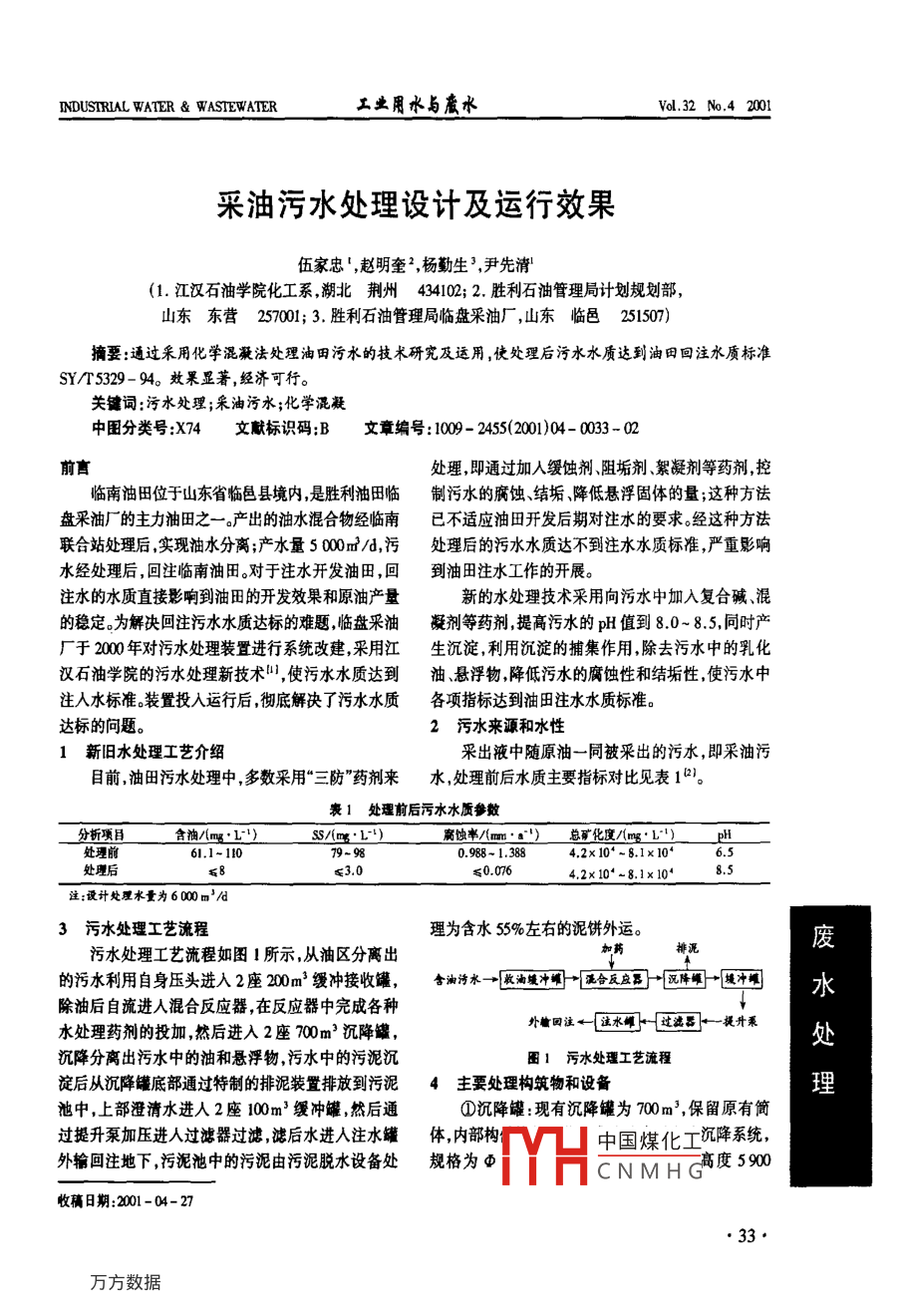 INDUSTRIAL WATER & WASTEWATER工業(yè)用水與底水_Vol.32 No.4 2001采油污水處理設計及運行效果伍家忠' ,趙明奎',楊勤生',尹先清(1.江漢石油學院化工系,湖北荊州434102; 2.勝利石油管理局計劃規(guī)劃部,山東東營257001; 3.勝利石油管理局臨盤采油廠,山東臨邑251507)摘要:通過采用化學混凝法處理油田污水的技術研究及運用,使處理后污水水質(zhì)達到油田回注水質(zhì)標準SY/T5329- 94。效果顯著,經(jīng)濟可行。關鍵詞:污水處理;采油污水;化學混凝中圍分類號:X74文獻標識碼:B文章編號: 1009- 24552001)04- 0033 - 02前言處理,即通過加入緩蝕劑、阻垢劑、絮凝劑等藥劑,控臨南油田位于山東省臨邑縣境內(nèi),是勝利油田臨制污水的腐蝕、結(jié)垢降低懸浮固體的量;這種方法盤采油廠的主力油田之-。產(chǎn)出的油水混合物經(jīng)臨南已不適應油田開發(fā)后期對注水的要求。經(jīng)這種方法聯(lián)合站處理后,實現(xiàn)油水分離;產(chǎn)水量5 000m2/d,污處理后的污水水質(zhì)達不到注水水質(zhì)標準,嚴重影響水經(jīng)處理后,回注臨南油田。對于注水開發(fā)油田,回到油田注水工作的開展。注水的水質(zhì)直接影響到油田的開發(fā)效果和原油產(chǎn)量新的水處理技術采用向污水中加入復合堿、混的穩(wěn)定。為解決回注污水水質(zhì)達標的難題,臨盤采油凝劑等藥劑 ,提高污水的pH值到8.0~ 8.5,同時產(chǎn)廠于2000年對污水處理裝置進行系統(tǒng)改建,采用江生沉淀,利用沉淀的捕集作用,除去污水中的乳化漢石油學院的污水處理新技術叫,使污水水質(zhì)達到油、懸浮物,降低污水的腐蝕性和結(jié)垢性使污水中注人水標準。裝置投人運行后,徹底解決了污水水質(zhì)各項指標達到油田注水水質(zhì)標準。達標的問題。2污水來源和水性1新舊水處理工藝介紹采出液中隨原油一同被采出的污水,即采油污目前,油田污水處理中,多數(shù)采用“三防”藥劑來水,處理前后水質(zhì)主要指標對比見表1以。表1處理前后污水水質(zhì)參數(shù)分析項目含油/(mg+L)SS/imgL)腐蝕率/m.總礦化度/(mg.心1)pH處理前61.1- 11079-980.988- 1.3884.2x 10 -8.1x 10*.5處理后58≤0.0764.2x 10'-8.1x 10*注:設計處理水量為6000 m'/d3污水處理工藝流程理為含水55%左右的泥餅外運。廢污水處理工藝流程如圖1所示,從油區(qū)分離出.加藥的污水利用自身壓頭進入2座200m3縵沖接收罐,含油污水- +收油城沖領一→混合反應司→沉降明→城沖明水除油后自流進人混合反應器,在反應器中完成各種外植因誰←[注水間-[過濾昌←提升萊水處理藥劑的投加,然后進入2座700m'沉降罐,處沉降分離出污水中的油和懸浮物,污水中的污泥沉團1污水處理工藝流程淀后從沉降甸底部通過特制的排泥裝置排放到污泥4主要處理構(gòu)筑物和設備理池中,上部澄清水進人2座100m3緩沖罐,然后通①沉降罐:現(xiàn)有沉降罐為700m3,保留原有筒過提升泵加壓進入過濾器過濾,濾后水進人注水罐體,內(nèi)部構(gòu)中國煤化工沉降系統(tǒng),外輸回注地下,污泥池中的污泥由污泥脫水設備處規(guī)格為 φ高度5900MYHCNMHG'收稿日期:2001-04-27●33.INDUSTRIAL WATER & WASIEWATER工業(yè)用水與蠻水.Vol.32 No.4 2001mm,有效容積為540m' ,沉降時間為4.3h,上部設有6運行效果收油槽,下部有排泥管和沖泥管。該改造工程于2001年元月底投人運行,水質(zhì)- -②混合反應器:混合反應器為鋼制容器,02000次達到要求,各項指標均達到技術要求 ,監(jiān)測數(shù)據(jù)見mmx 7100mm,各種水處理藥劑加入其中,利用水力表2,改造前污水處理藥劑成本1.05 元/m' ,但水質(zhì)作用的原理完成混合攪拌,使反應進行完全,有效容不能達到標準,改造后藥劑成本降到0.71~ 0.79積15m',反應時間3.6min。元/m3 ,水質(zhì)全面達到標準,降低了生產(chǎn)成本,為油③加藥裝置:根據(jù)工藝要求加人4種化學藥劑,田的穩(wěn)油控水起到積極作用。加藥系統(tǒng)按照加藥量進行配套,選擇耐磨加藥泵進喪2水質(zhì)監(jiān)測數(shù)撮(2001.2.19)行加藥便于準確控制加藥量。,分析項目來水沉降健出口過濾罐出口④過濾器:為保證污水水質(zhì),在沉降罐后采用雙含袖/(ng'L")108.12濾料全自動過濾器。規(guī)格為CLWA100/0.6(φ 3000xSS/(ng'L")1254.24250) ,處理水量為270m'/h,濾料為無煙煤、石英pH6.58.3平均膺蝕率/(mm,■") 0.8750.054砂,按不同粒徑和級配比從下到上依次填裝,濾料反沖洗高度為0.80m,反沖洗時間為8h一次。7結(jié)論⑤污泥池:污泥濃縮池1座,鋼混結(jié)構(gòu),有效容采用化學混凝、過濾的方法處理采油污水,不僅積420m2 ,設置PNT- 5000型刮泥機2臺,污水回收能達到油田注水標準,而且能較經(jīng)濟地穩(wěn)定運行,是泵1臺,Q = 50m'/h。目前采油污水處理方法中,水質(zhì)全部達到標準且藥⑥污泥脫水機:選用自動廂式壓濾機XAZ劑費用最低的一-種,通過運行,重點抓好加藥、排泥100/1080 - U- 0.8型2臺,配套耐莫污泥泵2臺,兩大運行操作管理,在保證污水水質(zhì)的同時,通過不Q = 25m'/h,P = 0.8MPao .斷完善摸索,進-步降低藥劑加量,使污水處理成本⑦自動加藥控制系統(tǒng)進一步得到降低。為保證加藥連續(xù)準確進行,防止水量波動起伏時加藥量不準而引起水質(zhì)的變化,對4種藥劑加參考文獻:量,通過測定來水的總流量,輸人計算機,由專用.[1]劉中云,陳永紅,等.臨南工業(yè)污水處理技術研究[J].武漢控制軟件對加藥泵進行控制,保證加藥的準確性。工業(yè)