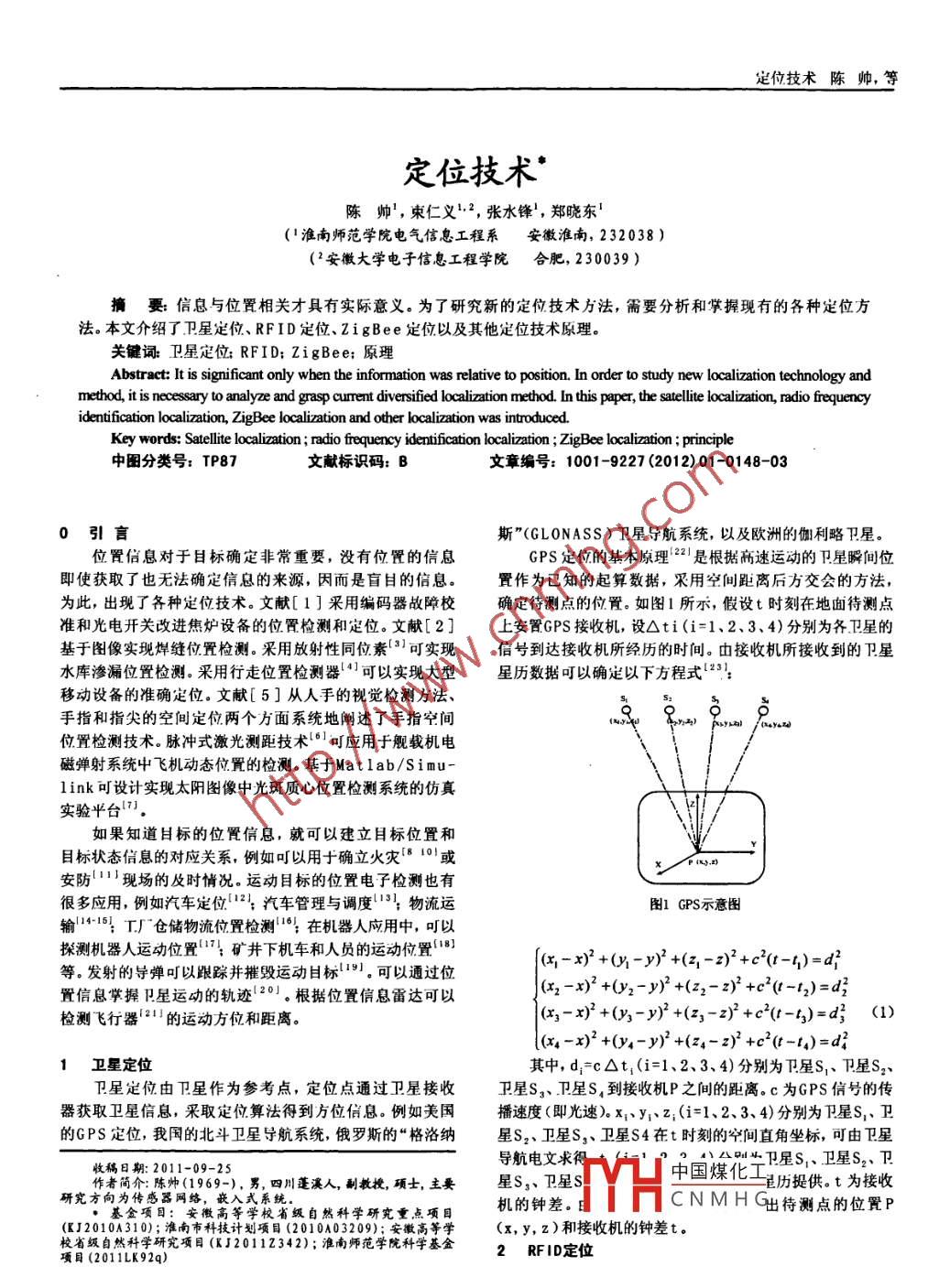 定位技術(shù)陳帥,等定位技術(shù)*陳帥',束仁義2,張水鋒' ,鄭曉東'(1淮南師范學(xué)院電氣信息工程系安徽淮南, 232038 )(2安徽大學(xué)電子信息工程學(xué)院合肥, 230039)擠要:信息與位置相關(guān)才具有實(shí)際意義。為了研究新的定位技術(shù)方法,需要分析和掌握現(xiàn)有的各種定位方法。本文介紹了衛(wèi)星定位、RFID定位、ZigBee定位以及其他定位技術(shù)原理。關(guān)鍵詞:衛(wèi)星定位; RFID; ZigBee;原理Abstract: It is significant only wben the information was relative to position. In order to study new localization technology andmethod, it is necessary to analyze and grasp cunent diversified localization method. In this paper, the satlite localization, radio frequencyidentification localization, ZigBee localization and other localization was introduced.Key words: Satllite localization ; radio frequency identifcation localization ; ZigBee localization ; principle中圖分類號: TP87文獻(xiàn)標(biāo)識碼: B文章編號: 1001-9227 (2012) 01-0148-030引言斯"(GLONASS)衛(wèi)星導(dǎo)航系統(tǒng),以及歐洲的伽利略衛(wèi)星。位置信息對于目標(biāo)確定非常重要,沒有位置的信息GPS定位的基本原理221是根據(jù)高速運(yùn)動的衛(wèi)星瞬間位即使獲取了也無法確定信息的來源,因而是盲目的信息。置作為已知的起算數(shù)據(jù),采用空間距離后方交會的方法,為此,出現(xiàn)了各種定位技術(shù)。文獻(xiàn)[ 1 ]采用編碼器故障校確定待測點(diǎn)的位置。如圖1所示,假設(shè)t時(shí)刻在地面待測點(diǎn)準(zhǔn)和光電開關(guān)改進(jìn)焦?fàn)t設(shè)備的位置檢測和定位。文獻(xiàn)[2]上安置GPS接收機(jī),設(shè)Oti(i=1、2、3、4)分別為各衛(wèi)星的基于圖像實(shí)現(xiàn)焊縫位置檢測。采用放射性同位素‘3]可實(shí)現(xiàn)信號到達(dá)接收機(jī)所經(jīng)歷的時(shí)間。由接收機(jī)所接收到的P.星水庫滲漏位置檢測。采用行走位置檢測器‘4]可以實(shí)現(xiàn)大型星歷數(shù)據(jù)叮以確定以下方程式28!移動設(shè)備的準(zhǔn)確定位。文獻(xiàn)[ 5]從人手的視覺檢測方法、手指和指尖的空間定位兩個(gè)方面系統(tǒng)地闡述了手指空間位置檢測技術(shù)。脈沖式激光測距技術(shù)(6]叮應(yīng)用于艦載機(jī)電磁彈射系統(tǒng)中飛機(jī)動態(tài)位置的檢測?;贛at1ab/Si mu-link可設(shè)計(jì)實(shí)現(xiàn)太陽圖像中光斑質(zhì)心位置檢測系統(tǒng)的仿真實(shí)驗(yàn)平臺'”.如果知道目標(biāo)的位置信息,就可以建立目標(biāo)位置和目標(biāo)狀態(tài)信息的對應(yīng)關(guān)系,例如叮以用于確立火災(zāi)「810'或x/下0.安防現(xiàn)場的及時(shí)情況。運(yùn)動目標(biāo)的位置電子檢測也有很多應(yīng)用,例如汽車定位"21:汽車管理與調(diào)度3};物流運(yùn)圖1 GPS示意圖輸114-15! T廠倉儲物流位置檢測:在機(jī)器人應(yīng)用中,以探測機(jī)器人運(yùn)動位置"礦井下機(jī)車和人員的運(yùn)動位置8]{(x-x)2 +(y-y) +(z,-z)2 +c<(t-t)=d}等。發(fā)射的導(dǎo)彈叮以跟蹤并摧毀運(yùn)動目標(biāo)"91??梢酝ㄟ^位(xz-x)2 +(Yz-) +(z2-z)* +c2(t-l)=d3置信息掌握P星運(yùn)功的軌跡[201。根據(jù)位置信息雷達(dá)可以檢測飛行器‘211的運(yùn)動方位和距離。(xs-x)2 +(xs-)2 +(z3-z)* +c*(t-$)=d} (1)(x4-x)2 +(y4-y)' +(Z4-z) +c2(t-t4)=d21衛(wèi)星定位其中,d;=cOt,(i=1、2、3、4)分別為下.星S小P.星S2、.衛(wèi)星定位由衛(wèi)星作為參考點(diǎn),定位點(diǎn)通過衛(wèi)星接收衛(wèi)星Sy、衛(wèi).星S s到接收機(jī)P之間的距離。c為GPS信號的傳器獲取衛(wèi)星信息,采取定位算法得到方位信息。例如美國播速度(即光速)。x;、y;z;(i=1、2、3、4)分別為星S,衛(wèi)的GPS定位,我國的北斗衛(wèi)星導(dǎo)航系統(tǒng),俄羅斯的“格洛納星S2、衛(wèi)星Ss、衛(wèi)星S4在t時(shí)刻的空間直角坐標(biāo),可由衛(wèi)星導(dǎo)航電文求得剛牛衛(wèi)星S、衛(wèi)星S2、衛(wèi)收稿日期: 2011-09-25中國煤化工作者簡介:陳帥(1969-),男,四川蓬溪人,副赦授,碩士,主要.星S,、衛(wèi)星S港歷提供。t為接收研究方向?yàn)閭鞲衅骶W(wǎng)絡(luò),嵌機(jī)的鐘差。TYHCNMHG出待測點(diǎn)的位置P基金項(xiàng)目:安徽高等學(xué)校省級自然科學(xué)研究重點(diǎn)項(xiàng)目(KJ2010A310);淮南市科技計(jì)劃項(xiàng)目(2010A03209);安徽高等學(xué)(x, y, z)和接收機(jī)的鐘差t。校省級自然科學(xué)研究項(xiàng)目(KJ20112342);淮南師范學(xué)院科學(xué)基金RF ID定位項(xiàng)目(2011LK92q)萬巍數(shù)據(jù)定位技術(shù)陳帥,等米以內(nèi)。[16]吳曉釗,王繼樣.物聯(lián)剛技術(shù)在物流業(yè)的應(yīng)用現(xiàn)狀與發(fā)展前景UWB (ul trawi deband,超寬帶)三角定位技術(shù)[80。使用[J]. 物流技術(shù)與應(yīng)用, 2011, (02).三角測量法精確算出使用者的位置使用UWB 技術(shù)叮使定[17]彭力彬,趙國豪,韓洪廣.光電傳感芯片在機(jī)器入運(yùn)動檢測中位誤差在2厘米之內(nèi),優(yōu)于全球衛(wèi)星定位技術(shù)。的應(yīng)用[J].電子技術(shù), 2005, (02) :15-17.3G/GSM/WCDMA網(wǎng)絡(luò)三角測量定位技術(shù)71。電信的增值[18]陳君蘭,周盂然,趙蒼榮等.基于ZigBee無線傳感網(wǎng)絡(luò)的礦井服務(wù):位置服務(wù)即LCS (Location Services) 又稱定位服機(jī)車定位系統(tǒng)的研究[J].煤炭技術(shù), 2010, 3(03):176-179.務(wù),是通過移動通信網(wǎng),獲取移動用戶的位置信