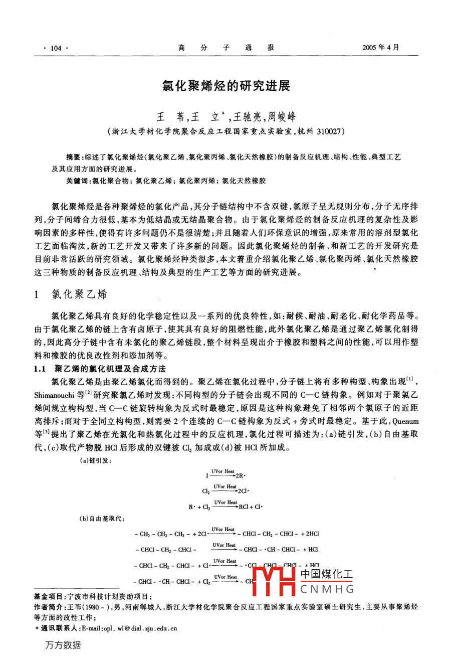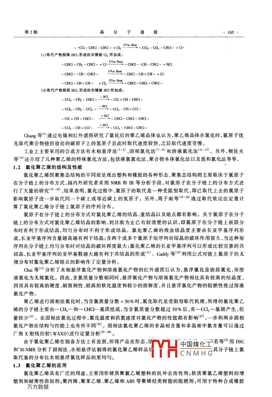 104高分子通報(bào)2005年4月氯化聚烯烴的研究進(jìn)展王葦,王立,王馳亮,周峻峰(浙江大學(xué)材化學(xué)院聚合反應(yīng)工程國(guó)家重點(diǎn)實(shí)驗(yàn)室,杭州310027)擴(kuò)要:綜述了氯化聚烯烴(氯化聚乙烯、氯化聚丙烯、氯化天然橡膠)的制備反應(yīng)機(jī)理、結(jié)構(gòu)、性能、典型工藝及其應(yīng)用方面的研究進(jìn)展。關(guān)鍵詞:氯化聚合物;氯化聚乙烯;氯化聚丙烯;氯化天然橡膠氯化聚烯烴是各種聚烯烴的氯化產(chǎn)品,其分子鏈結(jié)構(gòu)中不含雙鍵,氯原子呈無(wú)規(guī)則分布,分子無(wú)序排列,分子間締合力很低,基本為低結(jié)晶或無(wú)結(jié)晶聚合物。由于氯化聚烯烴的制備反應(yīng)機(jī)理的復(fù)雜性及影響因素的多樣性,使得有許多問(wèn)題仍不是很清楚;并且隨著人們環(huán)保意識(shí)的增強(qiáng),原來(lái)常用的溶劑型氯化工藝面臨淘汰,新的工藝開(kāi)發(fā)又帶來(lái)了許多新的問(wèn)題。因此氯化聚烯烴的制備、和新工藝的開(kāi)發(fā)研究是目前非?;钴S的研究領(lǐng)域。氯化聚烯烴種類(lèi)很多,本文著重介紹氯化聚乙烯、氯化聚丙烯、氯化天然橡膠這三種物質(zhì)的制備反應(yīng)機(jī)理、結(jié)構(gòu)及典型的生產(chǎn)工藝等方面的研究進(jìn)展。1氯化聚乙烯氯化聚乙烯具有良好的化學(xué)穩(wěn)定性以及一系列的優(yōu)良特性,如:耐候、耐油、耐老化、耐化學(xué)藥品等。由于氯化聚乙烯的鏈上含有鹵原子,使其具有良好的阻燃性能,此外氯化聚乙烯是通過(guò)聚乙烯氯化制得的,因此高分子鏈中含有未氯化的聚乙烯鏈段,整個(gè)材料呈現(xiàn)出介于橡膠和塑料之間的性能,可以用作塑料和橡膠的優(yōu)良改性劑和添加劑等。11聚乙烯的氯化機(jī)理及合成方法氯化聚乙烯是由聚乙烯氯化而得到的。聚乙烯在氯化過(guò)程中,分子鏈上將有多種構(gòu)型構(gòu)象出現(xiàn)Shimanouchi等2研究聚氯乙烯時(shí)發(fā)現(xiàn):不同構(gòu)型的分子鏈會(huì)出現(xiàn)不同的C—C鏈構(gòu)象。例如對(duì)于聚氯乙烯間規(guī)立構(gòu)構(gòu)型,當(dāng)C—C鏈旋轉(zhuǎn)構(gòu)象為反式時(shí)最穩(wěn)定,原因是這種構(gòu)象避免了相鄰兩個(gè)氯原子的近距離排斥;而對(duì)于全同立構(gòu)構(gòu)型,則需要2個(gè)連續(xù)的C—C鏈構(gòu)象為反式+旁式時(shí)最穩(wěn)定?;诖? Quenum等提出了聚乙烯在光氯化和熱氯化過(guò)程中的反應(yīng)機(jī)理,氯化過(guò)程可描述為:(a)鏈引發(fā),(b)自由基取代,(c)取代產(chǎn)物脫HC后形成的雙鍵被C2加成或(d)被HCL所加成。(a)鏈引發(fā)(b)自由基取代CH2-CH2-CH2-+2·—-CHCl-CH2-CHCl-+2HClCHCI-]-CHCICHC-·CH-cHC1-+HClUVor-CHCI- CH2+ HClUVor heat中國(guó)煤化工CHCl-·CHCNMHG基金項(xiàng)目:寧波市科技計(jì)劃資助項(xiàng)目作者簡(jiǎn)介:王葦(1980-),男,河南鄲城人,浙江大學(xué)材化學(xué)院聚合反應(yīng)工程國(guó)家重點(diǎn)實(shí)驗(yàn)室碩土研究生,主要從事聚烯烴等方面的改性工作;通訊聯(lián)系人Eml:pl.wl@dlju,edu,cn第2期高分子通報(bào)105UVor HeatCCl-CHCl-CHCl-+Cl-CCI,-CH-CHCI-+CI(c)取代產(chǎn)物脫除HC,形成的雙鍵被Cl2所加成CHCI-CH,-CHCI- +ClCHCI-CH-CHCI-+HClVor heatCHCl-·CH-CHClCHCI-CH= CH- +Cl(d)取代產(chǎn)物脫除HCl,形成的雙鍵被HCl所加成:-CCh -CH,-CHCI-CIC= CH-CHCI-CCI,-CH= CCI-Chang等通過(guò)電鏡和紅外譜圖研究了氯化后的聚乙烯晶體也認(rèn)為聚乙烯晶體在氯化時(shí),氯原子優(yōu)先取代聚合物鏈折痕處的碳原子上的氫原子且此時(shí)取代速度較快,之后取代速度變慢工業(yè)上主要采用的合成方法有水相懸浮法-6、固相氯化法7-0和溶液氯化法。另外,頓佐夫等叫還介紹了幾種聚乙烯的特殊氯化方法,包括液氯氯化法,聚合物本體氯化法以及混和氯化法等等。1.2氯化聚乙烯的結(jié)構(gòu)及性能氯化聚乙烯因聚集態(tài)結(jié)構(gòu)的不同而呈現(xiàn)出塑料和橡膠的各種形態(tài),聚集態(tài)結(jié)構(gòu)則主要取決于氯原子在分子鏈上的分布方式,國(guó)內(nèi)外研究者采用NMR和IR等分析手段,對(duì)氯原子在分子鏈上的分布方式進(jìn)行了大量的研究-1),結(jié)果表明,氯化過(guò)程中,氯原子的取代是一種受阻型取代,即已取代上去的氯原子影響氯原子進(jìn)一步取代同一個(gè)碳上或鄰近碳上的氫原子。另外,周子南等9通過(guò)取代效應(yīng)法定量計(jì)算了氯化聚乙烯分子鏈上氯原子的序列分布。氯原子在分子鏈上的分布方式對(duì)氯化聚乙烯的結(jié)晶,重結(jié)晶以及熔點(diǎn)都有影響。關(guān)于氯原子在分子鏈上的分布方式對(duì)氯化聚乙烯結(jié)晶的影響,到目前為止已有較清楚的認(rèn)識(shí),即氯原子在分子鏈上嵌段分布時(shí)有利于形成結(jié)晶,均勻分布時(shí)不利于形成結(jié)晶。氯化聚乙烯的殘余結(jié)晶度主要由長(zhǎng)亞甲基序列形成,長(zhǎng)亞甲基序列含量越高越有利于結(jié)晶;含兩個(gè)或多個(gè)氯原子短序列對(duì)結(jié)晶的破壞作用很大,當(dāng)這種短序列在分子鏈上均勻分布時(shí)對(duì)結(jié)晶的破壞程度最大;氯化聚乙烯的長(zhǎng)亞甲基序列可以形成比較完善的共結(jié)晶,長(zhǎng)亞甲基序列的亞甲基數(shù)越大越有利于共結(jié)晶的形成2)。 Gaddy等2利用公式對(duì)鏈上氯原子的無(wú)規(guī)分布對(duì)氯化聚乙烯熔點(d