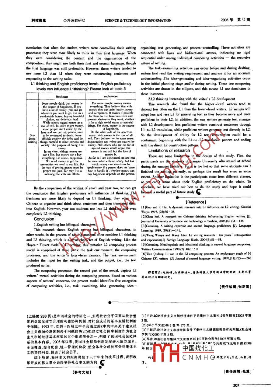 科技侑息O外語教研0SCTENCE & TECHNOLOGY INFORMATION2008年第32期A Research on Chinese Thinking Infuencing English Writing ProcessZhao Hongjuan(Qingdao University of Science & Technology, Shandong Qingdao 266061)[Abstract]12 writing proces is a bilingual event. 12 wriers have both LI and 12 at their dispoeal when they composing in L2. The tendency ofLI ocurence varies with individuals compoeing activities.12 Wrters are more likely to depend on LI, when they were managing their witingprocess, generaing and oganizing ides; but more likely to depend on 12 when undertaking task--examining and text- -generating acivties. Thispaper focuses on the influence of LI on L2, and the purpose is to demonstrate that Chinese thinkingdecreases with the improvement of Englishproficiency, but the amount of Chinese thinking decreases by a different margin.(Key words ]Chinese thinking; inluence; English witingPrevious studiesless than 150 words within 50 min.L1 thinking is an etremely nomnal phenomenon in L2 composing. IhData ollectionis a hot question about how to deal with the relationship betweenData collection was divided into three stages: at first, the studentsLlthinking and L2 witing in reent twenty yer. The fous of atenion were inquired how they deign the conet and structure of thehas mainly on the sianities of LI and 12 writing proces, however, lee compsition,n 10 min was used; and then the students were asked to draftattention has been paid to the unique features of L2 writing.out the writing within 10min. At this slage, topic sentence and keywordsKKohayashi and Rinnert (1992) aked 48 Jepanese university -levelshould be written out, and Chinese could be used if there was somestudents to report on how much Japanese was used in their mind whendifculty to use English. At he last slage, students were ordered to writethey witing an English compostion drely. The resulh showed that 17% and revise their writing wihin 30 min. Pricipants should hand in theirstudents rported using more than 75% Japanese; 48% of the students witing in the sated timne. Afier the wing the deta of three slagesreported using s0 - 75% Japanese, 27% of the students felt they used 25 would be analyed." 50% Japanese, and only 8% reported using less than 25% Japanese.Data analysisThis is the stemp to be made to measure the amountofLl uBe in theL1 thinking and 12 writing process When will the students use12 composing process.LIthinking in the process of their writing? Please looko at table 1 andUzawa & Cumming (1989) made a studly about ten Anglo Canadian table 2.students taking an "intermediate Japane" coure and found that eightTable 1_ The coding tor the subjectleamers used English extensively to genernte ideas, Bearch for topics,freshmanophomoredevelop concepts, and organize information when composing an esay in錢是幸福之源。Hwe haveFor some peuple money meantJapanese.75% students said they wrote out rough dnafts or notes ineheycangpa名骨.權力和認可。 iEngish and then transposed them into Japanese text. 25% students said適的house實華麗的elothes,makrs Ponsihlefor thentolive節(jié)作的that they prepared their ideas mentally in English before writing them線是directly into Japanese.tent |On the other hand . mu is lhe rooWang Wenyu and Wen Qiufang (2002) made a study to invesigate| deign |甚至到死用Somr ftlere 受賄| o evil In som eprne響落and犯攀the writing process of sixten tertiary- -level English majors in China,mvoinion生活需要線,錢In曲word, no one can live withoutthrough a combination of research techniques such 8 thinking aloud,是萬能的h way or康錢安臺適,依靠自已努力才可以過的I beomes困擾in me dont know如何理observation, retrospection, and interviews. It reveals that the L2 writingprocess is bilinguadl event and the tendency of L 1 ocurene varies withWe will wrie three parypraphs, Inindividuals composing activities.the first pungraph, the finst sentenceGuo Chunjie and liu Fang (1997) made a study and atempted tolure|富路為好策二段寫m踩i the topic發(fā)nLenee, and the lftestimate the amount of L1 use in the L2 composing procese. They asked design 處,最后 -段tmyopinion the fimt sentence i the lopic one,10 high school and 2 university students to compose aloud a story basedon pictures provided幽the writing prompl. The results showed that 92%students use LI for cognitive operations;60% writing contents wereTable 2 The dratt of the wrting: topic sentence and keywordsconstrucled in LI.MethodsophomoreParticipantsFor some people money meansParticipants in this study were 20 non -English majors who areSome peple tinkpoo everything. Monry is the source offreshman and sophomore from Jiangsu University in China. They were tenmale and ten female, and their average age is 19.5 years old. At the timesentencethink money i the rot of all evile.ad mastered the knowledge ofmoney, but too much money cancan't buy eryhingEngish Band two; and year 2 students had finished the courses of Bandfour. Before they enteing the univernity all of them had lemt English foreight years.l Go wherever comfrtableWriting tasksThe wring task of this research is to write an English argument,keywordegeneration crimebleome handleand the topie i Can moneyhappinecsa? For someone think thatCNMH(happinFYHmoney is the source of happines, and othen think money isevil, what about your opinion? The partieipunts were required to write noAccording to analysis for table 1 and table 2, we can get the- 306科技信息0外語教研OSCIENCE & TECINOLOGY INFORMATION2008年第32期conclusion that when the student writers were controlling their writing organizing, text -generating. and proces - controlling These activities areprocesses; they were most likely to think in their first language. When connected with linee and bidirectional arrows. indicating no rigidthey were consideringthe content and the organization of thesequential order among individual composing activitiesthe recurnsivecomposition, t
