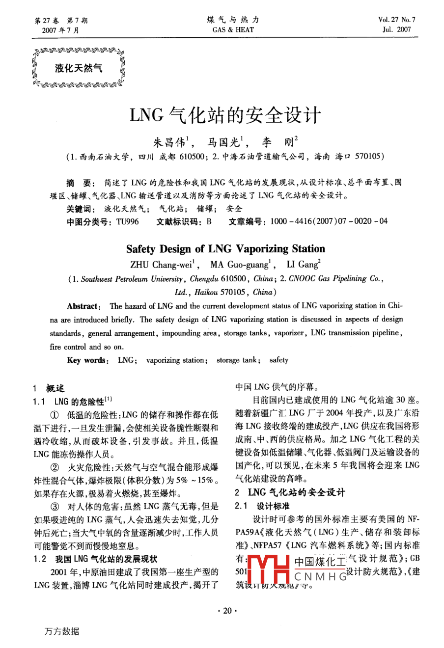 第27卷第7期煤氣與熱力Vol 27 No. 72007年7月GAS heatJul.2007液化天然氣LNG氣化站的安全設(shè)計朱昌偉,馬國光,李剛(1.西南石油大學(xué),四川成都610500;2.中海石油管道輸氣公司,海南???70105摘要:簡述了ING的危險性和我國ING氣化站的發(fā)展現(xiàn)狀,從設(shè)計標(biāo)準(zhǔn)、總平面布置、圍堰區(qū)、儲罐、氣化器、ING輸送管道以及消防等方面論述了ING氣化站的安全設(shè)計。關(guān)鍵詞:液化天然氣;氣化站;儲罐;安全中圖分類號:TU96文獻(xiàn)標(biāo)識碼:B文章編號:1000-4416(2007)07-0020-04Safety Design of LNG Vaporizing StationZHU Chang-wei, MA Guo-guang, LI Gang(1. Southwest Petroleum University, Chengdu 610500, China; 2. CNoOC Gas Pipelining CoLtd, Haikou 570105, China)Abstract: The hazard of LNG and the current development status of LNG vaporizing station in Chi-na are introduced briefly. The safety design of LNG vaporizing station is discussed in aspects of designstandards, general arrang area, storage tanks, vaporizer, LNG transmission pipeline,fire control and so onKey words: LNG; vaporizing station; storage tank; safety1概述中國LNG供氣的序幕1.1LNG的危險性1目前國內(nèi)已建成使用的LNG氣化站逾30座。①低溫的危險性:LNG的儲存和操作都在低隨著新疆廣匯LNG廠于2004年投產(chǎn),以及廣東沿溫下進(jìn)行,一旦發(fā)生泄漏,會使相關(guān)設(shè)備脆性斷裂和海LNG接收終端的建成投產(chǎn),LNG供應(yīng)在我國將形遇冷收縮,從而破壞設(shè)備,引發(fā)事故。并且,低溫成南、中、西的供應(yīng)格局。加之LNG氣化工程的關(guān)ING能凍傷操作人員。鍵設(shè)備如低溫儲罐、氣化器、低溫閥門及運輸設(shè)備的②火災(zāi)危險性:天然氣與空氣混合能形成爆國產(chǎn)化,可以預(yù)見,在未來5年我國將會迎來LNG炸性混合氣體,爆炸極限(體積分?jǐn)?shù))為5%~15%。氣化站建設(shè)的高峰如果存在火源,極易著火燃燒,甚至爆炸。2LNG氣化站的安全設(shè)計③對人體的危害:雖然LNG蒸氣無毒,但是2.1設(shè)計標(biāo)準(zhǔn)如果吸進(jìn)純的LNG蒸氣,人會迅速失去知覺,幾分設(shè)計時可參考的國外標(biāo)準(zhǔn)主要有美國的NF鐘后死亡;當(dāng)大氣中氧的含量逐漸減少時,工作人員PA59A《液化天然氣(LNG)生產(chǎn)、儲存和裝卸標(biāo)可能警覺不到而慢慢地窒息。準(zhǔn)》、NFPA57《ING汽車燃料系統(tǒng)》等;國內(nèi)標(biāo)準(zhǔn)2我國LNG氣化站的發(fā)展現(xiàn)狀有中國煤化工氣設(shè)計規(guī)范》;CB2001年中原油田建成了我國第一座生產(chǎn)型的501CNMHG設(shè)計防火規(guī)范》,(建LNG裝置,淄博LNG氣化站同時建成投產(chǎn),揭開了筑議計切火觀范守。www.watergasheat.com朱昌偉,等:LNG氣化站的安全設(shè)計笫27卷第7期22總平面布置2切斷裝置,它應(yīng)與全部的控制計量儀表分開設(shè)置。LNG氣化站總平面布置設(shè)計要合理地確定站e.為了避免儲罐內(nèi)形成空氣與天然氣的混合氣內(nèi)各作業(yè)區(qū)和設(shè)備的位置,以確保氣化站有一個安導(dǎo)致事故儲罐在首次使用或停止使用進(jìn)行內(nèi)部檢全的環(huán)境。對于LNG的溢出,總希望能夠預(yù)測LNG修時,要進(jìn)行惰化處理。蒸氣量與溢出距離和溢出時間的函數(shù)關(guān)系,這樣可f根據(jù)地質(zhì)、氣象等資料,分析發(fā)生地震、風(fēng)災(zāi)、以通過溢出的流量和時間來預(yù)測可能產(chǎn)生危險的區(qū)雪災(zāi)等自然災(zāi)害的可能性及其特征,考慮儲罐的抗域震和抵御風(fēng)雪載荷的能力NFPA59A已經(jīng)對氣化站邊界線以外的人身和②LNG渦旋現(xiàn)象的預(yù)防財產(chǎn)的影響做了明確的安全要求,這些要求限制了渦旋現(xiàn)象( rollover),也稱翻滾,通常出現(xiàn)在在邊界線的熱輻射量。現(xiàn)在各種計算機軟件能夠模多組分的液化天然氣中,是由于向已裝有LNG的低擬LNG儲存設(shè)施周圍的火災(zāi)輻射和氣體擴散濃度,溫儲罐中充注新的LNG,或由于LNG中的氮優(yōu)先蒸例如 LNGFIRE(ING燃燒的熱輻射模型)和DE-發(fā)而使儲罐內(nèi)的液體發(fā)生分層而引起。在已有的GAIS(氣體擴散濃度程序)。些研究中,對該問題的解釋是:密度較大的液體積聚2.3圍堰區(qū)在儲罐底部,而密度較小的液體處于儲罐頂部,底部圍堰區(qū)是指用混凝土、金屬等耐低溫材料在液體因受到上面液體重力的作用,壓力高于上部液LNG儲罐周圍建造的堤防、防護(hù)墻或排液系統(tǒng)所圍體,對應(yīng)的蒸發(fā)溫度相應(yīng)提高,且底部LNG具有成的區(qū)域。LNG儲罐周圍必須設(shè)置圍堰區(qū),以將儲定的過冷度,蒸發(fā)速度較上部液體慢。外界熱量總罐發(fā)生事故時對周圍設(shè)施造成的危險降低到最小程是不斷由外向內(nèi)傳遞,底部液體獲得熱量,其溫度升度高,密度減小,當(dāng)?shù)撞恳后w密度小于上部液體密度2.4LNG儲罐時,分層平衡將被破壞,形成渦旋現(xiàn)象,引起液體蒸LNG儲罐按結(jié)構(gòu)形式可分為地下儲罐、地上金發(fā)率劇增。屬儲罐和金屬-預(yù)應(yīng)力混凝土儲罐3類,地上LNG計算機模型已經(jīng)發(fā)展到能夠預(yù)測渦旋發(fā)生的時儲罐又分為金屬子母儲罐和金屬單罐2種。LNG間、分層和氣體釋放率,然而,渦旋發(fā)生時氣體釋放氣化站采用何種儲罐,主要取決于其儲存量。儲存率的峰值很難精確預(yù)測。因此,為避免渦旋的發(fā)生量為1200~5000m3時可采用金屬子母儲罐帶壓在設(shè)計時預(y