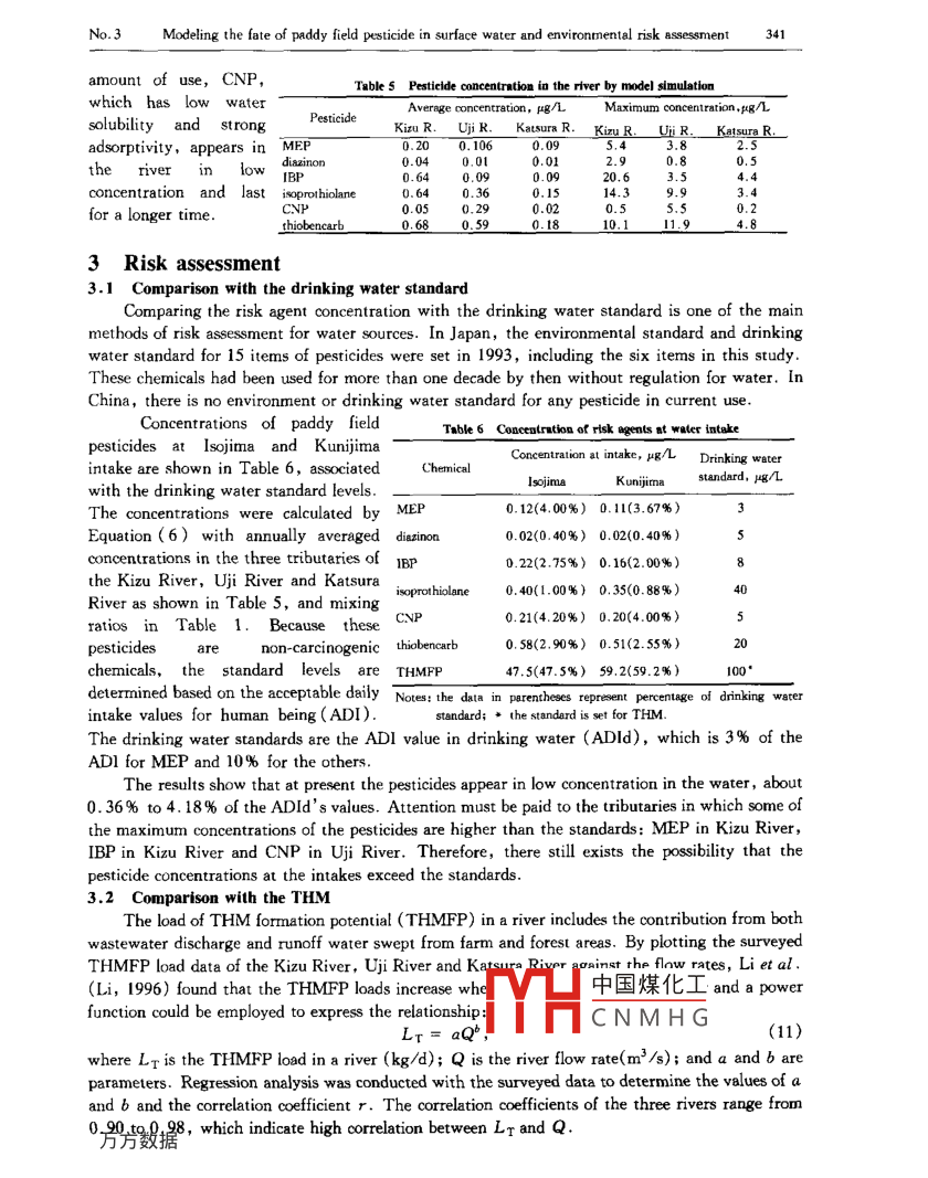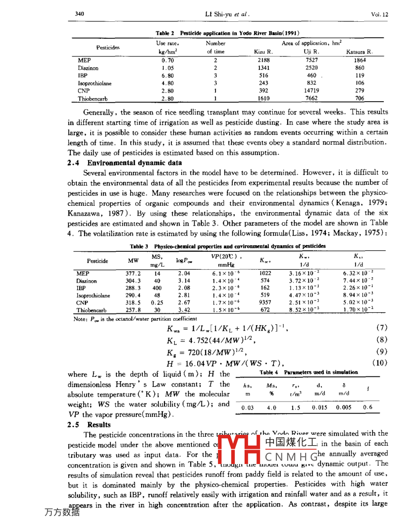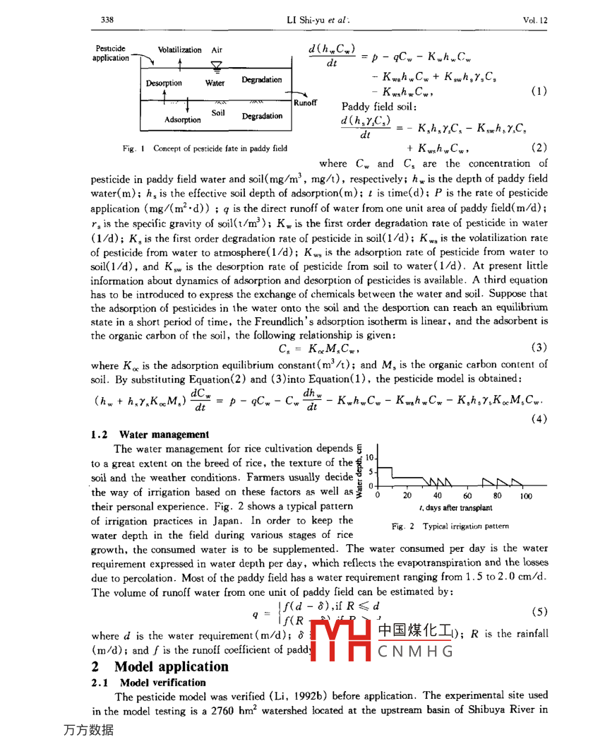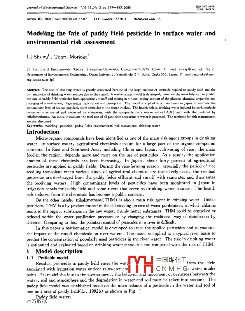 Journal of Environmental Sciences Vol. 12,No. 3.pp.337- -343 ,20001S581001070Articke ID: 100 0742000)03-0337.07 CLC number: X820.4Docement code: AModeling the fate of paddy field pesticide in surface water andenvironmental risk assessmentLI Shi-yu' , Tohru Morioka?(1. Institute of Environmental Science, Zhongshan Universty, Guagzhou 510275. China. E- mail: eslsy@ 2su. edu. cn; 2.Department of Environmental Engineering, Osaka University, Yamada-oka 2-1, Suita, Osaka 565, Japan. E - mail; morioka@ env.eng. osaka u. ac. ip)Abstract: The risk of drinking water is greatly concemed because of the large armount of pesticide applied to paddy field and thecontamination of drinking water sources due to the runoff. A mathermatical model is developed, based om the mass balance, to predictthe fate of paddy field pesticides from application, runoff and mixing in 8 river, taking account of the physical-chermical propetties andprocesses of vlailization, degradation, adsorption and desorption. The model is aplied to a tiver basin in Japan to estimnate thes drinking water induced by each pesticideconcerned is estimated and evaluated by comparing with the acceptable daily intake values( ADI) and with that induced bytrihalomnethanes. An index to evaluate the total risk of all pesticides appearing in water is proposed. The methods for risk managementare also disussed.Key words: modeling; pesticide; paddy feld; environmental risk 8sessment; drinking waterIntroductionMicro-organic compounds have been identified as one of the main risk agent groups in drinkingwater. In surface water, agricultural chemicals account for a large part of the organic compoundcontents. In East and Southeast Asia, including China and Japan, cultivating of rice, the mainfood in the region, depends more and more on the use of pesticides. As a result, the applicationamount of these chemicals has been increasing. In Japan, about forty percent of agriculturalpesticides are applied in paddy fields. During the rice-farming scason, especially the period of riceseedling transplant when various kinds of agricultural chemical are intensively used, the residualpesticides are discharged from the paddy fields effluent and runoff with rainwater and then enterthe receiving waters. High contaminant levels of pesticides have been monitored in Japan inirrigation canals for paddy field and some rivers that serve as drinking water sources. The healthrisk induced from the chemicals has become a public concern.On the other hands, tihalomethane(THM) is also a main risk agent in drinking water. Unikepesticides, THM is a by-product formed in the chlorinating process of water purification, in which chloninereacts to the organic substances in the raw water , mainly humic substances. THM could be controlled orreduced within the water purification processes or by changing the traditional way of disinfection bychlorine. Comparing to this, the pollution control of pesticides in a river is dificult.In this paper a mathematical model is developed to trace the applied pesticides and to examinethe impact of the runoff chemicals on river waters. The model is applied to a typical river basin topredict the concentration of popularly used pesticides in the river water. The risk in drinking wateris estimated and evaluated based on drinking water standards and compared with the risk of THM.1 Model description1.1 Pesticide model中國煤化工,rom the fieldResidual pesticides in paddy field enter the wateassociated with irrigation water and/or rainwater anc:MHCNMHGawaterintakepoint. To model the fate in the environment , the behavior and movement ot pesticides between thewater, soil and atmosphere and the degradation in water and soil must be taken into account. Thepaddy field model was established based on the mass balance of a pesticide in the water and soil ofone unit area of paddy field(Li, 1992b) as shown in Fig.1..Paddy field water:338LI Shi-yu et al:Vol. 12PesucideVolatilization Aird(hgC.)=p-qCw- K.hwCwapplicationdtDesonptionWaterDegnadationKwghwCw + Kwh,r,C, .- KwrhwCw,(1)RunofTPaddy field soil:AdsorptionSoilDegradationd(h,r,C,)=- K,h,r.C,- Kwhsx.C.dFig. 1 Concept of pesticide fate in paddy field+ KwshwCw.2)where Cw andC。are the concentration ofpesticide in paddy field water and soil(mg/m3 ,mg/t), respectively; hw is the depth of paddy fieldwater(m); h, is the effective soil depth of adsorption(m); t is time(d); P is the rate of pesticideapplication (mg/(m2.d)) ; q is the direct runoff of water from one unit area of paddy field( m/d);r。is the specific gravity of soil(t/m' ); Kw is the first order degradation rate of pesticide in water(1/d); K。is the first order degradation rate of pesticide in soil(1/d); K w is the volatilization rateof pesticide from water to atmosphere(1/d); K ws is the adsorption rate of pesticide from water tosoil(1/d), and Ksw is the desorption rate of pesticide from soil to water(1/d). At present lttleinformation about dynamics of adsorption and desorption of pesticides is available. A third equationhas to be introduced to express the exchange of chemicals between the water and soil. Suppose thatthe adsorption of pesticides in the water onto the soil and the desportion can reach an equilibriumstate in a short period of time, the Freundlich' s adsorption isotherm is linear,and the adsorbent isthe organic carbon of the soil, the following relationship is given:C, = KoM,Cw,(3)where Ko is the adsorption equilibrium constant(m'/t); and M, is the organic carbon content ofsoil. By substituting Equation(2) and (3)into Equation(1), the pesticide model is obtained:(hw + h,y.KoM,)= p-qCw-Cw”- KwhwCw- KwnhwC.- Kghsr,KxM,Cw.(4)1.2 Water managementThe water management for rice cultivation depends 5toa great extent on the breed of rice, the texture of the客1es, -soil and the weather conditions. Farmers usually decide 日SMAAthe way of irigation based on these factors as well as李'20 400 80 100their personal experience. Fig. 2 shows a typical pattern1.