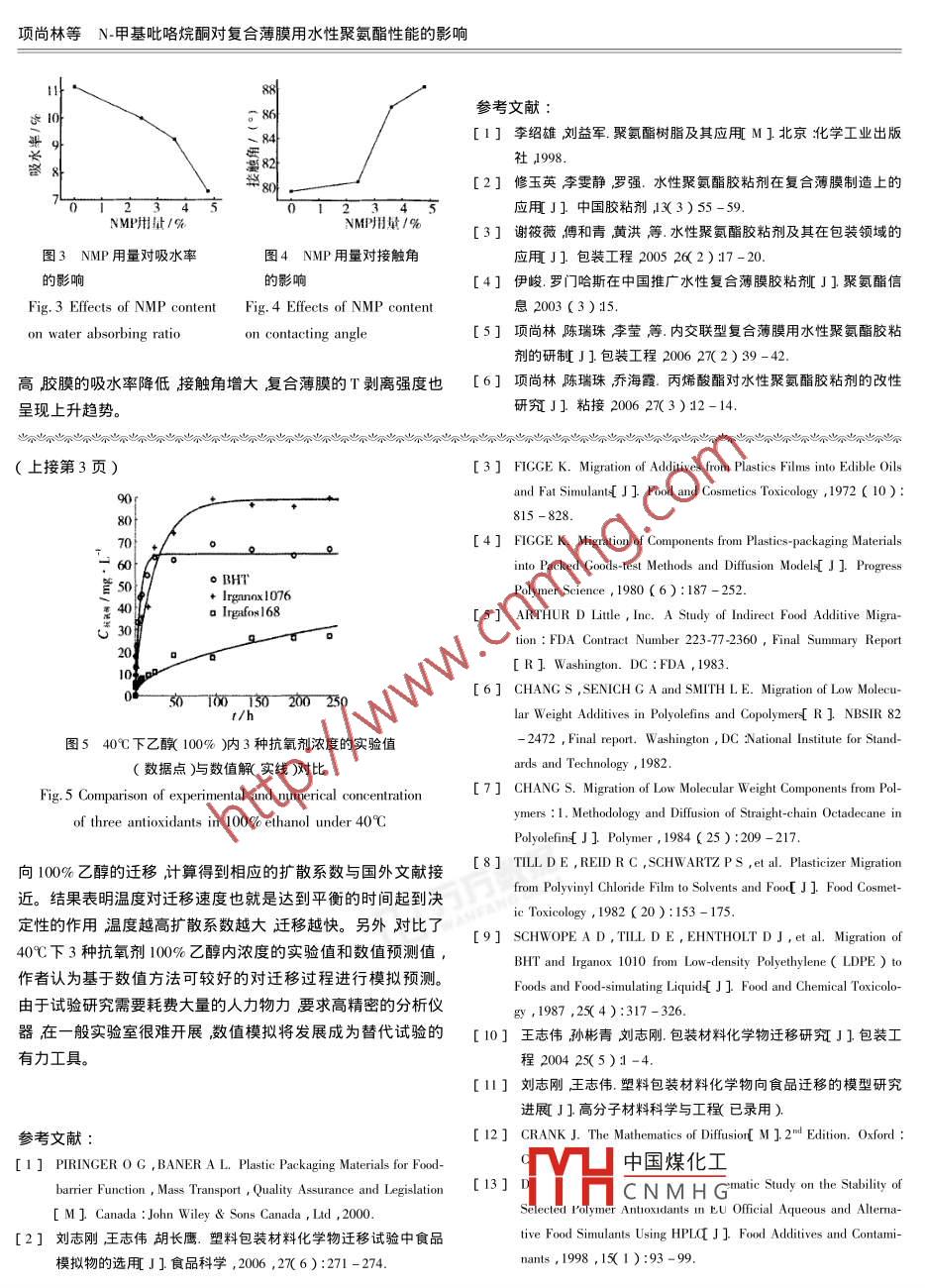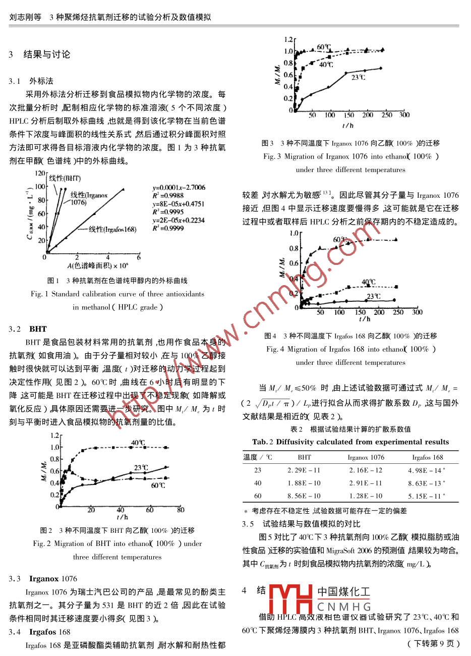 劉志剛等3種聚烯烴抗氧劑遷移的試驗(yàn)分析及數(shù)值模擬包裝科學(xué)與工程3種聚烯烴抗氧劑遷移的試驗(yàn)分析及數(shù)值模擬劉志剛,胡長(zhǎng)鷹2,王志偉1.江南大學(xué),無(wú)錫2141222.暨南大學(xué),廣州510632∷3.暨南大學(xué)包裝工程研究所,珠海519070)摘要∶聚烯烴是食品包裝廣泛應(yīng)用的一類(lèi)塑材抗氧劑又是聚烯烴塑材最常使用的一類(lèi)添加劑因此抗氧劑向食品的遷移是影響食品安全的重要因素。借助HLC分析伩器試驗(yàn)研究了不同溫度條件下3種抗氧劑BHT、 Irganox1076及 Irgafos 168向100%乙醇的遷移并對(duì)實(shí)驗(yàn)值與數(shù)值模擬結(jié)果作了對(duì)比分析。關(guān)鍵詞:遷移;抗氧劑;數(shù)值模擬;塑料包裝;食品安全中圖分類(lèi)號(hào):TQ325.1;TQ050.425文獻(xiàn)標(biāo)識(shí)碼∶A文章編號(hào):1001-356320071-0001-03Experimental Analysis and Numerical Simulation on Migrationof Three antioxidants in polyolefinsLIU Zhi-gang, HU Chang-yng", WANG Zhi-wei(I. Southern Yangtze University Wuxi 214122, China 2, Jinan University Guangzhou 510632, China3. Jinan University, Zhuhai 519070, ChinaAbstract: Polyolefins are widely used in food packaging industry in which antioxidants are usually appliedHPLC we studied the migration of three antioxidants, BHT, Irganox 1076 and Irgafos 168 into 100% ethanol un-der different temperatures, And comparison is made between experimental and numerical resultsKey words: migration antioxidants numerical simulation plastic packaging food safety聚烯烴塑材〔聚乙烯和聚丙烯)是最重要的包裝材料之廣泛應(yīng)用于食品和藥品包裝領(lǐng)域。為了改善聚烯烴材料的1實(shí)驗(yàn)材料及儀器設(shè)備加工性能和提高制品的使用性能等通常會(huì)使用一些添加劑其中常用的一類(lèi)添加劑是抗氧劑??寡鮿┑淖饔迷谟谒芟?.1原材料除老化反應(yīng)中生成的過(guò)氧化游離基、還原烷氧基游離基等隊(duì)從塑料母料為 LLDPE線(xiàn)性低密度聚乙烯)和HDP(低壓而使氧化的連鎖反應(yīng)終止達(dá)到防止高聚物氧化老化的目的。高密度聚乙烯)3種抗氧劑為BH、 Irganox1076和 Irgafos常見(jiàn)的抗氧劑有取代酚類(lèi)、芳香族胺類(lèi)、亞磷酸酯類(lèi)、含硫酯類(lèi)168見(jiàn)表l。等幾種。1.2薄膜制作鑒于包裝材料對(duì)食品安全的重要影響近40年來(lái)美國(guó)食分3次制作薄膜1種薄膜內(nèi)只含1種抗氧劑)其一在華品與藥品管理局( Food and Drug Administration FDA廂和歐盟委南理工大學(xué)聚合物成型加工工程教育部重點(diǎn)實(shí)驗(yàn)室制作BHT員會(huì) Commission of European Union ,EC)等開(kāi)展了大量包裝材與 LLDPE粉料高混并造粒烘干后將含BHT的 LLDPE10%料化學(xué)物包括塑料添加劑、單體、低聚體等〕的遷移理論與實(shí)質(zhì)量分?jǐn)?shù)后同)粒料和HDP%%)粒料混勻然后制成厚度驗(yàn)研究1而國(guó)內(nèi)相關(guān)的研究尚屬少見(jiàn)。本文試驗(yàn)研究了不為40μm的薄膜BH實(shí)際含量為0.95%湯外2次在廣州飛同溫度條件下3類(lèi)抗氧劑BHT、 Irganox1076及 Irgafos168向達(dá)塑料包裝有限公司定制塑料母料為HDPE添加劑分別為00%乙釀高脂肪、油性食品模擬物2)的遷移基于有限差 Irganox1076和 Irgafos168,薄膜內(nèi)實(shí)際含量分別為1.05%和分方法借助 MATLAB科學(xué)軟件對(duì)這一過(guò)程進(jìn)行了數(shù)值模擬并1.1%厚度為50μm。與實(shí)驗(yàn)結(jié)果作了對(duì)比分析中國(guó)煤化工收稿日期:200612-19CNMHG基金項(xiàng)目:珠海市科技計(jì)劃項(xiàng)目資跏PB20051013)北京市重點(diǎn)實(shí)驗(yàn)室開(kāi)放研究課題基金資助KFO6O402)作者簡(jiǎn)介:劉志剛1978-),男無(wú)錫人,江南大學(xué)博士研究生,主攻食品與藥品包裝。通訊作者:王志偉男教授博土生導(dǎo)師。包裝工程 PACKAGING ENGINEERING Vol.28No.12007.0l表1塑料原料及抗氧劑信息Tab 1 Information of plastic materials and antioxidants inuse類(lèi)別項(xiàng)目LLDPE 7042HDPE 9001BHIrganox 1076化學(xué)名線(xiàn)性低密度聚乙烯低壓高密度聚乙烯26二叔丁基對(duì)甲酚以35-二叔丁基-4-羥(24-二叔丁基苯基)基苯基)丙酸十八碳醇酯亞磷酸三酯化學(xué)式C1s H24OCa H6303F分子量無(wú)熔指2g/10min,熔指0.05g/10min熔點(diǎn)69-70℃熔點(diǎn)49℃-54℃熔點(diǎn)183-186℃,本特性密度0.918gcm3密度0.95g/cm密度1.048g密度:.02g/o密度1.03g/cm3臺(tái)灣云林縣德國(guó)拜取薄膜內(nèi))瑞土汽巴薄膜內(nèi)瑞士汽凹薄膜內(nèi))產(chǎn)品來(lái)源廣州石化臺(tái)塑工業(yè)園瑞士 Fluka色譜標(biāo)樣) Sigma- Aldrich(色譜標(biāo)樣) Sigma- Aldrich(色譜標(biāo)樣)3試驗(yàn)設(shè)備及試驗(yàn)條件主要試驗(yàn)設(shè)備包括髙硼硅酸玻璃制遷移試驗(yàn)單元最大容量50mLυRK204A型溥膜測(cè)厚儀濟(jì)南德瑞克儀器有限公(a0)=(C,-C,),x=b(3)司)AI204型電子天平(梅特勒-托利多儀器上海公司)式中為為傳質(zhì)系數(shù)cm/s),C,為t時(shí)刻溥膜與食品接HSG-H16型電熱恒溫水浴鍋(上海儀表集團(tuán)供銷(xiāo)公司);KH觸面上化學(xué)物濃度mgcm3)k為分配系數(shù)無(wú)量綱)等于4FAS型電熱鼓風(fēng)恒溫干燥箱上海訊能電熱設(shè)備有限公司平衡時(shí)化學(xué)物在包裝材料和食品內(nèi)的濃度比值,C為t時(shí)刻1.4色譜儀器及分析條食品內(nèi)化學(xué)物濃度mg/cm3色譜儀器島津2010α(暨南大學(xué)醫(yī)藥生物技術(shù)研發(fā)中心)+UV紫外檢測(cè)器;色譜柱: Hypersil ODS2C18-4.