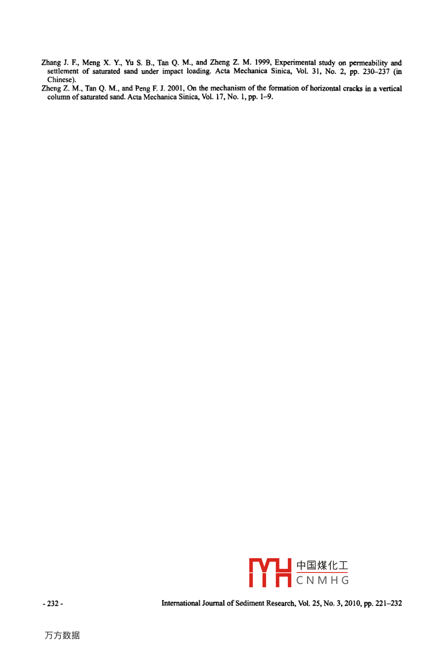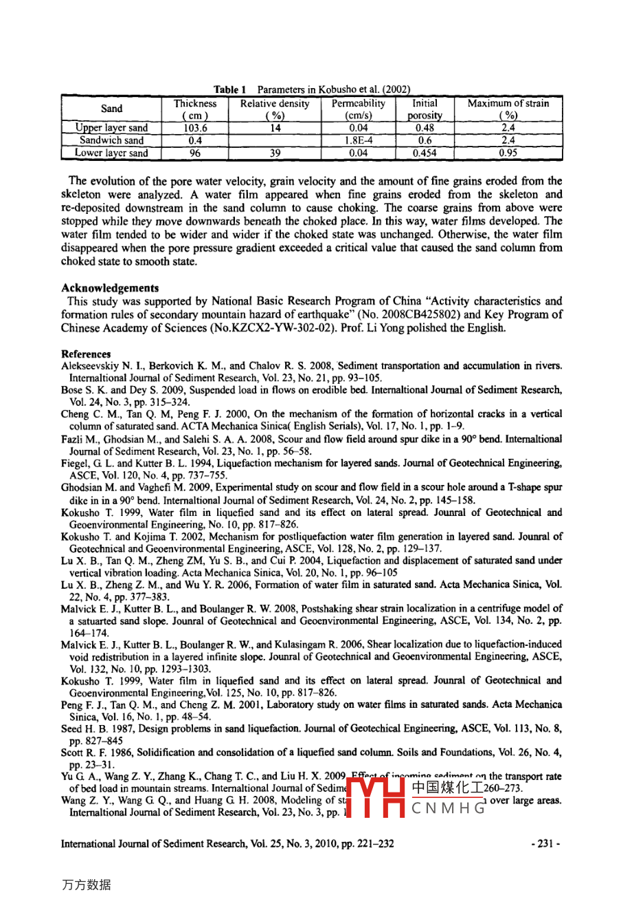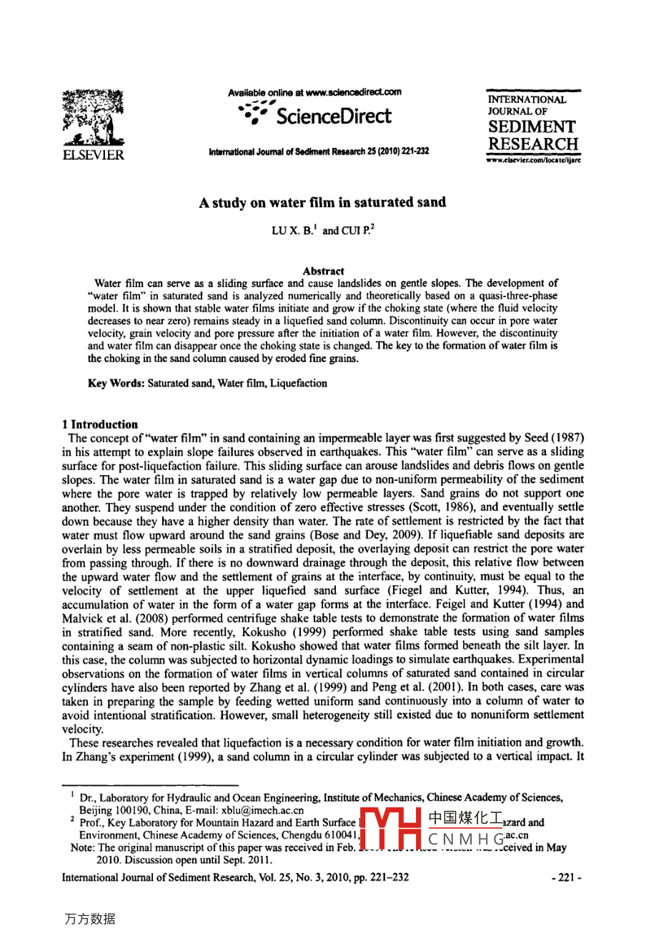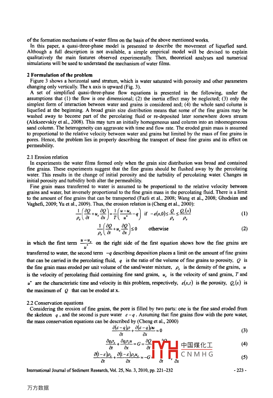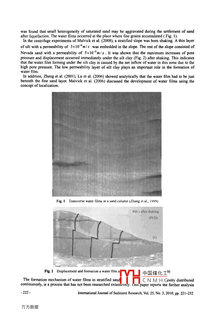 Available online at www.sclencedirect.comINTERNATIONAL" ScienceDirectJOURNAL OFSEDIMENTRESEARCHEL SEVIERIntematonal Joumal of Sedment Research 25 (01)221232ww.evercmlocate/jicA study on water flm in saturated sandLUX. B.' and CUI p?2Water film can serve as a sliding surface and cause landsides on gentle slopes. The development of“water film" in saturated sand is analyzed numerically and theoretically based on a quasi-three-phasemodel. It is shown that stable water films initiate and grow if the choking state (where the fluid velocitydecreases to near zero) remains steady in a liquefied sand column. Discontinuity can occur in pore watervelocit, grain velocity and pore pressure after the initiation of a water film. However, the discontinuityand water film can disappear once the choking state is changed. The key to the formation of water film isthe choking in the sand column caused by eroded fine grains.Key Words: Saturated sand, Water flm, Liquefaction1 IntroductionThe concept of“water flm" in sand containing an impermeable layer was first suggested by Seed (1987)in his attempt to explain slope failures observed in earthquakes. This“water film”can serve as a slidingsurface for post-liquefaction failure. This sliding surface can arouse landslides and debris flows on gentleslopes. The water film in saturated sand is a water gap due to non-uniform permeability of the sedimentwhere the pore water is trapped by relatively low permeable layers. Sand grains do not support oneanother. They suspend under the condition of zero effective stresses (Scott, 1986), and eventually settledown because they have a higher density than water. The rate of settlement is restricted by the fact thatwater must flow upward around the sand grains (Bose and Dey, 2009). If liquefiable sand deposits areoverlain by less permeable soils in a stratified deposit, the overlaying deposit can restrict the pore waterfrom passing through. If there is no downward drainage through the deposit, this relative flow betweenthe upward water flow and the settlement of grains at the interface, by continuity, must be equal to thevelocity of settlement at the upper liquefied sand surface (Ficgel and Kutter, 1994). Thus, anaccumulation of water in the form of a water gap forms at the interface. Feigel and Kutter (1994) andMalvick et al. (2008) performed centrifuge shake table tests to demonstrate the formation of water filmsin stratified sand. More recently, Kokusho (1999) performed shake table tests using sand samplescontaining a seam of non-plastic silt. Kokusho showed that water films formed beneath the sit layer. Inthis case, the column was subjected to horizontal dynamic loadings to simulate earthquakes. Experimentalobservations on the formation of water films in vertical columns of saturated sand contained in circularcylinders have also been reported by Zhang et al. (1999) and Peng et al. (2001). In both cases, care wastaken in preparing the sample by feeding wetted uniform sand continuously into a column of water toavoid intentional stratification. However, small heterogeneity still existed due to nonuniform settlementvelocity.These researches revealed that liquefaction is a necessary condition for water film initiation and growth.In Zhang's experiment (1999), a sand column in a circular cylinder was subjected to a vertical impact. ItDr., Laboratory for Hydraulic and Ocean Engineering, Institute of Mechanics, Chinese Academy of Sciences,Beijing 100190, China, E-mail: xblu@imech.ac.cnProf, Key Laboratory for Mountain Hazard and Earth Surface中國煤化工rzard and .Environment, Chinese Academy of Sciences, Chengdu 610041,_.ac.cnNote: The original manuscript of this paper was received in Feb.DHCNMHGevedinMay2010. Discussion open until Sept. 2011.Intemnational Jounal of Sediment Research, Vol. 25, No. 3, 2010, pp. 221-232.221 -was found that small heterogeneity of saturated sand may be aggravated during the settlement of sandafter liquefaction. The water films occurred at the place where fine grains accumulated( Fig. 1).In the centrifuge experiments of Malvick et al. (2008), a stratified slope was born shaking. A thin layerof silt with a permeability of 3x10- 'm/s was embedded in the slope. The rest of the slope consisted ofNevada sand with a permeability of 5x10~'m/s. It was shown that the maximum increases of porepressure and displacement occurred immediately under the silt clay (Fig. 2) after shaking. This indicatesthat the water film forming under the silt clay is caused by the net inflow of water in this zone due to thehigh pore pressure. The low permeability layer of silt clay plays an important role in the formation ofwater film.In addition, Zheng et al. (2001), Lu et al. (2006) showed analytically that the water flm had to be justbeneath the fine sand layer. Malvick et al. (2006) discussed the development of water films using theconcept of localization.Fig. 1 Transverse water films In a sand column (Zhang ct al, 1999)400 after shaking(PtD)e)Fig. 2 Displacement and formation a water film a| 中國煤化工6)The formation mechanism of water flms in stratifed sandC N M H Gosity distributedcontinuously, is a process that has not been researched extensively. Inis paper reports the further analysis.222.Intermational Joumal of Sediment Research, Vol. 25, No. 3, 2010, pp. 221-232of the formation mechanisms of water films on the basis of the above mentioned works.In this paper, a quasi-three-phase model is presented to describe the movement of liquefied sand.Although a full description is not available, a simple empirical model will be devised to explainqualitatively the main features observed experimentally. Then, theoretical analyses and numericalsimulations will be used to understand the mechanism of water films.2 Formulation of the problemFigure 3 shows a horizontal sand stratum, which is water saturated with porosity and other parameterschanging only vertically. The x axis is upward (Fig. 3).A set ofsimplified quasi-three-p