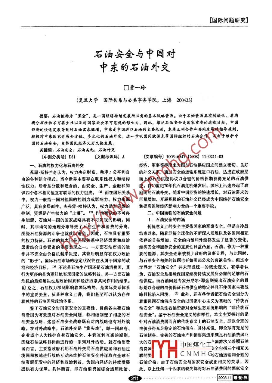 [國際問題研究]石油安全與中國對中東的石油外交口黃一玲(復(fù)旦大學(xué)國際關(guān)系與公共事務(wù)學(xué)院, 上海200433)摘要:石油被稱為“黑金”, 是一國經(jīng)濟(jì)持續(xù)發(fā)展所必需的基本戰(zhàn)略資源。由于石油資源具有稀缺性、非均衡分布性和不可再生性以及對國家安全不可忽視的影響力,因此,維護(hù)石油安全是國家重要的戰(zhàn)略目標(biāo)。中國經(jīng)濟(jì)的快速發(fā)展導(dǎo)致對石油需求驟增,中東是中國進(jìn)口石油的主要來源,本著互利合作和共同發(fā)展的指導(dǎo)原則,積極對中東國家開展全方位、多元化的石油外交,進(jìn)一步鞏固同歐佩克等國際組織的石油合作,有利于維護(hù)中國的石油安全,支持國民經(jīng)濟(jì)又好又快發(fā)展。關(guān)鍵詞:石油安全;石油美元;石油外交[中圖分類號] D81 [文獻(xiàn)標(biāo)識碼] A[文章編號] 1003-6547 (2008) 11-0211-03-、石油的權(quán)力化與石油外交經(jīng)濟(jì)、軍事等手段來力圖與石油供應(yīng)國之間建立密切、良好蘇珊.斯特蘭奇認(rèn)為,權(quán)力決定財富、秩序:公平和自的外交關(guān)系,通過安全的運(yùn)輸系統(tǒng)進(jìn)口石油,達(dá)成在政府層由的各種組合模式。當(dāng)今世界主要存在聯(lián)系性權(quán)力和結(jié)構(gòu)面上的石油供應(yīng)協(xié)議以合理的價格長期獲得充足的石油供性權(quán)力。后者是分散和隱含的,由安全、生產(chǎn)、金觸和知應(yīng)。自20世紀(jì)70年代石油危機(jī)爆發(fā)后,國際上迅速興起了政識四個各不相同但互有聯(lián)系的權(quán)力組成。"而在國際關(guān)系府間的石油外交。隨著中國經(jīng)濟(jì)的快速增長,對石油需求的中,權(quán)力一般指一國對他國的控制力或影響力。權(quán)力來源巨最增加,開展積極的石油外交已經(jīng)成為中國維護(hù)石油安全廣泛,具有多層面性。杰弗雷.哈特認(rèn)為,權(quán)力是對資源的和提高國際經(jīng)濟(jì)影響力量的-一個重要手段??刂?,資源是產(chǎn)生權(quán)力的“土壤"。(2) 作為稀缺的不可再二、中國面臨的石油安全問題生能源,石油對一國的國家戰(zhàn)略具有不可忽視的影響。同1.石油安全的內(nèi)涵時,其非均勻的地理分布導(dǎo)致了石油生產(chǎn)和消費(fèi)的分離,傳統(tǒng)意義上的安全主要指國家的軍事安全,但是自冷戰(zhàn)圍繞石油資源的斗爭也就難以避免,因此,石油具有重要結(jié)束以來,隨著經(jīng)濟(jì)全球化的不斷深人發(fā)展以及各國間相互的權(quán)力特征。石油的權(quán)力化是國際關(guān)系中經(jīng)濟(jì)因素和政治依存的日益增加,安全的內(nèi)涵和外延都發(fā)生了顯著的變化,因素結(jié)合8益緊密的重要表現(xiàn)之- -。一方面石油市場的運(yùn)經(jīng)濟(jì)安全和能源安全的重要性日益凸顯。石油,作為一種重作并不完全由價格機(jī)制來決定,其背后明顯存在權(quán)力政治要的能源,其安全逐漸被提上政府的議事日程,與此同時,的“影子”。國際石油市場的穩(wěn)定狀況往往從屬于國家的政與石油安全相關(guān)的議題也開始引起公眾的普遍關(guān)注。但迄今治和經(jīng)濟(jì)目標(biāo)。0) 不論是石油生產(chǎn)國還是石油消費(fèi)國,其學(xué)界對“石油安全”并未形成統(tǒng)-的概念定義。有學(xué)者認(rèn)行為更多的是為更好地實(shí)現(xiàn)國家的戰(zhàn)略利益。另- -方面石油為,石油安全是指確保國家經(jīng)濟(jì)持續(xù)發(fā)展所必需的足夠的石危機(jī)的最終解決也是政治因素和經(jīng)濟(jì)因素共同作用的結(jié)果。油供應(yīng)。而石油問題專家丹尼爾●耶金則提出石油安全的目④)總之,石油權(quán)力深刻影響著國際格局,是國際關(guān)系體系標(biāo)是以合理(的油價保證石油供應(yīng)的穩(wěn)定并且不使國家主要戰(zhàn)中的重要變量,從某種意義上講,我們甚至可以認(rèn)為存在略目標(biāo)陷人困境。($ 此外,還有些學(xué)者把石油安全劃分為著獨(dú)特的石油國際政治體系。著重強(qiáng)調(diào)石油供應(yīng)安全的以國家中心主義為基礎(chǔ)的“傳統(tǒng)石鑒于石油安全對國家安全的重要性,目前各主要石油油安全”和關(guān)注石油資源對全球生態(tài)系統(tǒng)影響的“非傳統(tǒng)石消費(fèi)國為有效應(yīng)對石油安全問題,都相繼制定了相應(yīng)的石油安全”。鑒于石油安全定義的多樣性,本文主要探討的是油安全戰(zhàn)略,這些石油安全戰(zhàn)略既有對內(nèi)戰(zhàn)略也有對外戰(zhàn)針對石油消費(fèi)國而言的傳統(tǒng)意義上的石油安全,即以合理的略。在對外戰(zhàn)略中,石油外交是“重頭戲”,即一國政府、油價獲得充足穩(wěn)定的石油供應(yīng)。具體來說,即全球有充足的企業(yè)或個人為維護(hù)自身石油安全,本者互利互惠的原則,石油儲備, 完善的石油生產(chǎn)和銷售渠道來滿足石油消費(fèi)國巨圍繞石油戰(zhàn)略目標(biāo)而進(jìn)行的一系列對外活動。就石油消費(fèi)大的石中國煤化工一產(chǎn)國需求又兼顧石油國而言,主要指政府利用石油外交同石油供應(yīng)國和石油過消費(fèi)國安全包括三個相互關(guān)境國積極地進(jìn)行戰(zhàn)略互動來維護(hù)石油安全并謀取在全球石聯(lián)的要YhC N M H G的石油運(yùn)輸和合理的油資源配置中的經(jīng)