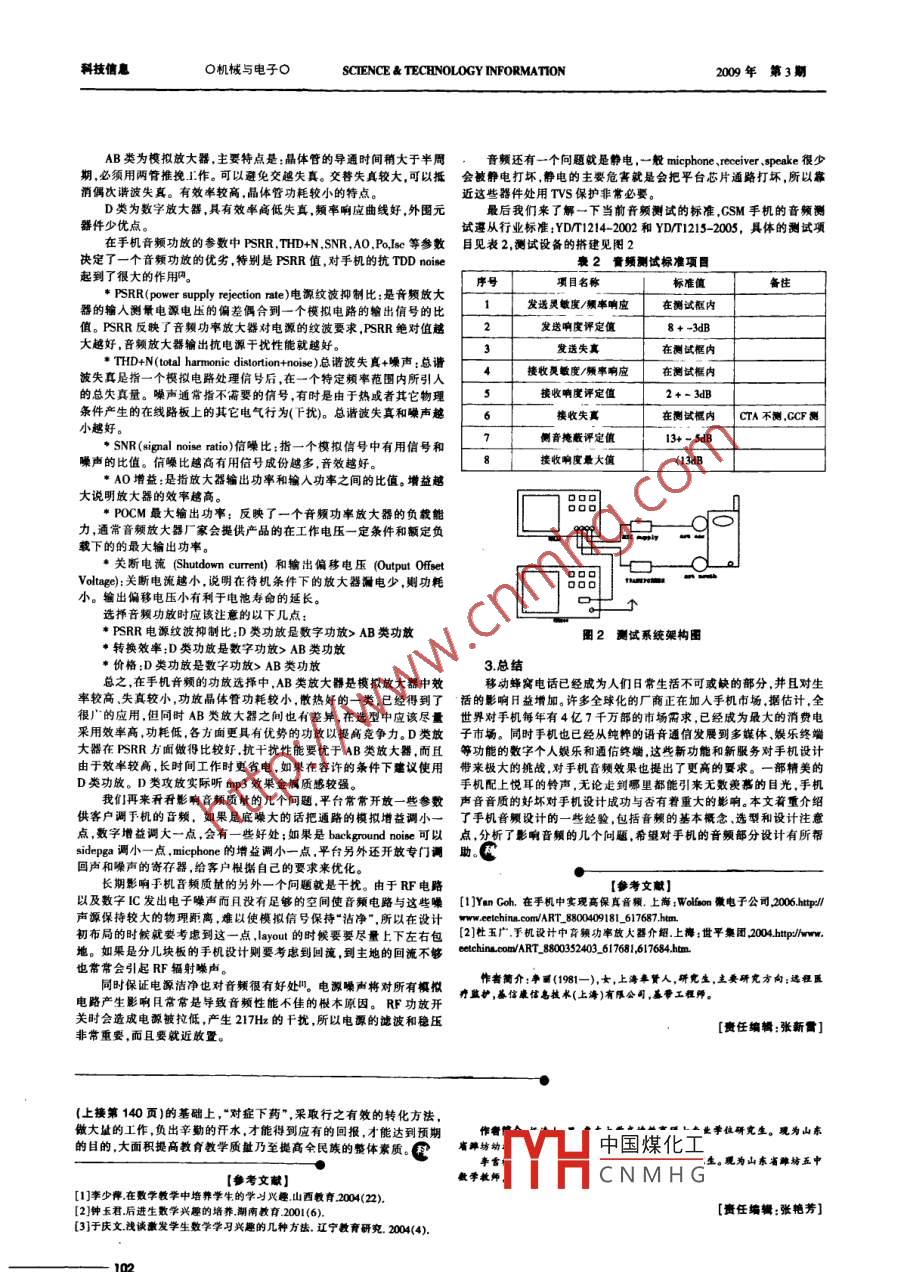 科技信息O機(jī)械與電子OSCIENCE & TECHNOLOGY INFORMATION2009年第3期手機(jī)音頻設(shè)計(jì)李麗(基信康信息技術(shù)<上海>有限公司中國上海 200000)[摘 要]人們現(xiàn)在的生活中已經(jīng)越來越離不開手機(jī),手機(jī)也一代代更新。從一開始只能打電話發(fā)展到現(xiàn)在看電影拍照聽音樂上網(wǎng)無所不能的多媒體釁端。一部精美的手機(jī)配上悅耳的鈴聲,無論走到哪里都能引來無教美慕的目光,手機(jī)聲音音質(zhì)的好杯對手機(jī)設(shè)計(jì)成叻與否有著重大的影響。這篇文章著重介紹了手機(jī)音頻設(shè)計(jì)的一些經(jīng)驗(yàn),包括音頻的基本概念、選型、設(shè)計(jì)注意點(diǎn)和影響音頻的幾個(gè)問題。[關(guān)鍵詞]受話器;揚(yáng)聲器;麥克風(fēng);音頻功放當(dāng)今社會,,人們已經(jīng)越來越離不開手機(jī),除了傳統(tǒng)的打電話發(fā)短1.1.3出音孔設(shè)計(jì)注意點(diǎn)receiver 的出音孔一般位置在較固定的信.手機(jī)的功能也越來越多樣化.看電影聽音樂上網(wǎng)玩游戲無所不能。地方 .出音孔的大小、形狀.個(gè)數(shù)都對reeiving頻響曲線有-一定的影音質(zhì)的好壞已經(jīng)成為手機(jī)的重要評判標(biāo)準(zhǔn)之- - ,今天就來介紹一下手響。 比如說狹長的出音孔和多個(gè)出音孔的設(shè)計(jì)都對曲線有一定的平整機(jī)的音頻設(shè)計(jì)。方面的影響,如果是沒有開放內(nèi)部寄存器的平臺,則設(shè)計(jì)的時(shí)候就要手機(jī)上的音獺部件有受話器rceiver)、揚(yáng)南器speaker).麥克風(fēng)更加注意 這點(diǎn).設(shè)計(jì)時(shí)要和廠家溝通最佳的出音孔大小和個(gè)數(shù)。(microphone)三部分組成。手機(jī)的音頻一般關(guān)注的是通話音質(zhì)和mp31.2epeaker 設(shè)計(jì)注意點(diǎn)效果。語音呼叫保真度相對較低,而音樂和視頻功能則霜要使用更高1.2.1 挑選單體注意點(diǎn)在結(jié)構(gòu)空間和成本允許的情況下, 盡量的采樣速率來實(shí)現(xiàn)高質(zhì)量的立體聲再現(xiàn)。挑選Fo低distorion小聲壓大的speaker,Fo低則低頻效果好,聲音1.通話音質(zhì)聽起來不尖銳、不刺耳distortion小則整個(gè)聲音效果好;聲壓大則是手我們先來看一些聲學(xué)基本的概念:聲波屬于縱波,其傳播需要介機(jī)的 賣點(diǎn)和亮色。如我們常用的philipse的speaker.Fo可以做到400Hz質(zhì),在真空中不能傳播。人耳可接受到的頻城范圍通常為:20Hz--左右 .整個(gè)效果非常好.不過成本較貴。AAC的speaker在800Hz左20KHz. ,20Hz以下稱為次聲波,20KHz以上稱為超盧波,語音范圍為右 ,聲音效果也較好.成本也稍便宜一點(diǎn)。sepeaker 廠家根據(jù)客戶的要300- 3400Hz.聲壓級用符號LP表示,結(jié)果以分貝表示,如公式1:求可以通過更改單體的阻尼或音膜等來更改單體的電參數(shù),比如說降Lp=20Ugμ《公式1)低Fo等,可是更改了以后會影響聲壓大小,所以常常是取多者之間的手機(jī)遁話有normal .handfre .headet三種模式。Normal是receiver1.2.2 聲腔設(shè)計(jì)注意點(diǎn)為了 保證低頻效果,后腔盡量大,密封性狀態(tài),handree是speaker狀態(tài),headet 是erphone狀態(tài)。Speaker、 盡量好。 由于鑲件或機(jī)殼上下蓋緒合所引起的泄漏盡量小。有空間的receiver的發(fā)聲原理是:其磁路系統(tǒng)構(gòu)成環(huán)形磁間釀,其間布滿均勻磁話可以讓 speaker廠家訂做音腔,但是成本會增加。場.其振動系統(tǒng)由導(dǎo)線繞成的環(huán)形音圖和與之相連的振膜組成,有電1.2.3 出音孔設(shè)計(jì)注意點(diǎn)出音孔面積不能太小,且自由敞開和流通過時(shí),音圈切割磁力線,產(chǎn)生作用力,帶動振膜-起運(yùn)動.振膜策整個(gè)后腔相通。 出音孔放好不要太狹長,否則會削落低額效果。動空氣發(fā)出相應(yīng)的聲音。同樣是發(fā)聲器件.同樣用于手機(jī)上.但由于構(gòu)13miephone設(shè)計(jì)注意點(diǎn)成和材質(zhì)等的不同.SPEAKER與RECEIVER的主要區(qū)別是:1.3.1挑選單體注意點(diǎn)挑選和 speaker.rceiver同一廠家的表1 SPEAKER 與RECEIVER的區(qū)別表micphone .可以降低成本。1.3.2 聲腔設(shè)計(jì)注意點(diǎn)miephone 的音腔主要是前腔,前腔一定SPEAKERRECEIVER要密封否則會造成高頻泄露,測試sending頻響時(shí)高頻部分會塌下來,可聽距離通過一定距離被人耳接聽直接被人耳接聽靠內(nèi)部寄存器也不一定能補(bǔ)償上去,如果足沒有開放內(nèi)部寄存器的平頻喃范圍語音及音樂,語音臺.則設(shè)計(jì)的時(shí)候就要更加注意這點(diǎn)。密封好的話這個(gè)曲線-般都比功率較大小較平.測試一般都比較好過。有些設(shè)計(jì)常常用泡棉來壓緊miephone,這是更要考慮到尺寸的配合,看看是否真的壓到位,同時(shí)micphone最好Distortion較小帶橡膠套。在手機(jī)上的位置位置隨意性大一般在國定位置13.3開孔設(shè)計(jì)注意點(diǎn)miephone 的開孔和reeiver-樣一般在比較固定的位置.開孔不宜太小否則影響聲音的響度,同時(shí)開孔也不有了這些基本原理后,我們接著再來看看手機(jī)音頻設(shè)計(jì)時(shí)的一些,周圍環(huán)境的噪聲也會思路和注意點(diǎn):13.4 PCB設(shè)計(jì)注意點(diǎn)我們常 常以差分方式連接麥克風(fēng),從而1.1receiver 設(shè)計(jì)注意點(diǎn)消除噪聲源在走線中感應(yīng)出的電氣噪聲。Receiver和speaker通路的1.1.1 挑選單體注意點(diǎn)挑選e