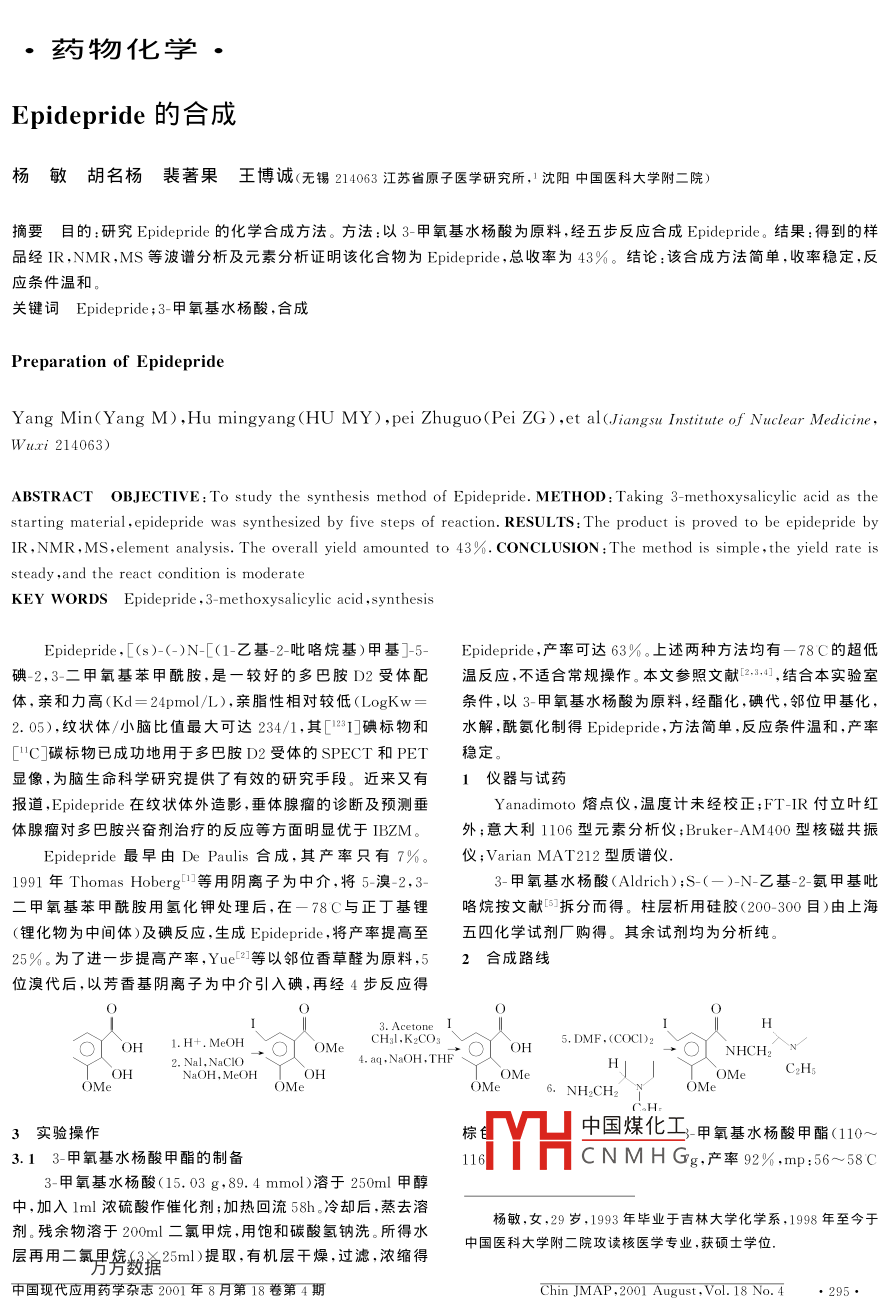 ●藥物化學(xué)●Epidepride的合成楊敏胡名楊裴著果王博誠(chéng)(無(wú)錫214063江蘇省原子醫(yī)學(xué)研究所,1沈陽(yáng)中國(guó)醫(yī)科大學(xué)附二院)摘要目的:研究Epidepride的化學(xué)合成方法。方法:以3-甲氧基水楊酸為原料,經(jīng)五步反應(yīng)合成Epidepride。結(jié)果:得到的樣品經(jīng)IR,NMR,MS等波譜分析及元素分析證明該化合物為Epidepride,總收率為43%。結(jié)論:該合成方法簡(jiǎn)單,收率穩(wěn)定,反應(yīng)條件溫和。關(guān)鍵詞Epidepride;3- 甲氧基水楊酸,合成Preparation of EpideprideYang Min( Yang M),Hu mingyang(HU MY),pei Zhuguo(Pei ZG) ,et al(.Jiangsu Institute of Nuclear Medicine,Wuxi 214063)ABSTRACT OBJECTIVE: To study the synthesis method of Epidepride. METHOD: Taking 3- methoxysalicylic acid as thestarting material,epidepride was synthesized by five steps of reaction. RESULTS: The product is proved to be epidepride byIR ,NMR , MS,element analysis. The overall yield amounted to 43%. CONCLUSION : The method is simple,the yield rate issteady ,and the react condition is moderateKEY WORDS Epidepride ,3 -methoxysalicylic acid ,synthesisEpidepride,[(s)-(-)N-E(1-乙基- 2- 吡咯烷基)甲基]-5-Epidepride ,產(chǎn)率可達(dá)63%。上述兩種方法均有- 78C的超低碘-2,3-二甲氧基苯甲酰胺,是一較好的多巴胺D2受體配溫反應(yīng),不適合常規(guī)操作。本文參照文獻(xiàn)2.] .結(jié)合本實(shí)驗(yàn)室體,親和力高(Kd=24pmol/L),親脂性相對(duì)較低(LogKw=條件,以3-甲氧基水楊酸為原料,經(jīng)酯化,碘代,鄰位甲基化,2.05),紋狀體/小腦比值最大可達(dá)234/1.其[1*1]碘標(biāo)物和水解,酰氨化制得Epidepride,方法簡(jiǎn)單,反應(yīng)條件溫和,產(chǎn)率["C]碳標(biāo)物已成功地用于多巴胺D2受體的SPECT和PET穩(wěn)定。顯像,為腦生命科學(xué)研究提供了有效的研究手段。近來又有1儀器與 試藥報(bào)道,Epidepride在紋狀體外造影,垂體腺瘤的診斷及預(yù)測(cè)垂Yanadimoto熔點(diǎn)儀,溫度計(jì)未經(jīng)校正;FT-IR付立葉紅體腺瘤對(duì)多巴胺興奮劑治療的反應(yīng)等方面明顯優(yōu)于IBZM。外;意大利1106型元素分析儀;BrukerAM400型核磁共振Epidepride最早由De Paulis 合成,其產(chǎn)率只有7%。儀;Varian MAT212型質(zhì)譜儀.1991年Thomas Hoberg[1] 等用陰離子為中介,將5-溴-2,3-3-甲氧基水楊酸(Aldrich);S-(-)-N-乙基-2-氨甲基吡.二甲氧基苯甲酰胺用氫化鉀處理后,在一78C與正丁基鋰咯烷按文獻(xiàn)[s3拆分而得。柱層析用硅膠(200- 300目)由上海(鋰化物為中間體)及碘反應(yīng),生成Epidepride,將產(chǎn)率提高至五四化學(xué)試劑廠購(gòu)得。其余試劑均為分析純。25%。為了進(jìn)-步提高產(chǎn)率,YueC2]等以鄰位香草醛為原料.52合成路線位溴代后,以芳香基陰離子為中介引入碘,再經(jīng)4步反應(yīng)得HOH1. H+. MeOHCHaI,K2COsOI5. DMF,(COC)2NHCH2”2. Nal,NaCIo4. aq,NaOH,THFT. OHNaOH,MeOHT.. OHOMeC2Hs5. NH2CH23實(shí)驗(yàn)操作中國(guó)煤化工-甲氧基水楊酸甲酯(110~3.13-甲氧基水楊酸甲酯的制備116:MYHC N M H Gg,產(chǎn)率92% .mp:56~58C3- 甲氧基水楊酸(15.03 g.89. 4 mmol)溶于250ml甲醇中,加入lml濃硫酸作催化劑;加熱回流58h。冷卻后,蒸去溶劑。殘余物溶于200ml二氯甲烷,用飽和碳酸氫鈉洗。所得水楊敏,女,29歲,1993年畢業(yè)于吉林大學(xué)化學(xué)系,1998年至今于中國(guó)醫(yī)科大學(xué)附二院攻讀核醫(yī)學(xué)專業(yè),獲碩士學(xué)位.層再用二氯男彎數(shù)據(jù)25ml)提取,有機(jī)層干燥,過濾,濃縮得中國(guó)現(xiàn)代應(yīng)用藥學(xué)雜志2001年8月第18卷第4期Chin JMAP .2001 August,Vol.18 No.4.295●(文獻(xiàn)5:85~ 88C/0.6mmHg;產(chǎn)率92% ;mp:61.5~ 62.理,直接用于下步反應(yīng)。3.6 Epidepride 的制備[2]3.25碘-3-甲氧基水楊酸甲酯的制備將酰氯溶解于10ml 二氯甲烷中,再加入5mlS-(- )-N-3-甲氧基水楊酸甲酯(9.2g,50.5mmol)溶于192ml甲醇乙基2-氨甲基吡咯烷的二氯甲烷溶液,室溫?cái)嚢?h,減壓蒸中,加入碘化鈉(11.36g)和氫氧化鈉(2.02g)。冰浴冷卻至去溶劑,得粗產(chǎn)物。將粗產(chǎn)物溶于20ml 二氯甲烷中,用0C,滴加5%的次氯酸鈉水溶液(142ml),得淡黃色漿狀物.01mol/L的氫氧化鈉液20ml冼,分離。有機(jī)層干燥,過濾,除~3C攪拌1h后,用10%硫代硫酸鈉水溶液處理,再用鹽酸去溶劑,得黃色油狀物。經(jīng)柱層析純化(硅膠,甲醇/二氯甲烷調(diào)pH至7;加乙醚500ml,溶液分層;乙醚層用鹽水洗,再用= 1: 9)得Epidepride 0. 77g (95%)。IR (鹽片): 3367,硫酸鈉干燥。蒸去乙醚,得桔黃色固體。乙酸乙酯/正已烷(2/1660cm^"HNMR(CDCl3):8(ppm)8. 30(br,s,1H);8. 00(d,3)重結(jié)晶兩次,得白色柱狀晶體7. 78g.產(chǎn)率50% ,mp:108~1H);7. 25(d,1H);3. 86(s,3H);3. 85(s,3H);3. 75-1. 58(m,110C。(文獻(xiàn)[4]:硅膠柱層析純化后產(chǎn)率為43% ,mp:104C)11 ,pyrrolidine H);l.11(t,3,N-Et). MS(m/z):419(M+1),3.35-碘-2,3-二甲氧基苯甲酸甲酯的制備389,291, 98(100%),72元素分析:實(shí)測(cè)值/理論值C45.5-碘-3-甲氧基水楊酸甲酯(1.13g,3.66mmol)溶于40ml56% /45.9% ;H5.515%/5. 54% ;N6.495%/6. 7%。無(wú)水丙酮,加入碳酸鉀(1.5g.10.86mmol)和碘甲烷(2.8g.參考文獻(xiàn)19. 68mmol),回流攪拌48h ,蒸去丙酮,所得殘余物溶于二氯甲烷。水洗3次,有機(jī)層用無(wú)水硫酸鈉干燥,減壓蒸去二氯甲1 Thomas H, Strom P, Hakan H,et al. Potential antipsychotic烷,即得5-碘-2,3-二甲氧基苯甲酸甲酯,白色固體1. 18g,熔agents (8) Antidopaminergic properties of a potent series of 5點(diǎn)為50-52C,產(chǎn)率為100%。(文獻(xiàn)[:產(chǎn)率為 96%)substituted(- )-(S)-N-[ 1-ety
