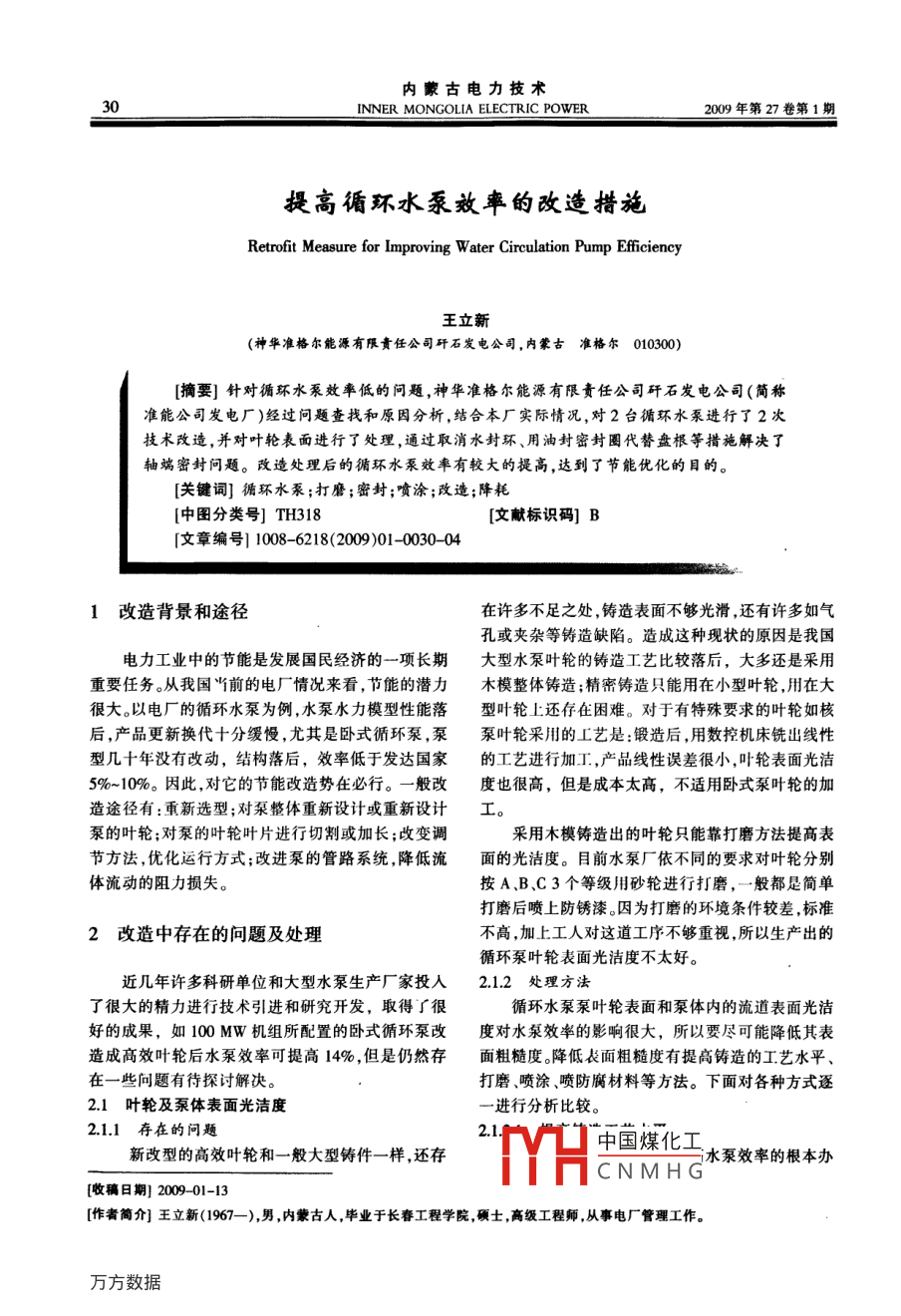 內(nèi)蒙古電力技術(shù)INNER MONGOLIA ELECTRIC POWER009年第27卷第1期提高循環(huán)水泵效率的改造措施Retrofit Measure for Improving Water Circulation Pump Efficiency王立新(神華準(zhǔn)格爾能源有限責(zé)任公司矸石發(fā)電公司,內(nèi)蒙古準(zhǔn)格爾010300[摘要]針對(duì)循環(huán)水泵效率低的問(wèn)題,神華準(zhǔn)格爾能源有限責(zé)任公司矸石發(fā)電公司(簡(jiǎn)稱準(zhǔn)能公司發(fā)電廠)經(jīng)過(guò)問(wèn)題查找和原因分析,結(jié)合本廠實(shí)際情況,對(duì)2臺(tái)循環(huán)水泵進(jìn)行了2次技術(shù)改造,并對(duì)葉輪表面進(jìn)行了處理,通過(guò)取消水封環(huán)、用油封密封圈代替盤(pán)根等措施解決了柚端密封問(wèn)題。改造處理后的循環(huán)水泵效率有較大的提高,達(dá)到了節(jié)能優(yōu)化的目的。[關(guān)鍵詞]循環(huán)水泵;打磨;密封;噴涂;改造;降耗[中圖分類號(hào)]TH318[文獻(xiàn)標(biāo)識(shí)碼]B「文章編號(hào)]1008-6218(200901-0030-041改造背景和途徑在許多不足之處,鑄造表面不夠光滑還有許多如氣孔或夾雜等鑄造缺陷。造成這種現(xiàn)狀的原因是我國(guó)電力工業(yè)中的節(jié)能是發(fā)展國(guó)民經(jīng)濟(jì)的一項(xiàng)長(zhǎng)期大型水泵葉輪的鑄造工藝比較落后,大多還是采用重要任務(wù)。從我國(guó)當(dāng)前的電廠情況來(lái)看,節(jié)能的潛力木模整體鑄造;精密鑄造只能用在小型葉輪,用在大很大。以電廠的循環(huán)水泵為例,水泵水力模型性能落型葉輪上還存在困難。對(duì)于有特殊要求的葉輪如核后,產(chǎn)品更新?lián)Q代十分緩慢,尤其是臥式循環(huán)泵,泵泵葉輪采用的工藝是:鍛造后,用數(shù)控機(jī)床銑出線性型幾十年沒(méi)有改動(dòng),結(jié)構(gòu)落后,效率低于發(fā)達(dá)國(guó)家的工藝進(jìn)行加工,產(chǎn)品線性誤差很小,葉輪表面光潔5%~10%。因此,對(duì)它的節(jié)能改造勢(shì)在必行。一般改度也很高,但是成本太高,不適用臥式泵葉輪的加造途徑有:重新選型;對(duì)泵整體重新設(shè)計(jì)或重新設(shè)計(jì)工。泵的葉輪;對(duì)泵的葉輪葉片進(jìn)行切割或加長(zhǎng);改變調(diào)采用木模鑄造出的葉輪只能靠打磨方法提高表節(jié)方法,優(yōu)化運(yùn)行方式;改進(jìn)泵的管路系統(tǒng),降低流面的光潔度。目前水泵廠依不同的要求對(duì)葉輪分別體流動(dòng)的阻力損失。按A、BC3個(gè)等級(jí)用砂輪進(jìn)行打磨,一般都是簡(jiǎn)單打磨后噴上防銹漆。因?yàn)榇蚰サ沫h(huán)境條件較差,標(biāo)準(zhǔn)2改造中存在的問(wèn)題及處理不高,加上工人對(duì)這道工序不夠重視,所以生產(chǎn)出的循環(huán)泵葉輪表面光潔度不太好近幾年許多科研單位和大型水泵生產(chǎn)廠家投人21.2處理方法了很大的精力進(jìn)行技術(shù)引進(jìn)和研究開(kāi)發(fā),取得了很循環(huán)水泵泵葉輪表面和泵體內(nèi)的流道表面光潔好的成果,如100MW機(jī)組所配置的臥式循環(huán)泵改度對(duì)水泵效率的影響很大,所以要盡可能降低其表造成高效葉輪后水泵效率可提高14%,但是仍然存面粗糙度。降低表面粗糙度有提高鑄造的工藝水平在一些問(wèn)題有待探討解決。打磨、噴涂、噴防腐材料等方法。下面對(duì)各種方式逐21葉輪及泵體表面光潔度進(jìn)行分析比較。2.1.1存在的問(wèn)題新改型的高效葉輪和一般大型鑄件一樣,還存中國(guó)煤化工水泵效率的根本辦CNMHG[收稿日期]200-01-13[作者簡(jiǎn)介]王立新(1967一),男,內(nèi)蒙古人,畢業(yè)于長(zhǎng)春工程學(xué)院碩士高級(jí)工程師從事電廠管理工作。2009年第27卷第1期內(nèi)蒙古電力技術(shù)31法,但國(guó)內(nèi)鑄造水平相對(duì)落后,與發(fā)達(dá)國(guó)家差距很3準(zhǔn)能公司發(fā)電廠循環(huán)水泵改造大,鑄造業(yè)發(fā)展緩慢2.1.22打磨準(zhǔn)能公司發(fā)電廠2×100MW火力發(fā)電機(jī)組采用打磨是目前通用的方法,但因水泵的葉輪表面的閉式循環(huán)水系統(tǒng)由2座雙曲線自然通風(fēng)冷卻塔和和流道表面不是平面,很難用機(jī)器自動(dòng)打磨只能靠4臺(tái)單級(jí)雙吸水平中開(kāi)臥式布置的循環(huán)水泵以及輔手工,即采用手提砂輪、角向砂輪等進(jìn)行打磨;因助設(shè)備組成。循環(huán)水泵采用沈陽(yáng)水泵廠生產(chǎn)的此尺寸和光潔度不能保證,很難達(dá)到令人滿意的效48H-22A型水泵,水泵的主要技術(shù)參數(shù)如表1。果衰148SH-22A型循環(huán)水泵主要技術(shù)參數(shù)2123噴涂噴涂是表面工程中應(yīng)用廣泛且非常重要一項(xiàng)表流量/(th2)面技術(shù),它是指將熔融狀態(tài)的噴涂材料通過(guò)高速氣揚(yáng)程/m流使其霧化噴射到零件上形成噴涂層的一種表面加功率/W586工方法。常用的噴涂方法有火焰噴涂、電弧噴涂、等Y80012/1430離子噴涂等。電壓N2.124噴防腐材料配套電機(jī)技術(shù)參數(shù)電流/A103國(guó)家金屬腐蝕控制工程技術(shù)研究中心研制出一功率/W種新型的腐蝕防護(hù)涂料—SEBF熔融結(jié)合的環(huán)氧轉(zhuǎn)速/(rmim4樹(shù)脂粉末涂料。原設(shè)計(jì)循環(huán)水泵為單機(jī)單臺(tái)循環(huán)水泵運(yùn)行,不SEBF熔融結(jié)合的環(huán)氧樹(shù)脂粉末涂料優(yōu)勢(shì)突出,能根據(jù)環(huán)境溫度和負(fù)荷的變化調(diào)整出口流量及耗電能有效解決因