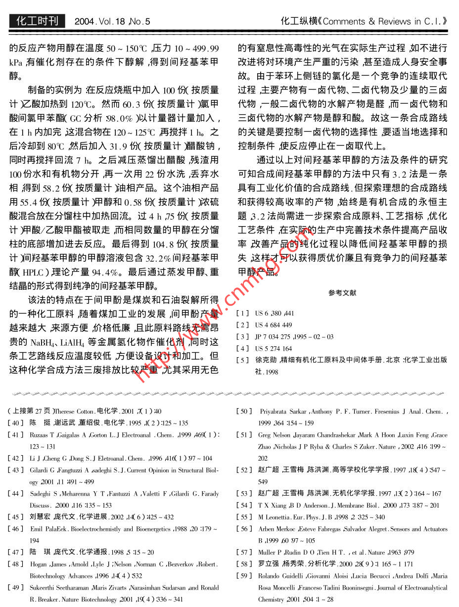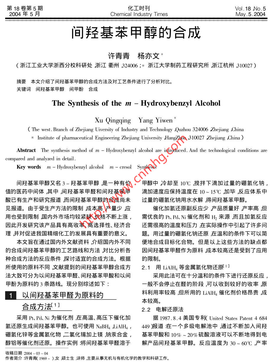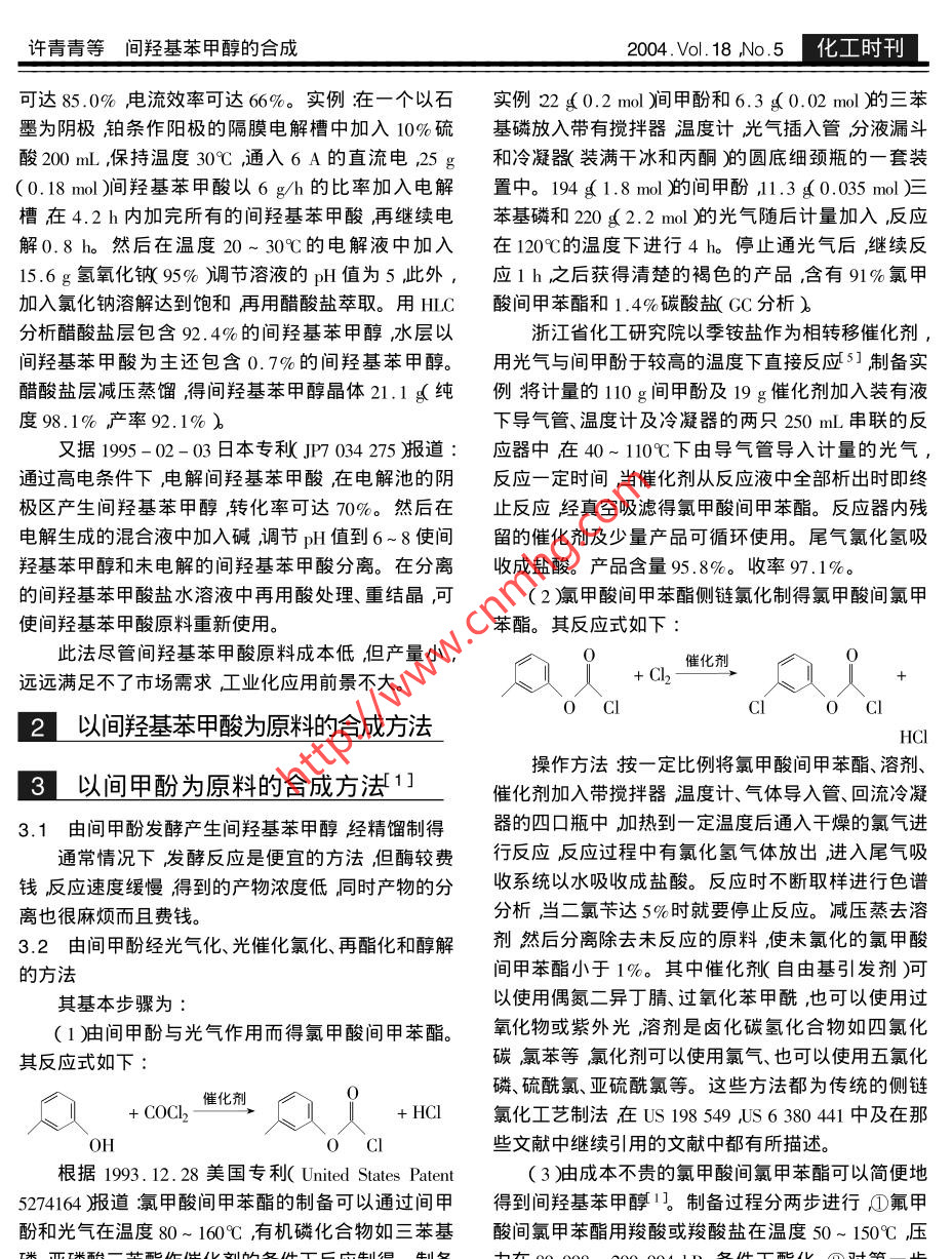 第18卷第5期化工時刊Vol. 18 ,No.52004年5月Chemical Industry TimesMay .5.2004間羥基苯甲醇的合成許青青楊亦文*(浙江工業(yè)大學浙西分??蒲刑幷憬橹?24006 ;*浙江大學制藥工程研究所浙江杭州310027 )摘要本文介紹了 間羥基苯甲醇的合成方法及對工藝條件進行了分析對比。關(guān)鍵詞間羥基苯甲醇 間甲酚 合成The Synthesis of the m一Hydroxybenzyl AlcoholXu Qingqing Yang Yiwen( The west. Branch of Zhejiang Uiversity of Industry and Technology Quzhou 324006 ,Zhejiang China* Institute of pharmaceutical Engineering Zhejiang University ,HangZhou 310027 Zhejiang ,China )Abstract The synthesis method of m - Hydroxybenzyl alcohol are introduced. And the technological conditions arecompared and analyzed in detail.Key words m - Hydroxybenzyl alcohol m - cresol Synthesis間羥基苯甲醇又名3-羥基苯甲醇是一種有價甲醇中冷卻至10C攪拌下滴加過量的硼氫化鈉,值的醫(yī)藥中間體其中間羥基苯甲醛和間羥基苯甲滴加速度應(yīng)保持溫度在10~ 15C加畢,反應(yīng)體系中酸已有生產(chǎn)和研究報道而間羥基苯甲醇的合成尚未過量的硼氫化鈉用水水解得間羥基苯甲醇。見報道。由于受生產(chǎn)方法的限制成本高產(chǎn)量少應(yīng)催化加氫還原副反應(yīng)少產(chǎn)品質(zhì)量好產(chǎn)率高,但用也受到限制國內(nèi)外市場均較緊缺價格不斷上漲,需優(yōu)良的Pr、Pd. Ni催化劑和H2來源,而且加氫反應(yīng)因此開發(fā)研究該產(chǎn)品具有高收率、高選擇性、經(jīng)濟合還需很高的溫度和壓力在實際操作中引起了許多問理并對促進我國精細化工的發(fā)展具有重要的意義。題。用過量的硼氫化鈉還原在溫和的條件下可以簡本文旨在通過國內(nèi)外文獻資料介紹國內(nèi)外不同便地合成目標化合物。但是以上這些方法的缺點都的合成間羥基苯甲醇的工藝路線和方法對比分析各因間羥基苯甲醛作為原料成本較高還是受到了應(yīng)用種合成方法的反應(yīng)條件探討適宜的合成方法。根據(jù)的限制。所使用的原料不同,文獻提到的間羥基苯甲醇合成方2.1用LiAlH4等金屬氫化物還原1]法大致可分為以間羥基苯甲醛、間羥基苯甲酸和以間采用此法可在十分溫和的條件下進行還原反應(yīng),甲酚為原料的3條路線?,F(xiàn)分別綜述如下:一般不會停止在醛的階段,可以收到較好的收率原1|以間羥基苯甲醛為原料的料利用率較高但所用的LiAIH4 催化劑價格昂貴,成本較高。合成方法[1]2.2 電解還原法采用PI.Pd、Ni為催化劑,在高溫、高壓下催化加據(jù)1987. 8.4美國專利( United States Patent 4 684氫還原生成間羥基苯甲醇。也可使用NaBH4 LiAlH4,449 )報道:在一個多級電解池中通過不斷加入間羥硼氫化鋅等金屬氫化物二氯化錫加上鎂鈉汞合金,基苯甲酸和10%~20%硫酸溶液可以不斷地得到電醇鋁等催化劑還原。操作實例將間羥基苯甲醛溶于解產(chǎn)品間羥基苯甲醇。反應(yīng)溫度為30~ 60C ,產(chǎn)率收稿日期2004- 03-04作者簡介許青青( 1969~ )女碩士生,講師主要從事無機與有機化學的教學和科研工作。--28-許青青等間羥基苯甲醇的合成2004.Vol.18 ,.No. 5化工時刊可達85.0%電流效率可達66%。實例:在-個以石實例22 ( 0.2 mol間甲酚和6.3 (0.02 mol的三苯墨為陰極,鉑條作陽極的隔膜電解槽中加入10%硫基磷放入帶有攪拌器溫度計光氣插入管分液漏斗酸200mL,保持溫度30C通入6A的直流電.25g和冷凝器(裝滿干冰和丙酮)的圓底細頸瓶的一套裝(0.18 mol )間羥基苯甲酸以6 g/h的比率加入電解置中。194《1.8 mol )的間甲酚,11.3 ( 0.035 mol )三槽在4.2h內(nèi)加完所有的間羥基苯甲酸再繼續(xù)電苯基磷和220 62.2 mol )的光氣隨后計量加入反應(yīng)解0.8 h。然后在溫度20~ 30°C的電解液中加入在120%C的溫度下進行4 ho停止通光氣后,繼續(xù)反15. 6g氫氧化鈉( 95% )調(diào)節(jié)溶液的pH值為5此外,應(yīng)1 h ,之后獲得清楚的褐色的產(chǎn)品,含有91%氯甲.加入氯化鈉溶解達到飽和再用醋酸鹽萃取。用HLC酸間甲苯酯和1.4%碳酸鹽(GC分析)分析醋酸鹽層包含92. 4%的間羥基苯甲醇,水層以浙江省化工研究院以季銨鹽作為相轉(zhuǎn)移催化劑,間羥基苯甲酸為主還包含0.7%的間羥基苯甲醇。用光氣與間甲酚于較高的溫度下直接反應(yīng)5]制備實醋酸鹽層減壓蒸餾得間羥基苯甲醇晶體21.1 (純例將計量的110 g間甲酚及19 g催化劑加入裝有液度98.1%產(chǎn)率92.1% )下導氣管、溫度計及冷凝器的兩只250 mL串聯(lián)的反又據(jù)1995-02-03日本專秋JP7 034 275 )報道:應(yīng)器中在40~ 110C下由導氣管導入計量的光氣,通過高電條件下,電解間羥基苯甲酸,在電解池的陰反應(yīng)一定時間,當催化劑從反應(yīng)液中全部析出時即終極區(qū)產(chǎn)生間羥基苯甲醇,轉(zhuǎn)化率可達70%。然后在止反應(yīng)經(jīng)真空吸濾得氯甲酸間甲苯酯。反應(yīng)器內(nèi)殘電解生成的混合液中加入堿,調(diào)節(jié)pH值到6~8使間留的催化劑及少量產(chǎn)品可循環(huán)使用。尾氣氯化氫吸羥基苯甲醇和未電解的間羥基苯甲酸分離。在分離收成鹽酸。產(chǎn)品含量95.8%。收率97.1%。的間羥基苯甲酸鹽水溶液中再用酸處理、重結(jié)晶可(2氯甲酸間甲苯酯側(cè)鏈氯化制得氯甲酸間氯甲使間羥基苯甲酸原料重新使用。苯酯。其反應(yīng)式如下:此法盡管間羥基苯甲酸原料成本低,但產(chǎn)量小,+ Ch2催化劑遠遠滿足不了市場需求工業(yè)化應(yīng)用前景不大。) Cl0Cl2以間羥基苯甲酸 為原料的合成