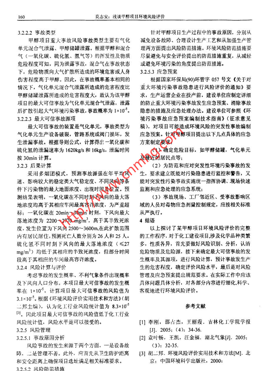 2009年第12期化學(xué)工程與裝備2009年12月Chesical Engineering &Equipent159淺談甲醇項(xiàng)目環(huán)境風(fēng)險(xiǎn)評(píng)價(jià)莫志安(西安建筑科技大學(xué)西安地質(zhì)礦產(chǎn)研究所,陜西西安710055)摘要:環(huán)境風(fēng)險(xiǎn)評(píng)價(jià)足甲醇項(xiàng)目環(huán)境影響評(píng)價(jià)中的一項(xiàng)重要內(nèi)容。結(jié)合個(gè)人工作實(shí)踐,以某甲醇建設(shè)項(xiàng)目為例,對(duì)化工建設(shè)項(xiàng)日環(huán)境風(fēng)險(xiǎn)評(píng)價(jià)程序中風(fēng)險(xiǎn)識(shí)別、源項(xiàng)分析、后果計(jì)算、風(fēng)險(xiǎn)計(jì)算和評(píng)價(jià)、.風(fēng)險(xiǎn)管理等方面的內(nèi)容及評(píng)價(jià)方法進(jìn)行了介紹,并對(duì)甲醇項(xiàng)目的環(huán)境風(fēng)險(xiǎn)應(yīng)急預(yù)案編制進(jìn)行探討。關(guān)鍵詞:甲醇: 環(huán)境風(fēng)險(xiǎn)評(píng)價(jià);風(fēng)險(xiǎn)管理1甲醇項(xiàng)目環(huán)境風(fēng)險(xiǎn)評(píng)價(jià)的法律要求主要生產(chǎn)物料- -氧化碳、氫氣和碳化氫,主要根據(jù)《建設(shè)項(xiàng)目環(huán)境風(fēng)險(xiǎn)評(píng)價(jià)技術(shù)導(dǎo)則》產(chǎn)品是甲醇,屬于易燃易爆物質(zhì)和有毒物質(zhì),其中HJ/T169-2004及有關(guān)文件要求,甲醇項(xiàng)日環(huán)境影響一氧化碳、硫化氫屬于高度危害物質(zhì),甲醇屬于中評(píng)價(jià)應(yīng)該對(duì)其存在的環(huán)境風(fēng)險(xiǎn)進(jìn)行識(shí)別和預(yù)測(cè)評(píng)度危害物質(zhì)。故本次確定-氧化碳、硫化氫、氫氣、價(jià),并應(yīng)在報(bào)告書中提出環(huán)境風(fēng)險(xiǎn)應(yīng)急預(yù)案和事故甲醇為環(huán)境風(fēng)險(xiǎn)評(píng)價(jià)因子。防范和減緩措施。3.2.1.2生產(chǎn)設(shè)施風(fēng)險(xiǎn)識(shí)別2甲醇項(xiàng)目環(huán)境風(fēng)險(xiǎn)評(píng)價(jià)重點(diǎn)事故風(fēng)險(xiǎn)生產(chǎn)設(shè)施有氣化單元(煤制氣、變化環(huán)境風(fēng)險(xiǎn)評(píng)價(jià)應(yīng)把事故引起的廠(場(chǎng))界外人氣和凈化氣) 和儲(chǔ)存設(shè)施(甲醇儲(chǔ)存罐4座,單座群的傷害、環(huán)境質(zhì)量的惡化及對(duì)生態(tài)系統(tǒng)影響的預(yù)儲(chǔ)罐容積2000m?,單座存儲(chǔ)甲醇15000t)。測(cè)和防護(hù)作為評(píng)價(jià)工作的重點(diǎn)。結(jié)合某甲醇項(xiàng)目的3.2.1.3重大危險(xiǎn)源識(shí)別工程特點(diǎn)和周圍環(huán)境特點(diǎn),該項(xiàng)日的評(píng)價(jià)重點(diǎn)確定項(xiàng)目氣化單元-氧化碳、氫氣和硫化氫混合物為:貯存量大于生產(chǎn)場(chǎng)所臨界量,甲醇貯存區(qū)貯存量遠(yuǎn)(1)事故發(fā)生引起對(duì)廠界外人群的傷害;大于貯存區(qū)臨界量,皆為重大危險(xiǎn)源。(2)事故發(fā)生對(duì)環(huán)境質(zhì)量的惡化影響;3.2.1.4事故風(fēng)險(xiǎn)類型主要考慮氣化單元生產(chǎn)設(shè)施(3)防范措施與應(yīng)急預(yù)案。事故、甲醇罐區(qū)事故。.3環(huán)境風(fēng)險(xiǎn)評(píng)價(jià)內(nèi)容3.2.2源項(xiàng)分析3.1項(xiàng)目建設(shè)基本情況(以某新建大型甲醇項(xiàng)目為源項(xiàng)分析的內(nèi)容為確定最大可信事故的發(fā)生例)概率,危險(xiǎn)化學(xué)品的泄漏量。項(xiàng)目周圍人群分布密度較低,評(píng)價(jià)區(qū)內(nèi)無國(guó)家3.2.2.1重大事故發(fā)生概率確定保護(hù)野生動(dòng)植物,無自然保護(hù)區(qū)、風(fēng)景名勝區(qū)、集通過對(duì)國(guó)內(nèi)外同類裝置或建設(shè)項(xiàng)目的事故統(tǒng).中式飲用水源保護(hù)區(qū)或居民取水點(diǎn)。甲醇生產(chǎn)規(guī)模計(jì)資料的分析,來確定可能發(fā)生事故的類型和事故為60萬tva,主要原輔材料是煙煤、水、氧氣、.木源強(qiáng)(21。質(zhì)磺酸素水劑、各種催化劑、燒堿和石灰石等,中根據(jù)化學(xué)I業(yè)部科學(xué)技術(shù)情報(bào)研究所編輯的間物料為一氧化碳、氫氣和硫化氫,主要產(chǎn)品是甲《全國(guó)化工事故案例集》及其他國(guó)外有關(guān)資料,調(diào)醇。項(xiàng)目主要設(shè)施有甲醇儲(chǔ)存罐、甲醇生產(chǎn)氣化裝查統(tǒng)計(jì)了與本項(xiàng)目單元設(shè)備相關(guān)的設(shè)備重大事故.置等。的發(fā)生情況,結(jié)合《環(huán)境風(fēng)險(xiǎn)評(píng)價(jià)實(shí)用技術(shù)和方法》3.2環(huán)境風(fēng)險(xiǎn)評(píng)價(jià)內(nèi)容(胡二邦主編),設(shè)備容器一般破裂泄漏、爆炸的3.2.1風(fēng)險(xiǎn)識(shí)別事故概率在1x105左右3。類比確定設(shè)備容器發(fā)生3.2.1.1物質(zhì)風(fēng)險(xiǎn)識(shí)別重大環(huán)境影響的事故概率為1x10s.160莫志安:淺談甲醇項(xiàng)目環(huán)境風(fēng)險(xiǎn)評(píng)價(jià)3.2.2.2事故類型針對(duì)甲醇項(xiàng)目生產(chǎn)過程中的事故原因,分別從甲醇項(xiàng)目重大事故風(fēng)險(xiǎn)事故類型主要有氣化減免設(shè)備故障、合理設(shè)計(jì)生產(chǎn)工藝和從加強(qiáng)生產(chǎn)管單元混合氣泄露、甲醇儲(chǔ)罐泄露。根據(jù)甲醇和混合理兩方面提出風(fēng)險(xiǎn)防范措施。環(huán)境風(fēng)險(xiǎn)防范措施耍氣(一氧化碳、硫化氫、氫氣等)的揮發(fā)性及物質(zhì)盡量避免與安全評(píng)價(jià)提出的防范措施重復(fù),從減輕危險(xiǎn)程度可知,同為泄露事故,混合氣
