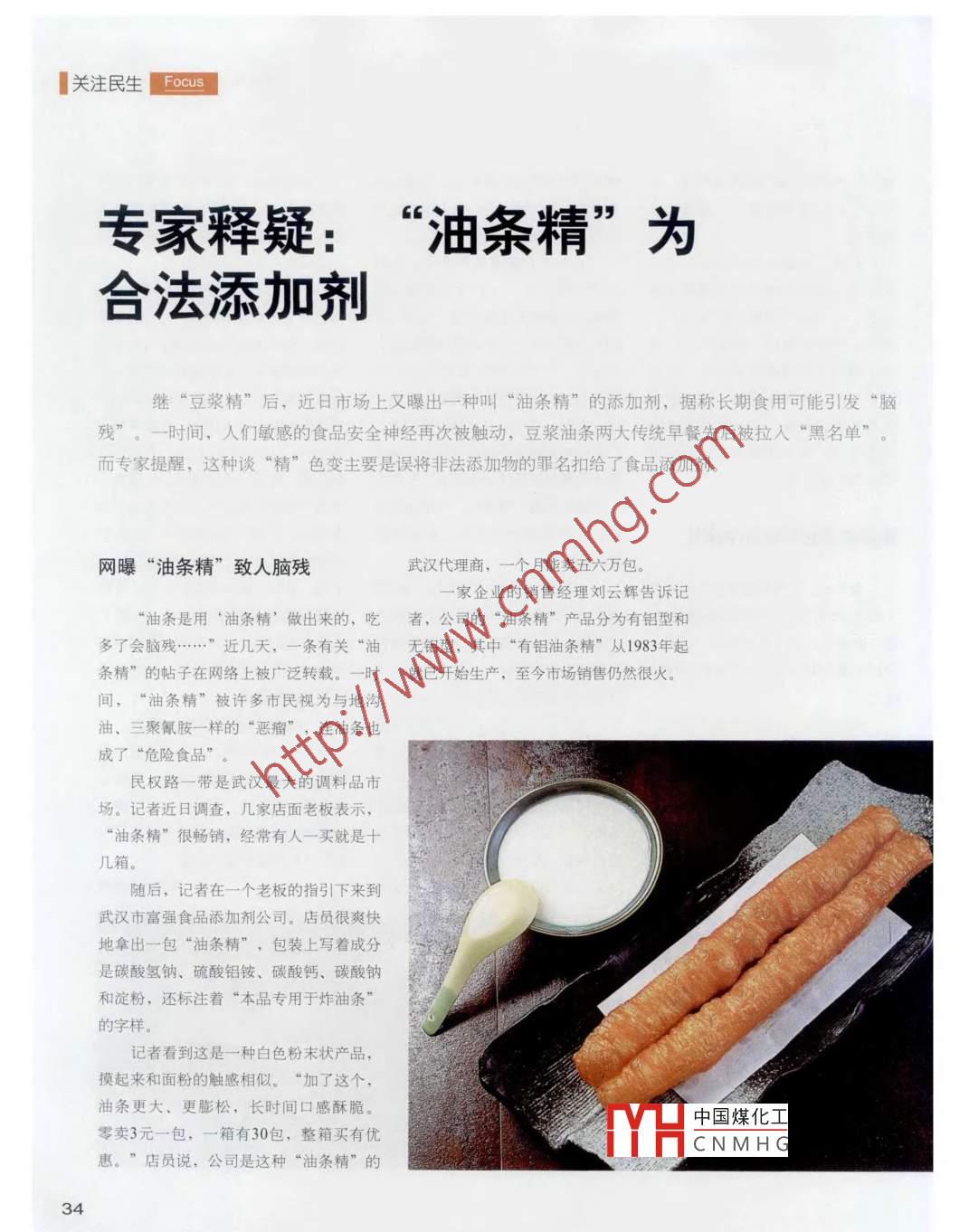 I 關(guān)注民生 Focus專家釋疑:‘ 油條精”為合法添加劑繼“豆?jié){精”后,近日市場上又曝出一種叫“油條精”的添加劑,據(jù)稱長期食用可能引發(fā)“腦殘”。一時(shí)間,人們敏感的食品安全神經(jīng)再次被觸動(dòng),豆?jié){油條兩大傳統(tǒng)早餐先后被拉入“黑名單”而專家提醒,這種談“精” 色變主要是誤將非法添加物的罪名扣給了食品添加劑。網(wǎng)曝“油條精”致人腦殘武漢代理商,一個(gè)月能賣五六萬包。-.家企業(yè)的銷售經(jīng)理劉云輝告訴記“油條是用‘ 油條精’做出來的,吃者,公司的“油條精”產(chǎn)品分為有鋁型和多了會腦殘....近幾天,一條有關(guān)“油無鋁型,其中“有鋁油條精”從1983年起條精”的帖子在網(wǎng)絡(luò)上被廣^泛轉(zhuǎn)載。時(shí)就已開始生產(chǎn),至今市場銷售仍然很火。間,“油條精”被許多市民視為與地溝油、三聚氰胺一樣的“惡瘤”,連油條也成了“危險(xiǎn)食品”民權(quán)路一帶是武漢最大的調(diào)料品市場。記者近日調(diào)查,幾家店面老板表示,“油條精”很暢銷,經(jīng)常有人一買就是十幾箱。隨后,記者在一個(gè)老板的指引下來到武漢市富強(qiáng)食品添加劑公司。店員很爽快地拿出一包“油條精”,包裝上寫著成分是碳酸氫鈉、硫酸鋁銨、碳酸鈣、碳酸鈉和淀粉,還標(biāo)注著“本品專用于炸油條”的字樣。記者看到這是一.種白色粉末狀產(chǎn)品,摸起來和面粉的觸感相似?!凹恿诉@個(gè),油條更大、更膨松,長時(shí)間口感酥脆。中國煤化工零賣3元一包,-箱有30包,整箱買有優(yōu)HCNMH G惠?!钡陠T說,公司是這種“油條精”的34