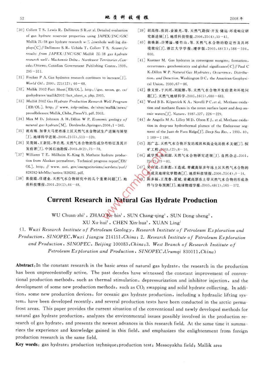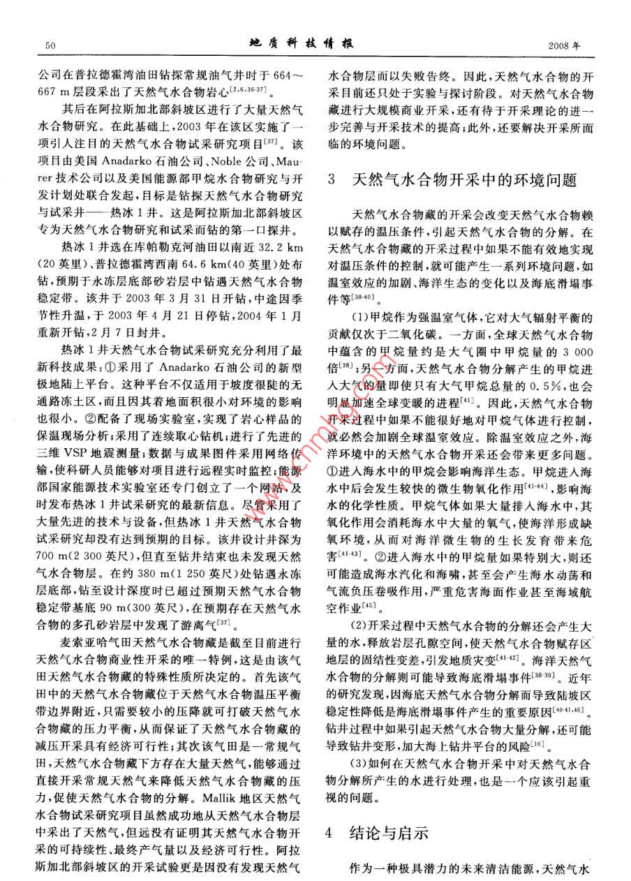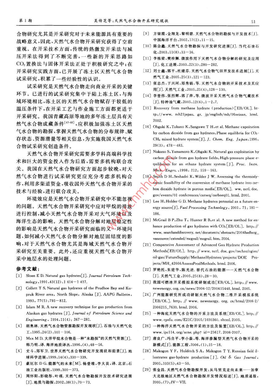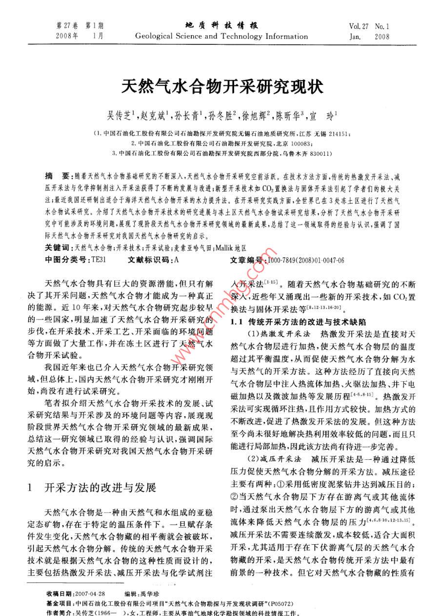 第27卷第1期地質(zhì)科技情報(bào)Vol.27 No.1Geological Science and Technology InformationJan.2008天然氣水合物開采研究現(xiàn)狀吳傳芝' ,趙克斌' ,孫長(zhǎng)青',孫冬勝“,徐旭輝2 ,陳昕華”,宣玲(1.中國(guó)石油化工股份有限公司石油勘探開發(fā)研究院無(wú)錫石油地質(zhì)研究所.江蘇無(wú)錫214151;2.中國(guó)石油化工股份有限公司石油勘探開發(fā)研究院,北京10083;3.中國(guó)石油化工股份有限公司石油勘探開發(fā)研究院西部分院,烏魯木齊830011)摘要:隨著天然氣水合物基礎(chǔ)研究的不斷深入,天然氣水合物開采研究空前活躍。在技術(shù)方法方面,傳統(tǒng)的熱激發(fā)開采法、減壓開采法與化學(xué)抑制制注入開采法獲得了不斷的發(fā)展與改進(jìn);新型開采技術(shù)如CO2置換法與固體開采法引起了學(xué)者們的極大關(guān)注;最近我國(guó)還研制出適合于海洋天然氣水合物開采的水力提升法。在開采研究實(shí)踐方面,全世界已在3處東土區(qū)進(jìn)行了天然氣水合物試采研究。介紹了天然氣水合物開采技術(shù)的研究進(jìn)展與凍土區(qū)天然氣水合物試采研究結(jié)果,分析了天然氣水合物開采研究中可能涉及的環(huán)境問(wèn)題,展現(xiàn)了現(xiàn)階段天然氣水合物開采研究領(lǐng)域的最新成果,總結(jié)了這一領(lǐng)域取得的經(jīng)驗(yàn)與認(rèn)識(shí),強(qiáng)調(diào)了國(guó)際天然氣水合物開采研究對(duì)我國(guó)天然氣水合物研究的啟示。關(guān)鍵詞:天然氣水合物;開采技術(shù);開采試驗(yàn);麥索亞哈氣田;Malik地區(qū)中圖分類號(hào):TE31文獻(xiàn)標(biāo)識(shí)碼:A文章編號(hào):000-7849(200801 0047-06天然氣水合物具有巨大的資源潛能,但只有解人開采法(-15)。隨著天然氣水合物基礎(chǔ)研究的不斷決了其開采問(wèn)題,天然氣水合物才能成為一種真正深入,近些年又涌現(xiàn)出一些新的開采技術(shù),如CO2置的能源。近10年來(lái),對(duì)天然氣水合物研究起步較早換法與固體開采法等81213.1620。的一些國(guó)家,明顯加速了天然氣水合物開采研究的1.1傳統(tǒng)開采方法的改進(jìn)與技術(shù)缺陷步伐,在開采技術(shù)、開采工藝、開采面臨的環(huán)境問(wèn)題(1)熱激發(fā)開采法熱激發(fā)開采法是直接對(duì)天等方面做了大量工作,并在凍土區(qū)進(jìn)行了天然氣水然氣水合物層進(jìn)行加熱,使天然氣水合物層的溫度合物開采試驗(yàn)。超過(guò)其平衡溫度,從而促使天然氣水合物分解為水我國(guó)近年來(lái)也已介人天然氣水合物開采研究領(lǐng)與天然氣的開采方法。這種方法經(jīng)歷了直接向天然域,但總體上,國(guó)內(nèi)天然氣水合物開采研究才剛剛開氣水合物層中注人熱流體加熱、火驅(qū)法加熱、井下電始,尚沒有進(jìn)行試采研究。筆者擬介紹天然氣水合物開采技術(shù)的發(fā)展、試磁加熱以及微波加熱等發(fā)展歷程(46.815]。熱激發(fā)開采研究結(jié)果與開采涉及的環(huán)境問(wèn)題等內(nèi)容,展現(xiàn)現(xiàn)采法可實(shí)現(xiàn)循環(huán)注熱,且作用方式較快。加熱方式的階段世界天然氣水合物開采研究領(lǐng)域的最新成果,不斷改進(jìn),促進(jìn)了熱激發(fā)開采法的發(fā)展。但這種方法總結(jié)這一研究領(lǐng)域已取得的經(jīng)驗(yàn)與認(rèn)識(shí),強(qiáng)調(diào)國(guó)際:至今尚未很好地解決熱利用效率較低的問(wèn)題,而且只天然氣水合物開采研究對(duì)我國(guó)天然氣水合物開采研能進(jìn)行局部加熱,因此該方法尚有待進(jìn)一-步完善。(2)減壓開采法減壓開采法是一種通 過(guò)降低究的啟示。壓力促使天然氣水合物分解的開采方法。減壓途徑;1開采方法的改進(jìn)與發(fā)展主要有兩種:①采用低密度泥漿鉆井達(dá)到減壓目的;②當(dāng)天然氣水合物層下方存在游離氣或其他流體天然氣水合物是一種由天然氣和水組成的亞穩(wěn)時(shí),通過(guò)泵出天然氣水合物層下方的游離氣或其他定態(tài)礦物,存在于特定的溫壓條件下。一旦賦存條流體來(lái)降低天然氣水合物層的壓19681012-1。件發(fā)生變化,天然氣水合物藏的相平衡就會(huì)被破壞,減壓開采法不需要連續(xù)激發(fā),成本較低,適合大面積引起天然氣水合物分解。傳統(tǒng)的天然氣水合物開采開采,尤其適用于存在下伏游離氣層的天然氣水合技術(shù)就是根據(jù)天然氣水合物的這種性質(zhì)而設(shè)計(jì)的,物藏的開采,是天然氣水合物傳統(tǒng)開采方法中最有主要包括熱激發(fā)開采法、減壓開采法與化學(xué)試劑注前景的一種技術(shù)。但它對(duì)天然氣水合物藏的性質(zhì)有收稿日期:2007-04 28編輯:禹華珍基金項(xiàng)目:中國(guó)石油化工股份有限公司項(xiàng)目“天然氣水合物勘探與開發(fā)現(xiàn)狀調(diào)研"(P05072)48地質(zhì)科技情報(bào)2008年特殊的要求,只有當(dāng)天然氣水合物藏位于溫壓平衡了海洋天然氣水合物開采的水力提升法([21]。水力邊界附近時(shí),減壓開采法才具有經(jīng)濟(jì)可行性。提升法是利用海底集礦系統(tǒng)對(duì)天然氣水合物進(jìn)行原(3)化學(xué)試劑注入開采法化學(xué)試劑注入開采地粉碎,采集含有固、液、氣三相的混合物質(zhì),由水力法通過(guò)向天然氣水合物層中注人某些化學(xué)試劑,如提升系統(tǒng)上傳到海面作業(yè)船