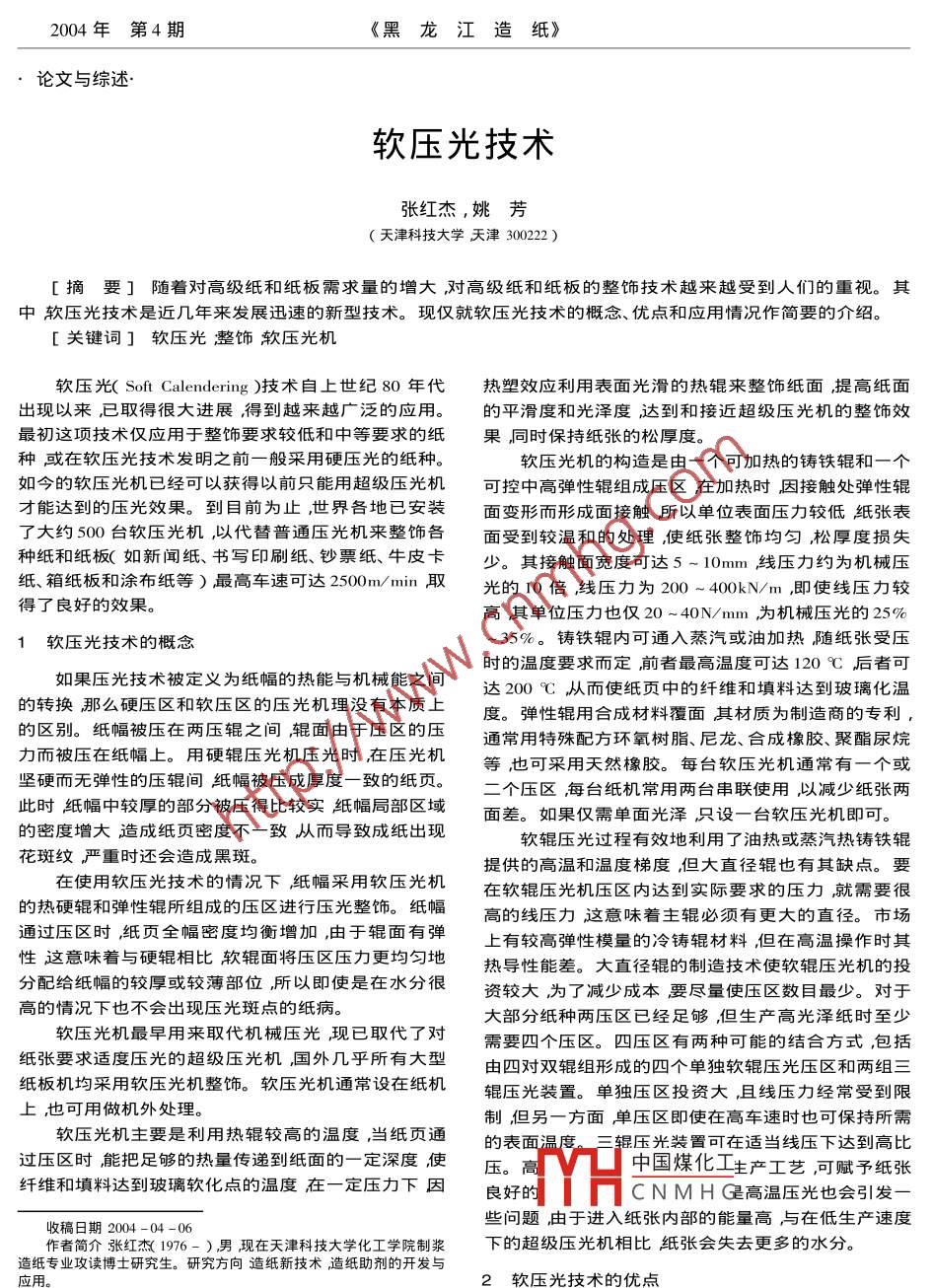 2004年第4期《黑龍江造紙》論文與綜述.軟壓光技術張紅杰,姚芳(天津科技大學天津300222 )[摘要]隨著對高級紙和紙板需求量的增大,對高級紙和紙板的整飾技術越來越受到人們的重視。其中軟壓光技術是近幾年來發(fā)展迅速的新型技術?,F(xiàn)僅就軟壓光技術的概念優(yōu)點和應用情況作簡要的介紹。[關鍵詞]軟壓光整飾軟壓光機軟壓光( Soft Calendering )技術自上世紀80年代熱塑效應利用表面光滑的熱輥來整飾紙面提高紙面出現(xiàn)以來,已取得很大進展,得到越來越廣泛的應用。的平滑度和光澤度達到和接近超級壓光機的整飾效最初這項技術僅應用于整飾要求較低和中等要求的紙果,,同時保持紙張的松厚度。種或在軟壓光技術發(fā)明之前-般采用硬壓光的紙種。軟壓光機的構造是由-個可加熱的鑄鐵輥和一個如今的軟壓光機已經可以獲得以前只能用超級壓光機可控中高彈性輥組成壓區(qū)在加熱時因接觸處彈性輥才能達到的壓光效果。到目前為止,世界各地已安裝面變形而形成面接觸所以單位表面壓力較低紙張表了大約500臺軟壓光機,,以代替普通壓光機來整飾各面受到較溫和的處理,使紙張整飾均勻,松厚度損失種紙和紙板(如新聞紙、書寫印刷紙、鈔票紙、牛皮卡少。其接觸面寬度可達5~10mm線壓力約為機械壓紙、箱紙板和涂布紙等)最高車速可達2500m/min取光的10倍,線壓力為200~400kN/m,即使線壓力較得了良好的效果。高其單位壓力也僅20 ~40N/mm為機械壓光的25%1軟壓 光技術的概念~35%。鑄鐵輥內可通入蒸汽或油加熱隨紙張受壓如果壓光技術被定義為紙幅的熱能與機械能之間時的溫度要求而定前者最高溫度可達120 9C后者可的轉換那么硬壓區(qū)和軟壓區(qū)的壓光機理沒有本質上達200C,從而使紙頁中的纖維和填料達到玻璃化溫度。彈性輥用合成材料覆面其材質為制造商的專利的區(qū)別。紙幅被壓在兩壓輥之間,輥面由于壓區(qū)的壓通常用特殊配方環(huán)氧樹脂、尼龍、合成橡膠、聚酯尿烷力而被壓在紙幅上。用硬輥壓光機壓光時在壓光機等,也可采用天然橡膠。每臺軟壓光機通常有一個或堅硬而無彈性的壓輥間紙幅被壓成厚度一致的紙頁。二個壓區(qū)每臺紙機常用兩臺串聯(lián)使用以減少紙張兩此時紙幅中較厚的部分被壓得比較實紙幅局部區(qū)域面差。如果僅需單面光澤只設一臺軟壓光機即可。.的密度增大造成紙頁密度不-致從而導致成紙出現(xiàn)軟輥壓光過程有效地利用了油熱或蒸汽熱鑄鐵輥花斑紋嚴重時還會造成黑斑。提供的高溫和溫度梯度,但大直徑輥也有其缺點。在使用軟壓光技術的情況下紙幅采用軟壓光機在軟輥壓光機壓區(qū)內達到實際要求的壓力就需要很的熱硬輥和彈性輥所組成的壓區(qū)進行壓光整飾。紙幅高的線壓力這意味著主輥必須有更大的直徑。市場通過壓區(qū)時,紙頁全幅密度均衡增加,由于輥面有彈上有較高彈性模量的冷鑄輥材料,但在高溫操作時其性這意味著與硬輥相比軟輥面將壓區(qū)壓力更均勻地熱導性能差。大直徑輥的制造技術使軟輥壓光機的投分配給紙幅的較厚或較薄部位,所以即使是在水分很資較大為了減少成本要盡量使壓區(qū)數(shù)目最少。對于高的情況下也不會出現(xiàn)壓光斑點的紙病。大部分紙種兩壓區(qū)已經足夠,但生產高光澤紙時至少軟壓光機最早用來取代機械壓光現(xiàn)已取代了對需要四個壓區(qū)。四壓區(qū)有兩種可能的結合方式,包括紙張要求適度壓光的超級壓光機國外幾乎所有大型由四對雙輥組形成的四個單獨軟輥壓光壓區(qū)和兩組三紙板機均采用軟壓光機整飾。軟壓光機通常設在紙機輥壓光裝置。單獨壓區(qū)投資大,且線壓力經常受到限上,也可用做機外處理。制但另一方面單壓區(qū)即使在高車速時也可保持所需軟壓光機主要是利用熱輥較高的溫度,當紙頁通的表面溫度。三輥壓光裝置可在適當線壓下達到高比過壓區(qū)時能把足夠的熱量傳遞到紙面的一定深度,使壓。高中國煤化工生產工藝,可賦予紙張纖維和填料達到玻璃軟化點的溫度在一定壓力下因良好的YHCNMHG高溫壓光也會引發(fā)一些問題,由于進入紙張內部的能量高與在低生產速度收稿日期2004 -04 -06作者簡介張紅杰( 1976- )男現(xiàn)在天津科技大學化工學院制漿下的超級壓光機相比紙張會失去更多的水分。造紙專業(yè)攻讀博士研究生。研究方向造紙新技術造紙助劑的開發(fā)與應用。2軟壓 光技術的優(yōu)點一22-軟壓光技術-般來說壓光的效果受到如下參數(shù)的影響輥子有受到損傷紙頁的強度沒有損失。溫度、紙幅溫度、壓區(qū)壓力、紙幅在壓區(qū)中的停留時間、現(xiàn)代化紙機的實際車速已超過1600m/ min ,設計壓區(qū)數(shù)量等。它們對壓光的影響可以歸納為以下幾車速一般也在1800m/min左右。機內涂布生產線車點:1、由于壓區(qū)溫度、壓區(qū)壓力、停留時間的增加以及速也超過了1400m/min。 目前軟輥壓光的速度可達壓區(qū)數(shù)量的增加,可得到較高的平滑度、密度及光澤1500m/min比目前超級壓光機的最高車速(1150m/度。2、采用高溫壓光可取得均勻的平滑度而壓區(qū)壓力min)要高所以可在紙機車速條件下在線應用軟輥壓可大大降低。3、對于未涂布紙,無論采用高溫或低溫光。軟壓光機是一種用途廣效率高經濟實惠的壓光壓光,使紙幅具有一定的密度對于達到一定