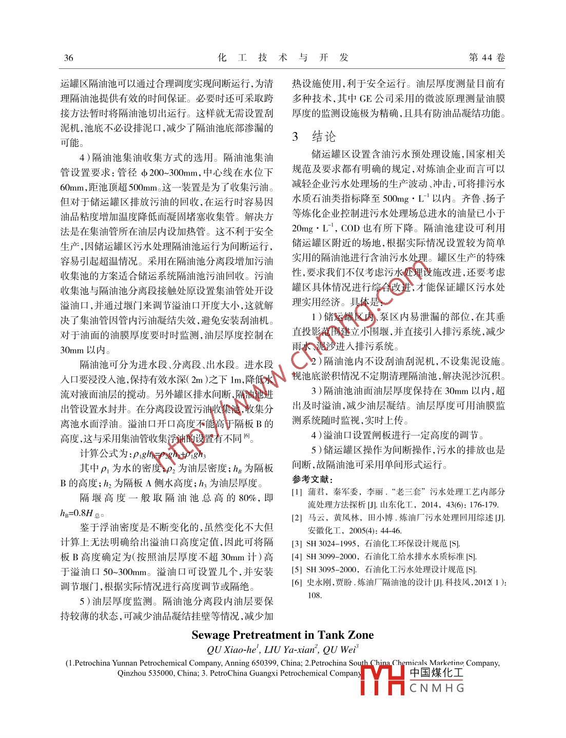 第44卷第1期化工技術(shù)與開(kāi)發(fā)Vol.44 No.12015年1月Technology & Development of Chemical IndustryJan.2015環(huán)保與三廢利用儲(chǔ)罐區(qū)的污水預(yù)處理屈曉禾',劉亞賢,屈威3( 1.中石油云南石化有限公司,云南安寧650399; 2.中國(guó)石油華南化工銷(xiāo)售公司欽州調(diào)運(yùn)分公司,廣西欽州535000;3.中國(guó)石油天然氣集團(tuán)公司廣西石化公司儲(chǔ)運(yùn)中心,廣西欽州535008 )摘要: 煉油企業(yè)生產(chǎn)過(guò)程中產(chǎn)生的污水有- -部分來(lái)自?xún)?chǔ)運(yùn)系統(tǒng)的罐區(qū),大多為儲(chǔ)罐切水與機(jī)泵冷卻水等。這部分污水部分污染物控制指標(biāo)超標(biāo),未經(jīng)處理排人污水處理場(chǎng)會(huì)造成沖擊,生物處理裝置運(yùn)行不正常,為此有必要對(duì)儲(chǔ)運(yùn)罐區(qū)污水進(jìn)行預(yù)處理。儲(chǔ)運(yùn)系統(tǒng)的污水預(yù)處理各企業(yè)不盡相同,這就有必要從排污水的性質(zhì)、排放環(huán)境、處理方法等方面進(jìn)行全面分析,確定出有效的方式,使污水排放達(dá)標(biāo)。關(guān)鍵詞:污水預(yù)處理;隔油池;規(guī)范;化學(xué)需氧量;堰門(mén);油膜監(jiān)測(cè)系統(tǒng)中圖分類(lèi)號(hào): X703.文獻(xiàn)標(biāo)識(shí)碼: B文章編號(hào): 1671-9905(2015)01-0034-03國(guó)內(nèi)煉油企業(yè)污水處理典型的工藝為:隔油-水組成。儲(chǔ)罐切水為生產(chǎn)污水主要組成,它的排量浮選-生化處理"。治理程度達(dá)到二級(jí)處理,污水大小源于上游來(lái)量,陸上油田來(lái)的原油含水量較大,就可達(dá)標(biāo)排放12。但裝置或單元的排污水中,含有經(jīng)由海運(yùn)進(jìn)口原油含水量較低。罐區(qū)初期雨水(即特殊的物質(zhì),如酸、堿、硫化物、有機(jī)物、懸浮物以及污染雨水胺照降水5~10min(即15~30mm降水深度)石油類(lèi)等物質(zhì),濃度超標(biāo)且變化頻繁,直接排人系統(tǒng)水深與污染面積(一般為罐區(qū)圍堰內(nèi)地表面積)的乘管網(wǎng),不利于污染物的去除,并會(huì)造成治理不經(jīng)濟(jì)。積計(jì)算。機(jī)泵冷卻水(儲(chǔ)運(yùn)系統(tǒng)很少有)與儲(chǔ)罐清洗對(duì)于儲(chǔ)運(yùn)罐區(qū)而言,儲(chǔ)罐的切水等工作在時(shí)間上、排水及臨時(shí)檢修處置管線產(chǎn)生的排放物及污水按未預(yù)放量上等都具有不確定性。因此,在罐區(qū)單元內(nèi)進(jìn)見(jiàn)污水量計(jì)算,即系統(tǒng)總排水量的15%~-20%。行污水的預(yù)處理,可為污水處理場(chǎng)穩(wěn)定生產(chǎn)、企業(yè)排1.2儲(chǔ)運(yùn)罐區(qū)排污要求與采用的預(yù)處理設(shè)施放達(dá)標(biāo)創(chuàng)造有力的條件。《石油化工環(huán)保設(shè)計(jì)規(guī)范》B)1中規(guī)定:含污染物1儲(chǔ)運(yùn)罐區(qū)的污水排放情況及要求濃度較高的污水或影響集中處理效果的污水,應(yīng)進(jìn)行預(yù)處理,經(jīng)過(guò)處理后的污水水質(zhì)應(yīng)滿(mǎn)足污水集中1.1儲(chǔ)運(yùn)罐區(qū)污水構(gòu)成與排污水量煉油企業(yè)儲(chǔ)運(yùn)罐區(qū)排污水主要是儲(chǔ)罐的切水、處理設(shè)施進(jìn)水要求。這就明確了儲(chǔ)運(yùn)罐區(qū)排放的濃度較高的污水必須進(jìn)行預(yù)處理,達(dá)標(biāo)后方可排入水儲(chǔ)罐清洗用水、機(jī)泵區(qū)冷卻水。此外還有罐區(qū)圍堰處理系統(tǒng)管網(wǎng)中?!妒突そo水排水水質(zhì)標(biāo)準(zhǔn)》4內(nèi)初期雨水、機(jī)泵檢維修時(shí)管路、泵體內(nèi)置換排放中規(guī)定:裝置或單元的生產(chǎn)污水排入生產(chǎn)污水管網(wǎng)水、罐區(qū)臨時(shí)檢修處理管路排放等。(下游有除油設(shè)施時(shí)),其主要污染物濃度應(yīng)符合: pH罐區(qū)排污現(xiàn)狀是:輕質(zhì)油品如汽柴航煤、苯類(lèi)及值6~9,石油類(lèi)≤500mg. L',水溫≤40C。同時(shí)其中間原料儲(chǔ)罐都已實(shí)現(xiàn)了自動(dòng)二次脫水技術(shù),解決全廠性污水處理場(chǎng)總進(jìn)水水質(zhì)要求為:pH值6~9,了儲(chǔ)罐切水大量帶油的問(wèn)題。重質(zhì)油品如原油渣油、石油類(lèi)≤500mg. L', COD≤800mg. L' ,硫化物油漿及其中間原料儲(chǔ)罐、打線罐等由于其密度與水接≤10mg.L~ ,水溫≤40%。近,凝點(diǎn)較高,自動(dòng)脫水設(shè)施使用上不盡人意,而效果作為儲(chǔ)罐區(qū)的污水預(yù)處理設(shè)施,目前儲(chǔ)運(yùn)系統(tǒng)好的脫水設(shè)施因價(jià)格過(guò)高無(wú)法廣泛使用。因此此類(lèi)有油水收集使用旋流分離器分離方式和采取設(shè)置隔儲(chǔ)罐的切水工作很多情況下仍為人工操作,隨之而來(lái)油池方式。旋流分離器國(guó)內(nèi)產(chǎn)品使用效果不理想。的是油品濃度較高的排污水進(jìn)人污水系統(tǒng)中。為保證罐區(qū)污水指標(biāo),從經(jīng)罐區(qū)排污水由生產(chǎn)污水、初期雨水、未可預(yù)見(jiàn)污濟(jì)性、資金投入中國(guó)煤化工息,裝置或TYHCNMHG收稿日期: 2014-11-11第1期屈曉禾等:儲(chǔ)罐區(qū)的污水預(yù)處理3:單元通用的設(shè)置隔油池作為儲(chǔ)運(yùn)罐區(qū)污水預(yù)處理設(shè)水、污水、預(yù)處理站運(yùn)行增添麻煩?;诖?國(guó)內(nèi)新施是最合適的。建煉油企業(yè)已經(jīng)采取將罐區(qū)內(nèi)易產(chǎn)生污染的部位,從全廠性污水處理場(chǎng)總進(jìn)水水質(zhì)控制指標(biāo)看,