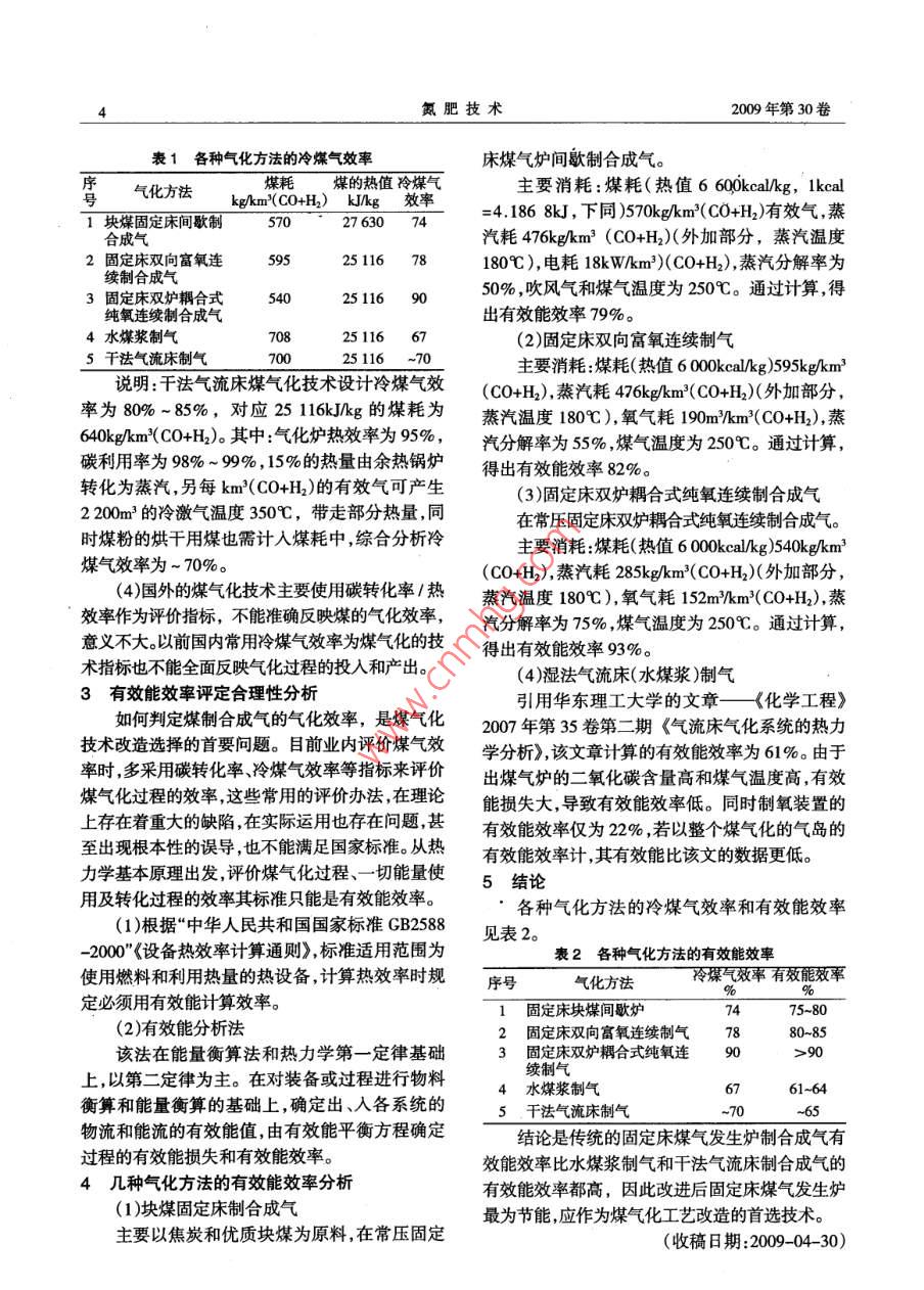 2009年第30卷第3期氮肥技術煤氣化過程氣化效率分析詹俊懷尤彪(福建三鋼集團三明化工有限責任公司365000)摘要簡要介紹用有效能效率分析各種煤氣化方法的氣化效率,結論是固定床煤氣化爐的有效能效率高,固定床煤氣發(fā)生爐為煤氣化工藝節(jié)能的首選技術。關鍵詞煤氣化有效能效率‘分析1前言過程的投入和產(chǎn)出,從而使各種煤氣化方法的比煤氣化是煤潔凈利用核心技術。目前,全國較成為可能。用于煤氣化的煤炭的數(shù)量在2 x 10%/a左右,僅次(1)碳轉化率于發(fā)電和鋼鐵工業(yè)。煤氣化技術是煤炭高效率、碳轉化率,是用進入合成氣的碳元素量占原低成本利用和碳減排的技術起點,我國缺油少氣料煤中碳元素總量的百分數(shù)來表示的。碳轉化率多煤,同時煤的質(zhì)量較好,多為煙煤、無煙煤等利反映氣化過程煤中的碳反應的完全程度,在煤氣用價值高的煤種,加之勞動力豐富,煤開采成本化過程要求得到的是有效氣氫和一氧化碳,若轉低。因此在煤高效利用上取得突破,對我國穩(wěn)定、化為二氧化碳則不僅無益而且有害。同時不同煤可靠持續(xù)的能源供應具有決定性的意義。氣化方法得到的氣體組份中的氫和一氧化碳含中國煤氣化技術以固定床間歇氣化技術為量也有較大的區(qū)別,因此碳轉化率的高低和有效主,也開發(fā)了一些新的煤氣化技術,但技術成熟氣消耗的碳的數(shù)量完全沒有對應關系。碳轉化率性較差,經(jīng)濟效益不理想。固定床間歇煤氣化技用于評價煤氣化效率沒有意義;術由于自身的缺陷,其發(fā)展已受到限制。目前煤(2)熱效率氣化技術已發(fā)展到關鍵時刻,由福建三鋼集團三根據(jù)熱力學第- -定律原理評價效率。其實質(zhì)明化工有限責任公司提出的富氧連續(xù)氣化改進是通過物料與能量的衡算分析能量轉化利用及方案,在固定床間歇煤氣化技術的基礎上,開發(fā)損失情況,確定過程進、出的能量數(shù)量,求出熱量了具有自主知識產(chǎn)權的“固定床單爐雙向富氧連利用率,其不足在于:續(xù)氣化技術和固定床雙床層耦合富氧連續(xù)氣化①熱力學第一定律方程說明各種能量可以技術”,具有顯著的綜合效益和重大的戰(zhàn)略意義,互相轉化,但從熱效率上看,熱轉化為功是有限該技術可以對目前國內(nèi)主流煤氣化技術在主要的,而且不能指出各種能量轉化的方向和限度;消耗指標方面得到較大的改進?,F(xiàn)從有效能效率②從能量級別可知,能量不但有大小之分,來分析各種煤氣化的氣化效率。還有品位的區(qū)別,能量衡算法只反映了能量數(shù)量2傳統(tǒng)煤氣化效率評定的缺陷的關系,沒有反映能量品位的高低。目前國內(nèi)煤氣化技術評價標準主要有以下此方法只能反映能量的損失,但不能指出得指標:可靠性、系統(tǒng)運行穩(wěn)定性、大型化即單爐生到的這部分能量的利用價值。其得出的評價結論產(chǎn)能力、煤種適應性、污染物的排放、氣化效率具有極大地誤導性,例如室內(nèi)空氣電加熱器,根等。其中氣化效率是核心指標,目前通用的評價據(jù)此方法計算出的熱效率為100%,而根據(jù)有效氣化效率的指標有:碳轉化率、熱量利用率、冷煤能效率來計算出其效率幾乎為零。氣效率等。由于煤氣化的方法多種多樣,有常壓、(3)冷煤氣效率加壓、富氧、純氧等不同方式,運用這些指標來評冷煤氣效率為煤氣化生成煤氣的化學能與價,都不能全面反映煤氣化的真實投入和產(chǎn)出,氣化用煤的化學能之比。各種氣化方法的冷煤氣因此需要一個綜合性的指標來全面反映煤氣化效率見表1。氮肥技術2009年第30卷4表1各種氣化方法的冷煤氣效率床煤氣爐間歇制合成氣。煤耗煤的熱值冷煤氣主要消耗:煤耗(熱值6 600kcal/kg, 1keal序氣化方法kglkm'(C0+H) J/kg 效率號=4.186 8kJ,下同)570kgkm2(C0+H2)有效氣,蒸1塊煤固定床間歇制57027 63074汽耗476kgkm' (CO+H2)(外加部分,蒸汽溫度合成氣2固定床雙向富氧連25 11678180C),電耗18kWkm?)(CO+H2),蒸汽分解率為續(xù)制合成氣54025116 9050% ,吹風氣和煤氣溫度為250C。通過計算,得3固定床雙爐耦合式出有效能效率79%。純氧連續(xù)制合成氣4水煤漿制氣70825116 67(2)固定床雙向富氧連續(xù)制氣5干法氣流床制氣700~70主要消耗:煤耗(熱值6 0keal/k )595kgkm’'說明:干法氣流床煤氣化技術設計冷煤氣效(CO+H2),蒸汽耗476kg/km?(CO+H)(外加部分,率為80% ~85%,對應25 116kJ/kg的煤耗為蒸汽溫度180C), 氧氣耗190m"'km?(CO+H2),蒸640kg/km*(CO+H2)。其中:氣化爐熱效率為95%,汽分解率為55% ,煤氣溫度為250C。通過計算,碳利用率為98% ~ 9% , 15%的熱量由余熱鍋爐得出有效能效率82%。轉化為蒸汽,另每km2(CO+H2)的有效氣可產(chǎn)生(3)固定床雙爐耦合式純氧連續(xù)制合成氣2 200m'的冷激氣溫度350C,帶走部分熱量,同在常壓固定床雙爐耦合式純氧連續(xù)制合成氣。時煤粉的烘干用煤也需計入煤耗中,綜合分析冷主要消耗:煤耗(熱值6 00kcal/kg)540kg/km'煤氣效率為~ 70%。(CO+H2),蒸汽耗285kg/km?(CO+H2)(外加部分,(4)國外的煤氣化技術主要使用碳轉化率/熱蒸汽溫度180C),氧氣耗152m/km'(CO+H2),蒸效率作為評價指標,不能準確反映煤的氣化效率,汽分解率為75% ,煤氣溫度為250C。通過計算, .意義不大。以前國內(nèi)常用冷煤氣效率為煤氣化的技得出有效能效率93%。術指標也不能全面反映氣化過程的投入和產(chǎn)出。(4)濕法氣流床(水煤漿)制氣3有效能效