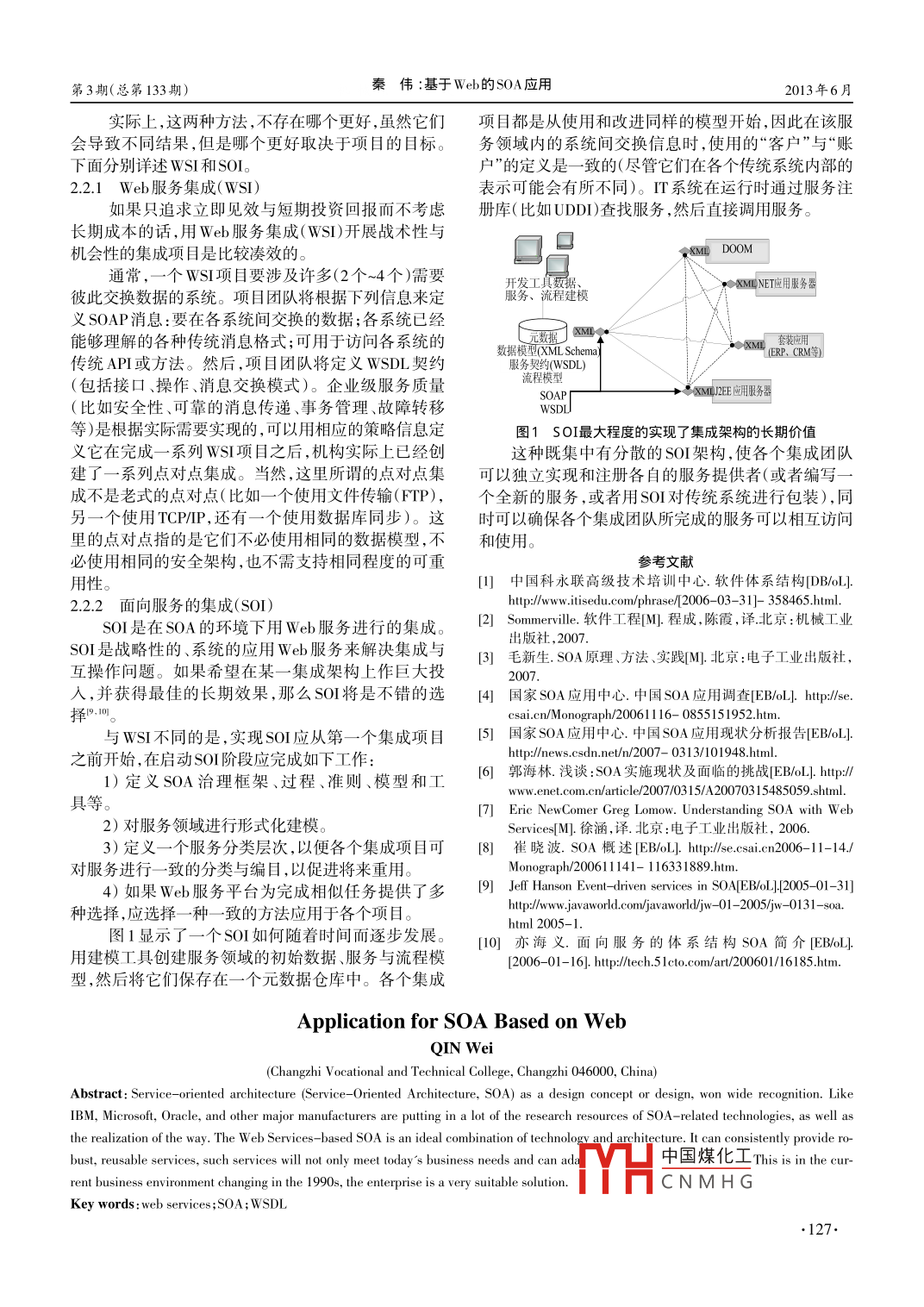 第3期(總第133期)機(jī)械管理開發(fā)013年6月No.3(SUM No 133)MECHANICAL MANAGEMENT AND DEVELOPMENTJun.2013基于Web的SOA應(yīng)用秦偉(長治職業(yè)技術(shù)學(xué)院,山西長治046000摘要:面向服務(wù)的構(gòu)架( Service- Oriented Architecture SoA)作為一種設(shè)計思想或者設(shè)計方式獲得了廣泛的認(rèn)可。像IBM、 Microsoft、 Oracle等各大廠商都投入大量的資源研究SOA的相關(guān)技術(shù)以及實現(xiàn)方式?;?Web services的SOA是一種理想的構(gòu)架與技術(shù)的組合。它可以始終如一地提供健壯的、可重用的服務(wù)這樣的服務(wù)不但可以滿足如今的業(yè)務(wù)需求而且可以適應(yīng)不斷變化的業(yè)務(wù)需求。這在當(dāng)前業(yè)務(wù)環(huán)境不斷變化的年代中對于企業(yè)來說是非常合適的一種解決方案關(guān)鍵詞: Web services soa,WSDL中圖分類號:TP315文獻(xiàn)標(biāo)識碼:A文章編號:1003-773X(2013)03-0125-030引言如果某組織將其T架構(gòu)抽象出來,將其功能以粗粒度在全球范圍內(nèi),面向服務(wù)的架構(gòu)(SOA)正成為未的服務(wù)形式表示出來,每種服務(wù)都清晰地表示其業(yè)務(wù)來企業(yè)軟件架構(gòu)的趨勢。在國內(nèi),雖然近幾年來關(guān)于價值,那么,這些服務(wù)的顧客(可能在公司內(nèi)部,也可能SOA的報道經(jīng)常見諸各種媒體,但對SOA的研究還處是公司的某個業(yè)務(wù)伙伴)就可以得到這些服務(wù),而不必于起步階段??紤]其后臺實現(xiàn)的具體技術(shù)。更進(jìn)一步,如果顧客能《信息周刊》和埃森晢公司通過對中國上千家企業(yè)夠發(fā)現(xiàn)并綁定可用的服務(wù),那么在這些服務(wù)背后的T機(jī)構(gòu)的問卷調(diào)查,了解在商業(yè)科技推動企業(yè)競爭力及系統(tǒng)能夠提供更大的靈活性商業(yè)創(chuàng)新的背景下,中國企業(yè)部署SOA的現(xiàn)狀和未來2S0A與WEB集成的趨勢。調(diào)查的結(jié)果顯示":擁有SOA應(yīng)用的企業(yè)占2.1關(guān)于集成88%,在大中型企業(yè)中,這個比例是10%,四分之三的集成所要解決的是不同系統(tǒng)在業(yè)務(wù)與集成需求上被調(diào)查企業(yè)未對SOA采取任何行動。然而在較早開多個方面的差異,而且這些系統(tǒng)一般是由不同開發(fā)團(tuán)始SOA部署的企業(yè)中,60%的大中型企業(yè)和超過一半隊、采用不同技術(shù)、為解決不同業(yè)務(wù)問題而開發(fā)的。的小型企業(yè)都表示他們將增加在SOA上的投入。數(shù)2.1.導(dǎo)致集成問題的業(yè)務(wù)驅(qū)動據(jù)表明,SOA在中國尚處于應(yīng)用啟蒙階,但企業(yè)在SOA我們先來看一些常見的、導(dǎo)致集成問題的業(yè)務(wù)驅(qū)的投入?yún)s在快速增加。動,以及機(jī)構(gòu)為什么要在SOA與Web服務(wù)上進(jìn)行投入1關(guān)鍵技術(shù)1)兼并與收購。兼并與收購( Merger and Acquisi1.1SOA介紹tion,簡稱M&A)活動常常造成“有多個T系統(tǒng)可以處面向服務(wù)構(gòu)架( Service- Oriented Architecture,理相似事務(wù)”的局面,而要體現(xiàn)M&A的商業(yè)價值,就必SOA)是一種設(shè)計思想,它指導(dǎo)業(yè)務(wù)服務(wù)( business ser須對這些T系統(tǒng)加以合并。ices)的創(chuàng)建和使用的各個方面,同時也定義和提供了2)內(nèi)部重組。盡管內(nèi)部重組所產(chǎn)生的影響不如種具有一定特征的I基礎(chǔ)設(shè)施。面向服務(wù)SOA)與兼并與收購(M&A)那樣巨大,但也造成了許多相同的其說是一種技術(shù),倒不如說是一種思維方式,它是一項問題,而且出現(xiàn)頻率更高。大膽的基礎(chǔ)架構(gòu)變革,通過技術(shù)和協(xié)同工作實現(xiàn)了文3)應(yīng)用/系統(tǒng)合并。如果相視的事務(wù)可被多個化變遷。如今,很多CIO都感受到了SOA的熱度,福布系統(tǒng)處理,那么需要通過合并或替換,以節(jié)省資金、減斯500強(qiáng)中的大部分企業(yè)也都在考慮實施SOA方案。少人數(shù),使業(yè)務(wù)操作運行更加流暢。1.2 Web services介紹4)不一致重復(fù)/零散的數(shù)據(jù)。有時,重要的業(yè)務(wù)Web services是SOA思想在改進(jìn)DCOM和 CORBA數(shù)據(jù)被分布于多個系統(tǒng)上,必須將它們加以合并和過缺點上的努力。今天應(yīng)用 Web services的面向服務(wù)架濾才能有助于決策。構(gòu)與過去不同的特點就在于它們是基于標(biāo)準(zhǔn)以及松散5)新業(yè)務(wù)戰(zhàn)略。創(chuàng)新型公司經(jīng)營要根據(jù)變化的耦合的。廣泛接受的標(biāo)準(zhǔn)(如XML和SOAP)提供了在業(yè)務(wù)環(huán)境貫徹新的業(yè)務(wù)戰(zhàn)略,這就要求各個T系統(tǒng)更各不同廠商解決方案之間的交互性;而松散耦合將分高以嶄新的方式一同工作。最終,同行業(yè)的其他公司布計算中的參與者隔離開來,交互兩邊某一方的改動也必須做出同樣的改變才能保持競爭力。并不會影響到另一方6)使業(yè)務(wù)流程流暢。在過去的業(yè)務(wù)流程中,數(shù)據(jù)SOA的強(qiáng)大和靈活性將給企業(yè)帶來巨大的好處。常常是手工中國煤化今,這些系統(tǒng)往收稿日期:2013-01-29HECNMHG作者簡介:秦偉(1979-)男山西長治人助教本科研究方向為計算機(jī)應(yīng)用技術(shù)125第3期(總第13期)機(jī)械管理開發(fā)2013年6月往都需要被新的支持“不需人工干預(yù)便可進(jìn)行多系統(tǒng)關(guān)鍵問題涉及在應(yīng)用數(shù)據(jù)和消息間做相互轉(zhuǎn)換,轉(zhuǎn