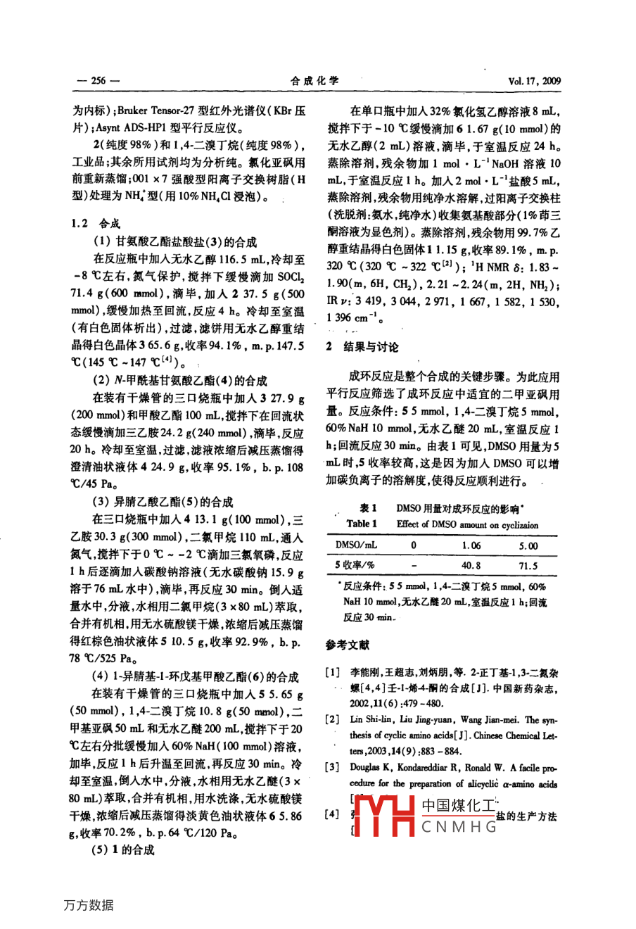 2009年第17卷合成化學(xué)Vol.17, 2009第2期, 255 ~256Chinese Joumal of Synthetic ChemistryNo.2, 255 ~256●研究簡報.環(huán)亮氨酸的合成高仁孝'2,何永梁”,沈?qū)?1.西安瑞聯(lián)近代電子材料有限公司,陜西安710065; 2.西安建筑科技大學(xué)理學(xué)院,陜西西安710055)摘要:以甘氨酸為起始原料,經(jīng)酯化、酰胺化、脫水、成環(huán)及水解5步反應(yīng)后,過陽離子交換柱合成了環(huán)亮氨酸,總收率52% ,其結(jié)構(gòu)經(jīng)' H NMR和IR確證。關(guān)鍵詞:甘氨酸;環(huán)亮氨酸;成環(huán);合成中圖分類號: 0623. 736文獻標識碼: A文章編號: 10-511200202552Synthesis of CycloleucineGAO Ren-xiao'2,HE Yong-liang',SHEN Nin'(1. Xi' an Ruilian Modem Electronic Materials Co. Id, Xi' an 710065, China;2. School of science , Xi' an University of Architecure & Technology, Xi' an 710055, China)Abstract: Cycloleucine in total yield of 52% was synthesized from glycine by a five step reacton ofesterification, amidation, dehydration , cyclization and hydrolysis, and then treated with cationic ion-exchange resin. The structure was confirmed by 'H NMR and IR.Keywords: glycine; cycloleucine; cyclization; synthesis環(huán)亮氨酸(1),化學(xué)名為1-氨基-1-環(huán)戍基甲NH2 EOH NH.HCloHH酸。文獻"方法以環(huán)戊酮為起始原料,與氰化鉀和碳酸銨反應(yīng)制得乙內(nèi)酰脲5~螺環(huán)戊烷,然后在CO2H SOcl2 CO2EtEy,NCO2Et堿性條件下水解制得1。該方法雖然步驟短,但2用到了劇毒的氰化鉀,對環(huán)境危害及大,而且對操POCl,/EB,N *N≈C~L Brr -Br/NaHVN=C~作人員的人身安全存也在巨大威脅。CH2ChDMSO/EqO本文改進文獻[2.3]方法,以甘氨酸(2)為起始5原料,經(jīng)酯化酰胺化、脫水、Perkin脂環(huán)合成及水1. HCVEIOH; 2. NaOH slutio;NH2解反應(yīng)后,過陽離子交換柱合成了1(Scheme 1),3. 00 x7 eationic ion exchange resinXCO,H總收率52% ,其結(jié)構(gòu)經(jīng)'H NMR和IR確證。進行1Scheme 1酯化反應(yīng)時,以SOCI代替氯化氫氣體,將兩相反應(yīng)變?yōu)閱蜗喾磻?yīng),縮短了反應(yīng)時間,提高了酯化1實驗部分率。采用國產(chǎn)的001 x7強酸型陽離子交換樹脂代替了價格昂貴的Dowex-50樹脂,且可重復(fù)利1.1 儀器與試劑用,降低了成本。該方法避免了使用有劇毒的氰津島DSC-60型熔點儀(溫度計未校正);化鉀,且原料易得,副產(chǎn)物少,易純化。BukerAv-300型核磁共振儀(D20作溶劑,TMS中國煤化工收稿日期: 2008-0906.C.HCNMHG作者簡介:高仁孝(1958- ) ,男,漢族,遼寧金州人,教授,主要從事物理化子的時元。通訊聯(lián)系人:何水梁, E mail: beyongiang0403@ 163. com合成化學(xué)Vol. 17, 2009為內(nèi)標) ;Bruker Tensor-27型紅外光譜儀( KBr壓在單口瓶中加入32%氯化氫乙醇溶液8 ml,片) ;Asynt ADS-HP1型平行反應(yīng)儀。攪拌下于-10 C緩慢滴加61. 67 g( 10 mmol)的2(純度98% )和1,4-二溴丁烷(純度98%),無水乙醇(2 mL)溶液,滴畢,于室溫反應(yīng)24 h。工業(yè)品;其氽所用試劑均為分析純。氯化亞砜用蒸除溶劑,殘余物加1 mol ●L'NaOH溶液10前重新蒸餾;001 x7強酸型陽離子交換樹脂(HmL,于室溫反應(yīng)1h。加入2 mol.L" '鹽酸5 mL,型)處理為NH型(用10% NH,Cl浸泡)。蒸除溶劑,殘余物用純凈水溶解,過陽離子交換柱(洗脫劑:氨水,純凈水)收集氨基酸部分(1%茚三1.2 合成酮溶液為顯色劑)。蒸除溶劑,殘氽物用99.7%乙(1)甘氨酸乙酯鹽酸鹽(3)的合成在反應(yīng)瓶中加入無水乙醇116. 5 mL,冷卻至醇重結(jié)晶得白色固體1 1. 15 g,收率89.1%, m. p.-8C左右,氮氣保護,攪拌下緩慢滴加SOCl,320 C(320 C ~322 C叫); 'H NMR 8: 1.83~71.4 g(600 mmol),滴畢,加入2 37.5 g(5001.90(m, 6H, CH2), 2.21 ~2.24(m, 2H, NH2);mmol) ,緩慢加熱至回流,反應(yīng)4 h。冷卻至室溫IRv: 3419, 3044, 2971, 1 667, 1 582, 1 530,1 396 cm-'。(有白色固體析出) ,過濾,濾餅用無水乙醇重結(jié)晶得白色晶體3 65.6 g,收率94.1%, m. p.147.52結(jié)果與討論C(145 C~147 C川)。(2) N-_甲?;拾彼嵋阴?4)的合成成環(huán)反應(yīng)是整個合成的關(guān)鍵步驟。為此應(yīng)用在裝有干燥管的三口燒瓶中加人327.9 g平行反應(yīng)篩選了成環(huán)反應(yīng)中適宜的二甲亞砜用(200 mmol)和甲酸乙酯100 mL,攪拌下在回流狀量。反應(yīng)條件: 55 mmol, 1 ,4-二溴丁烷5 mmol,態(tài)緩慢滴加三乙胺24.2 g( 240 mmol) ,滴畢,反應(yīng)60% NaH 10 mmol,無水乙醚20 mL,室溫反應(yīng)120h。冷卻至室溫,過濾,濾液濃縮后減壓蒸餾得h;回流反應(yīng)30 min。由表1可見,DMSO用量為5澄清油狀液體424.9 g,收率95.1%, b.p. 108mL時,5收率較高,這是因為加人DMSO可以增C/45 Pa。加碳負離子的溶解度,使得反應(yīng)順利進行。(3)異腈乙酸乙酯(5)的合成表1 DMSO 用量對成環(huán)反應(yīng)的影響"在三口燒瓶中加入4 13.1 g( 100 mmol),三Table 1Effect of DMSO amount on cyclizaion乙胺30.3 g(300 mmol),二氯甲烷110 mL,通入DMSO/mL1.065.00氮氣,攪拌下于0 C~ -2 C滴加三氯氧磷,反應(yīng)5收率/%40.871.51 h后逐滴加入碳酸鈉溶液(無水碳酸鈉15.9 g溶于76 mL水中) ,滴畢,再反應(yīng)30 min。倒入適'反應(yīng)條件: 55 mmol, 1,4-二澳丁烷5 mmol, 60%量水中,分液,水相用二氯甲烷(3 x 80 mL)萃取,NaH 10 mmol ,無水乙醚20 mL,室溫反應(yīng)1 h;回流反應(yīng)30 min.合并有機相,用無水硫酸鎂干燥,濃縮后減壓蒸餾得紅棕色油狀液體5 10.5 g,收率92.9%, b. p.參考文獻78 C/525 Pa。(4) 1異腈基-1.環(huán)戍基甲酸乙酯(6)的合成[1] 李能剛,王超志,劉炳朋,等 2-正T基1,3.二氨雜螺[4,4]壬1絺- 4.酮的合成[J].中國新藥雜志,在裝有干燥管的三口燒瓶中加入55.65 g2002 ,11(6) :479 -480.(50 mmol), 1,