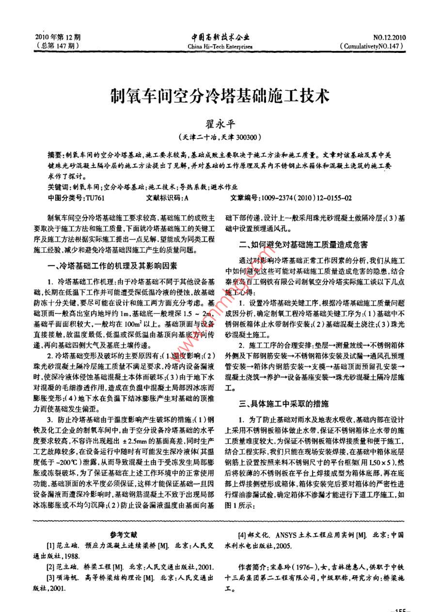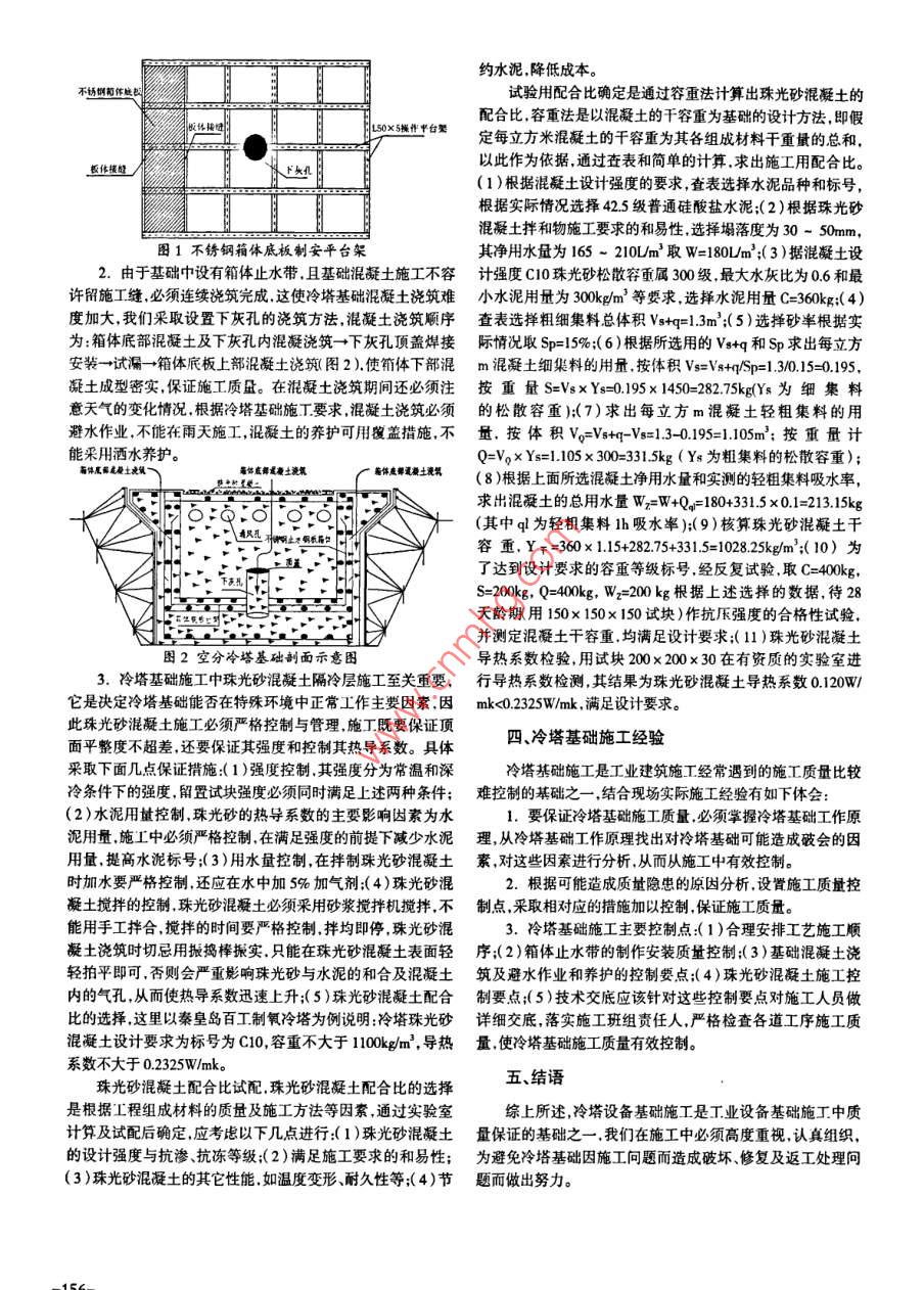 2010年第12期中高新術公業(yè)N122010(總第147期)China Hi-Tech EnterprisesCumulatively NO 147)制氧車間空分冷塔基礎施工技術翟永平(天津二十冶,天津300300)摘要:制氧車間的空分冷塔基礎,施工要求較高,基礎成敗主要取決于施工方法和施工質量。文章對該基礎及其中關鍵珠光砂混凝土隔冷層的施工方法提出了見解,并對基礎的工作原理及其內不銹鋼止水箱體和混凝土澆筑的施工要求作了探討關鍵詞:制氧車間;空分冷塔基礎;施工技術;導熱系數(shù);避水作業(yè)中圖分類號:TU761文獻標識碼:A文章編號:1009-2374(2010)12-0155-02制氧車間空分冷塔基礎施工要求較高基礎施工的成敗主礎下部傳遞設計上一般采用珠光砂混凝土做隔冷層;(3)基要取決于施工方法和施工質量,下面就冷塔基礎施工的關鍵工礎中設置預埋通風孔。序及施工方法根據(jù)實際施工提出一點見解望能成為同類工程施工經驗減少和避免冷塔基礎因施工產生的質量問題二、如何避免對基礎施工質量造成危害一、冷塔基礎工作的機理及其影響因素通過對影響冷塔基礎正常工作因素的分析,我們從施工中如何避免這些可能對基礎施工質量造成危害的隱患,結合1.冷塔基礎工作機理:由于冷塔基礎不同于其他設備基秦皇島百工鋼鐵有限公司制氧空分冷塔實際施工談以下幾點礎,長期在低溫下工作并可能遭受深低溫冷液的侵蝕,故基礎施工心得防凍十分關鍵,要盡可能在設計和施工兩方面充分考慮?;?.設置冷塔基礎關鍵工序,根據(jù)冷塔基礎施工質量問題礎頂面一般高出室內地坪約1m基礎底一般埋深15-2m,成因分析確定制氧工程冷塔基礎關鍵工序為1)基礎中不基礎平面面積較大,一般均在100m2以上。基礎頂面與設備銹鋼板箱體止水帶制作安裝;(2)基礎混凝土澆注(3)珠光直接接觸,故溫度最低,低溫或深低溫由基頂向基底方向傳砂混凝土施工。遞再向基礎四側大氣及基底土壤傳遞2.施工工序的合理安排:墊層→測量放線→不銹鋼箱體2冷塔基礎變形及破壞的主要原因有(1度影響;(2)外側及下部鋼筋安裝→不銹鋼箱體安裝及試漏→通風孔預埋珠光砂混凝土隔冷層施工質量不滿足要求冷塔內設備漏液管安裝→箱體內鋼筋安裝→支模→基礎頂面預留孔安裝→時使深冷液體侵蝕基礎混凝土本體而破壞;(3)由于地下水混凝土澆筑→養(yǎng)護→設備基座安裝→珠光砂混凝土隔冷層施對混凝的毛細滲透作用造成在負溫中混凝土局部因冰凍而工。膨脹變形;(4)地下水在負溫下結冰膨脹產生對基礎的頂推力而使基礎發(fā)生偏歪。三、具體施工中采取的措施3.防止冷塔基礎由于溫度影響產生破壞的措施(1)鋼1.為了防止基礎對雨水及地表水吸收,基礎內部在設計鐵及化工企業(yè)的制氧車間中由于空分設備冷塔基礎的水平上采用不銹鋼板箱體做止水帶保證不銹鋼箱體止水帶的施度要求較高不容許出現(xiàn)超出±25mm的基面高差同時生產工質量難度較大為保證不銹鋼板箱體焊接質量和便于施工,工藝故障較多,在設備運行中隨時有可能發(fā)生深冷液體其溫結合工程實際,我們只能在現(xiàn)場安裝焊接在基礎中箱體底層度低于-200℃)泄露,從而導致混凝土由于受凍發(fā)生局部膨鋼筋上設置按照來料不銹鋼尺寸的平臺框架用L50×5)然脹或凍裂破壞,為了保證基礎在上述工作環(huán)境中的正常使用后將較薄的不銹鋼板在平臺上焊接成型為箱體底部,再在底功能基礎頂面的水平度必須保證,這樣才能保證基礎一且因部上焊接側壁形成箱體箱體安裝完后要對箱體的嚴密性進設備漏液而遺深冷影響時,基礎鋼筋混凝土不致于出現(xiàn)局部行煤油滲漏試驗,確定箱體不滲漏才能進行下道工序施工,如冰凍膨脹或不均勻沉降;(2)防止設備漏液溫度由基面向基圖1所示:參考文獻[4]郝文化. ANSYS土木工程應用實例[M北京:中國[]范立礎。預應力混凝土連續(xù)梁橋[M北京:人民交水利水電出版社,2005通出版社,1988凹2]范立礎.橋梁工程[^M]北京:人民交通出版社,201.作者簡介:宋春玲(1976-)女,吉林德惠人,供職于中鐵3]項海帆。高等橋梁結構理論M]北京:人民交通出十三局集團第二工程有限公司,中級職稱,研究方向:橋粱施版社,2001約水泥降低成本不銹箱體觸試驗用配合比確定是通過容重法計算出珠光砂混凝土的配合比容重法是以混凝土的干容重為基礎的設計方法,即假By×世果定每立方米混凝土的千容重為其各組成材料干重量的總和以此作為依據(jù),通過查表和簡單的計算求出施工用配合比(1)根據(jù)混凝土設計強度的要求查表選擇水泥品種和標號,根據(jù)實際情況選擇425級普通硅酸鹽水泥(2)根據(jù)珠光砂混凝土拌和物施工要求的和易性選擇塌落度為30-50mm,圖1不銹鋼箱體底板制安平臺架其凈用水量為165~210L/m3取W=180L/m3;(3)據(jù)混凝土設2.由于基礎中設有箱體止水帶且基礎混凝土施工不容計強度C10珠光砂松散容重屬300級最大水灰比為06和最許留施工縫,必須連續(xù)澆筑完成這使冷塔基礎混凝土澆筑難小水泥用量為300kgm3等纓求,選擇水泥用量C=360kg;(4度加大我們采取設置下灰孔的澆筑方法混凝土澆筑順序查表選擇粗細集料總體積Vs+q=1.3m3(5)選擇砂率根據(jù)實為:箱體底部混凝土及下灰孔內混凝澆筑→下灰孔頂蓋焊接際情況取Sp=-15%;(6)根據(jù)所選用的vs+q和Sp求出每立方安裝→試漏→箱體底板上部混凝士澆筑圖2)使箱體下部混m混凝土細集料的用量按體積Ⅴs=Vs+qSp=13/015=0