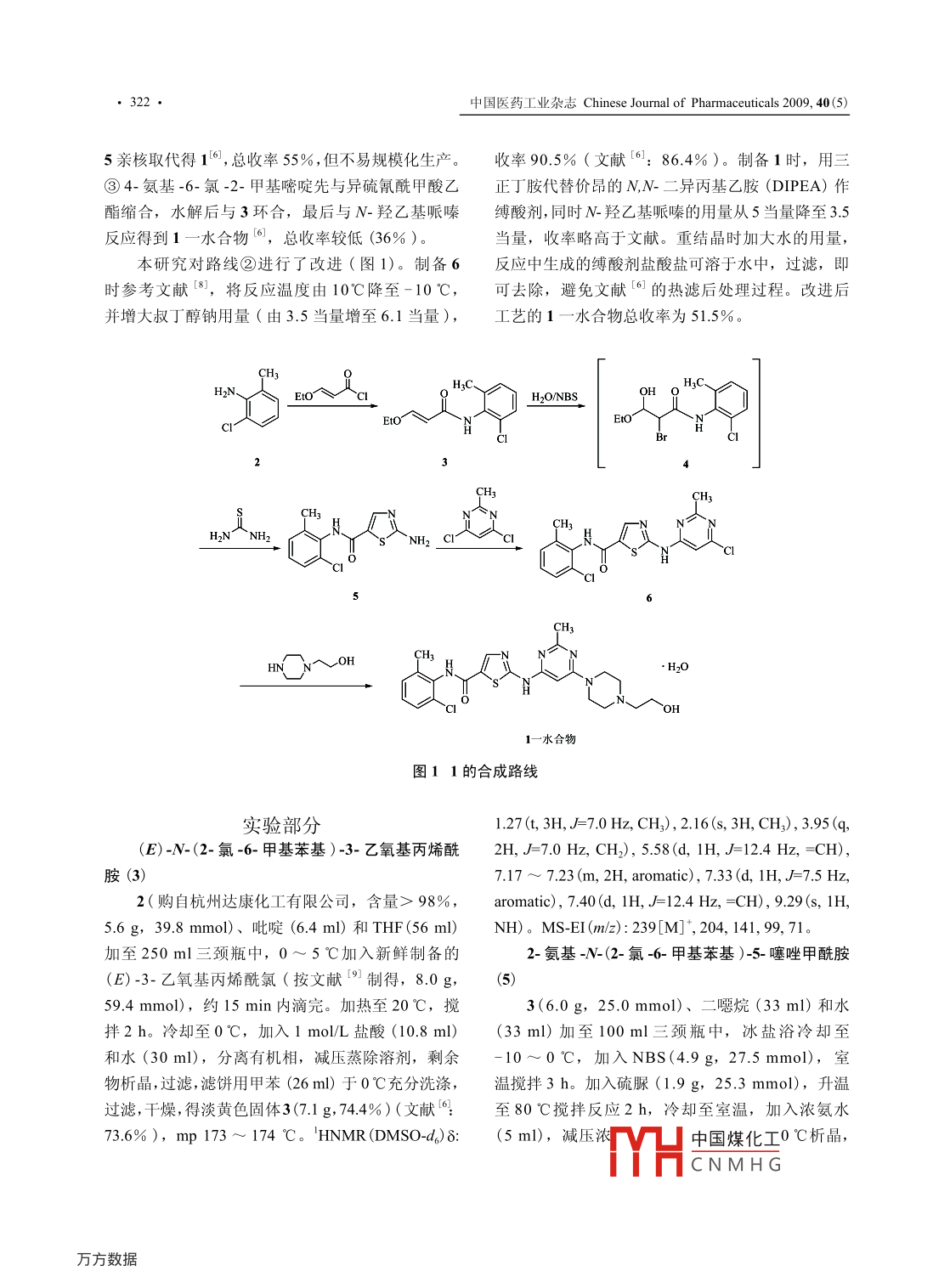 中國醫(yī)藥工業(yè)雜志Chinese Journal of Pharmaceuticals 2009, 40(5)●321●公化學(xué)藥物與合成技術(shù)達(dá)沙替尼的合成臧佳良,陳一芬,冀亞飛*(華東理工大學(xué)藥學(xué)院,上海 200237)摘要: 2-氣-6- 甲基苯胺與(E)-3- 乙氧基丙烯酰氯反應(yīng)得(E)-N-(2- 氯-6-甲基苯基)-3-乙氧基丙烯酰胺,與N-溴代丁二酰亞胺和水、硫脲“- -鍋法”連續(xù)反應(yīng)制得關(guān)鍵中間體2-氨基-N-(2-氣-6-甲基苯基)-5-噻唑甲酰胺(5)。最后4,6-二氣-2-甲基嘧啶先與5進(jìn)行親核取代反應(yīng),再與N-羥乙基哌嗪發(fā)生親核取代反應(yīng)制得抗腫瘤藥達(dá)沙替尼一-水合物, 總收率約52%。關(guān)鍵詞:達(dá)沙替尼:抗腫瘤藥;多重酪氨酸激酶抑制劑:合成中圖分類號: R979.1文獻(xiàn)標(biāo)志碼: A文章編號: 1001-8255 (2009)05-0321-03Synthesis of Dasatinib .ZANG Jialiang, CHEN Yi-fen, JI Ya-fei*(School of Pharmacy, East China University of Science and Technology, Shanghai 200237)ABSTRACT: 2-Chloro-6-methylaniline was acetylated with (E) -3-ethoxyacryloyl chloride to give (E)-N-(2-chloro-6-methylphenyl) -3-ethoxyacrylamide, from which the key intermediate 2-amino-N- (2-chloro-6-methylphenyl)-5-thiazolecarboxamide (5) was obtained by one-pot reaction with N-bromosuccinimide and H2O, and then thiourea.The chloro groups of 4,6-dichloro-2-methylpyrimidine were successively substituted with amino group of 5, andN-hydroxyethylpiperazine to give antitumor agent dasatinib monohydrate in 52% overall yield.Key Words: dasatinib; antitumor agent; multiple tyrosine kinases inhibitor; synthesis達(dá)沙替尼(dasatinib, 1), 化學(xué)名為N-(2-氯-1的合成方法主要有以下幾種:①2-氯噻唑6-甲基苯基)-2-[[6-[4-(2-羥乙基)-1-哌嗪基]-2-與2-氯-6-甲基苯基異氰酸酯縮合成酰胺,酰胺甲基-4-嘧啶基]氨基]-5-噻唑甲酰胺,由美國氮經(jīng)保護后與4-氨基-6-氯-2-甲基嘧啶反應(yīng),經(jīng)Bristol-Myers Squibb公司研發(fā),其一水合物于2006脫保護、與N-羥乙基哌嗪發(fā)生親核取代反應(yīng)得1,年2月首次在美國上市,商品名Sprycel。本品是鹽酸酸化得1鹽酸鹽[4.5]。此法總收率可達(dá)61%,首個批準(zhǔn)上市的口服多重酪氨酸激酶抑制劑,臨床但原料價昂,需使用丁基鋰試劑在低溫條件下反用于既往治療失敗或不耐受的成人各階段慢性髓細(xì)應(yīng),不適于大量生產(chǎn)。②2-氯-6-甲基苯胺(2)與胞樣白血病,也可用于治療對其它療法耐藥或不耐(E)-3-乙氧基丙烯酰氯反應(yīng)得(E)-N-(2- 氯-6-甲受的費城染色體陽性急性淋巴細(xì)胞性白血病成年患基苯基)-3-乙氧基丙烯酰胺(3),再與N-溴代丁二酰亞胺(NBS)和水、硫脲“一鍋法”制得2-氨基-N-(2-氯-6-甲基苯基)-5-噻唑甲酰胺(5),最收稿日期: 2008-12-12后4,6-二氯-2-甲基嘧啶先與5進(jìn)行親核取代反應(yīng),作者簡介:臧佳良(1985-), 男,碩士研究生,專業(yè)方向:藥物合再與N-羥乙基哌嗪親核取代制得1 - -水合物[6.7]。成通信聯(lián)系人:冀亞飛(1964-),男,教授,博士,從事藥物合成研此法總收率50%,原料易得,反應(yīng)條件溫和?;蚓空呦扔?,6-二氯-2-甲基嘧啶和N-羥乙基哌嗪進(jìn)Tel: 021-64253314E-mail: jyf@ecust.edu.cn行親核取代反應(yīng)中國煤化工作用下與YHCNMH G .322●中國醫(yī)藥工業(yè)雜志Chinese Journal of Pharmaceuticals 2009, 40(5)5親核取代得16),總收率55%,但不易規(guī)模化生產(chǎn)。收率90.5% (文獻(xiàn)[6]: 86.4%)。 制備1時,用三③4-氨基-6-氯-2-甲基嘧啶先與異硫氰酰甲酸乙正丁胺代替價昂的N,N-二異丙基乙胺(DIPEA)作酯縮合,水解后與3環(huán)合,最后與N-羥乙基哌嗪縛酸劑,同時N-羥乙基哌嗪的用量從5當(dāng)量降至3.5反應(yīng)得到1一水合物[6),總收率較低(36% )。當(dāng)量,收率略高于文獻(xiàn)。重結(jié)晶時加大水的用量,本研究對路線②進(jìn)行了改進(jìn)(圖1)。制備6反應(yīng)中生成的縛酸劑鹽酸鹽可溶于水中,過濾,即時參考文獻(xiàn)[8,將反應(yīng)溫度由10C降至-10 °C,可去除,避免文獻(xiàn)[6]的熱濾后處理過程。改進(jìn)后并增大叔丁醇鈉用量(由3.5當(dāng)量增至6.1當(dāng)量),工藝的 1 - -水合物總收率為51.5%。CHH3CH2N、Et0個H2ONBSOHEtOClB2CH3H3HN NH2_NH2_ CrCCIH3.HNT N~OH●H2O)H1- -水合物圖11的合成路線實驗部分1.27(t, 3H, J=7.0 Hz, CH3), 2.16(s, 3H, CH3), 3.95 (q,(E)-N-(2-氯-6-甲基苯基)-3-乙氧基丙烯酰2H, J=7.0 Hz, CH2), 5.58(d, 1H,J=12.4 Hz, =CH),胺(3)7.17 ~ 7.23 (m, 2H, aromatic), 7.33(d, 1H,.J=7.5 Hz,2(購自杭州達(dá)康化工有限公司,含量> 98%,aromatic), 7.40(d, 1H, J=12.4 Hz, =CH), 9.29(s, 1H,5.6 g,39.8 mmol)、吡啶(6.4 ml)和THF (56 ml)NH)。MS-EI (m/z): 239[M]*, 204, 141, 99, 71。加至250 m1三頸瓶中,0~5 °C加入新鮮制備的2-氨基-N-(2-氯-6-甲基苯基)-5-噻唑甲酰胺(E)-3-乙氧基丙烯酰氯(按文獻(xiàn)[9]制得,8.0g,(559.4 mmol),約15 min內(nèi)滴完。加熱至20°C,攪3(6.0g, 25.0 mmol)、二嗯烷(33 m1)和水拌2h。冷卻至0°C,加入1 mol/L鹽酸(10.8 ml)(33 ml)加至100 ml三頸瓶中,冰鹽浴冷卻至和水(30 ml),分離有機相,減壓蒸除溶劑,剩余-10~0 C,加入NBS(4.9 g, 27.5 mmol),室物析晶,過濾,濾餅用甲苯(26ml)于0C充分洗滌,溫攪拌3 h。加入硫脲(1.9 g, 25.3 mmol),升溫過濾,干燥,得淡黃色固體3(7.1 g,74.4%)(文獻(xiàn)"':至80 °C攪拌反應(yīng)2h,冷卻至室溫,加入濃氨水73.6%),mp 173~ 174 C。'HNMR (DMSO-d)8:(5 m1),減壓濃中國煤化工0"C析晶,YHCNMH G .中國醫(yī)藥工業(yè)雜志Chinese Journal of Pharmaceuticals 2009, 40(5)323●過濾,濾餅用水洗滌,干燥,得深黃色固體5(6.2 g,'HNMR (DMSO-d)8: 2.09(s, 3H, CH3), 2.24(s, 3H,92.0%) (文獻(xiàn)[6: 94.9% 