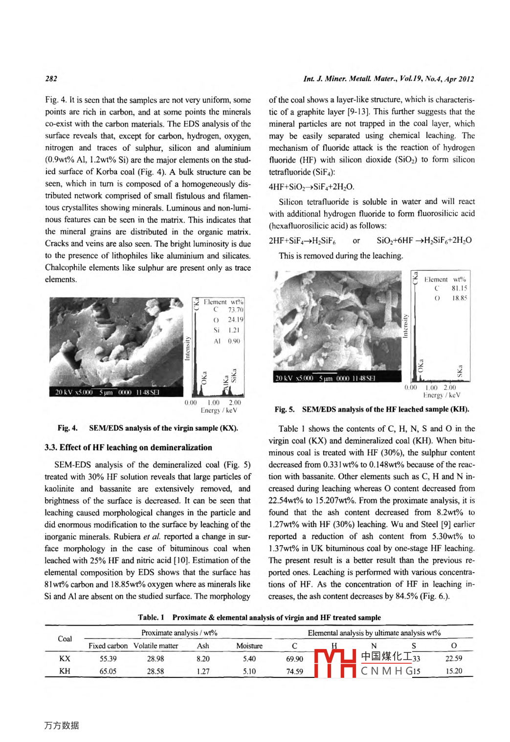 International Journal of Minerals, Metallurgy and MaterialsVolume 19, Number 4, Apr 2012, Page 279Do!:10.1007/s12613012055140Chemical leaching of an Indian bituminous coal and characterization of theproducts by vibrational spectroscopic techniquesB. Manoj2)and A.G. Kunjomana"1)Department of Physics, Christ University, Hosur Road, Bangalore-29 Kamataka 560029, India2)Research and Development Centre, Bharathiar University, Coimbatore, Tamil Nadu, lodia(Received: 29 April 2011: revised: 28 November 2011; accepted: 29 November 201l)Abstract: High volatile bituminous coal was demineralized by a chemical method. The vibrations of the"aromatics"structure of graphite,crystalline or non-crystalline, were observed in the spectra at the 1600 cm" region. The band at 1477 cm is assigned as Va band, the bandat 1392 cm as Vi band and the band at 1540 cm as Gr band. Graphite structure remains after chemical leaching liberates oxygenatedfunctional groups and mineral groups. The silicate bands between 1010 and 1100 cm" are active in the infrared (IR)spectrum but inactive inthe Raman spectrum. Absorption arising from C-H stretching in alkenes occurs in the region of 3000 to 2840 cm". Raman bands because ofsymmetric stretch of water molecules were also observed in the spectrum at 3250 cm"and 3450 cm". Scanning electron microscopy analysis revealed the presence of a graphite layer on the surface. Leaching of the sample with hydrofluoric acid decreases the mineral phase andincreases the carbon content. The ash content is reduced by 845wt%with leaching from its initial value by mainly removing aluminum andsilicate containing mineralsKeywords: bituminous coal; characterization; graphite; leaching,mal spectroscopy;ash content of the coal. It will in turn affect the quality of1. Introductioncoal as fuel. Concerted efforts are there to demineralize theRaman spectroscopy had been used extensively to char-coal samples to get mineral free coal [4-5]. In the presentacterize the structural features of carbonaceous matter sincestudy, the change of functional groups and mineral groupTuinstra and Koenig [1] first correlated Raman bands towith hydrofluoric acid (HF) leaching on high volatile Indianstructural parameters measured from X-ray diffraction coal was investigated by IR and Raman spectroscopy. Su(XRD)of polycrystalline graphite. Raman spectroscopy had face characteristics of very low ash bituminous coal ob-also been applied to study the structural features of tained after chemical demineralization were carried out withcoal-derived products [2-3]. In these studies, the Raman scanning electron microscopy(SEM) and energy dispersivespectral characteristics, mainly those of graphite(G)and spectroscopy (EDS)defect bands(D), were used to investigate the coal structuresand their correlation to other characteristics, e.g. coal rank2. Experimentaland the 'graphite crystalline size parameters. In nearly allspectro"copic studies of organic and inorganic materials it is dried in a dessicator to remove the absorbed water. Samples30%10%for24halong with Fourier transform infrared(FTIR) spectra. Thewashed with enormous amounts of distilled water. Thetwo methods are completely complementary and could pro- slurry was filtered and dried at about 80 C for removing thevide considerable structural information when used together.absorbed water and allowed to cool slowly in a dessicator.The minerals present in coal play a significant role in the The Ftir spectrum was recorded by a Shimadzu FTIR-8400orresponding author: B Manoj E-mail: manoj b@christuniversity in中國煤化工SpringerO University of Scicnce and Technology Beijing and Springer-Verlag Berlin Heidelberg 2012CNMHGInt J. Miner. MetalL Mater oL19, No4, Apr 2012pectrometer in the region of 4000-400 cm". The Raman band, the band at 1392 cm"is assigned as vl band and thespectra were obtained using a Bruker RFS 100/S spec- band at 1540 cm"as gr band. These bands representtrometer equipped with a Raman accessory. This comprised mainly the aromatic semi-quadrant ring breathing for aro-a Spectron laser system SL301 Nd-YAG laser operating at a matic ring systems having more than two fused benzenewavelength of 1064 nm, and a raman sampling compart- rings.ment incorporating 1800 optics. The Raman detector was aThe bands observed at 1460 and 1375 cm in the ramanhighly sensitive standard Ge detector and was operated at22C. Under these conditions raman shifts would be ob.spectra of coal are attributed to Ch band and absorption at1250 cm is attributed to phenolic structures. The absorp-served in the spectral range of 3500-1200 cm. A laserpower of 200 mw was used.tion due to phenoxy group at-1250 cm, presumably phe-ols, is probably very weak, and the majorA SEM micrographs of the virgin and residual samples likely due to the graphite structure. This makes more sensewere obtained by scanning electron micrograph(sEM) to assign a small amount of this jointly to phenolic and ChJEOL model JSM-6390 LV. Each of the samples was structure and the major portion of the absorption to themounted on disc and coated with gold. The energy disper- graphite structure. Many of these bands with HF leachingsive spectrometer(EDS) was obtained by JEOL model decrease their intensities. In the Raman spectra of coal,JED-2300. Elemental analysis was carried out using weak absorption peak at 1080 cm is observed. This isVaroEL III CHNS analyzerprobably due to Si-O stretching or C-H band on aromaticrings [5]. This singlet with HF leaching was split up into3. Results and discussionthree peaks with less intensity.3. 1. Vibrational spectroscopic analysis of bituminousFT Raman spectra of bituminous coal and their chemicalleached products with wavenumber 2600-3600 cm"areThe Raman spectra of the bituminous coal sample andshown in Fig. 2. The vibrations of the CH2 group, thethe HF leached products within 1200-1650 cm"region areasymmetric stretch, symmetric stretch and scissoring andshown in Fig. 1. On studying the structures of t