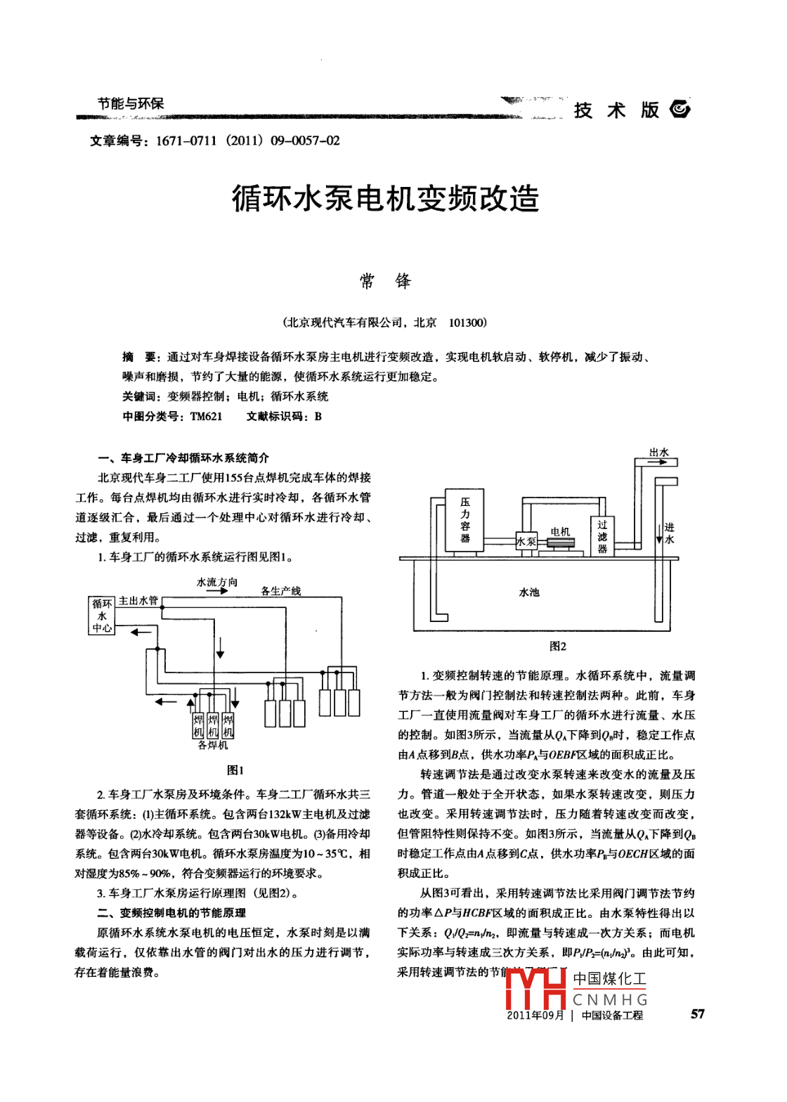 節(jié)能與環(huán)保3技術(shù)版@文章編號(hào):1671-0711(2011)090057-02循環(huán)水泵電機(jī)變頻改造常鋒(北京現(xiàn)代汽車有限公司,北京101300摘要:通過(guò)對(duì)車身焊接設(shè)備循環(huán)水泵房主電機(jī)進(jìn)行變頻改造,實(shí)現(xiàn)電機(jī)軟啟動(dòng)、軟停機(jī),減少了振動(dòng)、噪聲和磨損,節(jié)約了大量的能源,使循環(huán)水系統(tǒng)運(yùn)行更加穩(wěn)定。關(guān)鍵詞:變頻器控制;電機(jī);循環(huán)水系統(tǒng)中圖分類號(hào):TM621文獻(xiàn)標(biāo)識(shí)碼:B、車身工廠冷卻循環(huán)水系統(tǒng)簡(jiǎn)介北京現(xiàn)代車身二工廠使用155臺(tái)點(diǎn)焊機(jī)完成車體的焊接工作。每臺(tái)點(diǎn)焊機(jī)均由循環(huán)水進(jìn)行實(shí)時(shí)冷卻,各循環(huán)水管道逐級(jí)匯合,最后通過(guò)一個(gè)處理中心對(duì)循環(huán)水進(jìn)行冷卻、過(guò)濾,重復(fù)利用壓力容器過(guò)濾器1.車身工廠的循環(huán)水系統(tǒng)運(yùn)行圖見(jiàn)圖1。水流方向各生產(chǎn)線水池出水管圖21.變頻控制轉(zhuǎn)速的節(jié)能原理。水循環(huán)系統(tǒng)中,流量調(diào)節(jié)方法一般為閥門(mén)控制法和轉(zhuǎn)速控制法兩種。此前,車身工廠一直使用流量閥對(duì)車身工廠的循環(huán)水進(jìn)行流量、水壓杷的控制。如圖3所示,當(dāng)流量從Q下降到Qn時(shí),穩(wěn)定工作點(diǎn)各焊機(jī)由A點(diǎn)移到B點(diǎn),供水功率P與OEBF區(qū)域的面積成正比圖1轉(zhuǎn)速調(diào)節(jié)法是通過(guò)改變水泵轉(zhuǎn)速來(lái)改變水的流量及壓2.車身工廠水泵房及環(huán)境條件。車身二工廠循環(huán)水共三力。管道一般處于全開(kāi)狀態(tài),如果水泵轉(zhuǎn)速改變,則壓力套循環(huán)系統(tǒng):(1)主循環(huán)系統(tǒng)。包含兩臺(tái)132kW主電機(jī)及過(guò)濾也改變。采用轉(zhuǎn)速調(diào)節(jié)法時(shí),壓力隨著轉(zhuǎn)速改變而改變,器等設(shè)備。②2)水冷卻系統(tǒng)。包含兩臺(tái)30kW電機(jī)。③)備用冷卻但管阻特性則保持不變。如圖3所示,當(dāng)流量從Q下降到Q系統(tǒng)。包含兩臺(tái)30kW電機(jī)。循環(huán)水泵房溫度為10~35℃,相時(shí)穩(wěn)定工作點(diǎn)由A點(diǎn)移到C點(diǎn),供水功率P與OECH區(qū)域的面對(duì)濕度為85%~90%,符合變頻器運(yùn)行的環(huán)境要求。積成正比。3.車身工廠水泵房運(yùn)行原理圖(見(jiàn)圖2)。從圖3可看出,采用轉(zhuǎn)速調(diào)節(jié)法比采用閥門(mén)調(diào)節(jié)法節(jié)約變頻控制電機(jī)的節(jié)能原理的功率△P與HCBF區(qū)域的面積成正比。由水泵特性得出以原循環(huán)水系統(tǒng)水泵電機(jī)的電壓恒定,水泵時(shí)刻是以滿下關(guān)系:QQ=nn2,即流量與轉(zhuǎn)速成一次方關(guān)系;而電機(jī)載荷運(yùn)行,僅依靠出水管的閥門(mén)對(duì)出水的壓力進(jìn)行調(diào)節(jié),實(shí)際功率與轉(zhuǎn)速成三次方關(guān)系,即PP=(mn2由此可知存在著能量浪費(fèi)。采用轉(zhuǎn)速調(diào)節(jié)法的節(jié)1中國(guó)煤化工CNMHG2011年09月|中國(guó)設(shè)備工程@技術(shù)版節(jié)能與環(huán)保閥門(mén)關(guān)小管阻特性l60kW。三、能源節(jié)約分析閥門(mén)全開(kāi)由于無(wú)法對(duì)水泵房電機(jī)使用時(shí)間及耗電量進(jìn)行單一的測(cè)算,只能通過(guò)理論值對(duì)節(jié)約金額進(jìn)行估算。水泵房電機(jī)轉(zhuǎn)速下降使用情況以2009年為基準(zhǔn)進(jìn)行計(jì)算。由于水泵房電機(jī)僅在壓力特性長(zhǎng)時(shí)間停產(chǎn)或者定期檢修清污時(shí)才停止運(yùn)轉(zhuǎn)。200年水泵房電機(jī)累計(jì)停止運(yùn)轉(zhuǎn)12天(國(guó)慶節(jié)設(shè)備改造6天,春節(jié)設(shè)備E:0改造6天),正常運(yùn)行353天,計(jì)8472h1.改造前耗電量計(jì)算(2009年)。電機(jī)能耗圖3U為運(yùn)行電壓,Ⅰ運(yùn)行電流,cos為功率因數(shù),t為運(yùn)行時(shí)由電機(jī)轉(zhuǎn)速公式n=60,其中,n為電機(jī)同步轉(zhuǎn)速,/供間。2009年耗電量為380×186×088×1732÷1000×8472電頻率,p為電機(jī)極對(duì)數(shù),可知電機(jī)供電頻率與轉(zhuǎn)速成正比。=9126685kW·h這樣,釆用變頻器調(diào)速時(shí),變頻器的輸出頻率與流量、壓力及2.變頻器控制后的耗電量。測(cè)得使用變頻器后的電壓電機(jī)軸功率也有上述的次方(n=1,2,3)比例關(guān)系。為239V,電流為183A,耗電量=239×183×0.88×1.732÷2.變頻控制轉(zhuǎn)速原理。車身工廠從循環(huán)水房出來(lái)的壓1000×8472=564762kwW·h力設(shè)定為45MPa。由于 ROBOTA程序內(nèi)設(shè)定的循環(huán)水流量為3.節(jié)約量。一臺(tái)132kW主電機(jī)每年可節(jié)電固定值7.5Lmin,因此要求循環(huán)水泵房出水壓力也為固定3479064kWh,1年累計(jì)可節(jié)約1948萬(wàn)元,設(shè)備改造費(fèi)用值。這一條件可由管道內(nèi)的壓力傳感器進(jìn)行檢測(cè),并將檢為114萬(wàn)元,投入1年即可收回改造投資。測(cè)數(shù)據(jù)發(fā)送至變頻器,從而根據(jù)水壓對(duì)電機(jī)的轉(zhuǎn)速進(jìn)行調(diào)四、變頻器控制電機(jī)的優(yōu)點(diǎn)節(jié)(見(jiàn)圖4)。1.降低了能源消耗。2.使電機(jī)軟啟、停和降速運(yùn)行,減少了振動(dòng)、噪聲和磨損,延長(zhǎng)了電機(jī)的使用壽命和維修周期。壓力給定壓力反饋壓力3.安裝了