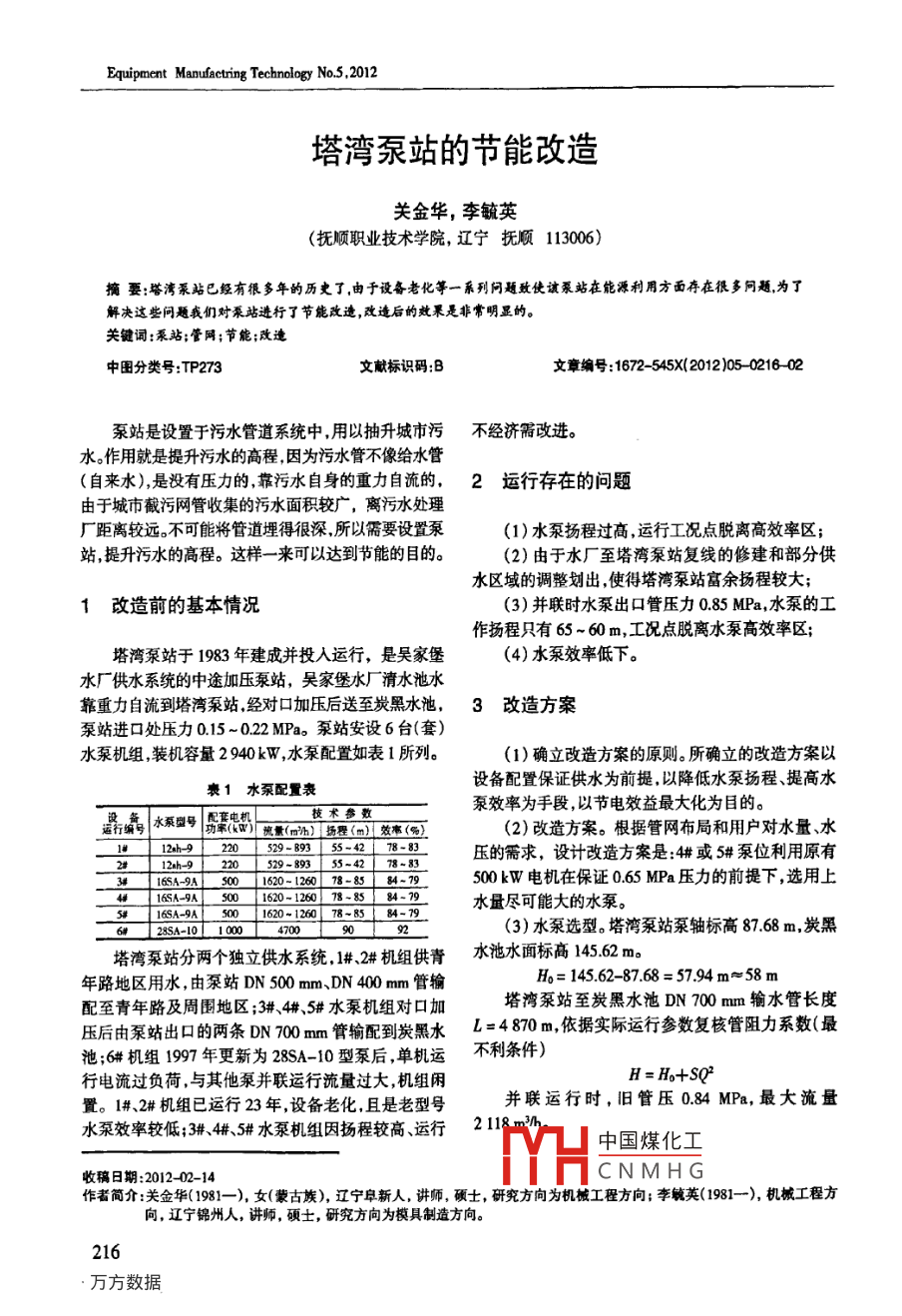 Equipment Manufactring Technology No 5, 2012塔灣泵站的節(jié)能改造關(guān)金華,李毓英(撫順職業(yè)技術(shù)學(xué)院,遼寧撫順113006)摘要:塔灣泵站已經(jīng)有很多年的歷史了,由于設(shè)備老化等一乘列問題致使讞泵站在能源利用方面存在很多問題為了解決這些問題我們對泵站進行了節(jié)能改連,改造后的效果是非常明顯的。關(guān)鍵詞:泵站;管網(wǎng);節(jié)能;改中田分類號:TP273文獻標識碼:B文章編號:1672-545X(2012)05021602泵站是設(shè)置于污水管道系統(tǒng)中,用以抽升城市污不經(jīng)濟需改進。水。作用就是提升污水的高程因為污水管不像給水管自來水),是沒有壓力的靠污水自身的重力自流的,2運行存在的問題由于城市截污網(wǎng)管收集的污水面積較廣,離污水處理廠距離較遠。不可能將管道埋得很深所以需要設(shè)置泵(1)水泵揚程過高運行工況點脫離高效率區(qū);站提升污水的高程。這樣一來可以達到節(jié)能的目的。(2)由于水廠至塔灣泵站復(fù)線的修建和部分供水區(qū)域的調(diào)整劃出使得塔灣泵站富余揚程較大;1改造前的基本情況(3)并聯(lián)時水泵出口管壓力085MPa,水泵的工作揚程只有65~60m,工況點脫離水泵高效率區(qū)塔灣泵站于1983年建成并投入運行,是吳家堡(4)水泵效率低下。水廠供水系統(tǒng)的中途加壓泵站,吳家堡水廠清水池水靠重力自流到塔灣泵站經(jīng)對口加壓后送至炭黑水池,3改造方案泵站進口處壓力015~02MPa。泵站安設(shè)6臺(套)水泵機組裝機容量2940kW,水泵配置如表1所列。1)確立改造方案的原則。所確立的改造方案以衰1水泵配置表設(shè)備配置保證供水為前提,以降低水泵揚程提高水泵效率為手段,以節(jié)電效益最大化為目的W)素(m)揚()效水((2)改造方案。根據(jù)管網(wǎng)布局和用戶對水量、水3m3:是壓的需求,設(shè)計改造方案是輯或斗泵位利用原有500kW電機在保證065MPa壓力的前提下,選用上A-9A水量盡可能大的水泵。A-9A|501620126078~85(3)水泵選型。塔灣泵站泵軸標高87.68m,炭黑塔灣泵站分兩個獨立供水系統(tǒng),1#,機組供青水池水面標高14562m年路地區(qū)用水,由泵站DN500mm、DN400mm管輸H6=14562-87.68=5794m≈58m配至青年路及周圍地區(qū);3#、4#、5排水泵機組對口加塔灣泵站至炭黑水池DN700mm輸水管長度壓后由泵站出口的兩條DN700mm管輸配到炭黑水L=4870m,依據(jù)實際運行參數(shù)復(fù)核管阻力系數(shù)最池:6#機組1997年更新為2854-10型泵后單機運不利條件)行電流過負荷,與其他泵并聯(lián)運行流量過大,機組閑H=Ho+sQ置。1#、2#機組已運行23年,設(shè)備老化,且是老型號并聯(lián)運行時,舊管壓084MPa,最大流量水泵效率較低4#5排水泵機組因揚程較高運行211中國煤化工收稿日期:2012-02-14CNMHG作者簡介:關(guān)金華(1981一),女(蒙古族),遼寧阜新人,講師,碩士,研究方向為機械工程方向;李毓英(1981-),機械工程方向,遼寧錦州人,講師,碩士,研究方向為模具制造方向。216裝備制造技術(shù)》2012年第5期84=58+Sx21182H/3677帆=631(367×080×0.6)S1=5795×106=249kWh)/km)。并聯(lián)運行時,新管壓084MPa,最小流量供近778萬ml水量時,日耗電量14756m3/h(232×526+249×252)=184778(kWb,84=58+Sx147562平均單耗S2=1194×10°184778/77.8=238(kWb)(km)取現(xiàn)泵站至炭黑水池輸水量7萬md時,根據(jù)(2)更新前配水單耗。水量按流量計表指示數(shù),流量計顯示結(jié)果:新舊DN700m管輸水量不均衡,電量按電業(yè)局貿(mào)易結(jié)算表指示數(shù)如表2所列。舊線輸水量占58%,新線輸水量占42%;喪2更新前配水單耗表按實際管阻力系數(shù)復(fù)核揚程九月合計舊線流量Qm=70000÷24×58%=161m/h;水(萬噸)241921944613需揚程H=58+5795×106×16912=746m;電量(h)644361s6001201476考慮泵進口壓力014MPa,選泵需要揚程平均配水單耗H=746-14=6C電量/水量=1201476/4613新線流量=260.5kWh)/(kmQa=70000÷24x42%=1225mh,每日轉(zhuǎn)輸流量按778萬m3計,每日節(jié)省電費需揚程(260.5-238)x7.8m)d×0.52元/(kW·hH=58+119x10-6×12252=75.9m910元考慮泵進口壓力04MPa,選泵需要揚程每年可節(jié)約運行電費H=75.9-14=619m。910×365=332萬元。因此,根據(jù)計算復(fù)核的結(jié)果,確定選泵揚程中線為605投資回收期的預(yù)測根據(jù)所需流量、揚程參數(shù)查水泵樣本曲線,選擇SLOW400-550型水泵。其改造投資費概算如表3所列Q=1320~2190~2850m}h;表3改造投資費概算表H=77~638~472m。型號單位數(shù)量「單價(萬元)總價萬元)〕N軸=500kW,n=1480rmin水泵30050B臺當H=63m時,件及安裝費Q=2190m孫h=5.26萬m}d,電動T=86%。選SIOW300-550B型水泵,其投資回收期約1年。Q=580-1360-1820mh,H=73-57~44m,6結(jié)束語N軸=280kW,經(jīng)過節(jié)能改造,節(jié)省了政府開支,投資的回收期當H=63m時,也是比較合理的,是一項非??尚械呐e措。Q=1050mh=252萬md,7=80%。參考文獻:]湯躍尚亞波吳徐變頻調(diào)速的研究與分析門中國電機4節(jié)電效果預(yù)測工程學(xué)報200323(3):146-160凹2]鄭紅等變頻調(diào)速恒壓與變壓供水的能耗分析門排灌機(1)更新后500kW、300kW機組配水單耗分械,2007,25(1):45493]陳中國煤化工小型水廠自動化技術(shù)別是:的H/367nη機=631(367×086×086)CNMHG: 86-90.題分析門城鎮(zhèn)供水,=232kWh)/(km);2001,(2):22-27.(下轉(zhuǎn)第219頁)217《裝備制造技術(shù)》012年第5期變頻器參數(shù)設(shè)定如表1所列。表1變頻器參數(shù)設(shè)定F2000P設(shè)定值備注初始化F2反轉(zhuǎn)禁出(0無效1有效)□1禁AD轉(zhuǎn)換200啟動指令來源鍵盤+