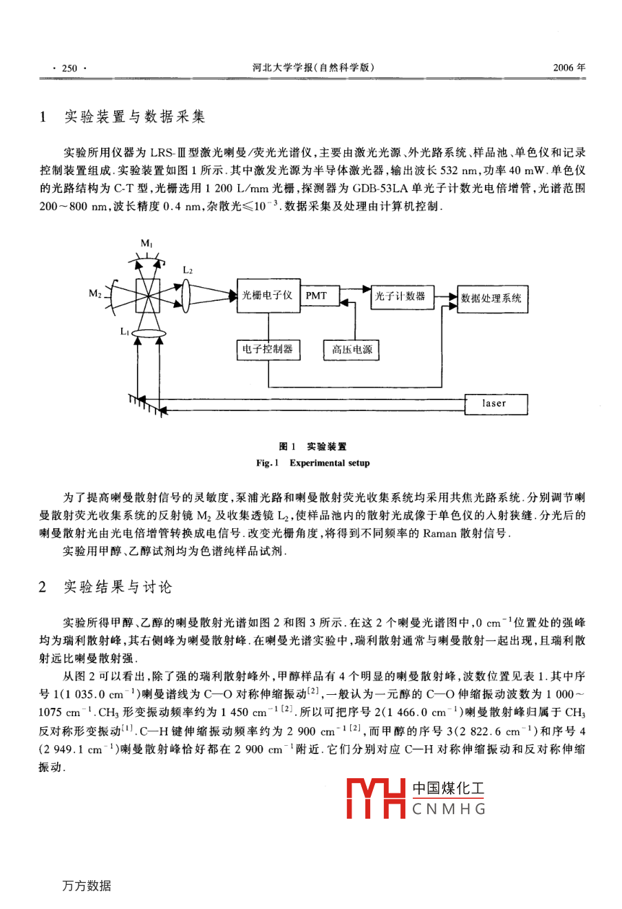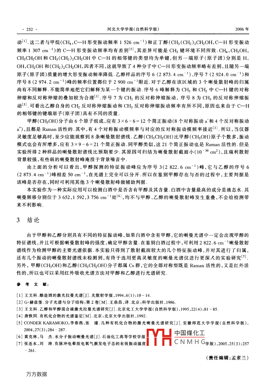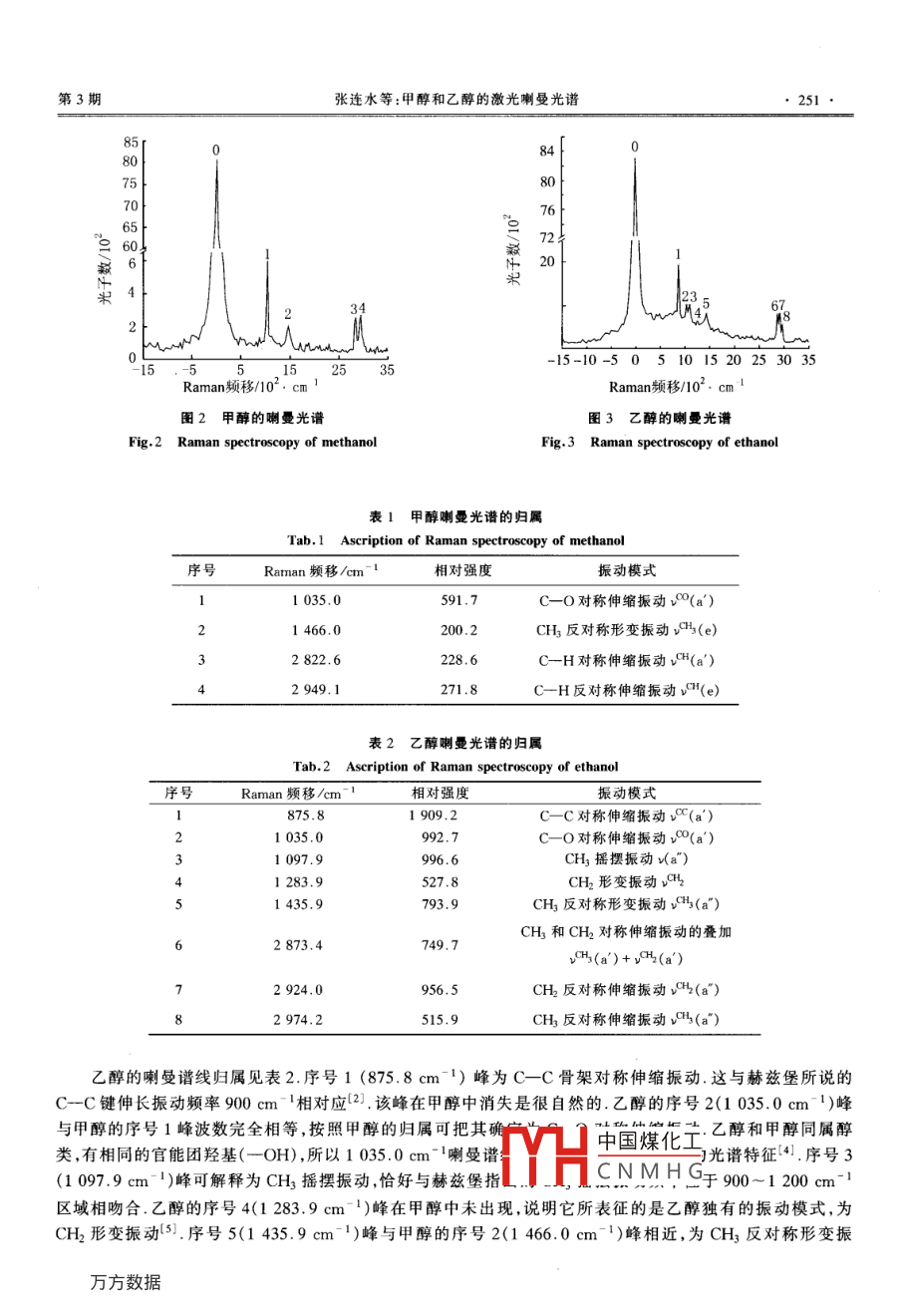 第26卷第3期河北大學學報(自然科學版)Vol 26 No. 32006年5月Journal of Hebei University( Natural Science Edition)May 2006甲醇和乙醇的激光喇曼光譜張連水,毛少娟,黨偉,孫江,馮小敏(河北大學物理科學與技術學院,河北保定071002)摘要:采用激光喇曼方法,對甲醇和乙醇液體樣品進行了喇曼光譜研究,得到了上述樣品的喇曼光譜并對其進行了歸屬.經過分析比較,給出了檢測甲醇的特征譜線,為假酒鑒別、深λ研究甲醇和乙醇的能級結構等提供了可供借鑒的參考關鍵詞:甲醇;乙醇;喇曼光譜中圖分類號:O433.4文獻標識碼:A文章編號:1000-1565(2006)03-0249-04Raman Spectroscopy of Methanol and EthanolZHANG Lian-shui, MAO Shao-juan, DANG Wei, SUN Jiang, FENG Xiao-minCollege of Physics Science and Technology, Hebei University, Baoding 071002,ChinaAbstract: Laser Raman spectroscopy technique is used to study methanol and ethanol liquid. The vibrationalpeak obtained in the experiment has been assigned. This paper presents characteristic spectral line for detectingmethanol by analyzing and comparing all the spectral lines. It has great referrence value in evaluating the qualityof alcohol and studying the energy level of methanol and ethanol deeplyKey words: methanol; ethanol; laser Raman spectroscopy酒是人們日常生活中的重要消費品.適量飲酒能疏通經絡、促進血液循環(huán),有利于身體健康,而過量飲酒或飲用甲醇含量超標的酒類,會嚴重影響身體健康,甚至致殘長期以來人們對白酒的成分進行了深入的探討1,其主要成分是乙醇所謂“假酒”就是以工業(yè)酒精為原料仿冒有品牌的“真酒”,由于工業(yè)酒精分餾純度不佳,常伴隨有不少甲醇成分甲醇同乙醇類似,也是具有酒香氣味的無色透明液體,有顯著的麻醉作用,對于視神經危害最為嚴重,能引起損害和失明,甚至危及人的生命.有人稱其為“假酒中的殺人兇手”國內外已有很多起甲醇中毒致死事件鑒于此,如何鑒別酒中是否含有甲醇,成了一項值得研究的課題般消費者只能通過感官(包括觀嗅、嘗等)對酒的色、香、味進行鑒別但是由于每個人的感官要求不樣,所以這種方法易受主觀條件限制,并且不夠準確,不能量化.用指示劑法來檢測甲醇的依據是指示劑只和甲醇氧化后的甲醛起反應,發(fā)生顏色的變化該方法的缺點是甲醇可能過度氧化成甲酸,而無法確定甲醇氧化成甲醛和甲酸的量,間接影響此試劑的檢測靈敏度.目前有人用化學方法來檢測甲醇但耗時長,不方便.而采用激光喇曼方法對白酒中的甲醇含量進行檢測,可以克服上述檢測方法的不足.本文基于上述目的,分別對甲醇和乙醇樣品進行了喇曼光譜實驗研究,得到了對應的喇曼光譜,對喇曼頻移所對應的簡正振動模式進行了歸屬,并對二者做了比較這不僅對檢測酒類飲品結構、電子態(tài)躍遷等做了基礎工作,豐富了有機物分子的價鍵H中國煤化工為研究甲醇的能級CNMHG收稿日期:2005-10-30作者簡介:張連水(1956-),男,河北保定人,河北大學教授,主要從事激光光譜方面的研究250河北大學學報(自然科學版)2006年1實驗裝置與數據釆集實驗所用儀器為LRSⅢ型激光喇曼熒光光譜儀,主要由激光光源、外光路系統(tǒng)、樣品池、單色儀和記錄控制裝置組成實驗裝置如圖1所示其中激發(fā)光源為半導體激光器,輸出波長532nm,功率40mW.單色儀的光路結構為CT型,光柵選用1200L/mm光柵,探測器為GDB53LA單光子計數光電倍增管,光譜范圍200~800mm,波長精度0.4nm,雜散光≤10ˉ3數據采集及處理由計算機控制光柵電子儀PMT光子計數器數據處理系統(tǒng)「電子控制圖1實驗裝置ig. 1 Experimental setup為了提高喇曼散射信號的靈敏度,泵浦光路和喇曼散射熒光收集系統(tǒng)均采用共焦光路系統(tǒng).分別調節(jié)喇曼散射熒光收集系統(tǒng)的反射鏡M2及收集透鏡L2,使樣品池內的散射光成像于單色儀的入射狹縫.分光后的喇曼散射光由光電倍增管轉換成電信號.改變光柵角度,將得到不同頻率的 Raman散射信號實驗用甲醇、乙醇試劑均為色譜純樣品試劑2實驗結果與討論實驗所得甲醇、乙醇的喇曼散射光譜如圖2和圖3所示.在這2個喇曼光譜圖中,0cm-1位置處的強峰均為瑞利散射峰,其右側峰為喇曼散射峰.在喇曼光譜實驗中,瑞利散射通常與喇曼散射一起出現(xiàn),且瑞利散射遠比喇曼散射強從圖2可以看出,除了強的瑞利散射峰外,甲醇樣品有4個明顯的喇曼散射峰,波數位置見表1.其中序號1(1035.0cm-1)喇曼譜線為CO對稱伸縮振動2),-般認為一元醇的CO伸縮振動波數為1000~1075cm-1.CH3形變振動頻率約為1450cm-12.所以可把序號2(14660cm-1)喇曼散射峰歸屬于CH3反對稱形變振動1.CH鍵伸縮振動頻率約為2900cm12,而甲醇的序號3(2826cm1)和序號4(2949.1cm-1)喇曼散射峰恰好都在2900cm‘附近.它們分別對應C-H對稱伸縮振動和反對稱伸縮振動中國煤化工CNMHG第3期張連水等:甲醇和乙醇的激光喇曼光譜251807576g6072615-10-505101520253035圖2甲醇的喇曼光譜圖3乙醇的喇曼光譜Fig 2 Raman spectroscopy of methanolFig 3 Raman spectroscopy of ethanol表1甲醇喇曼光譜的歸屬Tab. 1序號Raman頻移/cm-1相對強度振動模式對稱伸縮振動vO(1466.0200.2CH3反對稱形變振動(e)C-H對稱伸縮振動v(a')2949.1271.8C-H反對稱伸縮振動v(e)表2乙醇喇曼光譜的歸屬Tab 2 Ascription of Raman spectroscopy of ethanolRaman頻移/cm-1相對強度振動模式C—C對稱伸縮振動(a')1035.0992.7C-O對稱伸縮振動(a)1097.9996.6CH3搖擺振動a")283CH2形變振動1435.9H反對稱形變振動((a")CH3和CH2對稱伸縮振動的疊加2873,4v3(a)+pH2(a'
