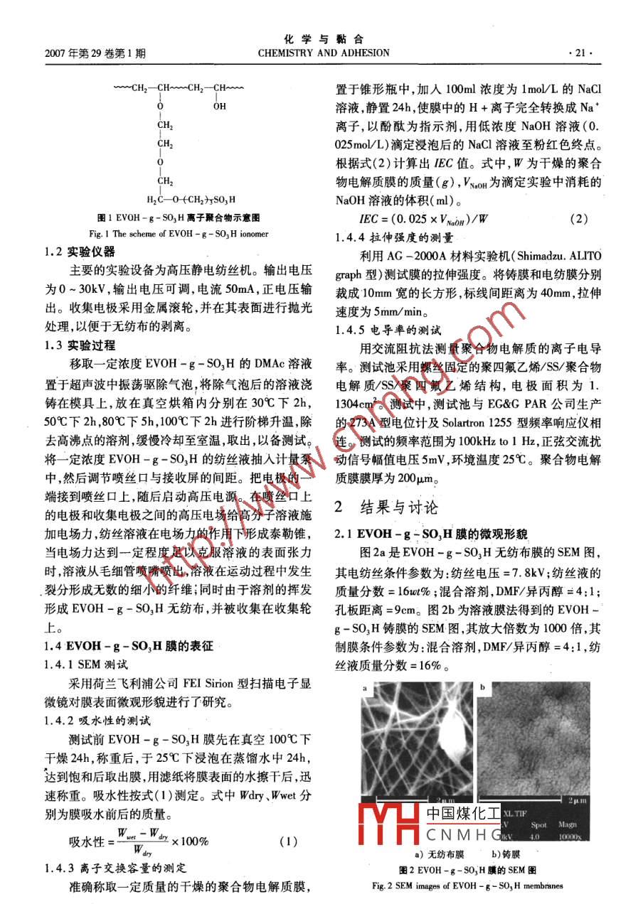 ●20●.代麗君,磺化乙烯-乙烯醇離子聚合物膜性能的研究Vol. 29. No.1 ,2007磺化乙烯-乙烯醇離子聚合物膜性能的研究代麗君(哈爾濱商業(yè)大學(xué)物流學(xué)院,黑龍江哈爾濱150076)摘要:采用高壓靜電紡絲技術(shù)和溶液鑄膜法兩種工藝分別制備了兩種磺化乙烯-乙烯醇( EVOH-g- SO,H)離子聚合物膜,并采用掃描電子顯微鏡( SEM)分別對(duì)兩種膜的微觀形貌進(jìn)行了表征,比較了兩種離子聚合物電解質(zhì)膜的吸水性、離子交換容量( IEC)力學(xué)性能和質(zhì)子電導(dǎo)率。結(jié)果表明:磺化乙烯-乙烯醇電紡膜的力學(xué)性能較差,但其吸水性和離子交換容量均優(yōu)于鑄膜,且質(zhì)子電導(dǎo)率可以達(dá)到25.63 x 10-*S: cm -' ,高于鑄膜的質(zhì)子電導(dǎo)率。關(guān)鍵詞:高壓靜電紡絲;溶液鑄膜;EV0H-g - SO,H離子聚合物;質(zhì)子電導(dǎo)率中圖分類(lèi)號(hào):TQ 425.236文獻(xiàn)標(biāo)識(shí)碼:A文章編號(hào):1001 -0017(2007)01 -0020 -04Study on the Properties of EVOH - g - SO3H lonic Polymer MembranesDAI Li-jun(Lgistics School, Harbin Uniersily of Commece , Harbin 150076, China)Abstracts: Two kinds of ionie polymer membrane of poly (ethylene co vinyl alcohol) end - capped with sulfonic acid (EVOH-g- SO,H) havebeen prepared by two methods respectively, one way is solution casting technique and the other is ecrospinning. The micro - morphologies of two mem-branes are studied by SEM resectively. Some properties, such as waler sorpion ratio, IEC value , mechanical property and protonie condutivity of thetwo membranes are compared. The results indicates that the mechanical property of the eletrospun non - woven membranes is worse, but the water sorp-tion ratio and EC value is higher than that of cast membranes , and the protonic conductivity is25. 63x10”4Scm - , is also higher than that of cast mem-branea.Key words: Electropinning; solution casting technique; EVOH - g- SO,H ionomer; protonic conductivity聚合物膜,并采用SEM對(duì)兩種膜的微觀形貌進(jìn)行了引. 言表征研究了兩種膜的吸水性、IEC值、力學(xué)性能和溶液鑄膜法是一種工藝簡(jiǎn)單且實(shí)用的成膜手離子電導(dǎo)率,以期該無(wú)紡布膜在聚合物電解質(zhì)薄膜段,而高壓靜電紡絲技術(shù)是一種制備納米纖維無(wú)紡上能得到應(yīng)用。布薄膜的新工藝。雖然高壓靜電紡絲技術(shù)制備無(wú)紡1實(shí)驗(yàn)布薄膜為人所知已有半個(gè)多世紀(jì),但僅在最近十年,國(guó)內(nèi)外對(duì)高壓靜電紡絲的應(yīng)用研究才趨于活1.1主要原料躍[1,2]。早期的聚合物電解質(zhì)大多是聚合物與鹽的異丙醇,天津市博迪化工有限公司; DMAC(N,復(fù)合體系,離子遷移數(shù)比較低,在充放電過(guò)程中,陰N二甲基乙酰胺) ,天津市博迪化工有限公司;DMF離子會(huì)集結(jié)在電極/電解質(zhì)界面,發(fā)生濃差極化現(xiàn)(N,N二甲基甲酰胺) ,天津市化學(xué)試劑一廠;DMSO象,產(chǎn)生與外加電場(chǎng)反向的極化電壓,其結(jié)果是阻礙(二甲基亞砜),天津市凱通化學(xué)試劑有限公司;離子的遷移,消減電池充放電流的穩(wěn)定性。此后眾EVOH-g- SO,H離子聚合物,自制4。其結(jié)構(gòu)式多學(xué)者13}在聚合物電解質(zhì)的組成,性能應(yīng)用以及合如圖1:成開(kāi)發(fā)新型聚合物電解質(zhì)等方面進(jìn)行了廣泛的研究。離子導(dǎo)電聚合物納米纖維具有很高的比表面積和高長(zhǎng)徑比,還具有優(yōu)良的導(dǎo)電性,使其具有更大的應(yīng)用潛力和研究?jī)r(jià)值。本文采用高壓靜電紡絲和溶中國(guó)煤化工液鑄膜兩種方法分別制備了EVOH-g- SO,H離子MHCNMHG收稿日期:2006 -08 -08● 基金項(xiàng)目:黑龍江省青年基金項(xiàng)目(編號(hào):QC04C08)和黑龍江省教育廳科學(xué)技術(shù)研究資助項(xiàng)目(編號(hào):055107)作者簡(jiǎn)介:代麗君(1969 -) ,女,哈爾濱人,副教授,,研究方向:功能高分子材料。化學(xué)與黏合2007年第29卷第1期CHEMISTRY AND ADHESION..21●~CH2- CHm-CH2-CHmmn置于錐形瓶中,加入100ml濃度為1mol/L的NaCl溶液,靜置24h,使膜中的H +離子完全轉(zhuǎn)換成Na*CH2離子,以酚酞為指示劑,用低濃度NaOH溶液(0.025mo/L)滴定浸泡后的NaCl溶液至粉紅色終點(diǎn)。根據(jù)式(2)計(jì)算出IEC值。式中,W為干燥的聚合物電解質(zhì)膜的質(zhì)量(g),VwOH為滴定實(shí)驗(yàn)中消耗的H2C- 0 +CH2)xSO3HNaOH溶液的體積( ml)。圈1 EVOH -g- SO3H離子聚合物示意圖IEC=(0. 025xVa0n)/W(2)Fig. 1 The scheme of EVOH - g - SO,H ionomer1.4.4拉伸強(qiáng)度的測(cè)量1.2實(shí)驗(yàn)儀器利用AG -2000A材料實(shí)驗(yàn)機(jī)( Shimadzu. ALITO主要的實(shí)驗(yàn)設(shè)備為高壓靜電紡絲機(jī)。輸出電壓graph型)測(cè)試膜的拉伸強(qiáng)度。將鑄膜和電紡膜分別為0~30kV,輸出電壓可調(diào),電流50mA,正電壓輸裁成10mm寬的長(zhǎng)方形,標(biāo)線(xiàn)間距離為40mm,拉伸出。收集電極采用金屬滾輪,并在其表面進(jìn)行拋光速度為5mm/ min。處理,以便于無(wú)紡布的剝離。1.4.5電導(dǎo)率的測(cè)試1.3實(shí)驗(yàn)過(guò)程用交流阻抗法測(cè)量聚合物電解質(zhì)的離子電導(dǎo)移取- -定濃度EV0H-g- SO.H的DMAc溶液率。測(cè)試池采用螺絲固定的聚四氟乙烯/SS/聚合物置于超聲波中振蕩驅(qū)除氣泡,將除氣泡后的溶液澆電解質(zhì)/SS/聚四氟乙烯結(jié)構(gòu),電極面積為1.鑄在模具.上,放在真空烘箱內(nèi)分別在30C下2h,1304cm2。測(cè)試中,測(cè)試池與EG&G PAR公司生產(chǎn)50下2h ,80C下5h, 100C下2h進(j