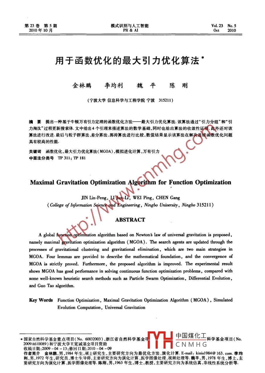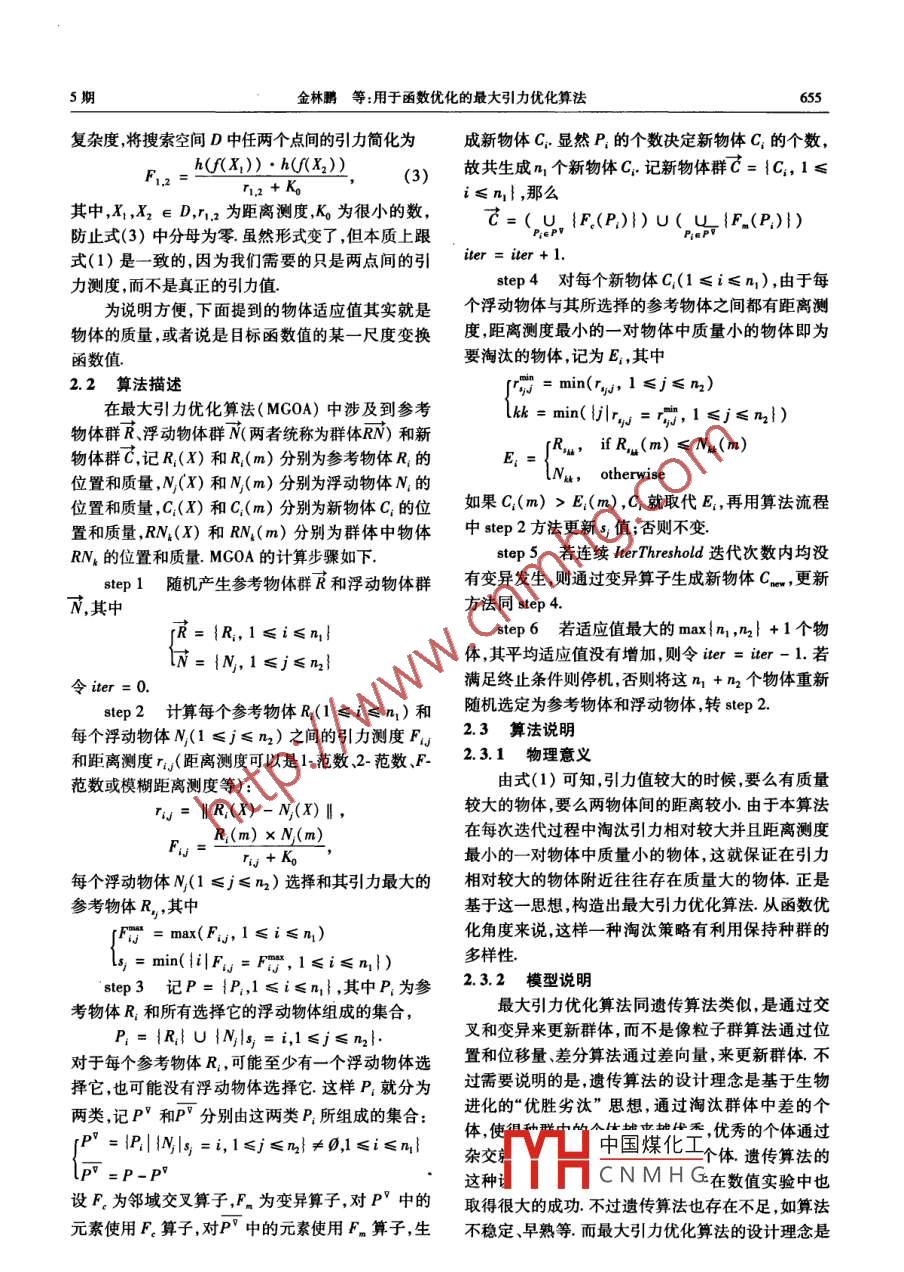 第23卷第5期模式識別與人工智能Vol.23 No.52010年10月.PR&AIOct 2010用于函數(shù)優(yōu)化的最大引力優(yōu)化算法*金林鵬李均利魏平陳剛(寧波大學(xué)信息科學(xué)與工程學(xué)院寧波315211)摘要提出一種基于牛頓萬 有引力定理的函數(shù)優(yōu)化方法一最大引力優(yōu)化算法. 該算法通過“引力分組"和“引力淘汰”過程更新搜索體.文中給出4個引理來描述算法的數(shù)學(xué)基礎(chǔ),同時也給出算法的收斂性證明.此外還對該算法進行改進.最后與粒子群算法、差分算法、郭濤算法進行比較,數(shù)值結(jié)果顯示該算法在解決連續(xù)函數(shù)優(yōu)化問題具有較高的性能.關(guān)鍵詞函數(shù)優(yōu)化,最大引力優(yōu)化算法( MG0A) ,模擬進化計算,萬有引力中圖法分類號TP311; TP 181Maximal Gravitation Optimization Algorithm for Function OptimizationJIN Lin-Peng, L Jun-Li, WEI Ping, CHEN Gang(College of Information Science and Enginering, Ningbo University, Ningbo 315211)ABSTRACTA global function optimization algorithm based on Newtons law of universal gravitation is proposed,namely maximal gravitation optimization algorithm ( MG0A). The search agents are updated through theprocesses of gravitational clustering and gravitational elimination, which are two main strategies inMG0A. Four lemmas are provided to describe the mathematical foundation, and the convergence ofMGOA is strictly proved. Furthermore, the proposed algorithm is improved. The experimental resultshows MGOA has good performance in solving continuous function optimization problems, compared withsome well-known heuristic search methods such as Particle Swarm Optimization, Differential Evolution,and Guo Tao algorithm.Key Words Function Optimization, Maximal Gravitation Optimization Algorithm ( MGOA) , SimulatedEvolution Computation, Universal Gravitation中國煤化工,*國家自然科學(xué)基金重點項目(No.60832003) 、浙江省自然科學(xué)基金項科學(xué)基金項目(No.2009 A610089)和寧大學(xué)王寬誠基金項目資助MYHCNMHG收稿日期:2009 -04 - 13;修回日期:2010-04 -09作者簡介金林鵬,男,1984 年生,碩士研究生,主要研究方向為最優(yōu)化方法、演化計算. E-mail: kinis1984@ 163. com.李均利,男,1972年生,研究員,博士生導(dǎo)師,主要研究方向為演化計算、醫(yī)學(xué)圖像處理、視頻處理等.魏平,男,1978年生,博士,主要研究方向為演化計算醫(yī)學(xué)圖像處理等.陳剛,男,1963年生,博士,教授,主要研究方向為系統(tǒng)仿真非線性系統(tǒng)分析等。654模式識別與人工智能23卷1引言Kang等[I5]提出的基于引力的粒子群算法(ParticleSwarm Optimization Based on Gravitation Field Model,優(yōu)化是一個古老的問題,追求最優(yōu)目標一直是CPSO) ,則是在原粒子群算法的基礎(chǔ)上加上由引力人類的理想,長期以來.人們對最優(yōu)化問題進行不斷產(chǎn)生的加速度項.的探討和研究,發(fā)展了許多確定有效的優(yōu)化方法,如以上四種算法均是基于“位置+位移量”計算牛頓法、共軛梯度法、單純形法等.然而很多優(yōu)化問模型(同粒子群算法類似),受萬有引力公式啟發(fā),題的函數(shù)性質(zhì)十分復(fù)雜,解析性質(zhì)不清晰,甚至可能模擬動態(tài)的物理運動過程.唯--不同的是他們的更沒有具體的函數(shù)表達式.傳統(tǒng)優(yōu)化算法在求解這些新公式,問題,無論是在計算速度、收斂性、初值敏感性等方本文提出的最大引力優(yōu)化算法( Maximal Gravi-面都遠不能滿足要求.20世紀50年代中期出現(xiàn)仿tation Optimization Algorithm, MGOA)亦是基于牛頓生學(xué)學(xué)科,人們很快從生物進化的機理和仿生學(xué)中引力公式,不同的是,1)該算法不是模擬一個動態(tài).得到啟示,提出多種求解優(yōu)化問題的模擬進化方法,的物理運動過程,而是模擬一個物理現(xiàn)象:在-一個有如遺傳算法"、模擬退火算法[2]、免疫算法']、蟻群很多物體的空間中,最大引力值存在于質(zhì)量最大物算法[4]、粒子群算法'5]、差分算法[°1等,并取得巨大體的附近;2)其計算所得的引力僅僅是一個測度,成功.并不是真正意義的引力,同時計算引力測度是為后對于引力模擬局部搜索( Gravitational Emulation來“引力分組過程”提供依據(jù);3)其計算模型是基于Local Search, GELS)"的研究,最初概念性框架是“ 交叉變異"(同遺傳算法類似),而不是基于“位置由Voudouris 和Tsang 于1995年提出,Webster[8])發(fā)+位移量”;4)該算法從確定交叉、變異的個體到確展了它.該算法可形象描述為一個在介質(zhì)上滾動的定淘汰個體,均是基于萬有引力現(xiàn)象,同遺傳算法球,介質(zhì)上有很多的坑,坑有深有淺球在滾動過程“優(yōu)勝劣汰"思想有著本質(zhì)的區(qū)別.中由于介質(zhì)摩擦力而逐漸失去動力.如果該球正滾進坑里,它就獲得了動力;如果該球正滾出坑,它將2基于牛頓引力公式的最大引力失去動力.算法的理念是由于引力的影響,球最終會優(yōu)化算法停留在某個坑里. Balachandar91 在Webster 的基礎(chǔ)上提出隨機引力模擬搜索( Randomized Gravitational2.1基本概念Emulation Search, RGES)算法,克服其收斂速度慢、解的質(zhì)量不高等問題,使其求解能力大大提高.這3萬有引力是兩個具有質(zhì)量的物體間相互吸引的種引力模擬搜索算法用于求解旅行商向題(Trave-作用,存在于任何有質(zhì)量的物體之間.兩個物體間的ling Salesman Problem, TSP)等組合優(yōu)化問題,求解引力大小,跟它們之間質(zhì)量的乘積成正比,跟它們的機制基于離散的路徑