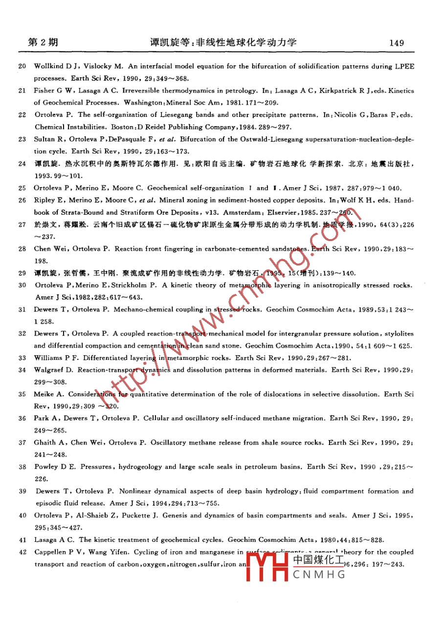 第13卷第2期地球科學(xué)進展Vol 13 No. 21998年4月ADVANCE IN EARTH SCIENCESApr, 1998非線性地球化學(xué)動力學(xué)譚凱旋(中國科學(xué)院長沙大地構(gòu)造研究所長沙410013戴塔根(中南工業(yè)大學(xué)地質(zhì)親長沙410083)摘要非線性地球化學(xué)動力學(xué)的研究主要包括五個方面:①地球化學(xué)非線性反應(yīng)動力學(xué);②礦物沉淀、結(jié)晶與生長的非線性動力學(xué);③流休流動-反應(yīng)耦合的非線性動力學(xué);④力學(xué)一化學(xué)耦合的非線性動力學(xué);⑤地球化學(xué)循環(huán)的非線性動力學(xué)或非線性全球動力學(xué)。分別總結(jié)了上述五個方面的研究進展,討論了地球化學(xué)非線性動力學(xué)研究中存在的問題和今后的發(fā)展方向。關(guān)鍵詞非線性現(xiàn)象非線性親統(tǒng)非線性動力學(xué)地球化學(xué)分類號P59/O643.1近二十多年來,地球化學(xué)已開始從平衡的靜態(tài)描述轉(zhuǎn)向重視其作用過程的動力學(xué)研究。越來越多的野外觀察、實驗與理論研究-3)表明,地球化學(xué)系統(tǒng)是開放的和非平衡的復(fù)雜系統(tǒng),許多地球化學(xué)作用是復(fù)雜的非線性動力學(xué)過程。因此,地球化學(xué)中的非平衡非線性現(xiàn)象及其動力學(xué)的研究引起了人們的廣泛關(guān)注,隨著非線性科學(xué)的理論發(fā)展及其在地球化學(xué)中的引入和應(yīng)用,一門新興的地球化學(xué)分支學(xué)科—非線性地球化學(xué)動力學(xué)正在逐步誕生。根據(jù)地球化學(xué)作用體系的特征、主要動力學(xué)過程和目前的研究現(xiàn)狀,就非線性地球化學(xué)動力學(xué)的以下五個主要研究方面的主要研究進展做初步分析和總結(jié)。地球化學(xué)非線性反應(yīng)動力學(xué)化學(xué)反應(yīng)是一種最重要的地球化學(xué)作用,例如水巖反應(yīng)(礦物溶解反應(yīng))影響到巖石的風(fēng)化、環(huán)境變化、水質(zhì)、成礦元素活化遷移與礦床的形成等。目前國內(nèi)外廣泛開展了對造巖礦物和部分金屬硫化礦物的溶解動力學(xué)的實驗與理論研究,認識到開放體系、非平衡和不可逆性是地球化學(xué)反應(yīng)體系的普遍而重要的特征3,并建立了一些地球化學(xué)反應(yīng)動力學(xué)·中國科學(xué)院重點項目“構(gòu)造成礦作用的非線性動力學(xué)研究”(項A和國家博士后基金項目地洼盆地構(gòu)造一流體演化與成礦作用的非線性動力學(xué)研究中國煤化工第一作者簡介:譚凱旋,男,1963年3月出生,副研究員,主要從CNMHG學(xué)研究收稿日期:1997-05-20;修改稿:1997-09-27146地球科學(xué)進展第13卷的實驗方法(如連續(xù)流動攪拌反應(yīng)器等)和理論模式。特別是近年來通過實驗陸續(xù)發(fā)現(xiàn)了化學(xué)振蕩、混沌振蕩、化學(xué)分形等非線性現(xiàn)象68)文獻〔6〕報道了螢石溶解動力學(xué)過程中的化學(xué)振蕩和反應(yīng)速率隨反應(yīng)時間波動變化的非線性現(xiàn)象。文獻7在花崗閃長巖、長石等的風(fēng)化淋濾實驗中,發(fā)現(xiàn)了溶液中Si和A濃度的振蕩現(xiàn)象,并進行了簡單的動力學(xué)分析。譚凱旋等(9對輝銅礦和黃銅礦在NaCl溶液中的溶解動力學(xué)進行了系統(tǒng)的實驗,發(fā)現(xiàn)在弱酸性至弱堿性(pH=3.04~11.0)條件下,它們?nèi)芙膺^程中Cu濃度隨反應(yīng)時間發(fā)生明顯振蕩變化的現(xiàn)象,且不同的pH值和NaCl濃度的條件下甚至在同一實驗中振蕩幅度和周期都是變化的,即表現(xiàn)為非周期混沌振蕩。利用時間系列數(shù)據(jù)分析法對實驗數(shù)據(jù)進行了分析,輝銅礦和黃銅礦的溶解反應(yīng)過程存在混沌吸引子,輝銅礦溶解動力系統(tǒng)的混沌吸引子分維值為1.45~3.35,相空間維數(shù)為4;黃銅礦溶解動力系統(tǒng)的混沌吸引子分維值為3.25~349,相空間維數(shù)為5。最近,我們又對輝銅礦和黃銅礦在酸性NaCl溶液中的溶解動力學(xué)作了進一步的實驗,發(fā)現(xiàn)了溶解速率隨反應(yīng)時間發(fā)生明顯振蕩變化的新現(xiàn)象。這些都表明輝銅礦和黃銅礦的溶解作用是一個非線性反應(yīng)過程。2礦物沉淀、結(jié)晶和生長的非線性動力學(xué)巖石和礦物中廣泛存在物質(zhì)組分或礦物的振蕩型分帶構(gòu)造,例如斜長石的環(huán)帶構(gòu)造、條紋長石、瑪瑙的環(huán)帶構(gòu)造與纖維狀扭曲、球狀巖石、層狀火成侵入體、矽卡巖條帶狀構(gòu)造鈣球與鮞粒、礦物中微量元素的振蕩變化、粘土礦物和稀土礦物中結(jié)構(gòu)單元層的混層等。目前普遍認為大多數(shù)這種構(gòu)造是礦物沉淀、結(jié)晶和生長過程中的非線性動力學(xué)機制形成的自組織現(xiàn)象(1目前,國內(nèi)外許多研究者(1-1°分別從考慮界面反應(yīng)與擴散、晶面多重態(tài)和界面質(zhì)量守恒等角度建立了巖漿中礦物結(jié)晶和生長的動力學(xué)模型,通過對模型的分析和模擬計算研究了礦物和巖石中一些振蕩分帶形成的動力學(xué)。對火成巖中礦物結(jié)晶的分形特征及其動力學(xué)機理()和礦物結(jié)晶過程中的形態(tài)不穩(wěn)定性及復(fù)雜礦物形態(tài)形成的動力學(xué)機理120也做了初步研究。此外,還應(yīng)用奧斯特瓦爾德一李澤岡過飽和一成核一消耗循環(huán)及奧斯特瓦爾德成熟作用引起的競爭性顆粒生長的動力學(xué)模型研究了溶