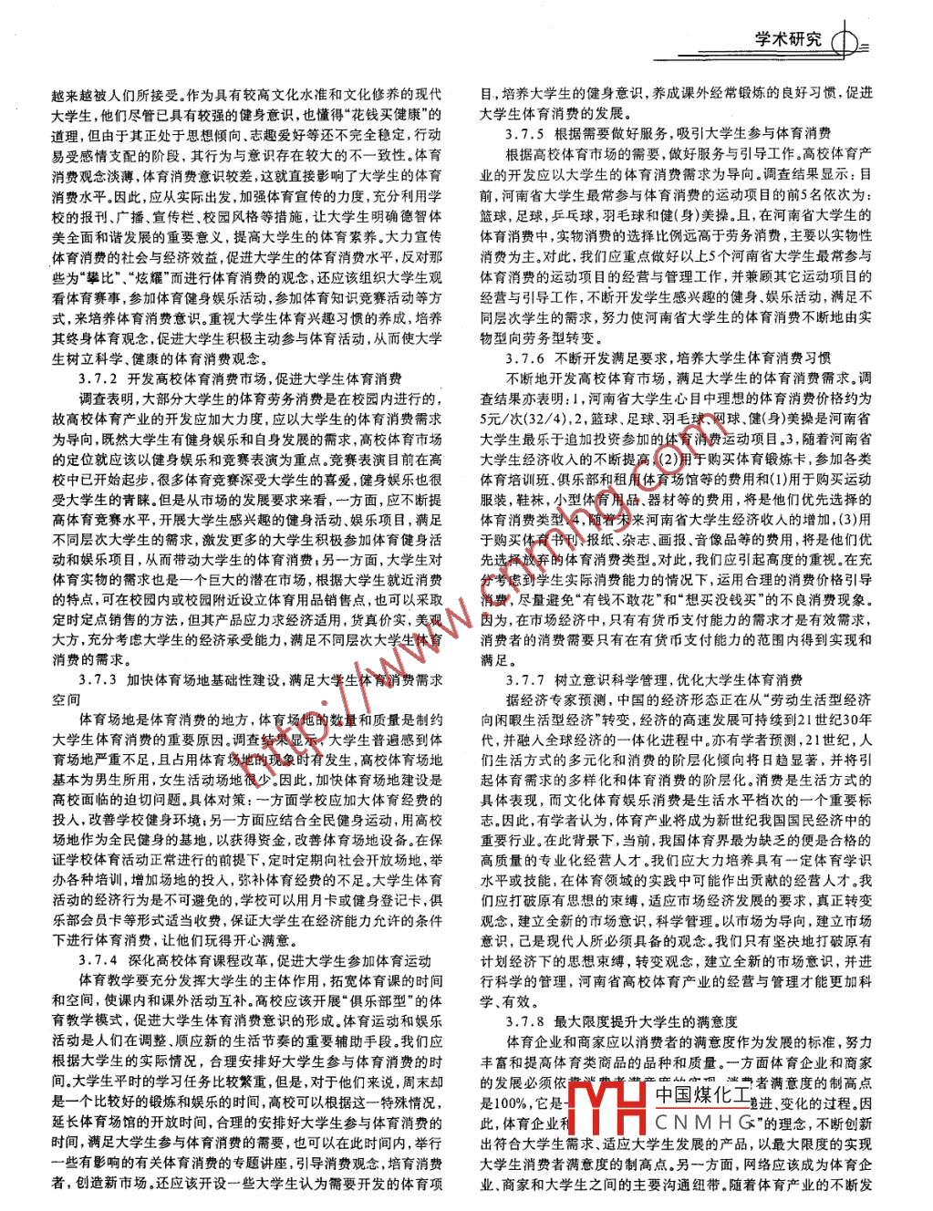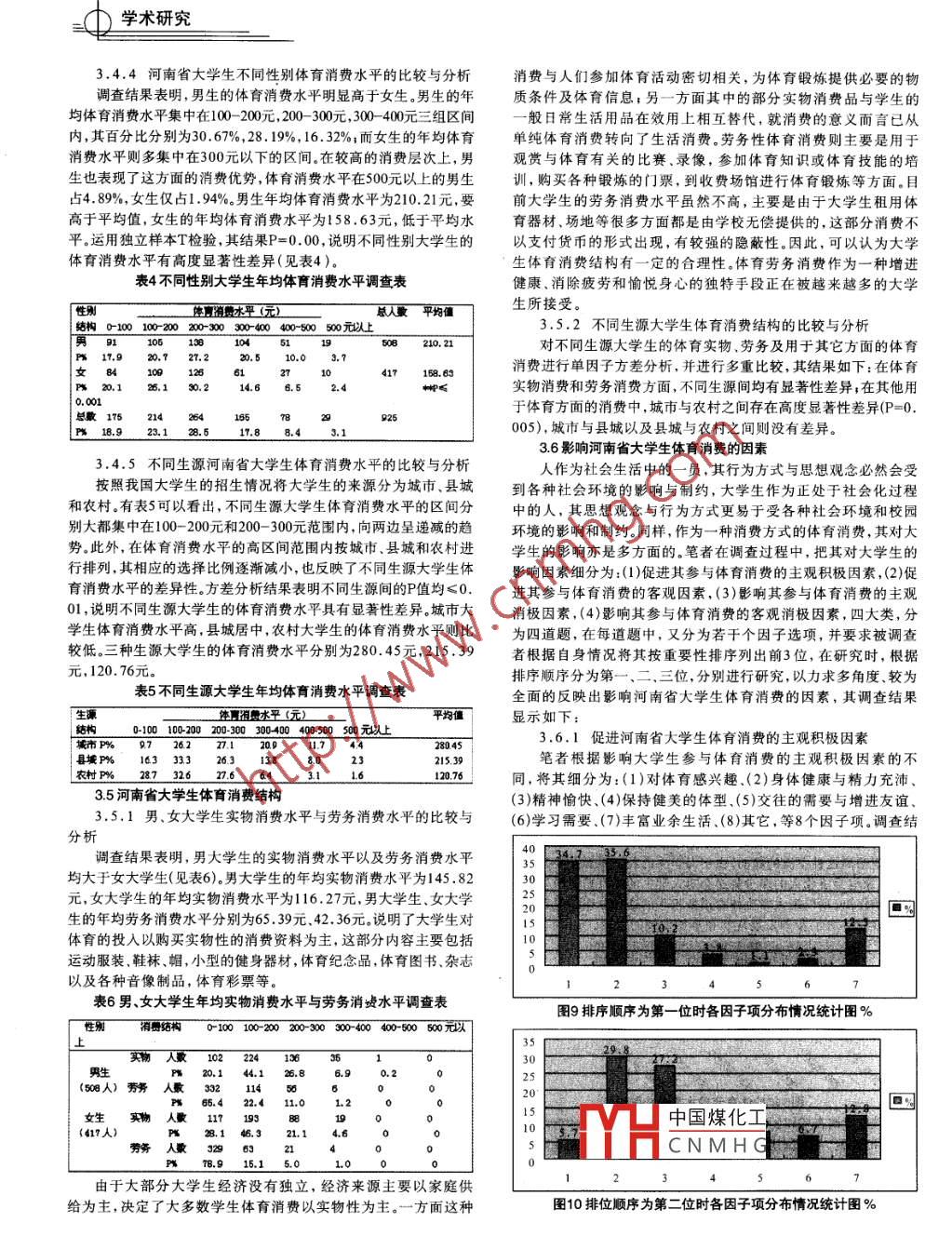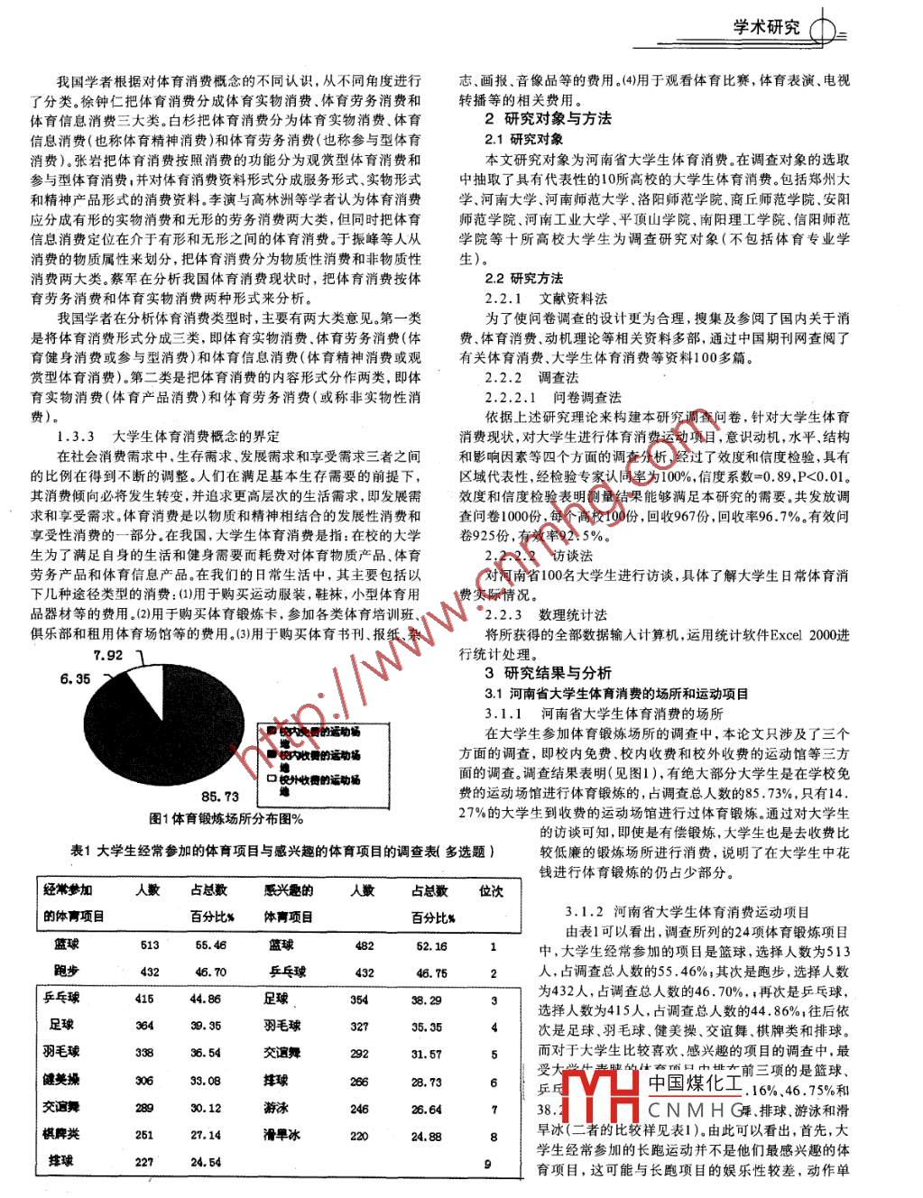 學(xué)術(shù)研究D=我國學(xué)者根據(jù)對體育消費概念的不同認(rèn)識,從不同角度進(jìn)行志畫報.音像品等的費用。(4)用于觀看體育比賽,體育表演、電視了分類。徐鐘仁把體育消費分成體育實物消費.體育勞務(wù)消費和轉(zhuǎn)播等的相關(guān)費用。體育信息消費三大類。白杉把體育消費分為體育實物消費、體育2研究對象與方法信息消費(也稱體育精神消費)和體育勞務(wù)消費(也稱參與型體育2.1研究對象消費)。張巖把體育消費按照消費的功能分為觀賞型體育消費和本文研究對象為河南省大學(xué)生體育消費。在調(diào)查對象的選取參與型體育消費;并對體育消費資料形式分成服務(wù)形式、實物形式中抽取了具有代表性的10所高校的大學(xué)生體育消費。包括鄭州大和精神產(chǎn)品形式的消費資料。李演與高林洲等學(xué)者認(rèn)為體育消費學(xué)、河南大學(xué).河南師范大學(xué).洛陽師范學(xué)院、商丘師范學(xué)院.安陽應(yīng)分成有形的實物消費和無形的勞務(wù)消費兩大類,但同時把體育師范學(xué)院.河南工業(yè)大學(xué)、平頂山學(xué)院、南陽理工學(xué)院.信陽師范信息消費定位在介于有形和無形之間的體育消費。于振峰等人從學(xué)院等十所高校大學(xué)生為調(diào)查研究對象(不包括體育專業(yè)學(xué)消費的物質(zhì)屬性來劃分,把體育消費分為物質(zhì)性消費和非物質(zhì)性消費兩大類。蔡軍在分析我國體育消費現(xiàn)狀時,把體育消費按體2.2研究方法育勞務(wù)消費和體育實物消費兩種形式來分析。2.2.1文獻(xiàn)資料法我國學(xué)者在分析體育消費類型時,主要有兩大類意見。第一類為了使問卷調(diào)查的設(shè)計更為合理,搜集及參閱了國內(nèi)關(guān)于消是將體育消費形式分成三類,即體育實物消費.體育勞務(wù)消費(體費、體育消費.動機理論等相關(guān)資料多部,通過中國期刊網(wǎng)查閱了育健身消費或參與型消費)和體育信息消費(體育精神消費或觀有關(guān)體育消費、大學(xué)生體育消費等資料100多篇。賞型體育消費)。第二類是把體育消費的內(nèi)容形式分作兩類,即體2.2.2調(diào)查法育實物消費(體育產(chǎn)品消費)和體育勞務(wù)消費(或稱非實物性消2.2.2.1問卷 調(diào)查法費)。依據(jù).上述研究理論來構(gòu)建本研究調(diào)查問卷,針對大學(xué)生體育1.3.3大學(xué)生體育消費概念的界定消費現(xiàn)狀,對大學(xué)生進(jìn)行體育消費運動項目,意識動機,水平、結(jié)構(gòu)在社會消費需求中,生存需求,發(fā)展需求和享受需求三者之間和影響因素等四個方面的調(diào)查分析,經(jīng)過了效度和信度檢驗,具有的比例在得到不斷的調(diào)整。人們在滿足基本生存需要的前提下,區(qū)域代表性,經(jīng)檢驗專家認(rèn)同率為100%,信度系數(shù)=0.89,P<0.01。其消費傾向必將發(fā)生轉(zhuǎn)變,并追求更高層次的生活需求,即發(fā)展需效度和信度檢驗表明測量結(jié)果能夠滿足本研究的需要。共發(fā)放調(diào)求和享受需求。體育消費是以物質(zhì)和精神相結(jié)合的發(fā)展性消費和查問卷1000份,每個高校100份,回收967份,回收率96.7% .有效問享受性消費的一部分 。在我國,大學(xué)生體育消費是指:在校的大學(xué)卷925份,有效率92.5%。生為了滿足自身的生活和健身需要而耗費對體育物質(zhì)產(chǎn)品.體育2.2.2.2訪談法勞務(wù)產(chǎn)品和體育信息產(chǎn)品。在我們的日常生活中,其主要包括以對河南省100名大學(xué)生進(jìn)行訪談,具體了解大學(xué)生日常體育消下幾種途徑類型的消費:(1)用于購買運動服裝,鞋襪,小型體育用費實際情況。品器材等的費用。(2)用于購買體育鍛煉卡,參加各類體育培訓(xùn)班、2.2.3數(shù)理統(tǒng)計法俱樂部和租用體育場館等的費用。(3)用于購買體育書刊、報紙、雜將所獲得的全部數(shù)據(jù)輸人計算機,運用統(tǒng)計軟件Excel 2000進(jìn)7.92行統(tǒng)計處理。6.353研究結(jié)果與分析3.1河南省大學(xué)生體育消費的場所和運動項目3.1.1河南 省大學(xué)生體育消費的場所。校內(nèi)免費的運動福在大學(xué)生參加體育鍛煉場所的調(diào)查中,本論文只涉及了三個D校內(nèi)收費的運動揚方面的調(diào)查,即校內(nèi)免費.校內(nèi)收費和校外收費的運動館等三方口校外收費的運動場面的調(diào)查。調(diào)查結(jié)果表明(見圖1),有絕大部分大學(xué)生是在學(xué)校免85. 73 .費的運動場館進(jìn)行體育鍛煉的,占調(diào)查總?cè)藬?shù)的85.73%,只有14.27%的大學(xué)生到收費的運動場館進(jìn)行過體育鍛煉。通過對大學(xué)生圖1體育鍛煉場所分布圖%的訪談可知,即使是有償鍛煉,大學(xué)生也是去收費比表1大學(xué)生經(jīng)常參加的體育項目與感興趣的體育項目的調(diào)查表(多選題)較低廉的鍛煉場所進(jìn)行消費,說明了在大學(xué)生中花錢進(jìn)行體育鍛煉的仍占少部分。經(jīng)常參加人數(shù)占總數(shù)感興趣的人欺.占總數(shù)位次的體離項目百分比%體青項目3.1.2河南省大學(xué)生體育消費運動項目由表1可以看出,調(diào)查所列的24項體育鍛煉項目籃球61362. 16中,大學(xué)生經(jīng)常參加的項目是籃球,選擇人數(shù)為513跑步43246. 70.乓球3246. 75人,占調(diào)查總?cè)藬?shù)的55.46%;其次是跑步,選擇人數(shù)為432人,占調(diào)查總