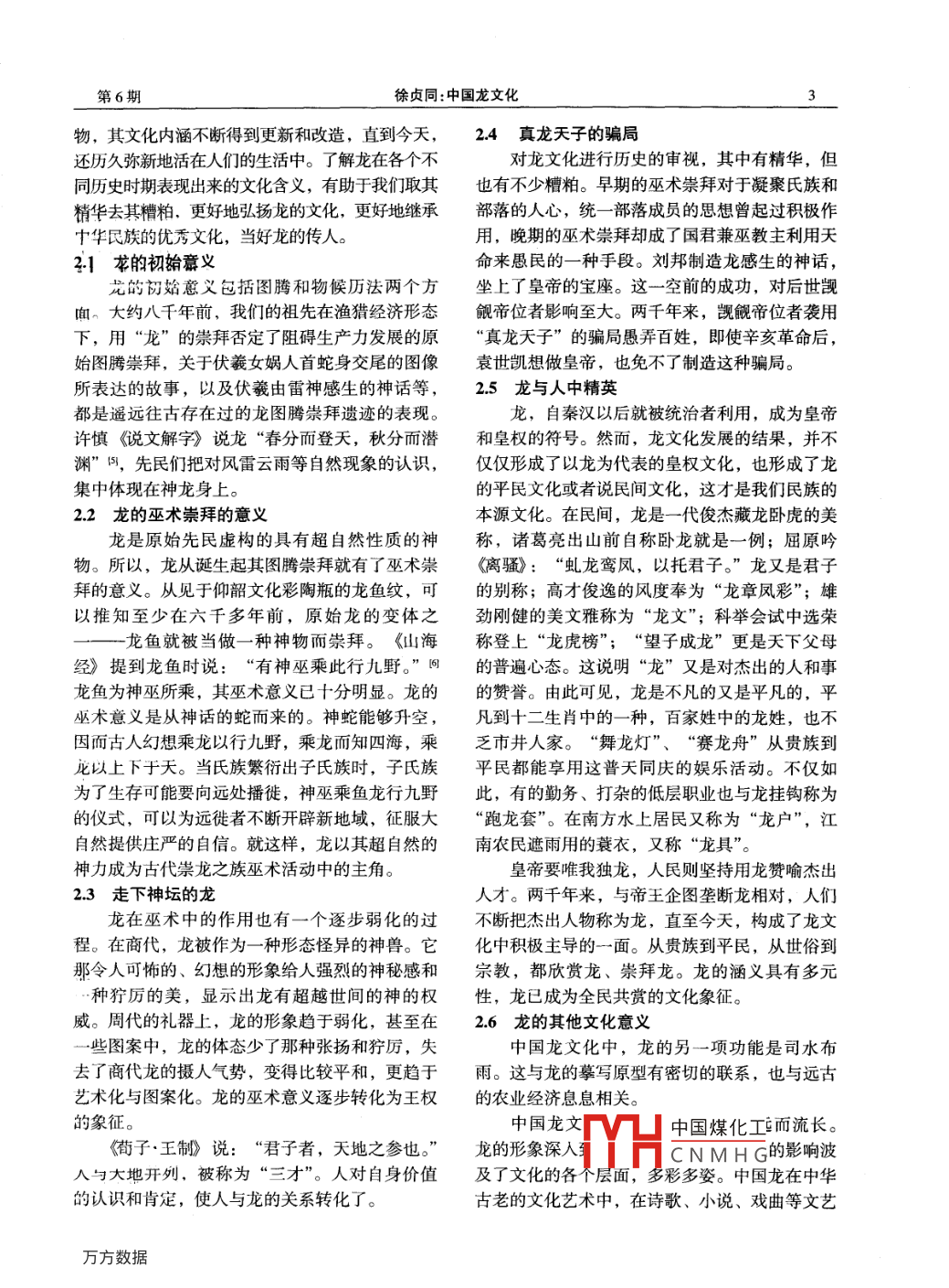 第12卷第6期泰州職業(yè)技術(shù)學(xué)院學(xué)報Vol 12 No 6012年12月Journal of Taizhou Polytechnic CollegeDec 2012中國龍文化徐貞同(泰州職業(yè)技術(shù)學(xué)院,江蘇泰州225300)摘要:中國是一個龍的國度。龍文化是中國文化奮發(fā)精神的象征,龍文化體現(xiàn)的兼容綜合、造福眾生、開拓進(jìn)取、與天和諧的主體精神,是中華文化生生不息的優(yōu)良傳統(tǒng)。文章介紹了龍的起源與發(fā)展,闡述了龍的文化意蘊(yùn),分析了龍文化的歷史意義和現(xiàn)代價值關(guān)鍵詞:中國;龍;文化中圖分類號:G641文獻(xiàn)標(biāo)識碼:B文章編號:1671-0142(2012)06-0001-05中國是一個龍的國度。龍在中國人心目中、吸收了許多別的形形色色的圖騰,這樣大蛇就有在中華民族、中國文化中呈現(xiàn)出特有的生命力,了馬的頭、鹿的角、蛇的身、雞的爪……于是并且深入到中華文明的每一個細(xì)胞當(dāng)中。龍對于我們的祖先創(chuàng)造了“龍”的形象。我們?nèi)A夏子孫來說,就是民族的遺傳基因,是民龍的傳說在史前就很盛行,幾乎與中華文化族精神的寄托。海內(nèi)外華人,只要是炎黃子孫,樣古老。最早的崇龍之族是傳說中的太皞族。無不以龍的子孫而自豪,以龍的傳人而驕傲。但《左傳》記載,“太皞氏以龍紀(jì)”,就是說太皞中國的龍是什么,為什么說我們是龍的傳人?龍氏以龍為圖騰。太皞族在東遷、西徙的過程中,的傳人為什么值得我們自豪?中國龍文化有哪些不斷地繁衍,也不斷地與其他氏族融合,炎帝和豐富而深刻的內(nèi)涵?對我們今天的生活有哪些影黃帝都源出原始的崇龍之族太皞族。伏羲、女媧響?作為龍的子孫,我們應(yīng)該搞清楚這些問題。是傳說中中華民族的始祖,東漢《武梁祠石室畫像》中有人首蛇身的伏羲、女媧形象,展示了伏1龍的起源與發(fā)展羲氏、女媧氏都是以龍為圖騰的。后來,黃帝統(tǒng)!龍的起源一各個部族,為了體現(xiàn)黃帝作為總酋長的特殊權(quán)威在古生物學(xué)中,龍是指生活在距今兩億二千和代表性,黃帝用的族徽就將許多氏族圖騰的一部日牛到七千萬年以前的爬行動物。中國文化分綜合成頭似駝,角似鹿,眼似兔,耳似牛,項似領(lǐng)域中的龍,并不是這種地球上普遍存在過的自蛇,腹似蜃,鱗似鯉,爪似鷹,掌似虎的形象。綜然動物。聞一多說:龍“是只存在于圖騰中而不合的龍圖騰,代表了華夏民族的大一統(tǒng)。存在于生物界中的一種虛擬的生物?!苯兴且环N自華夏族形成國家伊始,就開始了龍的傳人中國文化中獨(dú)有的人文動物。史,第一代王朝夏就承繼了龍的圖騰。相傳,夏王關(guān)于龍的起源有星象說、動物崇拜說、閃電朝的旗幟上畫著兩條相交的龍,用具上也都飾以龍說、生殖崇拜說、綜合圖騰說等多種說法。聞一紋。所以,禹是中國第一代君主,也是龍的第多先生在上世紀(jì)四十年代提出的綜合圖騰說認(rèn)代傳人。與華夏族相鄰的少數(shù)民族地區(qū)也不乏龍的為,龍是一種圖騰,它是由許多不同的圖騰揉合傳說。中國古代北方的匈奴人南方的楚人、越而成的。圖騰未合并以前,所謂龍只是一種大人、粵人中國煤化工以龍為圖騰蛇。后來,有一個以這種大蛇為圖騰的團(tuán)族兼并的民族。所以CNMHG作者簡介:徐貞同(1952-),女,江蘇泰州人副教授泰州職業(yè)技術(shù)學(xué)院學(xué)報第6期復(fù)合龍圖騰的產(chǎn)生根源在于氏族部落的聯(lián)的合體形式,獸頭聯(lián)接一條蛇一樣的身軀,有肢合。人類在氏族社會階段,總的發(fā)展趨勢是由孤爪。這種龍紋被視為商周時期龍紋的代表。立、分裂走向聯(lián)合,由氏族而部落,由部落而部到春秋戰(zhàn)國時期,龍紋發(fā)生了神奇多姿的瑰落聯(lián)盟。在這種漫長的演變過程中,強(qiáng)吞弱、大麗變化。飛龍、蛟龍、螭龍,還有龍車、龍舟壓小,作為氏族或部落標(biāo)志的圖騰亦隨之融合或等。秦漢以后,龍紋千姿百態(tài):有翅的應(yīng)龍消亡,大的部族中,往往容納著原來信奉不同圖黃、白、青等各色的龍,行龍、游龍、團(tuán)龍、正騰的氏族,經(jīng)過眾多圖騰的合并與交融,就形成面龍,戲珠的單龍、雙龍、群龍。變體龍紋除螭了一個共有的圖騰。各個部族的圖騰合并為龍龍、虺(hui)龍外,還有夔龍、虬龍、蟠螭的形象,龍的權(quán)限和神通不斷得到擴(kuò)大,從而成龍生九子不成龍等。龍紋與其它紋飾的組合更是為整個華夏族的圖騰象征,進(jìn)而發(fā)展成為中華民豐富多采:云龍、火龍、穿花龍;龍鳳、龍蛇、族的精神象征。這實際上也生動地反映了華夏族龍虎;四靈、十二生肖等多種多樣。內(nèi)部,通過相互交流或兼并,而逐步融合為統(tǒng)唐代龍紋的龍首具有鮮明的時代特征:口角整體的歷史過程。中國龍復(fù)合形態(tài)的形成是氏族加深,上唇翹起,雙角分叉。龍身多網(wǎng)絡(luò)狀鱗片族徽、氏族之間以及氏族文化之間的一個多角度紋,前腿與身的關(guān)節(jié)處長翼,背脊帶鰭,尾為蛇全方位的融合過程,是中國人綜合運(yùn)用綜合思維形,身體多呈S形。有的蜿蜒伸展,有的呈騰飛對多種生物兼容并蓄的成果,也是中國人早在史狀,呈現(xiàn)出大唐盛世的文明氣質(zhì)前時期就已粗具的文化風(fēng)格。中國人的文化兼容宋代的龍紋形體越來越長,腿足變短變細(xì)心理和綜合思維方式創(chuàng)造了中國龍的獨(dú)特形態(tài)。爪