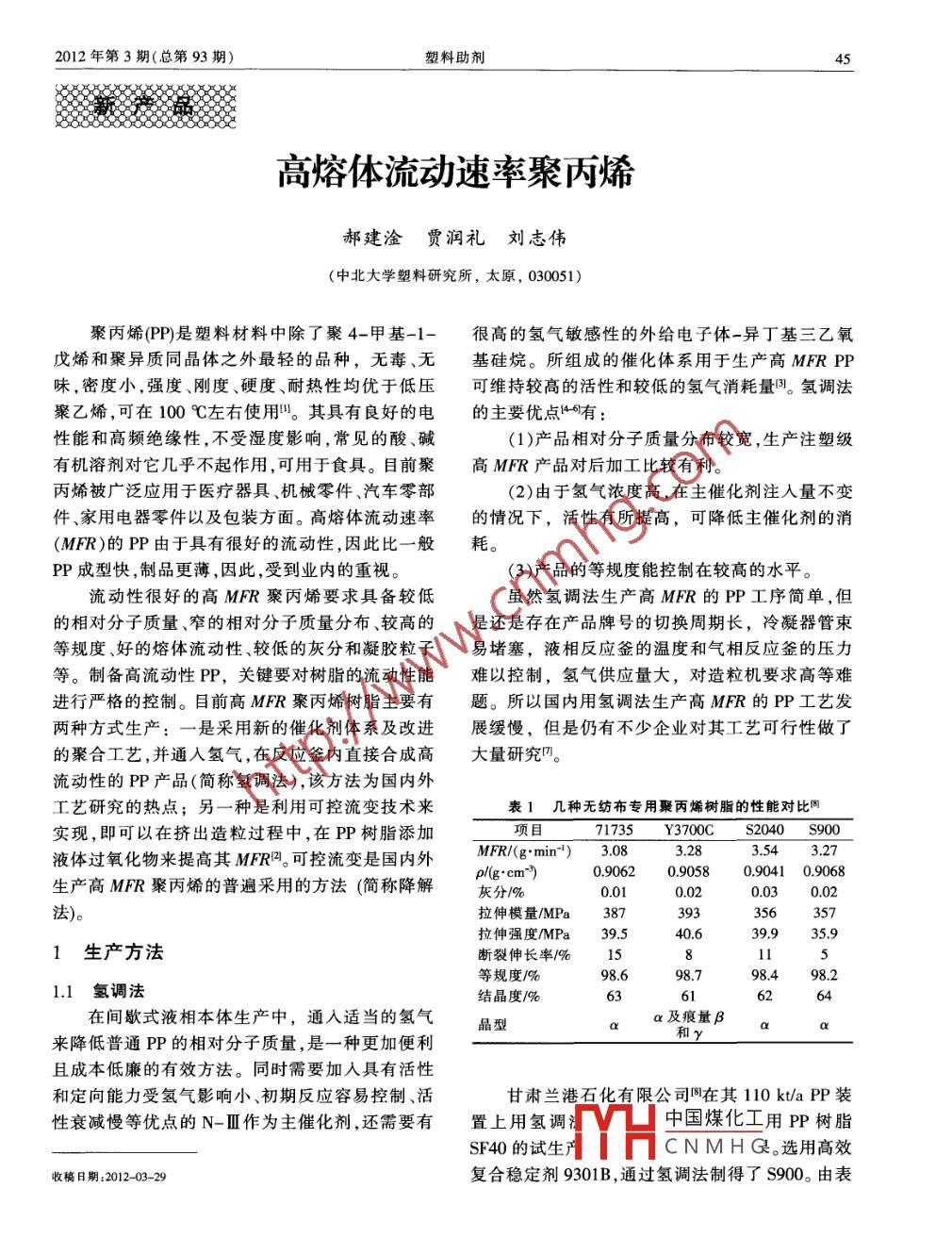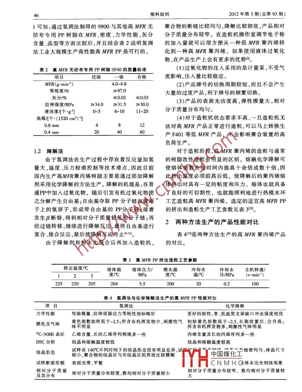 2012年第3期(總第93期)塑料助劑多新感最菱高熔體流動(dòng)速率聚丙烯郝建淦賈潤(rùn)禮劉志偉(中北大學(xué)塑料研究所,太原,030051)聚丙烯(PP)是塑料材料中除了聚4-甲基-1-很髙的氫氣敏感性的外給電子體-異丁基三乙氧戊烯和聚異質(zhì)同晶體之外最輕的品種,無(wú)毒、無(wú)基硅烷。所組成的催化體系用于生產(chǎn)高 MER PP味,密度小,強(qiáng)度、剛度、硬度、耐熱性均優(yōu)于低壓可維持較高的活性和較低的氫氣消耗量。氫調(diào)法聚乙烯,可在100℃左右使用叫。其具有良好的電的主要優(yōu)點(diǎn)1有性能和高頻絕緣性,不受濕度影響,常見(jiàn)的酸、堿(1)產(chǎn)品相對(duì)分子質(zhì)量分布較寬,生產(chǎn)注塑級(jí)有機(jī)溶劑對(duì)它幾乎不起作用,可用于食具。目前聚高M(jìn)FR產(chǎn)品對(duì)后加工比較有利。丙烯被廣泛應(yīng)用于醫(yī)療器具、機(jī)械零件、汽車(chē)零部(2)由于氫氣濃度高,在主催化劑注入量不變件、家用電器零件以及包裝方面。高熔體流動(dòng)速率的情況下,活性有所提高,可降低主催化劑的消MFR)的PP由于具有很好的流動(dòng)性,因此比一般耗。PP成型快,制品更薄,因此,受到業(yè)內(nèi)的重視。(3)產(chǎn)品的等規(guī)度能控制在較高的水平流動(dòng)性很好的高M(jìn)FR聚丙烯要求具備較低雖然氫調(diào)法生產(chǎn)高M(jìn)FR的PP工序簡(jiǎn)單,但的相對(duì)分子質(zhì)量、窄的相對(duì)分子質(zhì)量分布、較高的是還是存在產(chǎn)品牌號(hào)的切換周期長(zhǎng),冷凝器管束等規(guī)度、好的熔體流動(dòng)性、較低的灰分和凝膠粒子易堵塞,液相反應(yīng)釜的溫度和氣相反應(yīng)釜的壓力等。制備高流動(dòng)性PP,關(guān)鍵要對(duì)樹(shù)脂的流動(dòng)性能難以控制,氫氣供應(yīng)量大,對(duì)造粒機(jī)要求高等難進(jìn)行嚴(yán)格的控制。目前高M(jìn)FR聚丙烯樹(shù)脂主要有題。所以國(guó)內(nèi)用氫調(diào)法生產(chǎn)高M(jìn)FR的PP工藝發(fā)兩種方式生產(chǎn):一是采用新的催化劑體系及改進(jìn)展緩慢,但是仍有不少企業(yè)對(duì)其工藝可行性做了的聚合工藝,并通入氫氣,在反應(yīng)釜內(nèi)直接合成高大量研究m流動(dòng)性的PP產(chǎn)品(簡(jiǎn)稱(chēng)氫調(diào)法),該方法為國(guó)內(nèi)外工藝研究的熱點(diǎn);另一種是利用可控流變技術(shù)來(lái)表1幾種無(wú)紡布專(zhuān)用聚丙烯樹(shù)脂的性能對(duì)比實(shí)現(xiàn),即可以在擠出造粒過(guò)程中,在PP樹(shù)脂添加項(xiàng)目71735Y3700CS2040S900液體過(guò)氧化物來(lái)提高其MFR??煽亓髯兪菄?guó)內(nèi)外MFR/(gmin") 3.083.28生產(chǎn)高M(jìn)RR聚丙烯的普遍采用的方法(簡(jiǎn)稱(chēng)降解p/g·cm-0.9062090580.904109068灰分%0.010.020.030.02法)。拉伸模量MPa387356357拉伸強(qiáng)度MPa39.53991生產(chǎn)方法斷裂伸長(zhǎng)率%15等規(guī)度/%698.79849821.1氫調(diào)法結(jié)晶度%在間歇式液相本體生產(chǎn)中,通入適當(dāng)?shù)臍錃馄沸图昂哿緽a來(lái)降低普通PP的相對(duì)分子質(zhì)量,是一種更加便利且成本低廉的有效方法。同時(shí)需要加入具有活性和定向能力受氫氣影響小、初期反應(yīng)容易控制、活甘肅蘭港石化有限公司國(guó)在其110 kt/a PP裝性衰減慢等優(yōu)點(diǎn)的N-Ⅲ作為主催化劑,還需要有置上用氫調(diào)中國(guó)煤化工用PP樹(shù)脂SF40的試生CNMH(。選用高效收稿日期:2012-03-29復(fù)合穩(wěn)定劑9301B,通過(guò)氫調(diào)法制得了S900。由表塑料助劑2012年第3期(總第93期1可知:通過(guò)氫調(diào)法制得的S900與其他高M(jìn)FR無(wú)聚合物的斷鏈比較均勻,降解比較徹底,產(chǎn)品相對(duì)紡布專(zhuān)用PP樹(shù)脂在MFR、密度、力學(xué)性能、灰分分子質(zhì)量分布較窄。在造粒機(jī)操作室調(diào)節(jié)電子稱(chēng)含量、晶型等方面比較后,并且結(jié)合表2說(shuō)明氫調(diào)的加入量就可以很方便從一種低MFR聚丙烯轉(zhuǎn)法工業(yè)大規(guī)模生產(chǎn)高性能高 MER PP是可行的。化到一種高M(jìn)FR聚丙烯。如果使用液體過(guò)氧化物,在產(chǎn)品生產(chǎn)上會(huì)有更多的優(yōu)勢(shì)凹。表2高M(jìn)FR無(wú)紡布專(zhuān)用PP樹(shù)脂SF40的質(zhì)量標(biāo)準(zhǔn)(1)過(guò)氧化物的注入采用的是計(jì)量泵,不受氣項(xiàng)目?jī)?yōu)級(jí)合格流影響,注人量比較穩(wěn)定。MFR(gmin)4.0~4.8(2)產(chǎn)品牌號(hào)的切換周期較短,而且不會(huì)產(chǎn)生等規(guī)度/≥97.0大量的過(guò)度產(chǎn)品,利于牌號(hào)的頻繁切換?;曳?%≤0.02≤0.03拉伸強(qiáng)度/MPa≥34.0≥31.5≥30.0(3)產(chǎn)品的表面光潔度高,彈性模量大,相對(duì)清潔度個(gè)·g分子質(zhì)量分布均勻。魚(yú)眼[個(gè)·(1520cm2)(4)對(duì)于造粒機(jī)狀態(tài)要求不高,一旦造粒機(jī)無(wú)法對(duì)高M(jìn)FR產(chǎn)品正常進(jìn)行造粒,可以馬上轉(zhuǎn)換生0.4mm產(chǎn)F401等低MFR產(chǎn)品,不會(huì)影響聚合裝置的高負(fù)荷生產(chǎn)。1.2降解法對(duì)于造粒階段,高M(jìn)FR聚丙烯的造粒與通常由于氫調(diào)法在生產(chǎn)過(guò)程中存在著反應(yīng)釜加氫的樹(shù)脂改性造粒有明顯的區(qū)別。熔融化學(xué)降解可量大,溫度、壓力較難控制等技術(shù)難點(diǎn),因此目前使熔體指數(shù)在短時(shí)間內(nèi)提高十余倍或數(shù)十倍,因國(guó)內(nèi)生產(chǎ