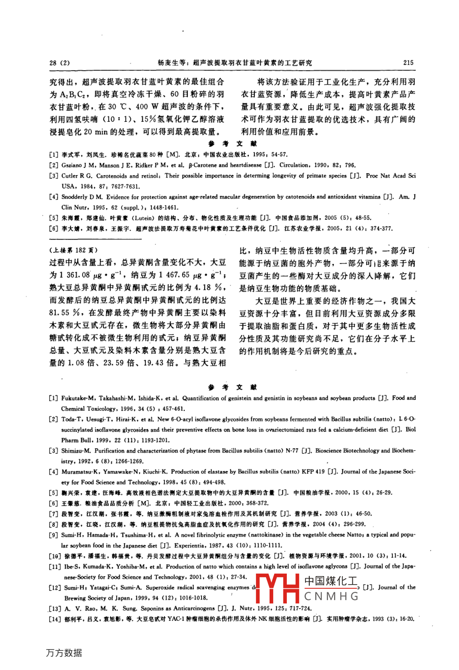 J. SHANXI AGRIC UNIV (Natural Science Edition)茸大學(xué)(自然科學(xué)版)2082(002376納豆及其提取物生物活性物質(zhì)測定段智變1,董改香2,溫曉慶2,江漢湖3(1.山西農(nóng)業(yè)大學(xué)生命科學(xué)學(xué)院,山西太谷030801,2.山西農(nóng)業(yè)大學(xué)動物科技學(xué)院,山西太谷030801;3南京農(nóng)業(yè)大學(xué)食品科技學(xué)院,江蘇南京210095)要:用紫外分光光度法、高效液相色譜法等方法分析納丘及其提取物中皂武、異黃酮及蛋白質(zhì)含量。結(jié)果表明:與熟大豆相比,納豆中大豆甙元、染料木素、皂甙及蛋白質(zhì)等生物活性物質(zhì)含量增高。威熟納丘異黃酮總量、大豆甙元及染料木素含量分別是熟大丘含量的1.08倍、23.59倍和19.43倍,其中,成熟納豆總異黃酮中異黃酮武元的比例達81.55%。納豆生物活性咸分是其保健功能的物質(zhì)基礎(chǔ)。關(guān)鍵詞:納丘;提取物;生物活性物質(zhì)中圖分類號:R151.2文獻標識碼:A文章編號:1671-8151(2008)020180-03Detection of the bioactive Substances in Natto and Its extractDUAN Zhi-bian et al(College of Life Science, Shanri Agricultural University, Taigu Shanri 030801, China)Abstract: The saponin, daidzein and genistein in natto was detected by ultraviolet spectroscopy and high performanceliquid chromatography, respectively. The results indicated that the contents of daidzein, genistein, saponin, protein in-creased after fermented by Bacillus subtilis natto. The contents of isoflavones, daidzein and genistein in ripe natto were1.08, 23. 59 and 19. 43 times than that in soybean respectively, and the aglycon content of genistein and daidzein is81.55% of natto isoflavones. The bioactive substances in natto were functional elementsKey Words: Natto: Extract, Bioactive substance成熟納豆中富含大豆皂甙、大豆甙元糖甙大豆→清洗、浸泡→高壓蒸煮→攤涼→接種(簡稱大豆甙)、大豆甙元、染料木素糖甙(簡稱→發(fā)酵→后熟→納豆,嚴格控制生產(chǎn)工藝條件,染料木甙)、染料木素甙元(簡稱染料木素)等異保證產(chǎn)品質(zhì)量穩(wěn)定。黃酮12及100多種酶等生物活性物質(zhì),它們是納1.1.4大豆異黃酮參考標樣豆保健功能的物質(zhì)基礎(chǔ)。不同的納豆產(chǎn)品,其中大豆甙元、染料木素由南京財經(jīng)大學(xué)工學(xué)院生物活性物質(zhì)的種類與含量會有很大差別4,食品科學(xué)與工程系糧油食品質(zhì)量檢測中心實驗室檢測納豆中相關(guān)生物活性物質(zhì)可為納豆的生物學(xué)分離制備功能研究提供理論依據(jù)12方法1.2.1納豆及大豆水提取物制備:1材料與方法納豆/大豆廉水提取物:取納豆/大豆200g,1.1材料粉碎,加滅菌生理鹽水200mL,攪拌,4℃靜置1.1.1納豆菌種過夜,2000r·min1離心20min,收集上清液。本實驗室分離、篩選高產(chǎn)菌株B.N.10納豆/大豆粒水提取物:取納豆/大豆2001.1.2熟大豆不粉碎,處理同上。大豆→清洗、浸泡→高壓蒸煮1.2.中國煤化工1.1.3納豆CNMHG甙元、染料木素收稿日期:200709-03修回日期:2007-0927作者簡介:段智變(1969-),女(漢),山西祁縣人,副教授,博士,主要從事益生菌保健及其生物學(xué)機理等方面的研究基金項目:山西省青年科學(xué)基金(20041036)段智變等:納豆及其提取物生物活性物質(zhì)測定181與皂甙含量測定見文獻。豆糜水提取異黃酮總量是納豆粒水提取物含量的1.33倍。2結(jié)果與分析2.3納豆、大豆及其提取物中大豆甙元含量2.1納豆、大豆及其水提取物蛋白質(zhì)含量納豆、大豆及其提取物中大豆甙元含量測定納豆、大豆及其水提取物的蛋白質(zhì)含量測定結(jié)果見圖3。成熟納豆粒大豆甙元含量分別是熟結(jié)果見圖1。納豆中蛋白質(zhì)含量為19.85%(濕大豆粒含量的2359倍;納豆糜水提取物大豆甙重),大豆中蛋白質(zhì)含量為18.05%(濕重),兩元含量分別是大豆糜水提取物含量的10.07倍;者差別不大,而納豆糜水提取物蛋白質(zhì)含量是大納豆粒水提取物大豆甙元含量分別是大豆粒水提豆糜水提取物含量的16.52倍,納豆粒水提取物取物含量的34.30倍;納豆糜水提取物大豆甙元蛋白質(zhì)含量是大豆粒水提取物含量的24.50倍,含量分別是納豆粒水提取物含量的1.33倍納豆糜水提取物蛋白質(zhì)含量是納豆粒水提取物含量的1.49倍,大豆糜水提取物蛋白質(zhì)含量是大豆粒水提取物含量的2.21倍。諷本水奏號本賣本雌短翻圖3納豆、大豆及其提取物中總異黃酮含量Fig 3 Isoflavones content of Natto, Soybeanand their extracts圖1納豆、大豆及其提取物中蛋白質(zhì)含量2.4納豆、大豆及其提取物中染料木素含量Fig 1 Protein content of Natto, Soybean and納豆、大豆及其提取物中染料木素含量測定their extracts結(jié)果見圖4。成熟納豆粒染料木素含量分別是熟大豆粒含量的1943倍;納豆糜水提取物染料木2.2納豆、大豆及其提取物中總異黃酮含量素含量分別是大豆糜水提取物含量的10.13倍納豆、大豆及其提取物中總異黃酮含量測定·納豆粒水提取物染料木素含量分別是大豆粒水提結(jié)果見圖2。成熟納豆粒異黃酮總量是熟大豆粒取物含量的31.71倍;納豆糜水提取物染料木素含量分別是納豆粒水提取物含量的1.33倍物水地阻水大水大物田2納豆、大豆及其提取物中總異黃酮含量魔水納以粒水大豆水大粒水Fig 2 Isoflavones content of Natto, Soybeaand their extracts中國煤化工染料木素含量Soybean and含量的1.08倍;納豆糜水提取物異黃酮總量是大CNMHG豆糜水提取物含量的1.15倍;納豆粒水提取物異黃酮總量是大豆