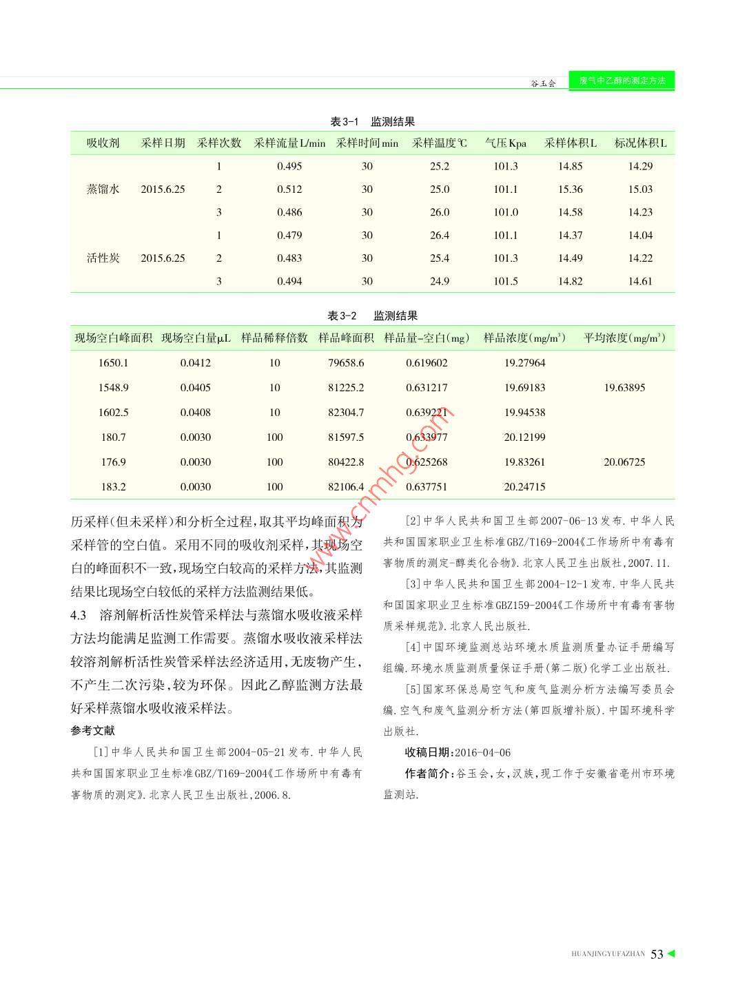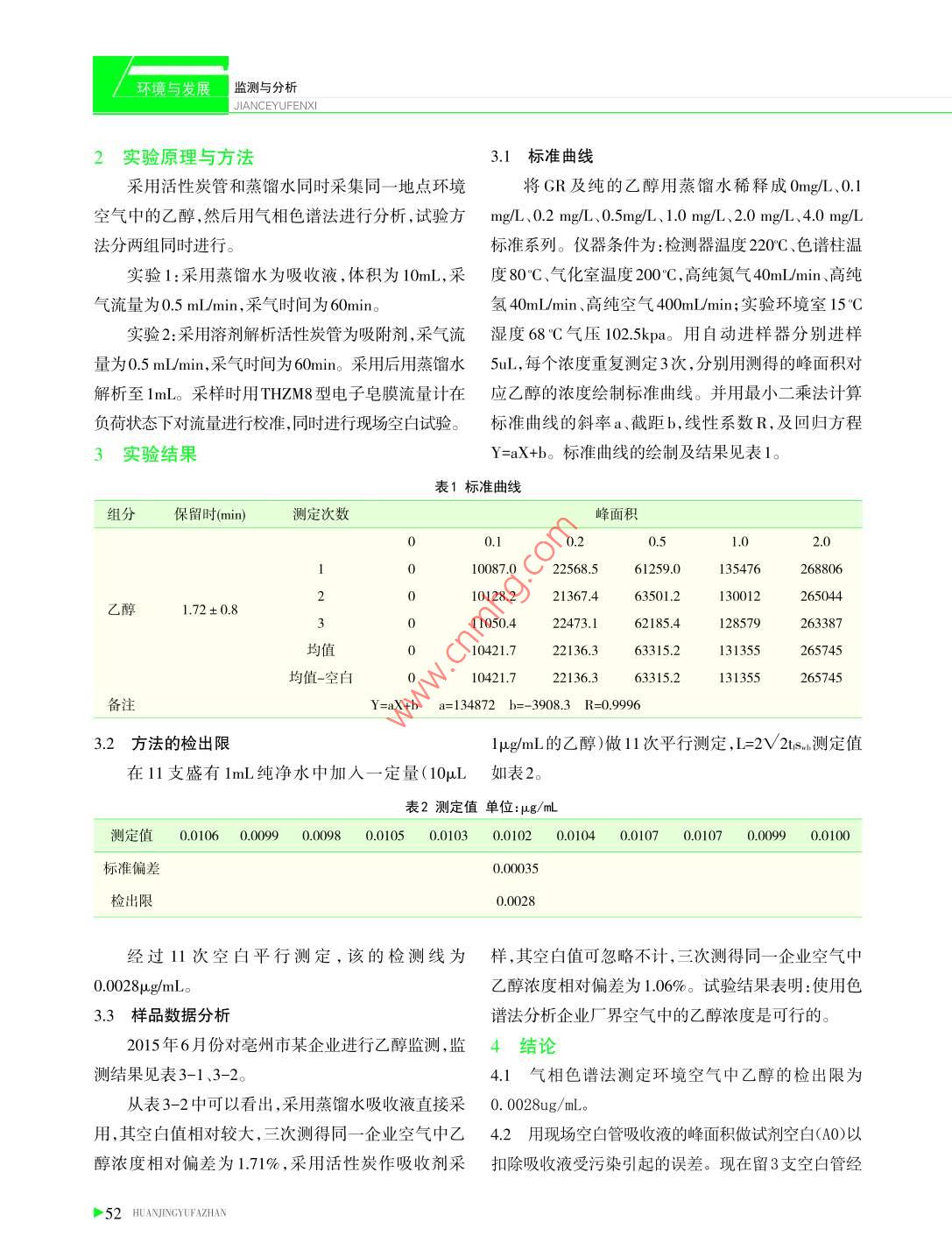谷玉會廢氣中乙醇的測定方法廢氣中乙醇的測定方法谷玉會(安徽省亳州市環(huán)境監(jiān)測站,安徽236800)摘要:乙醇作為工作場所中常用的清洗劑,但《中華人民共和國國家職業(yè)衛(wèi)生標(biāo)準(zhǔn),工作場所中有毒有害物質(zhì)的測定》GBZ/T169-2004,無乙醇的監(jiān)測方法。參照工作場所醇類化合物濃度的測定方法,用不同的吸收劑采集工作場所空氣中的乙醇,采用氣相色譜法測定其濃度。關(guān)鍵詞:工作場所空氣;乙醇;氣相色譜法;現(xiàn)場空白管中圖分類號:X830.2文獻(xiàn)標(biāo)識碼:A文章編號:2095-672X(2016)-0051-03do:10.1647cki.cn15-1369/X.2016.02.014 On the determination of ethanol in waste gas Gu Yuhui (Environmental monitoring station of Bozhou City Anhui Province 236800) Abstract: Ethanol as a cleaning agent commonly used in the workplace, but "the people's Republic of China national occupational health standards, workplace toxic and harmful substances in the determination of"GBZ/T169-2004, no alcohol monitoring method. Ac- cording to the determination method of the concentration of alecohol in the workplace, the ethanol in the air of workplace was collected with different absorbent, and the concentration of ethanol in the air was determined by gas chromatography. Key wordst: Workplace air; Ethanol; Gas chromatography;Field blank tube乙醇作為一種無毒化學(xué)物質(zhì),國家未制定其檢測1主要儀器和實(shí)驗(yàn)方法方法《工作場所中有毒有害物質(zhì)的測定一醇類化合1.1儀器設(shè)備物》GBZ/T169.48-2004規(guī)定了監(jiān)測工作場所中醇類化電子天平、7890A氣相色譜儀、大氣采樣器、電子合物的濃度方法,但只適用于甲醇、丙醇、丁醇戊醇、皂膜流量計(jì)額、10mL大氣吸收管、10mL容量瓶、微量辛醇、丙烯醇、二丙酮醇、乙二醇、康醇、二氯丙醇、氯注射器、色譜柱FFAP、溶劑解析活性炭管。乙醇、1-甲氧基丙醇濃度的測定。當(dāng)企業(yè)要求進(jìn)行環(huán)1.2試劑與材料境空氣或有組織廢氣中乙醇監(jiān)測時(shí),為此對環(huán)境空氣乙醇GR、高純氮、高純氫、高純空氣、標(biāo)準(zhǔn)溶液自或有組織廢氣中乙醇的監(jiān)測方法進(jìn)行探討研究。配、質(zhì)控樣自配。 HAN 51環(huán)境與發(fā)展監(jiān)測與分析 JIANCEYUFENXI2實(shí)驗(yàn)原理與方法3.1標(biāo)準(zhǔn)曲線采用活性炭管和蒸餾水同時(shí)采集同一地點(diǎn)環(huán)境將GR及純的乙醇用蒸餾水稀釋成0mg/L、0.1空氣中的乙醇,然后用氣相色譜法進(jìn)行分析,試驗(yàn)方mg/L、0.2mg/L、0.5mg/L、1.0mg/、2.0mg/L、4.0mg/法分兩組同時(shí)進(jìn)行。標(biāo)準(zhǔn)系列。儀器條件為:檢測器溫度220℃、色譜柱溫實(shí)驗(yàn)1:采用蒸餾水為吸收液,體積為10mL,采度80℃、氣化室溫度200℃,高純氮?dú)?0mL/min、高純氣流量為0.5mL/min,采氣時(shí)間為60min。氫40mL/min、高純空氣400mL/min;實(shí)驗(yàn)環(huán)境室15℃實(shí)驗(yàn)2:采用溶劑解析活性炭管為吸附劑,采氣流濕度68氣壓102.5ka用自動進(jìn)樣器分別進(jìn)樣量為0.5mL/min,采氣時(shí)間為60min采用后用蒸餾水5uL,每個(gè)濃度重復(fù)測定3次,分別用測得的峰面積對解析至1mL.采樣時(shí)用THZM8型電子皂膜流量計(jì)在應(yīng)乙醇的濃度繪制標(biāo)準(zhǔn)曲線。并用最小二乘法計(jì)算負(fù)荷狀態(tài)下對流量進(jìn)行校準(zhǔn),同時(shí)進(jìn)行現(xiàn)場空白試驗(yàn)。標(biāo)準(zhǔn)曲線的斜率a、截距b,線性系數(shù)R,及回歸方程3實(shí)驗(yàn)結(jié)果Y=ax+b。標(biāo)準(zhǔn)曲線的繪制及結(jié)果見表1。表1標(biāo)準(zhǔn)曲線組分保留時(shí)(min)測定次數(shù)峰面積00.10.20.51.02.01010087022568.561259.01354762688062010128.221367.463501.2130012265044乙醇1.72±0.83011050.422473.1621854128579263387均值010421.722136.363315.2131355265745均值-空白010421.722136.63315.2131355265745備注y=ax+ba=134872b3908.30.9993.2方法的檢出限ug/mL的乙醇)做11次平行測定,L=2V2ts測定值在11支盛有1mL純凈水中加入一定量(10μL如表2表2測定值單位:μg/mL測定值0.01060.00990.00980.0100.01030.01020.01040.01070.01070.00990.0100標(biāo)準(zhǔn)偏差0.00035檢出限0.0028經(jīng)過11次空白平行測定,該的檢測線為樣,其空白值可忽略不計(jì),三次測得同一企業(yè)空氣中0.0028g/mL乙醇濃度相對偏差為1.06%。試驗(yàn)結(jié)果表明:使用色3.3樣品數(shù)據(jù)分析譜法分析企業(yè)廠界空氣中的乙醇濃度是可行的。2015年6月份對亳州市某企業(yè)進(jìn)行乙醇監(jiān)測,監(jiān)4結(jié)論測結(jié)果見表3-1、3-2。4.1氣相色譜法測定環(huán)境空氣中乙醇的檢出限為從表3-2中可以看出,采用蒸餾水吸收液直接采0.0028ug/mL用,其空白值相對較大,三次測得同一企業(yè)空氣中乙4.2用現(xiàn)場空白管吸收液的峰面積做試劑空白(A0)以醇濃度相對偏差為1.71%,采用活性炭作吸收劑采扣除吸收液受污染引起的誤差?,F(xiàn)在留3支空白管經(jīng) 52 HUANJINGYUFAZHAN谷玉會廢氣中乙醇的測定方法表3-1監(jiān)測結(jié)果吸收劑采樣日期采樣次數(shù)采樣流量Lmin采樣時(shí)間min采樣溫度℃氣壓Kpa采樣體積L標(biāo)況體積L10.4953025.2101.314.8514.29蒸餾水2015.6.2520.5123025.0101.115.3615.0330.4863026.0101.014.5814.2310.4793026.4101.114.3714.04活性炭2015.6.220.4833025.4101.314.4914.2230.4943024.9101.514.8214.61表3-2監(jiān)測結(jié)果現(xiàn)場空白峰面積現(xiàn)場空白量μL樣品稀釋倍數(shù)樣品峰面積樣品量-空白(mg)樣品濃度(mg/m3)平均濃度(mg/m3)165