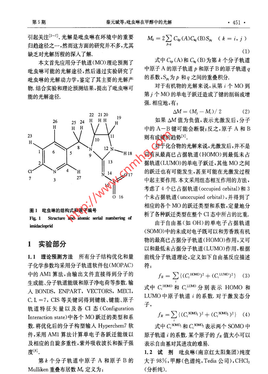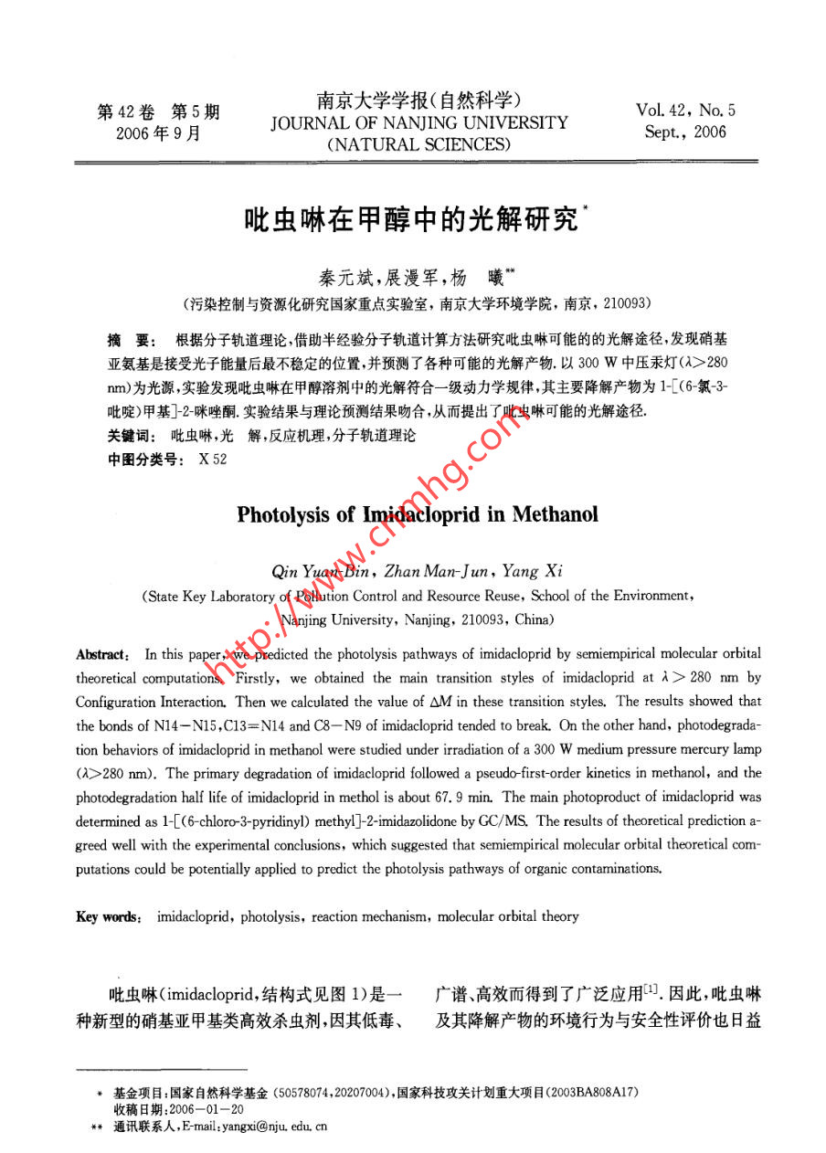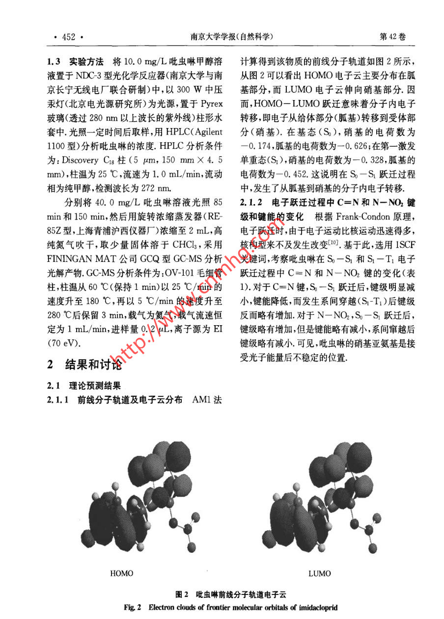 南京大學(xué)學(xué)報(bào)(自然科學(xué))第42卷第5期JOURNAL OF NANJING UNIVERSITYVoL. 42, No. 52006年9月Sept, 2006(NATURAL SCIENCES)吡蟲(chóng)啉在甲醇中的光解研究秦元斌,展漫軍,楊曦”(污染控制與資源化研究國(guó)家重點(diǎn)實(shí)驗(yàn)室,南京大學(xué)環(huán)境學(xué)院,南京,210093)摘要:根據(jù)分子軌道理論 ,借助半經(jīng)驗(yàn)分子軌道計(jì)算方法研究吡蟲(chóng)啉可能的的光解途徑,發(fā)現(xiàn)硝基亞氨基是接受光子能量后最不穩(wěn)定的位置,并預(yù)測(cè)了各種可能的光解產(chǎn)物.以300 W中壓汞燈(2>280nm)為光源,實(shí)驗(yàn)發(fā)現(xiàn)吡蟲(chóng)啉在甲醇溶劑中的光解符合-級(jí)動(dòng)力學(xué) 規(guī)律,其主要降解產(chǎn)物為1-[(6-氯3-吡啶)甲基]-2-咪唑酮.實(shí)驗(yàn)結(jié)果與理論預(yù)測(cè)結(jié)果吻合,從而提出了吡蟲(chóng)啉可能的光解途徑關(guān)鍵詞:吡蟲(chóng)啉,光 解,反應(yīng)機(jī)理 ,分子軌道理論中圖分類號(hào): X 52Photolysis of Imidacloprid in MethanolQin Yuan Bin,Zhan Man-Jun, Yang Xi(State Key Laboratory of Pollution Control and Resource Reuse, School of the Environment,Nanjing University, Nanjing, 210093, China)Abstract: In this paper, we predicted the photolysis pathways of imidacloprid by semiempirical molecular orbitaltheoretical computations. Firstly, we obtained the main transition styles of imidacloprid at > 280 nm byConfiguration Interaction. Then we calculated the value of OM in these transtion styles. The results showed thatthe bonds of N14- N15 ,C13= N14 and C8- N9 of imidacloprid tended to break. On the other hand, photodegrada-tion behaviors of imidacloprid in methanol were studied under irradiation of a 300 W medium pressure mercury lamp(\>280 nm). The primary degradation of imidacloprid followed a pseudo-first-order kinetics in methanol, and thephotodegradation half life of imidacloprid in methol is about 67. 9 min. The main photoproduct of imidacloprid wasdetermined as 1-[(6- chloro 3-pyridiny) methyI]-2-imidazolidone by GC/MS. The results of theoretical prediction a-greed well with the experimental conclusions, which suggested that semiempirical molecular orbital theoretical com-putations could be potentially applied to predict the photolysis pathways of organic contaminations.Key words: imidacloprid, photolysis, reaction mechanism, molecular orbital theory吡蟲(chóng)啉(imidacloprid,結(jié)構(gòu)式見(jiàn)圖1)是一-廣 譜.高效而得到了廣泛應(yīng)用.因此,吡蟲(chóng)啉種新型的硝基亞甲基類高效殺蟲(chóng)劑,因其低毒、及其降解產(chǎn)物的環(huán)境行為 與安全性評(píng)價(jià)也日益基金項(xiàng)目:國(guó)家自然科學(xué)基金(50578074,20207004), 國(guó)家科技攻關(guān)計(jì)劃重大項(xiàng)目(2003BA808A17)收稿日期:2006-01-20** 通訊聯(lián)系人,E mail:yangxi@nju. edu. cn第5期秦元斌等:吡蟲(chóng)啉在甲醇中的光解●451●引起關(guān)注[2~].光解是吡蟲(chóng)啉在環(huán)境中的重要M。=2習(xí)Cp(A)C%(B)Sp (k=i,j)歸趨途徑之一,然而這方面的研究并不多,尤其(1)缺乏對(duì)光解歷程的深入了解.本文首先應(yīng)用分子軌道(MO)理論預(yù)測(cè)了式中Cp(A)和Cn (B)為第k個(gè)分子軌道吡蟲(chóng)啉可能的光解途徑,然后通過(guò)實(shí)驗(yàn)研究了中原子A的原子軌道p和原子B的原子軌道q吡蟲(chóng)啉的光解動(dòng)力學(xué),鑒定了其主要的光解產(chǎn)的系數(shù),Sg為p和q之間的重疊積分.物.結(jié)合實(shí)驗(yàn)和理論預(yù)測(cè)結(jié)果,提出了吡蟲(chóng)啉可對(duì)于有機(jī)物的光解來(lái)說(shuō),從第i個(gè)MO到.第j個(gè)MO的單電子躍遷造成了鍵的削弱或增能的光解途徑.強(qiáng).相應(yīng)地,有:OM= (M;- M:)/ 22622 21 2019如果OM值為負(fù)值,表示光激發(fā)后,分子.2524 H HHHHH中的A- B鍵可能會(huì)斷裂;反之,原子A和B .23則有成鍵的趨勢(shì)[9.1058912 NH 18對(duì)于化合物的光解來(lái)說(shuō),光激發(fā)后,并不是只有從最高已占據(jù)軌道(HOMO)到最低未占2113據(jù)軌道(LUMO)的單電子躍遷,其他MO之間CI4H14 2017的躍遷也有可能發(fā)生,甚至可能在光激發(fā)過(guò)程27中起主要作用.本文采用組態(tài)相互作用的方法,考慮了4個(gè)已占據(jù)軌道(occupied orbital)和30 16個(gè)未占據(jù)軌道(unoccupied orbital), 并得到了相應(yīng)的各個(gè)MO的躍遷類型和系數(shù),定量地分圖1吡蟲(chóng)啉的結(jié)構(gòu)式和原子編號(hào)Fig 1 Structure and atomic serial numbering of析了各種躍遷類型在整個(gè)CI態(tài)中所占的比重.由于自由基(如0H)的單電子占據(jù)軌道imidacloprid(SOMO)中的未成對(duì)電子既可以和芳香族有機(jī)物的最高已占據(jù)分子軌道(HOMO)作用,又可1實(shí)驗(yàn)部分以和最低未占據(jù)分子軌道(LUMO)作用,根據(jù)1.1 理論預(yù)測(cè)方法 所有分子結(jié)構(gòu)優(yōu)化和量前線分子軌道理論,定義如下自由基反應(yīng)描述子化學(xué)參數(shù)均采用分子軌道軟件包(MOPAC)符:中的AM1算法,由輸出文件直接得到分子的fr= E{(C;HOMO)2 + (C,MO)2} (3)生成能、分子軌道能級(jí)和原子凈電荷等參數(shù).輸式中C:HOMO和CLUMO分別表示HOMO和.人BONDS, ENPART, VECTORS, MECI,C.I.=7, CIS等關(guān)鍵詞得到鍵級(jí)、鍵能、原子LUMO中原子軌道i的系數(shù).對(duì)于激發(fā)態(tài)分軌道特征矢量以及各CI態(tài)(Configuration子,Interaction state)中各個(gè)MO躍遷的類型和系fr=E{(CsxMo)2 +(.0XM)}) (4)數(shù).將優(yōu)化后的分子構(gòu)型輸人Hyperchem7軟式中CsMO)和C.S0MO2表示兩