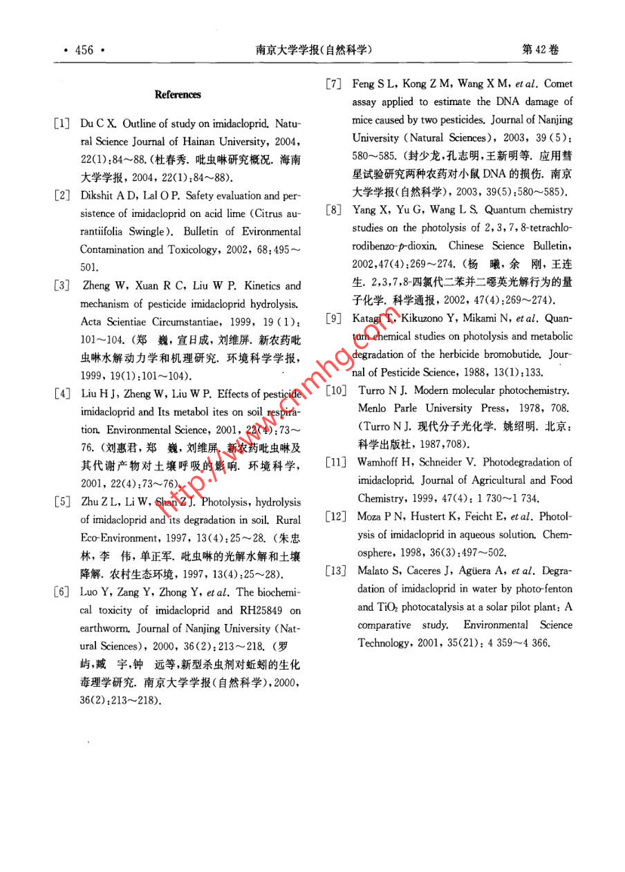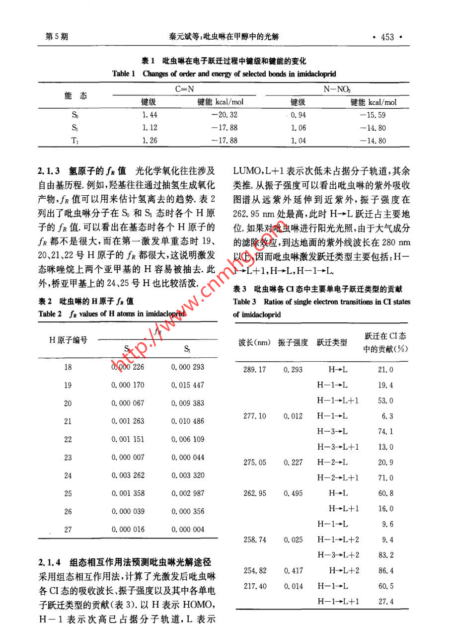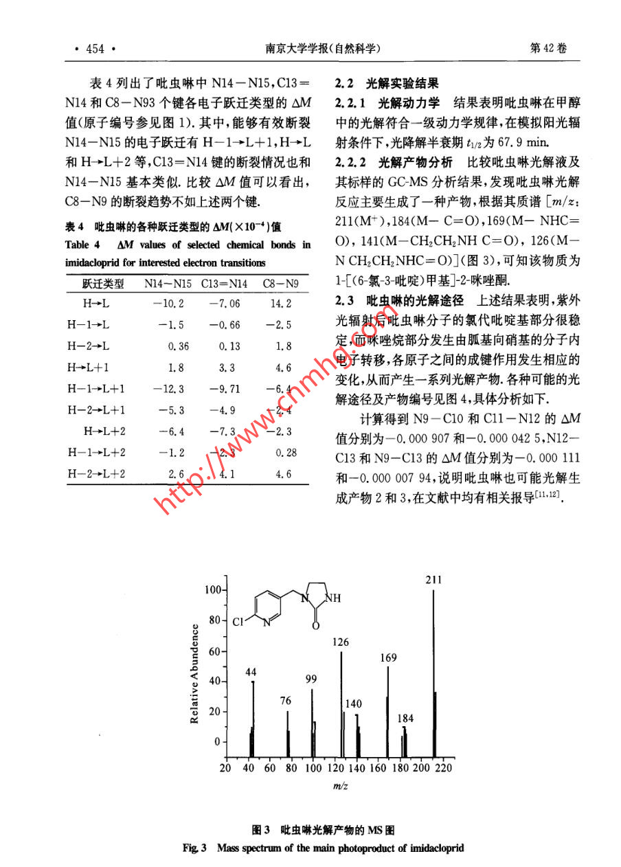 南京大學(xué)學(xué)報(bào)(自然科學(xué))第42卷第5期JOURNAL OF NANJING UNIVERSITYVoL. 42, No. 52006年9月Sept, 2006(NATURAL SCIENCES)吡蟲(chóng)啉在甲醇中的光解研究秦元斌,展漫軍,楊曦”(污染控制與資源化研究國(guó)家重點(diǎn)實(shí)驗(yàn)室,南京大學(xué)環(huán)境學(xué)院,南京,210093)摘要:根據(jù)分子軌道理論 ,借助半經(jīng)驗(yàn)分子軌道計(jì)算方法研究吡蟲(chóng)啉可能的的光解途徑,發(fā)現(xiàn)硝基亞氨基是接受光子能量后最不穩(wěn)定的位置,并預(yù)測(cè)了各種可能的光解產(chǎn)物.以300 W中壓汞燈(2>280nm)為光源,實(shí)驗(yàn)發(fā)現(xiàn)吡蟲(chóng)啉在甲醇溶劑中的光解符合-級(jí)動(dòng)力學(xué) 規(guī)律,其主要降解產(chǎn)物為1-[(6-氯3-吡啶)甲基]-2-咪唑酮.實(shí)驗(yàn)結(jié)果與理論預(yù)測(cè)結(jié)果吻合,從而提出了吡蟲(chóng)啉可能的光解途徑關(guān)鍵詞:吡蟲(chóng)啉,光 解,反應(yīng)機(jī)理 ,分子軌道理論中圖分類號(hào): X 52Photolysis of Imidacloprid in MethanolQin Yuan Bin,Zhan Man-Jun, Yang Xi(State Key Laboratory of Pollution Control and Resource Reuse, School of the Environment,Nanjing University, Nanjing, 210093, China)Abstract: In this paper, we predicted the photolysis pathways of imidacloprid by semiempirical molecular orbitaltheoretical computations. Firstly, we obtained the main transition styles of imidacloprid at > 280 nm byConfiguration Interaction. Then we calculated the value of OM in these transtion styles. The results showed thatthe bonds of N14- N15 ,C13= N14 and C8- N9 of imidacloprid tended to break. On the other hand, photodegrada-tion behaviors of imidacloprid in methanol were studied under irradiation of a 300 W medium pressure mercury lamp(\>280 nm). The primary degradation of imidacloprid followed a pseudo-first-order kinetics in methanol, and thephotodegradation half life of imidacloprid in methol is about 67. 9 min. The main photoproduct of imidacloprid wasdetermined as 1-[(6- chloro 3-pyridiny) methyI]-2-imidazolidone by GC/MS. The results of theoretical prediction a-greed well with the experimental conclusions, which suggested that semiempirical molecular orbital theoretical com-putations could be potentially applied to predict the photolysis pathways of organic contaminations.Key words: imidacloprid, photolysis, reaction mechanism, molecular orbital theory吡蟲(chóng)啉(imidacloprid,結(jié)構(gòu)式見(jiàn)圖1)是一-廣 譜.高效而得到了廣泛應(yīng)用.因此,吡蟲(chóng)啉種新型的硝基亞甲基類高效殺蟲(chóng)劑,因其低毒、及其降解產(chǎn)物的環(huán)境行為 與安全性評(píng)價(jià)也日益基金項(xiàng)目:國(guó)家自然科學(xué)基金(50578074,20207004), 國(guó)家科技攻關(guān)計(jì)劃重大項(xiàng)目(2003BA808A17)收稿日期:2006-01-20** 通訊聯(lián)系人,E mail:yangxi@nju. edu. cn第5期秦元斌等:吡蟲(chóng)啉在甲醇中的光解●451●引起關(guān)注[2~].光解是吡蟲(chóng)啉在環(huán)境中的重要M。=2習(xí)Cp(A)C%(B)Sp (k=i,j)歸趨途徑之一,然而這方面的研究并不多,尤其(1)缺乏對(duì)光解歷程的深入了解.本文首先應(yīng)用分子軌道(MO)理論預(yù)測(cè)了式中Cp(A)和Cn (B)為第k個(gè)分子軌道吡蟲(chóng)啉可能的光解途徑,然后通過(guò)實(shí)驗(yàn)研究了中原子A的原子軌道p和原子B的原子軌道q吡蟲(chóng)啉的光解動(dòng)力學(xué),鑒定了其主要的光解產(chǎn)的系數(shù),Sg為p和q之間的重疊積分.物.結(jié)合實(shí)驗(yàn)和理論預(yù)測(cè)結(jié)果,提出了吡蟲(chóng)啉可對(duì)于有機(jī)物的光解來(lái)說(shuō),從第i個(gè)MO到.第j個(gè)MO的單電子躍遷造成了鍵的削弱或增能的光解途徑.強(qiáng).相應(yīng)地,有:OM= (M;- M:)/ 22622 21 2019如果OM值為負(fù)值,表示光激發(fā)后,分子.2524 H HHHHH中的A- B鍵可能會(huì)斷裂;反之,原子A和B .23則有成鍵的趨勢(shì)[9.1058912 NH 18對(duì)于化合物的光解來(lái)說(shuō),光激發(fā)后,并不是只有從最高已占據(jù)軌道(HOMO)到最低未占2113據(jù)軌道(LUMO)的單電子躍遷,其他MO之間CI4H14 2017的躍遷也有可能發(fā)生,甚至可能在光激發(fā)過(guò)程27中起主要作用.本文采用組態(tài)相互作用的方法,考慮了4個(gè)已占據(jù)軌道(occupied orbital)和30 16個(gè)未占據(jù)軌道(unoccupied orbital), 并得到了相應(yīng)的各個(gè)MO的躍遷類型和系數(shù),定量地分圖1吡蟲(chóng)啉的結(jié)構(gòu)式和原子編號(hào)Fig 1 Structure and atomic serial numbering of析了各種躍遷類型在整個(gè)CI態(tài)中所占的比重.由于自由基(如0H)的單電子占據(jù)軌道imidacloprid(SOMO)中的未成對(duì)電子既可以和芳香族有機(jī)物的最高已占據(jù)分子軌道(HOMO)作用,又可1實(shí)驗(yàn)部分以和最低未占據(jù)分子軌道(LUMO)作用,根據(jù)1.1 理論預(yù)測(cè)方法 所有分子結(jié)構(gòu)優(yōu)化和量前線分子軌道理論,定義如下自由基反應(yīng)描述子化學(xué)參數(shù)均采用分子軌道軟件包(MOPAC)符:中的AM1算法,由輸出文件直接得到分子的fr= E{(C;HOMO)2 + (C,MO)2} (3)生成能、分子軌道能級(jí)和原子凈電荷等參數(shù).輸式中C:HOMO和CLUMO分別表示HOMO和.人BONDS, ENPART, VECTORS, MECI,C.I.=7, CIS等關(guān)鍵詞得到鍵級(jí)、鍵能、原子LUMO中原子軌道i的系數(shù).對(duì)于激發(fā)態(tài)分軌道特征矢量以及各CI態(tài)(Configuration子,Interaction state)中各個(gè)MO躍遷的類型和系fr=E{(CsxMo)2 +(.0XM)}) (4)數(shù).將優(yōu)化后的分子構(gòu)型輸人Hyperchem7軟式中CsMO)和C.S0MO2表示兩
