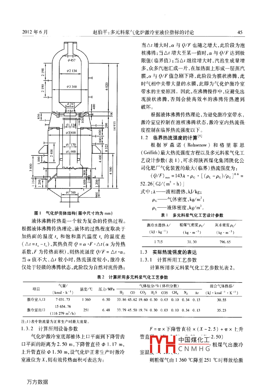 44化肥工業(yè)第39卷第3期多元料漿氣化爐激冷室液位指標(biāo)的討論趙伯平(陜西煤化集團陜化公司化肥廠陜西渭南 714100)摘要多元科漿氣化爐激冷室液位是其在正常運行過程中需要重點監(jiān)控的工 藝指標(biāo)。根據(jù)對氣化爐激冷室?guī)蚍治雠c討論所得出的結(jié)論以及氣化爐激冷室內(nèi)件的布局,得出合理的多元料漿氣化爐澈冷室液位控制指標(biāo),以達(dá)到消除氣化爐激冷室?guī)F(xiàn)象的目的。經(jīng)計算得出:氣化爐正常生產(chǎn)時,激冷室高液位為5.2 m.正常液位為4.5 m,低液位為3.8 m,停車液位為3.1 m。關(guān)鍵詞多元料漿 氣化爐液位指標(biāo)Discussion on Liquid Level Index in Quench Chamberof Multi-Component Slurry GasifierZhao Boping( Chenical Fertilizer Plant of Shaanxi Chemical Company of Shaanxi Coal Chemical GroupShaanxi Weinan 714100)Abstract The liquid level in the quench chamber of the muli-component slumy gasifier is thekeypoint of the process index to be monitored in normal operation. In line with the conclusions drawnfrom the analysis and discussion of causes for water entrained into the quench chamber of the gasiferand the layout of the intemals in the quench chamber, reasonable indices are obtained for the control ofliquid level in the quench chamber, so as to eliminate waler entrained into the chamber. By calculationit is found that in normal production of the gasifier the high liquid level in the chamber is 5.2 m, thenormal level4.5 m, the low level is3.8 m, and the level comes to 3. 1 m during shutdown.Keywords muli-component slurry gasifier liquid level index多元料漿氣化爐激冷室液位+分重要,是氣煤氣帶 水原因進行分析。化爐預(yù)熱、開車、停車過程中需要重點監(jiān)控的工藝指標(biāo)。氣化爐停運或預(yù)熱期間,氣化爐激冷室液探討氣化爐激冷室粗煤氣帶水現(xiàn)象的理論位過高會導(dǎo)致氣化爐反應(yīng)室底部浸水,甚至?xí)?dǎo)致激冷水浸入氣化爐反應(yīng)室而損壞耐火材料、氣1.1激冷 室粗煤氣帶水原因分析"-4]化爐烘爐火焰回火。因此,在氣化爐預(yù)熱烘爐期氣化爐激冷室的作用是將來自氣化爐燃燒反間,激冷室液位需高于上升管管口但不能淹沒下應(yīng)室的高溫煤氣和熔融態(tài)的灰渣在激冷室內(nèi)與激降管管口。由氣化爐殼體結(jié)構(gòu)(圖1)可知,氣化冷水直接接觸激冷,熔渣被激冷固化后沉降在激爐預(yù)熱時激冷室液位的控制指標(biāo)應(yīng)為2.425m。冷室下部錐體內(nèi),再經(jīng)破渣機破碎后排人鎖斗內(nèi)氣化爐運行期間,激冷室液位過高會造成出氣化定期排放。粗煤氣沿浸沒于激冷水中的下降管及爐激冷室粗煤氣大量帶水;而氣化爐激冷室液位上升管的金屬壁面流動,被進一步冷卻,同時產(chǎn)生過低會造成出氣化爐粗煤氣溫度超高。要合理控大量中國煤化工(、液兩相流的沸制氣化爐激冷室液位,就必須對氣化爐激冷室粗騰佴Y片CNMHG本文作者的聯(lián)系方式: zha09130342605@ 126. com2012年6月.趙伯平:多元料漿氣化爐激冷室液位指標(biāo)的討論45當(dāng)Ot增大時,a與Q/F也隨之增大,此階段為泡核沸騰;當(dāng)Ot增大至某-值時,a 與Q/F達(dá)到極φ457限值(臨界值);當(dāng)Ot繼續(xù)增大時,汽泡生成量增多,眾多汽泡匯成- -片,在加熱面上形成一層蒸汽φ2134膜,a與Q/F值急劇下降,此階段為膜狀沸騰,此時氣相中夾帶大量的水膜,此即為氣化爐激冷室φ3 300帶水的主要原因。因此,在沸騰操作中,應(yīng)避免出現(xiàn)膜狀沸騰,否則會使高效率的沸騰傳熱遭到9781破壞。62D32根據(jù)液體沸騰傳熱理論,為避免激冷室?guī)?,激冷室?yīng)控制在泡核沸騰狀態(tài).激冷室內(nèi)熱流強| 外134度控制在臨界熱流強度以下。φ3|80021.2 臨界熱流強度的計算['1. ψL170根據(jù)歲森諾( Rohsenow)和格里菲思s|φ1900(irffth)最大熱流強度方程以及多元料漿氣化工藝設(shè)計參數(shù)(表1),可求得陜西煤化集團陜化公司化肥廠氣化裝置的最大(臨界)熱流強度為:(Q/F) =143λ .ρc●[(pu -ρc)/ρc]°°=52. 26[GJ/(m2●h)」重式中:λ一液相潛熱, kJ/kg;氣體密度,kg/m';ρu一液體密度 ,kg/m'c圖1氣化爐殼體結(jié)構(gòu)( 圖中尺寸均為mm)表|多元料漿 氣化工藝設(shè)計參數(shù)液體沸騰傳熱是一個較為復(fù)雜的傳熱過程。激冷水潛熱λ/粗煤氣密度po/灰水密度p!根據(jù)液體沸騰傳熱理論,液體的過熱程度取決于(kJ.kg-)(kg.m~})(kg.m-3)加熱面的溫度t。和飽和蒸汽溫度1,的溫度差( Ot=t。-t),其熱負(fù)荷Q=a.F .△t(a為傳熱1 71531.30796. 65系數(shù),F為傳熱面積),則熱流強度Q/F= Ol *a。1.3 實際熱流強度的表達(dá)當(dāng)a值不大、O1較小時,熱流強度較小,激冷水1.3.1計算所用工藝參數(shù)僅處于輕微的沸騰狀態(tài),此階段為自然對流傳熱;計算所用多元料漿氣化工藝參數(shù)見表2。表2計算所用多元料漿氣化工藝參數(shù)氣量/氣體組分/% (體積分?jǐn)?shù))混合氣體熱容/項日(kmol●h)溫度/C壓/MPaH2 C0 CO2 H2S cos CH4 N2 Ar (kJ.kmol-' .K-')徽冷室人口7 031. 731 3606.5033. 86 45.62 19.60 0.30 0.03 0.10 0.34 0. 1330.55激冷室出口15 654.762516.48 33.7945.50 19.74 0.30 0.03 0.10 0.34 0.1335.23(116 279 m/h)注:1)表中物流量為正常生產(chǎn)時最大流量。1.3.2計算所用設(shè)備參數(shù)F=πx下降管直徑x(X-2.5) +πx上升氣化爐激冷室底部錐體上口平面到下降管齒管直中國煤化工2.50)口平面的距離為2.50 m,下降管直徑φ1.17 m,室溫YHCNMHG粗煤氣出激冷上升管直徑φ 1. 50 m,設(shè)氣化爐正常生產(chǎn)時激冷室液位為X,