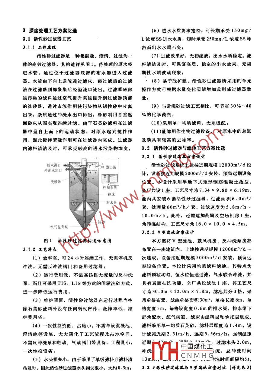 李媛(北京市市政工程設(shè)計(jì)研究總院,北京100082)摘要:針對(duì)四川省瀘縣城市污水廠深度處理工藝單元的選擇,通過(guò)對(duì)話性砂過(guò)濾器和傳統(tǒng)常規(guī)的v型濾池工藝進(jìn)行對(duì)比,在保證良好的出水水質(zhì)的前提下,采用活性砂過(guò)德器工藝具有運(yùn)行方式連續(xù)、工藝流程簡(jiǎn)單、占地面積少,工程投資省等優(yōu)點(diǎn)。關(guān)鍵詞:污水深度處理、活性砂過(guò)濾器、V型濾池城市污水廠深度處理方案比選1污水深度處理內(nèi)涵濾池是污水深度處理中最普遍應(yīng)用的--種傳統(tǒng)污水深度處理在經(jīng)濟(jì)發(fā)達(dá)的國(guó)家已在推廣,甚技術(shù)。而近幾年來(lái),活性砂過(guò)謔器工藝以其結(jié)構(gòu)形至普及。在我國(guó),污水深度處理與有效利用事業(yè)自式簡(jiǎn)單、運(yùn)行效率高、占地面積少等優(yōu)勢(shì)愈來(lái)愈受20世紀(jì)90年代以來(lái)也已經(jīng)具備了相當(dāng)?shù)囊?guī)模。城市到大家的認(rèn)可和青睞。本文對(duì)用于污水深度處理的污水深度處理普及率現(xiàn)已逐漸成為城市用水健康循濾池和活性砂過(guò)濾器工藝進(jìn)行方案比選。環(huán)的重要標(biāo)志。2.1設(shè)計(jì)規(guī)模所謂污水深度處理有別于污水三級(jí)處理。三級(jí)瀘縣污水處理廠近期設(shè)計(jì)規(guī)模為5000m3/d,處理是在二級(jí)處理流程之后再增加處理設(shè)施來(lái)取得遠(yuǎn)期設(shè)計(jì)規(guī)模為 7000m)/d,一、二期總規(guī)模為良好的水質(zhì),而深度處理則不限于此,采用二級(jí)處12000m3/d. 其深度處理單元土建按遠(yuǎn)期規(guī)模-次理新工藝(厭氧一好氧活性污泥法) 取得更好的水建成,設(shè)備采用近、遠(yuǎn)期分期安裝。質(zhì)也是深度處理。當(dāng)然污水深度處理也不排除三級(jí)2.2 設(shè)計(jì)進(jìn)、出水水質(zhì)處理,當(dāng)再生水用戶對(duì)SS. COD.色度、嗅味有該污水處理廠原水經(jīng)二級(jí)生物處理一CAST 生特殊要求時(shí),應(yīng)在二級(jí)處理之后增加混凝過(guò)濾、生物反應(yīng)池后,出水水質(zhì)可達(dá)到《城鎮(zhèn)污水處理廠污物膜過(guò)謔、臭氧氧化、活性炭吸附以至膜分離凈化染物排放標(biāo)準(zhǔn)》 (GB18918-2002) 規(guī)定的一級(jí)B標(biāo)單元。排放標(biāo)準(zhǔn),其水質(zhì)指標(biāo)詳見(jiàn)表1.表1深度處理單元設(shè)計(jì)進(jìn) 水水質(zhì)2設(shè)計(jì)規(guī)模及進(jìn)、出水水質(zhì)指標(biāo)BOD,CODcrSsTP由于本項(xiàng)目所處瀘縣,位于長(zhǎng)江上游的重要支設(shè)計(jì)值(mg/L)<20≤60<20 < I.0流- -沱江流域,其生態(tài)環(huán)境的質(zhì)量直接影響到長(zhǎng)江流域的生態(tài)環(huán)境,其出水水質(zhì)要求穩(wěn)定的達(dá)到經(jīng)深度處理后,其出水水質(zhì)應(yīng)達(dá)到GB18918-《城鎮(zhèn)污水處理廠污染排放標(biāo)準(zhǔn)》(GB18918- - 2002) 2002 中規(guī)定的一級(jí)A標(biāo)排放標(biāo)準(zhǔn),其水質(zhì)指標(biāo)詳見(jiàn)一級(jí)A標(biāo)準(zhǔn),由于出水Ss. TP的指標(biāo)要求嚴(yán)格,表 2中國(guó)煤化工而本工程所采用的CAST生物反應(yīng)池出水的BOD、出水水質(zhì)ss等指標(biāo)無(wú)法穩(wěn)定的達(dá)到一級(jí)A的排放標(biāo)準(zhǔn),故MHCNMH G必須設(shè)置后續(xù)的深度處理工藝單元。設(shè)計(jì)值 (mg/L)< 10< 50≤10 <0.5423深度處理工藝方案比選(6)進(jìn)水水質(zhì)要求寬松,可長(zhǎng)期承受150mg/3.1活性砂過(guò)濾器L藝L濃度ss進(jìn)水水質(zhì),短時(shí)承受250mg/L濃度ss沖3.1.1 工作原理?yè)舳鏊|(zhì)不變;活性砂過(guò)謔器是一種集混凝、澄清.過(guò)濾為一(7)過(guò)濾效果好,無(wú)初濾液,出水水質(zhì)穩(wěn)定。濾體的高效過(guò)濾器,其構(gòu)造詳見(jiàn)圖1.待處理的原水經(jīng)料清潔及時(shí),可保證高質(zhì)、穩(wěn)定的出水效果,無(wú)周進(jìn)水管,通過(guò)位于過(guò)濾器底部的布水器進(jìn)入過(guò)濾期性水質(zhì)波動(dòng)現(xiàn)象;器。水流由下向上逆流通過(guò)濾床,經(jīng)過(guò)濾后的過(guò)濾(8) 易于改擴(kuò)建,活性砂過(guò)濾器所采用的單元液在過(guò)濾器頂部聚集后經(jīng)溢流口流出。過(guò)濾器底部操作方式可根據(jù)水量變化靈活增加或刪減過(guò)濾器數(shù)被污染的濾料通過(guò)空氣提升泵被提升到過(guò)濾器頂部量:的洗砂器,通過(guò)紊流作用使污染物從活性砂中分離(9)與常規(guī)砂過(guò)速工藝相比,可節(jié)省30% ~40出來(lái),雜質(zhì)通過(guò)沖洗水出口排出,凈矽利用自重返%的化學(xué)藥劑;回砂床從而實(shí)現(xiàn)連續(xù)過(guò)濾。由于石英砂濾料在過(guò)濾(10)采用單- -均質(zhì)濾料,無(wú)須級(jí)配,器中呈自上而下的運(yùn)動(dòng)狀態(tài),對(duì)原水起到攪拌作.(11)能夠用作生物過(guò)濾設(shè)備,對(duì)原水中的總氮用,因此攪拌絮凝作用可在過(guò)濾器內(nèi)完成。過(guò)濾器及磷具有較高的去除率。內(nèi)濾料清潔及時(shí),可承受較高的進(jìn)水污染物濃度。3.2活性矽過(guò)濾器與濾池工藝方案比選3.2.1活性砂過(guò)濾器方崇設(shè)計(jì)原水進(jìn)口的濾出液活性砂過(guò)濾系統(tǒng)土建按遠(yuǎn)期規(guī)模12000m3/d設(shè)沖洗水出口計(jì),設(shè)備按近期規(guī)模5000m3/d安裝,預(yù)留遠(yuǎn)